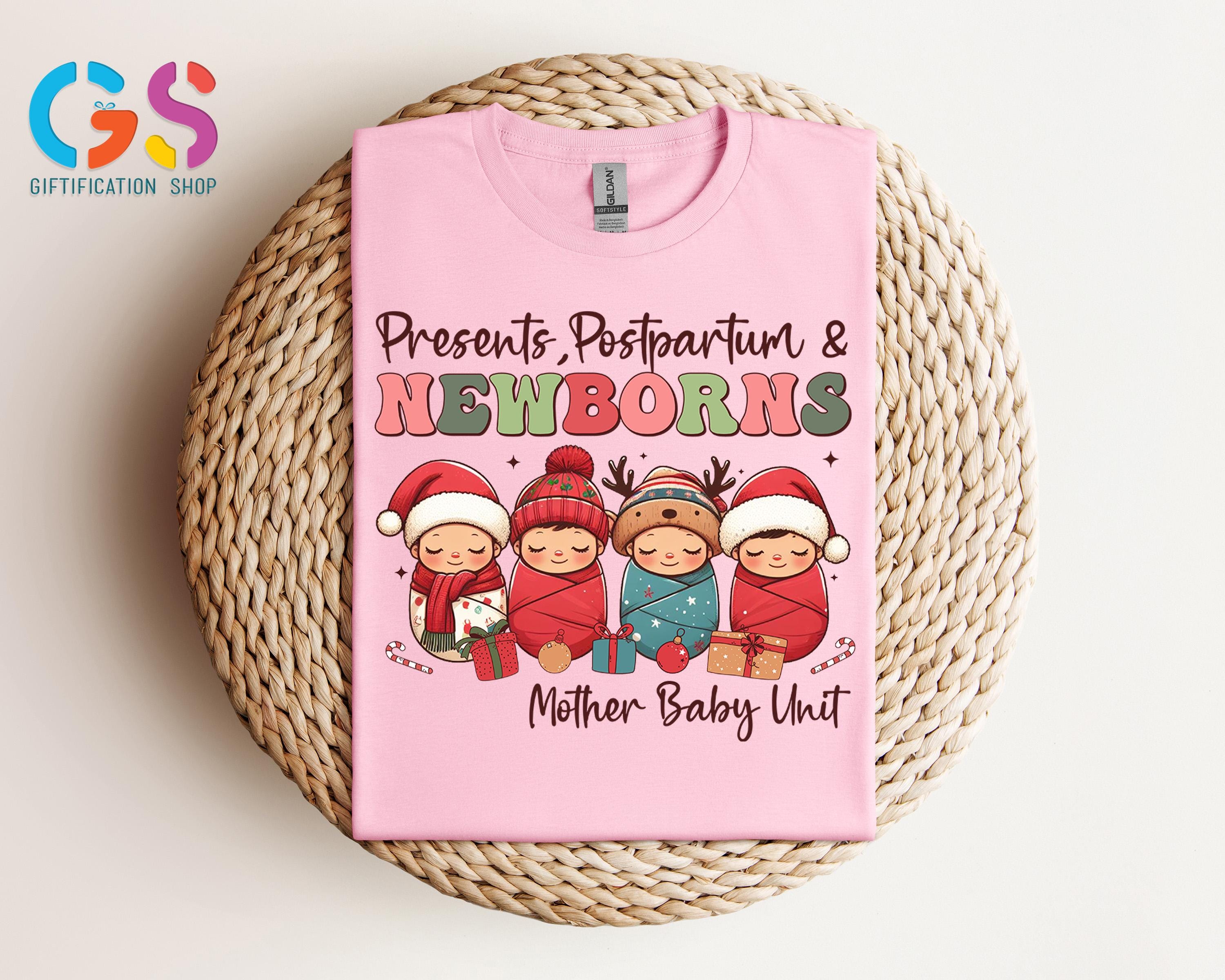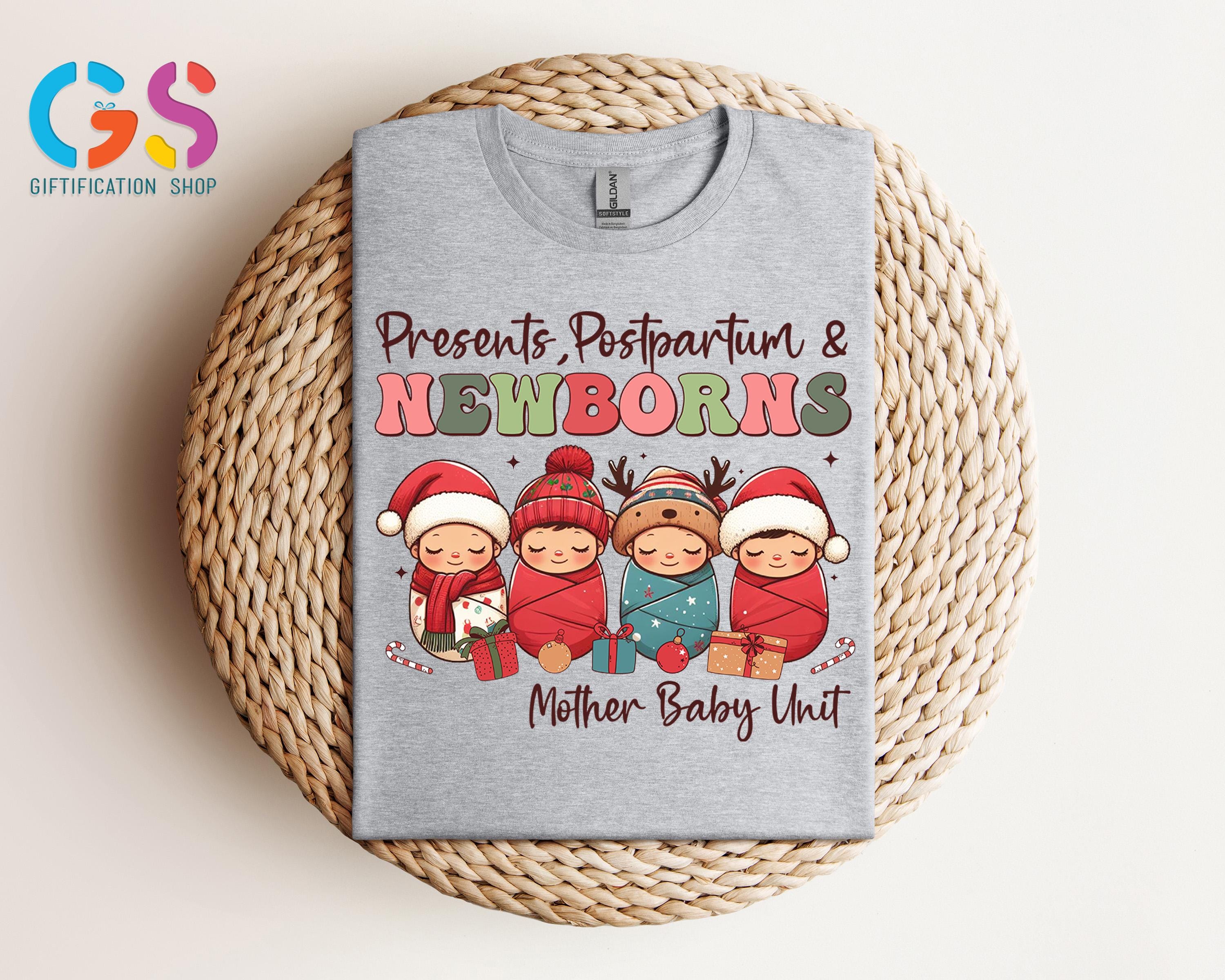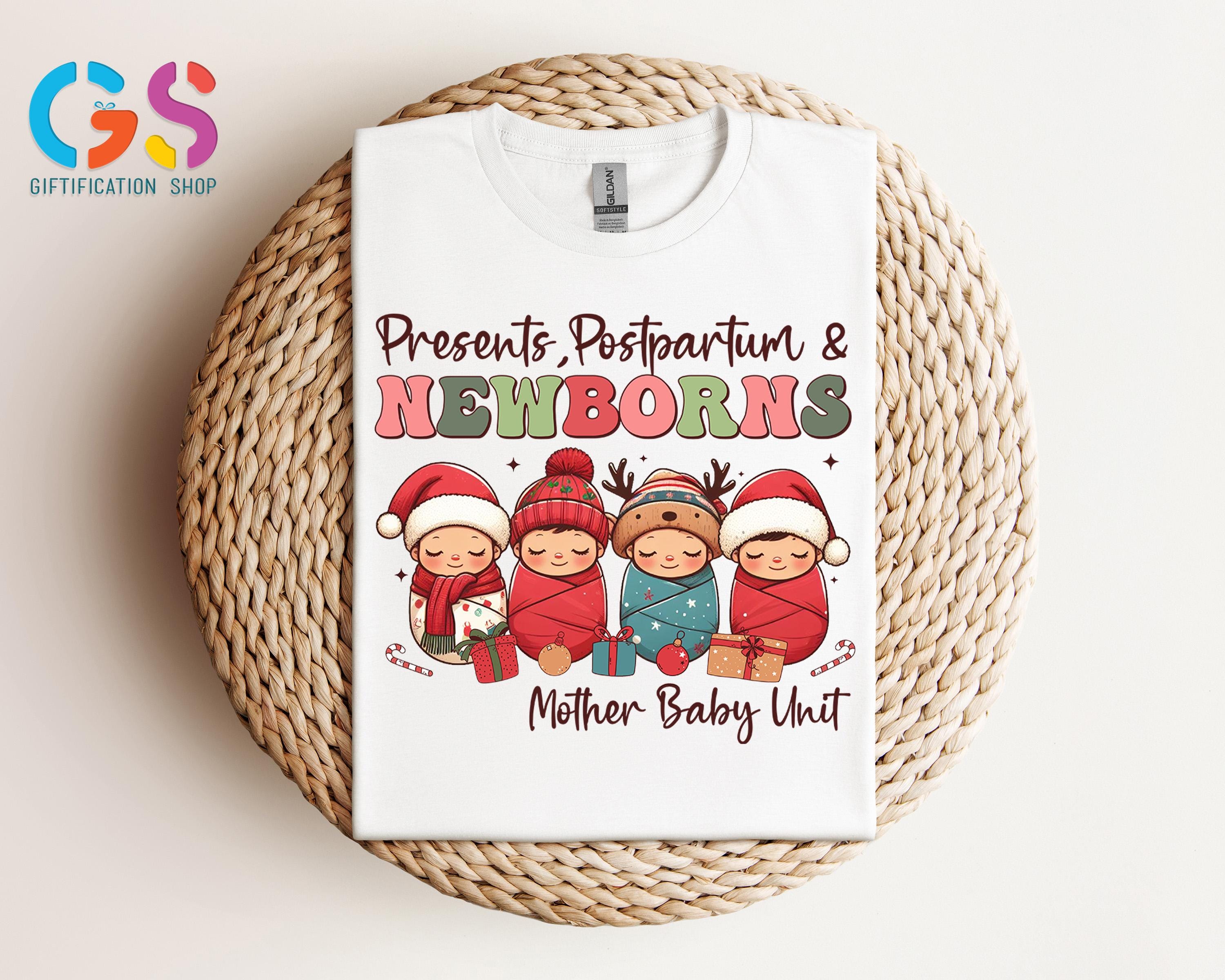 Presents Postpartum Newborns T-shirt, Christmas NICU Nurse Sweatshirt, Labor And Delivery Nurse Christmas Sweat, Mother Baby Unit Nurse Gift