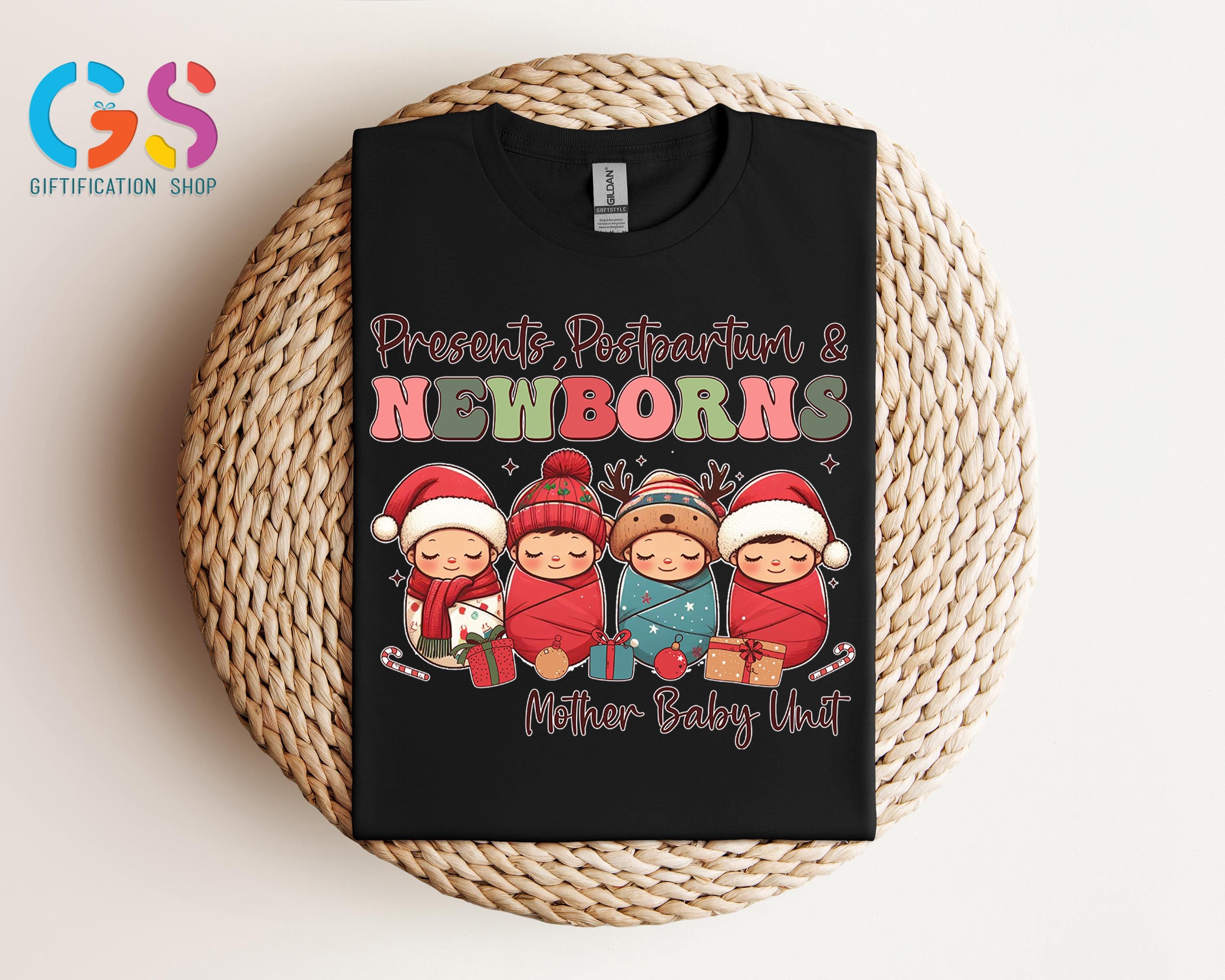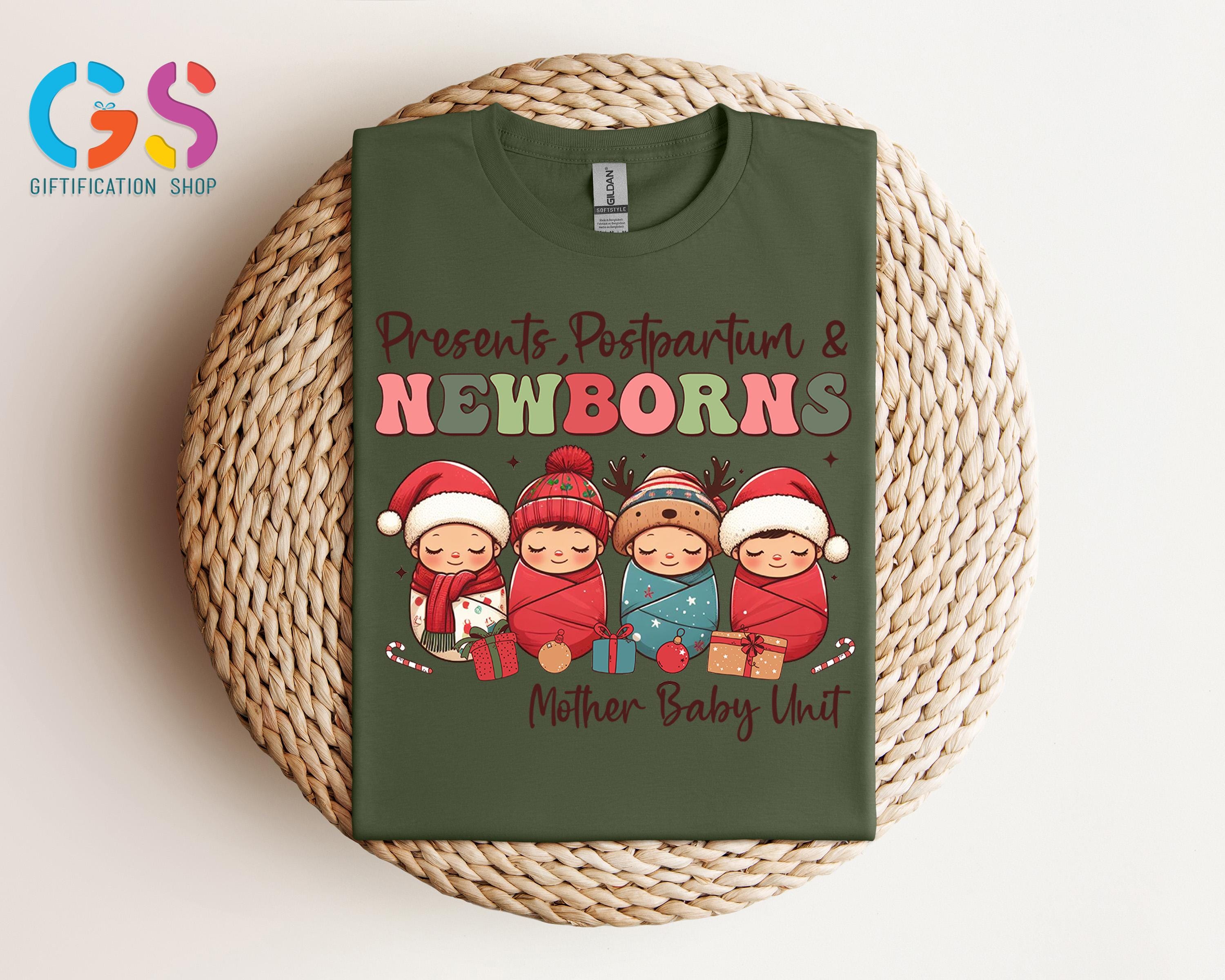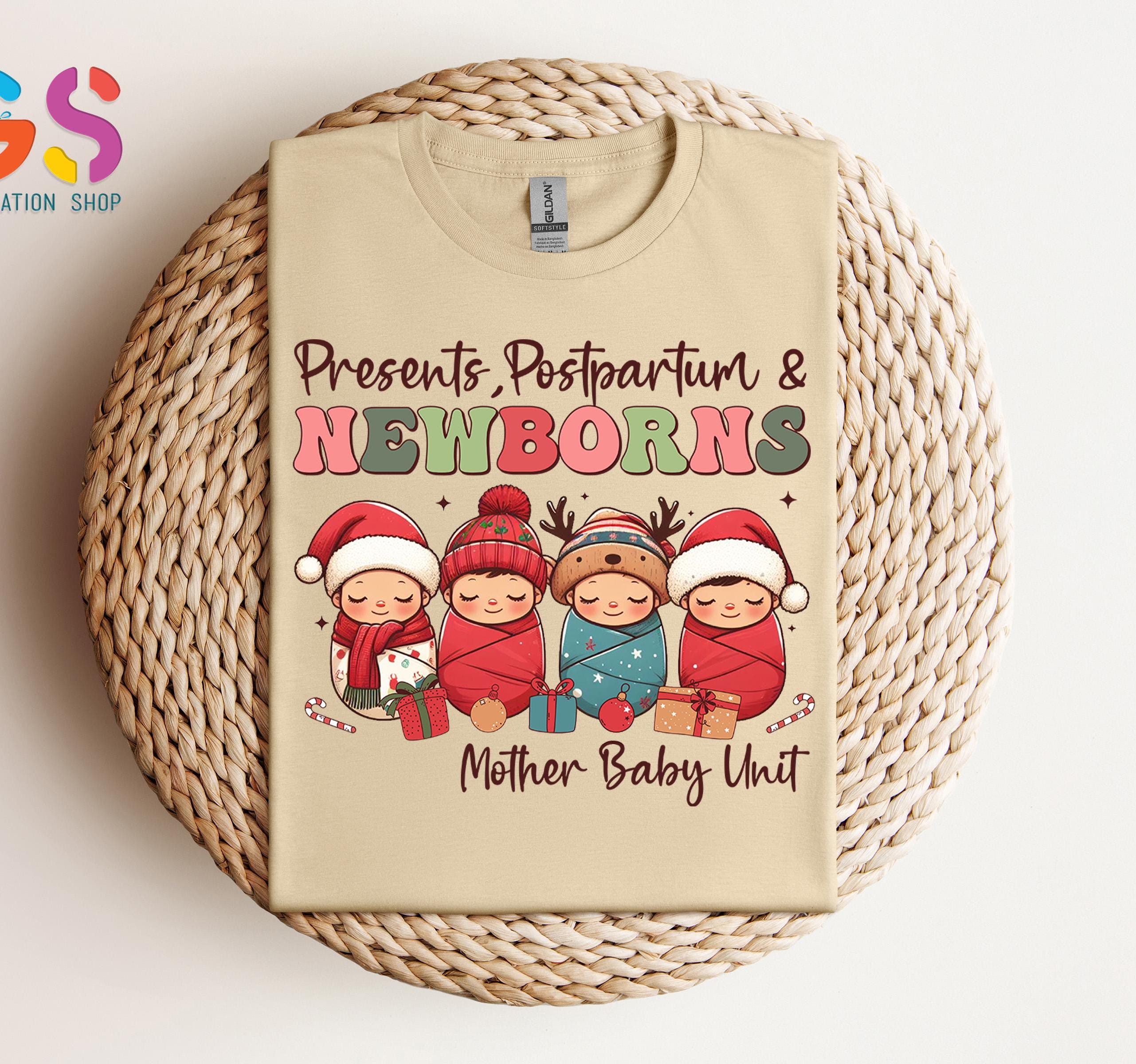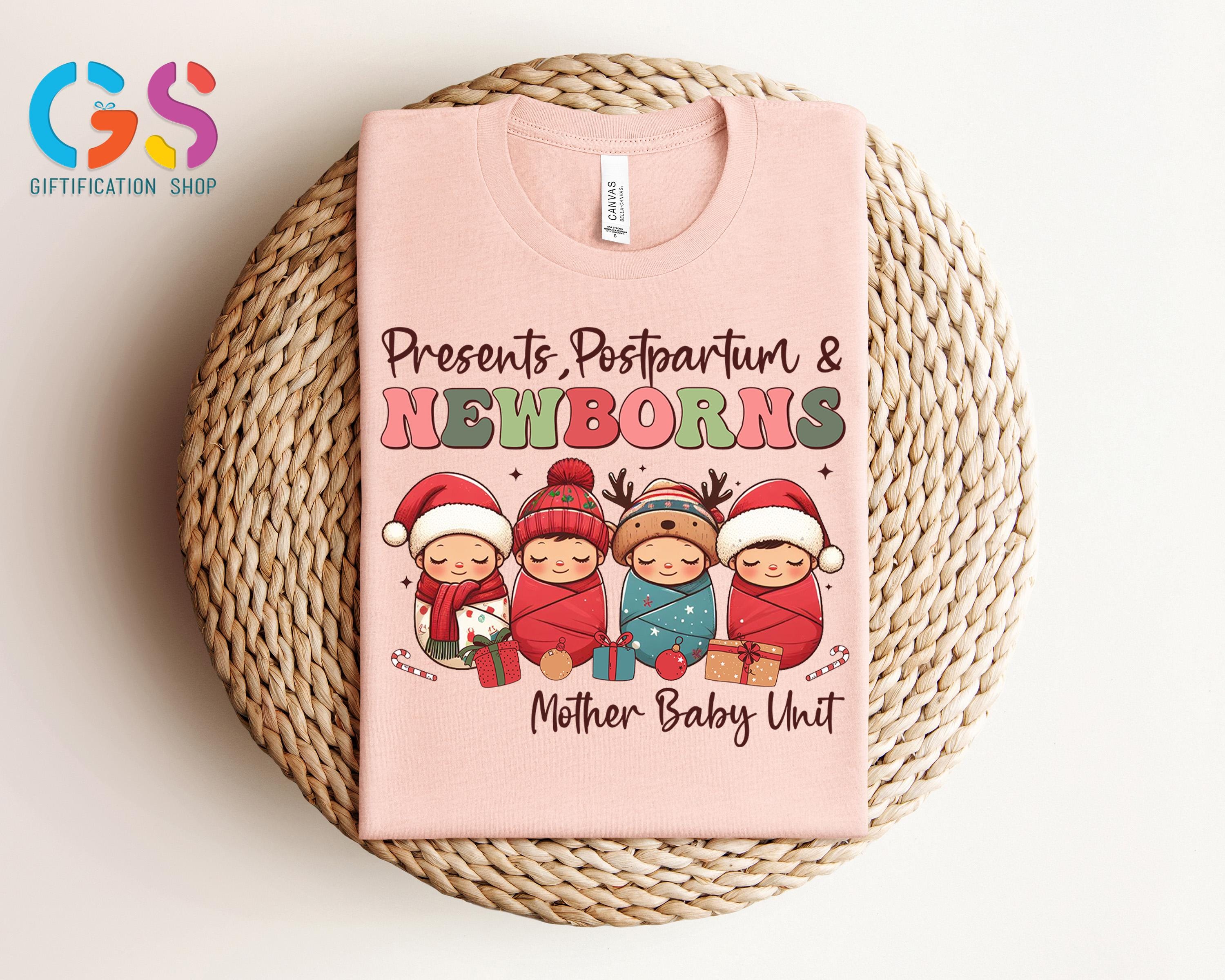 Presents Postpartum Newborns T-shirt, Christmas NICU Nurse Sweatshirt, Labor And Delivery Nurse Christmas Sweat, Mother Baby Unit Nurse Gift
