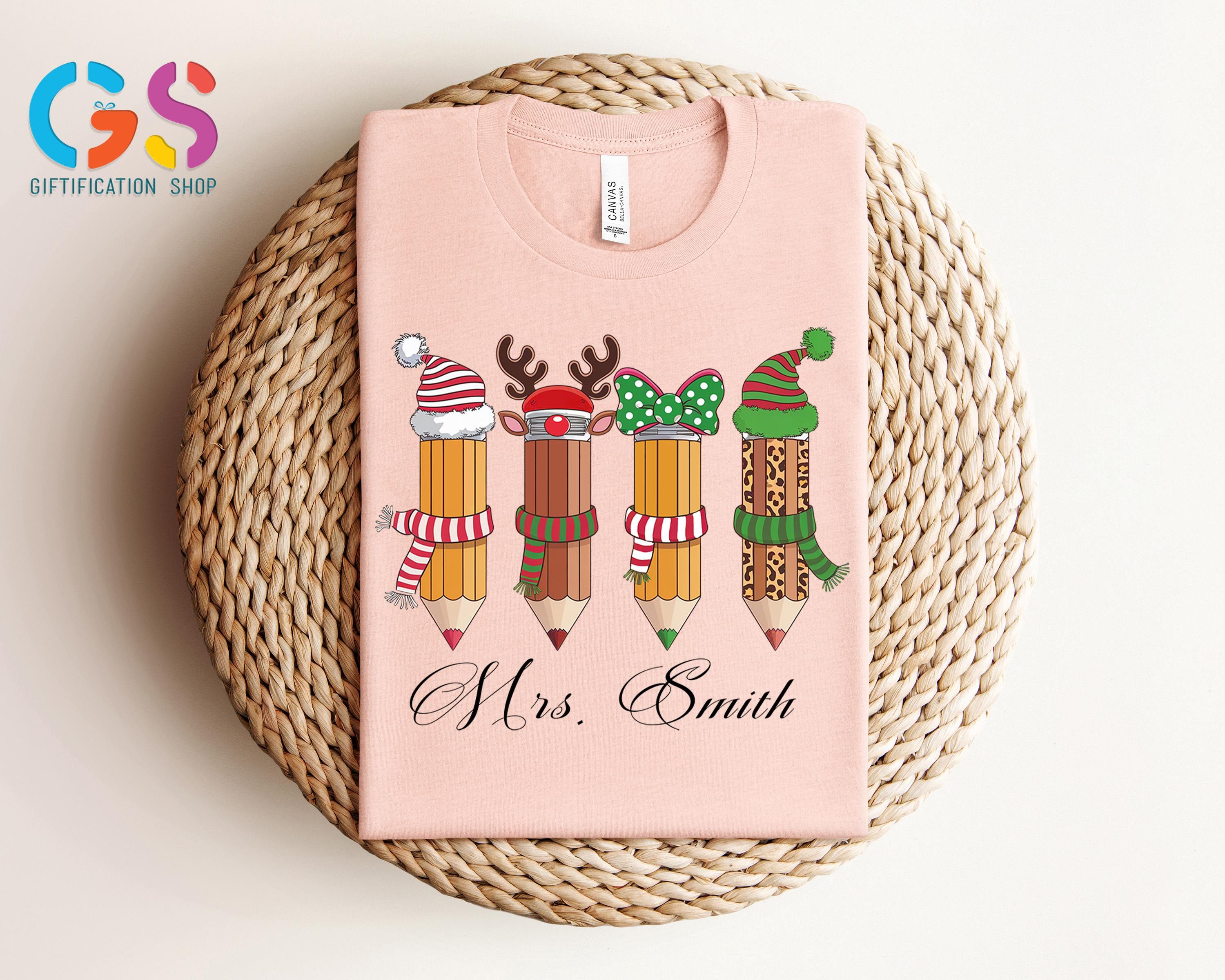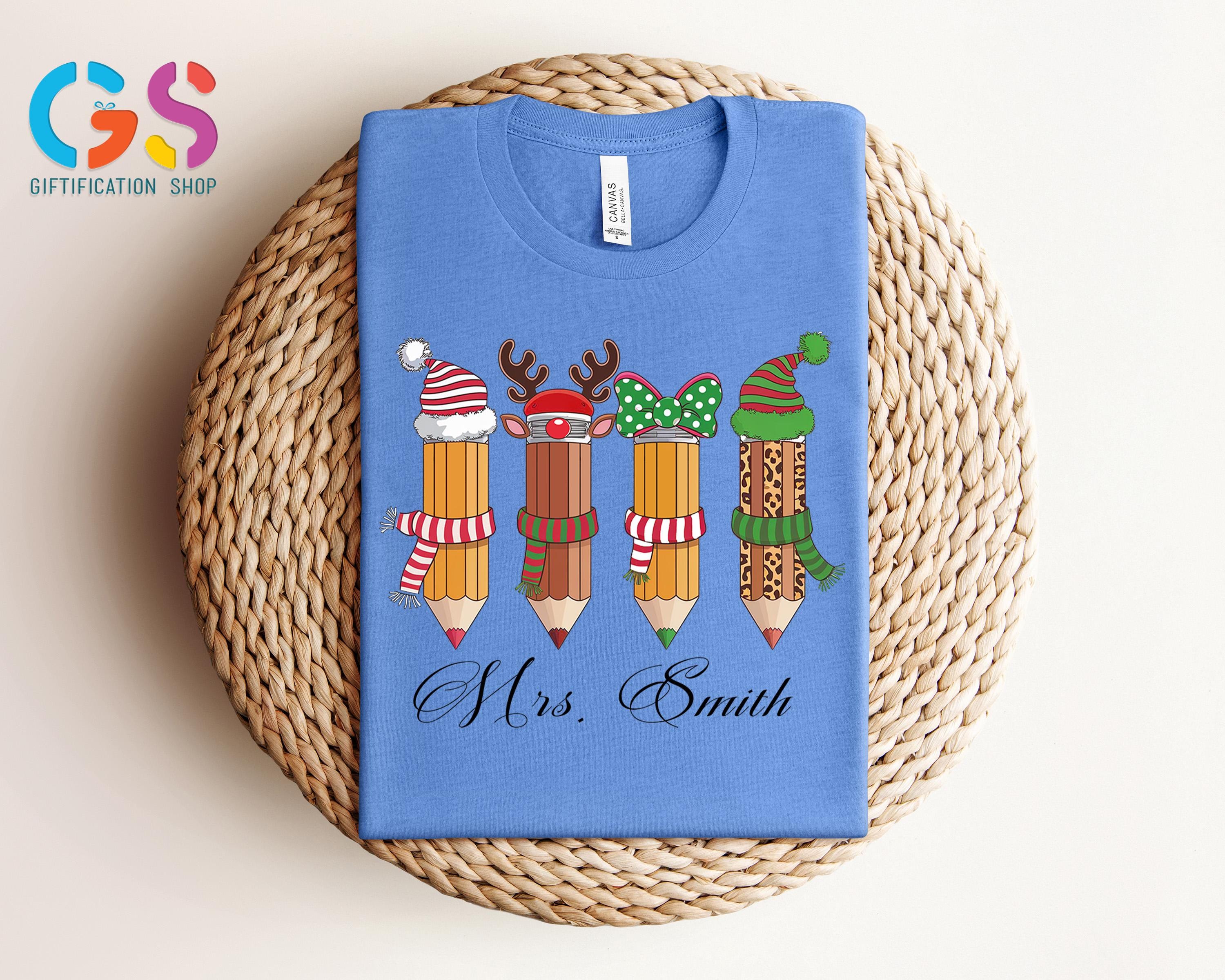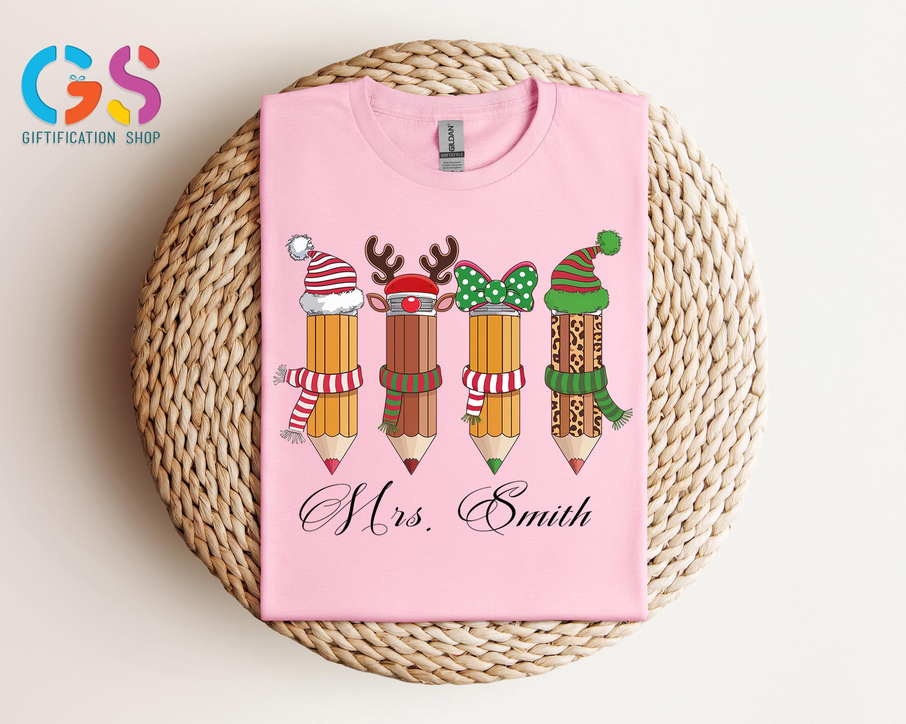 Custom Christmas Pencils T-Shirt, Personalized Teacher Shirt For Christmas, Customized Teacher Gift For Teacher,Teacher Christmas Gift Shirt