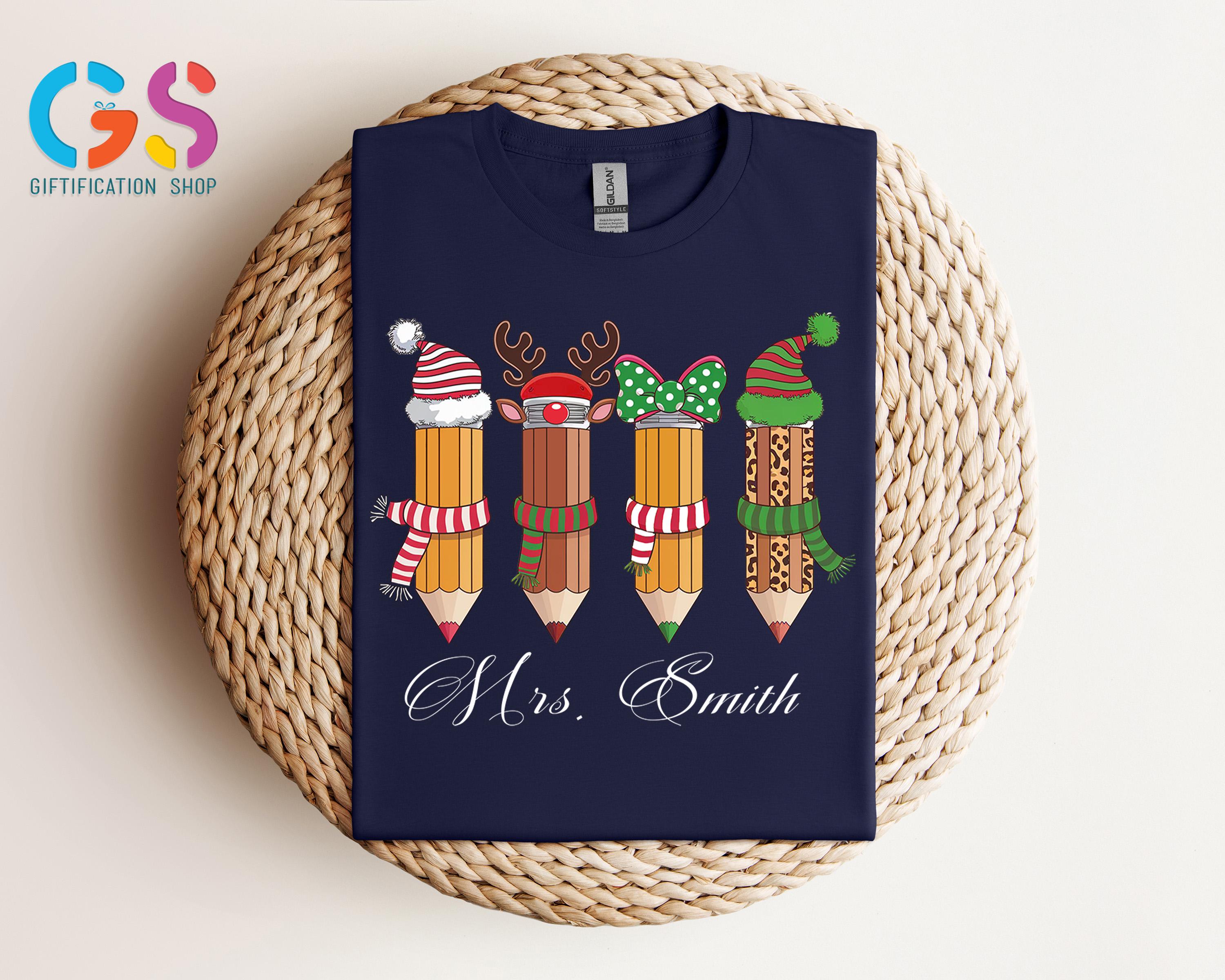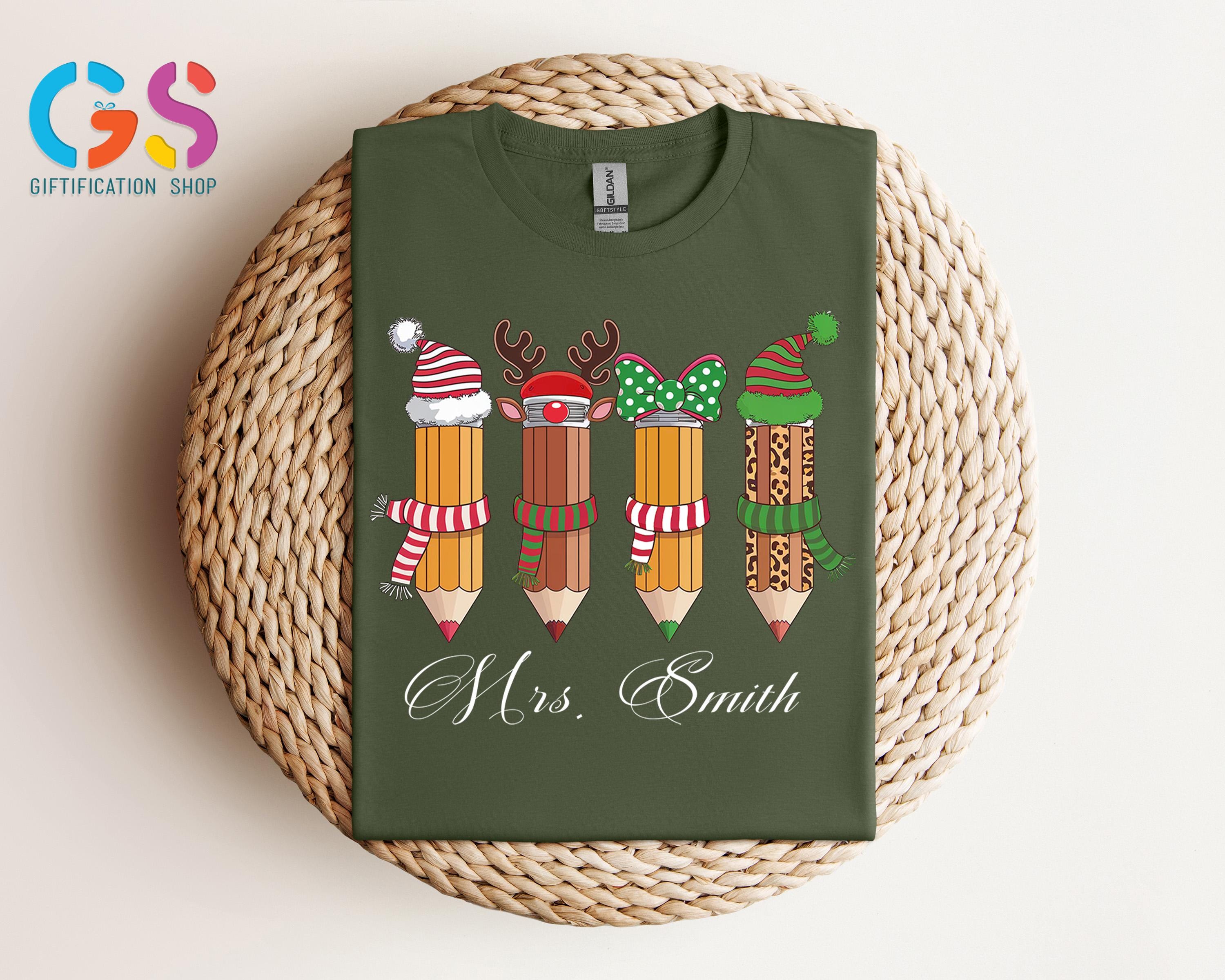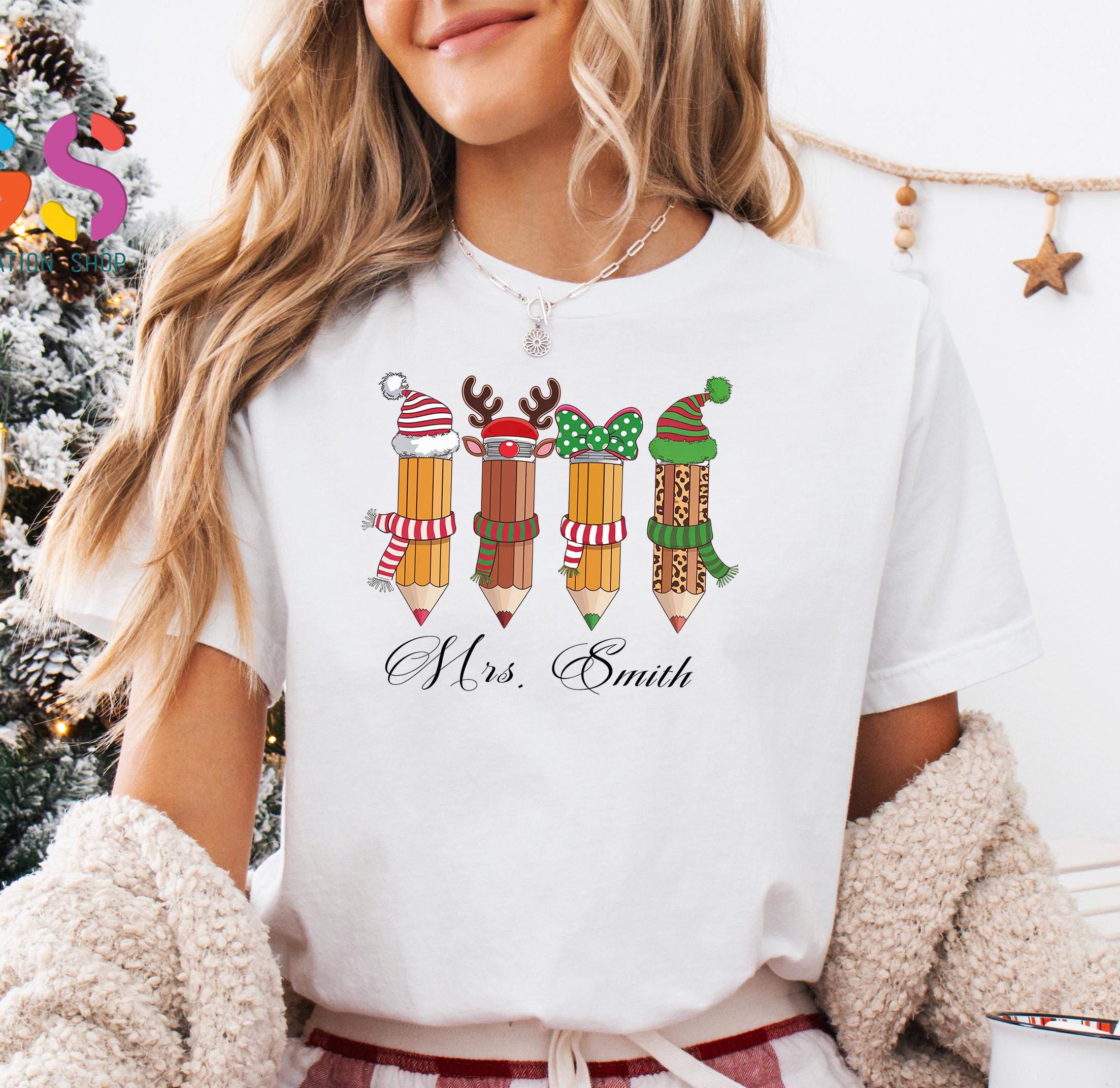 Custom Christmas Pencils T-Shirt, Personalized Teacher Shirt For Christmas, Customized Teacher Gift For Teacher,Teacher Christmas Gift Shirt