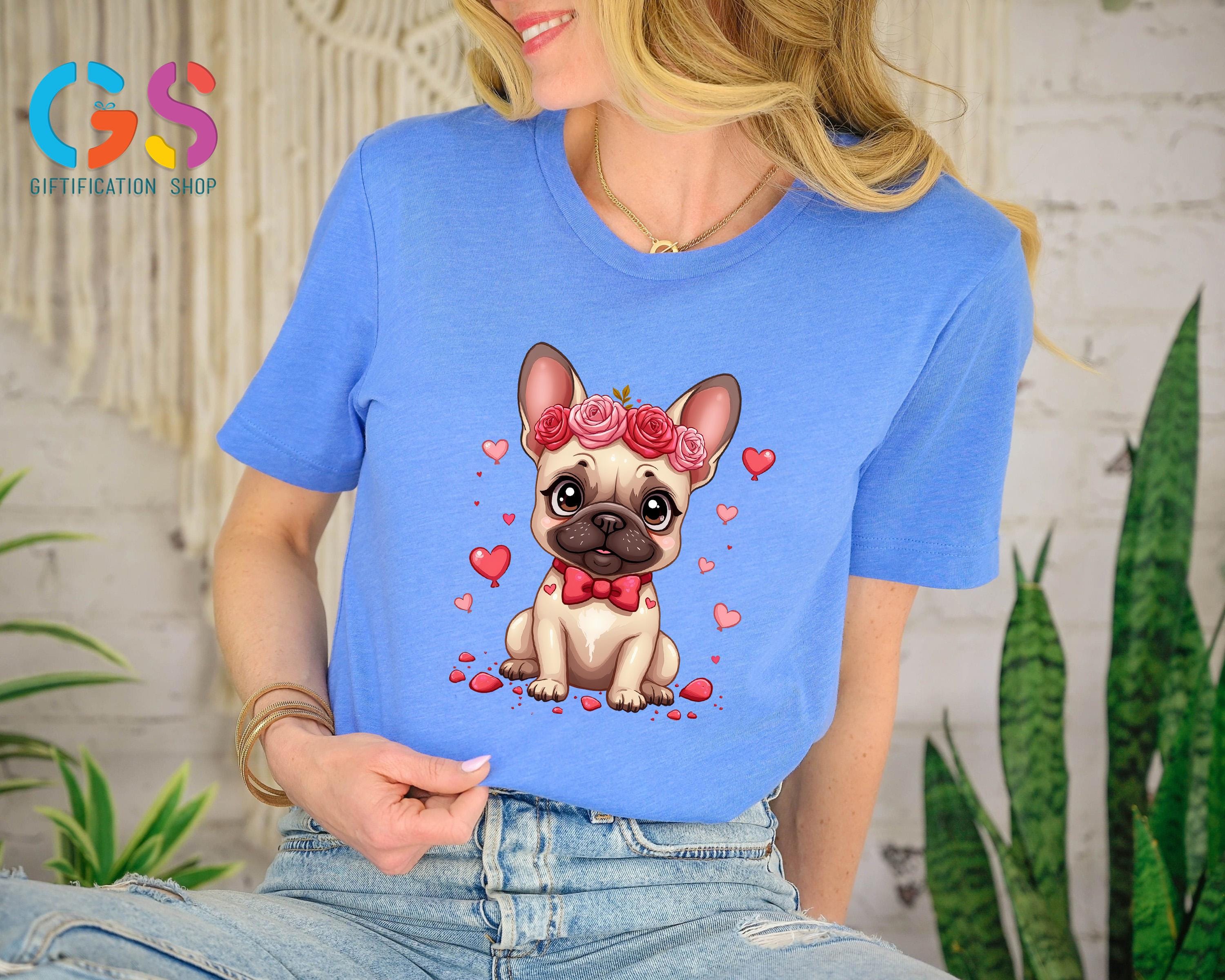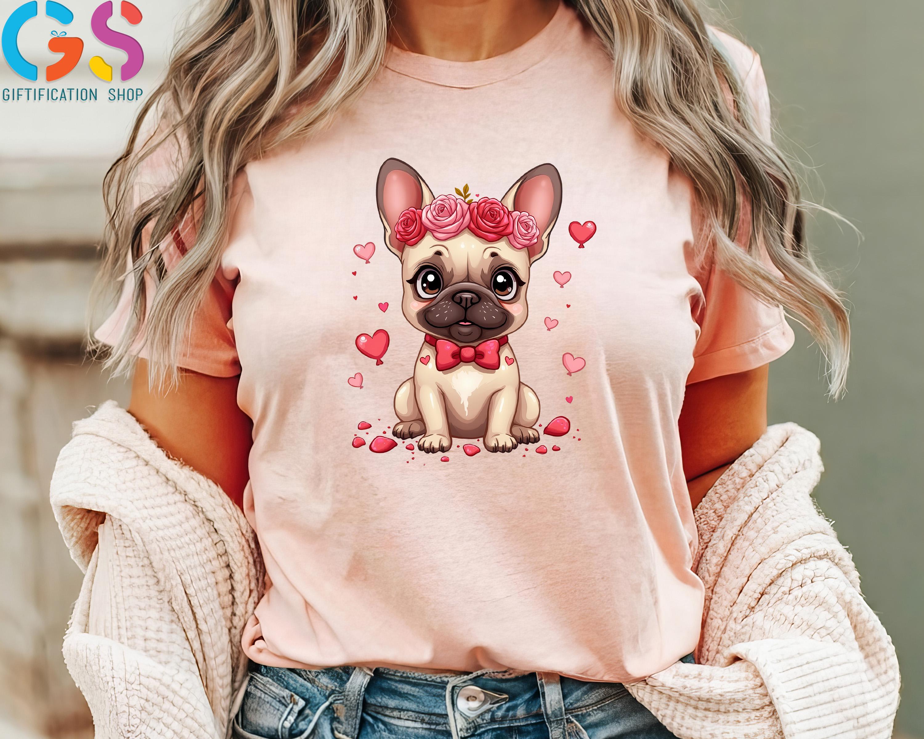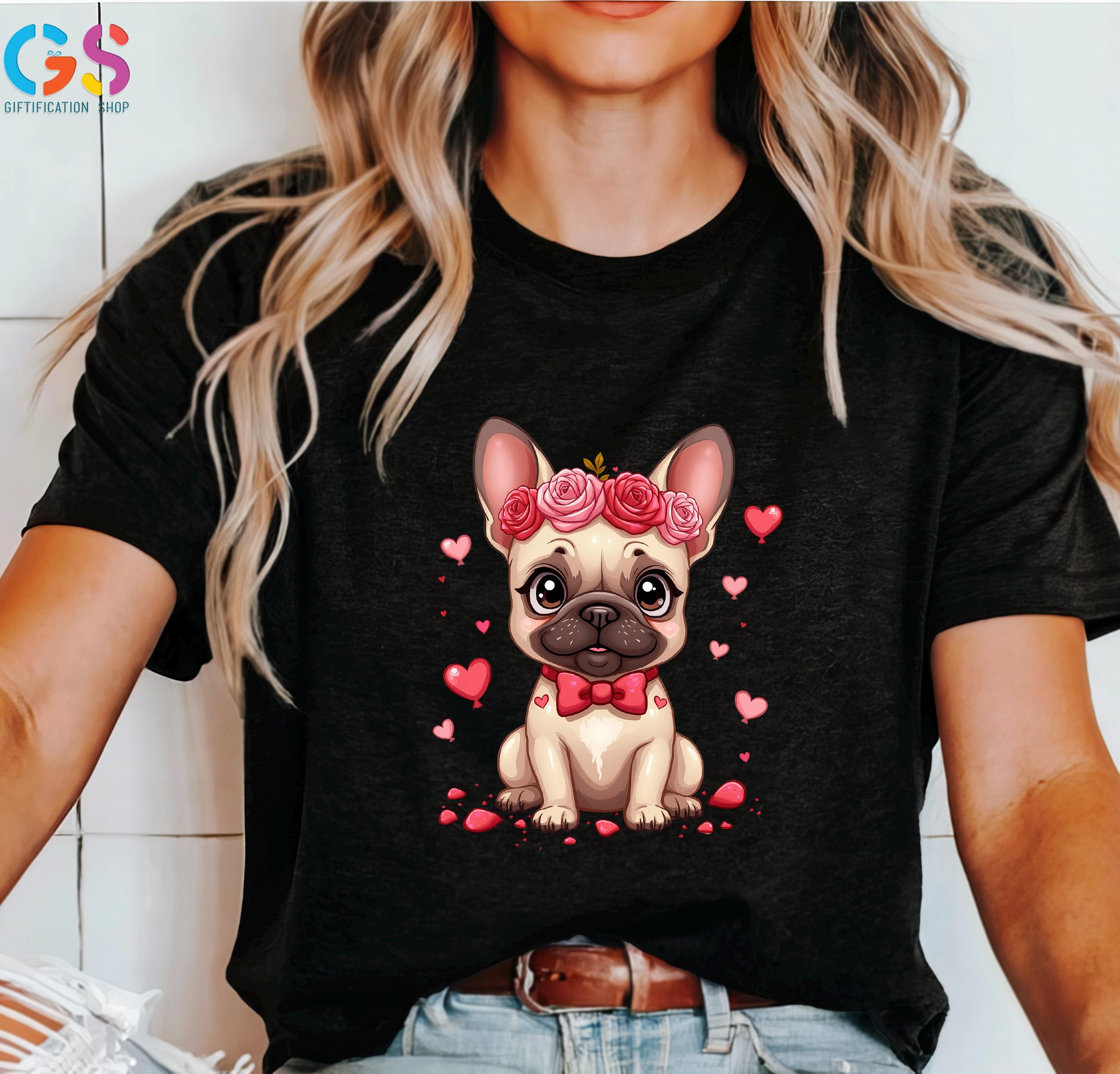 Valentine French Bulldog T-Shirt, Bulldog Mom Shirt, Frenchie With Floral Crown Tee, Valentine’s Day Dog TShirt, Cute Bulldog Shirt