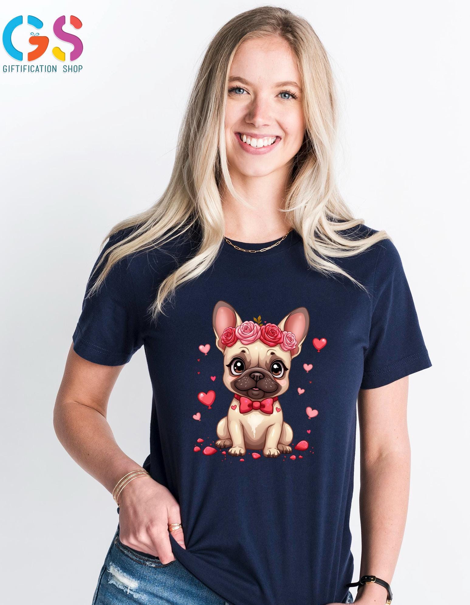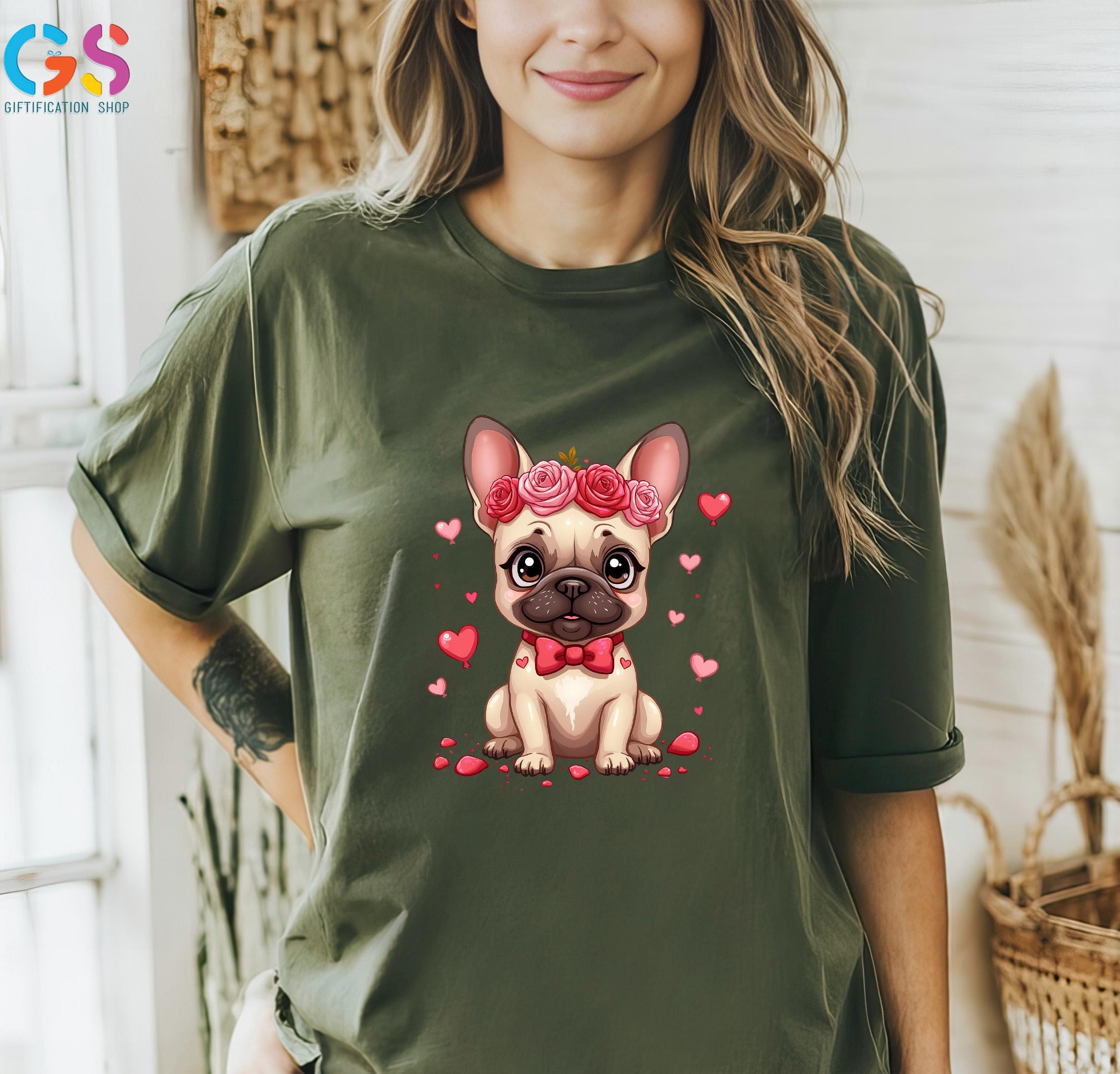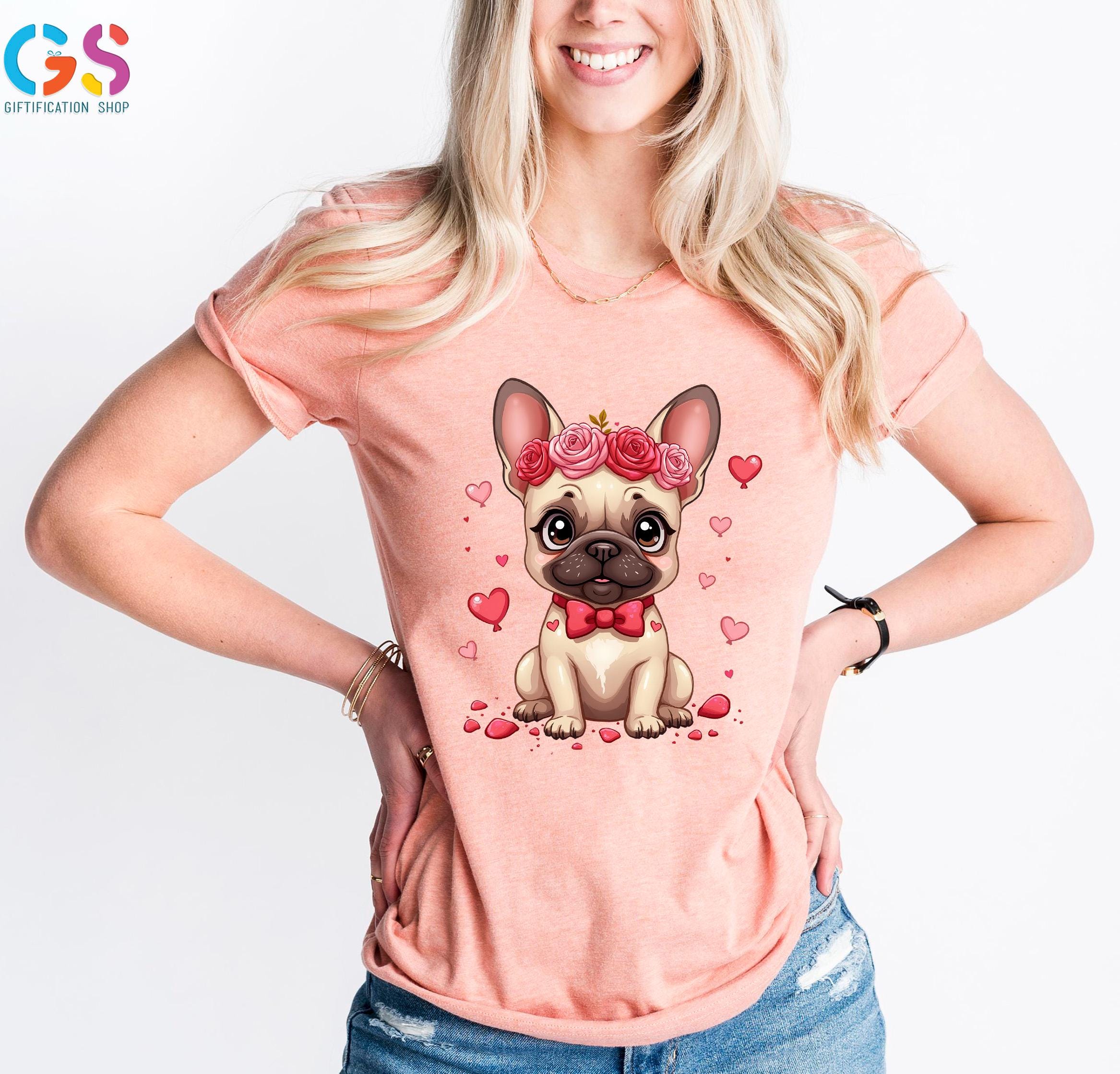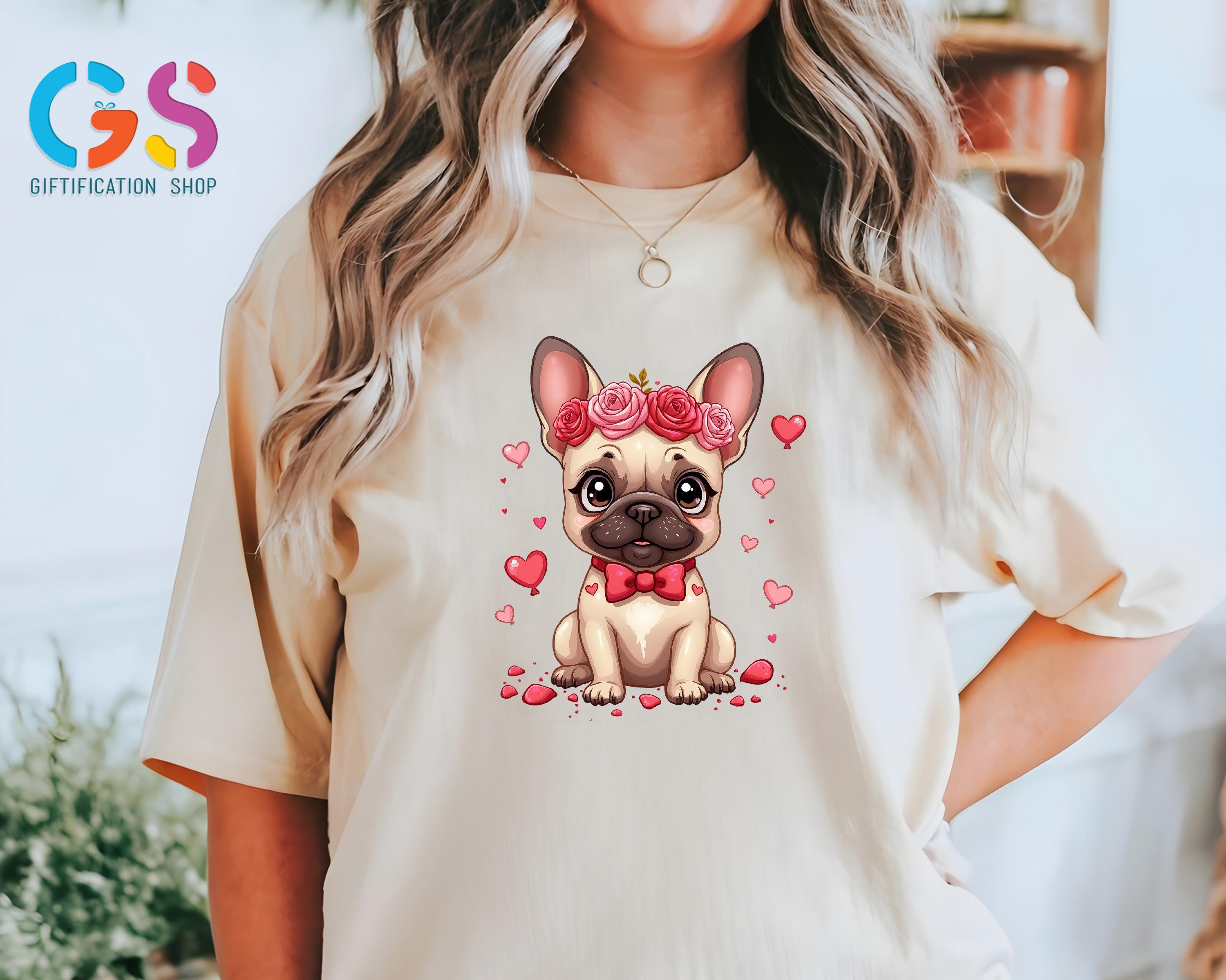 Valentine French Bulldog T-Shirt, Bulldog Mom Shirt, Frenchie With Floral Crown Tee, Valentine’s Day Dog TShirt, Cute Bulldog Shirt