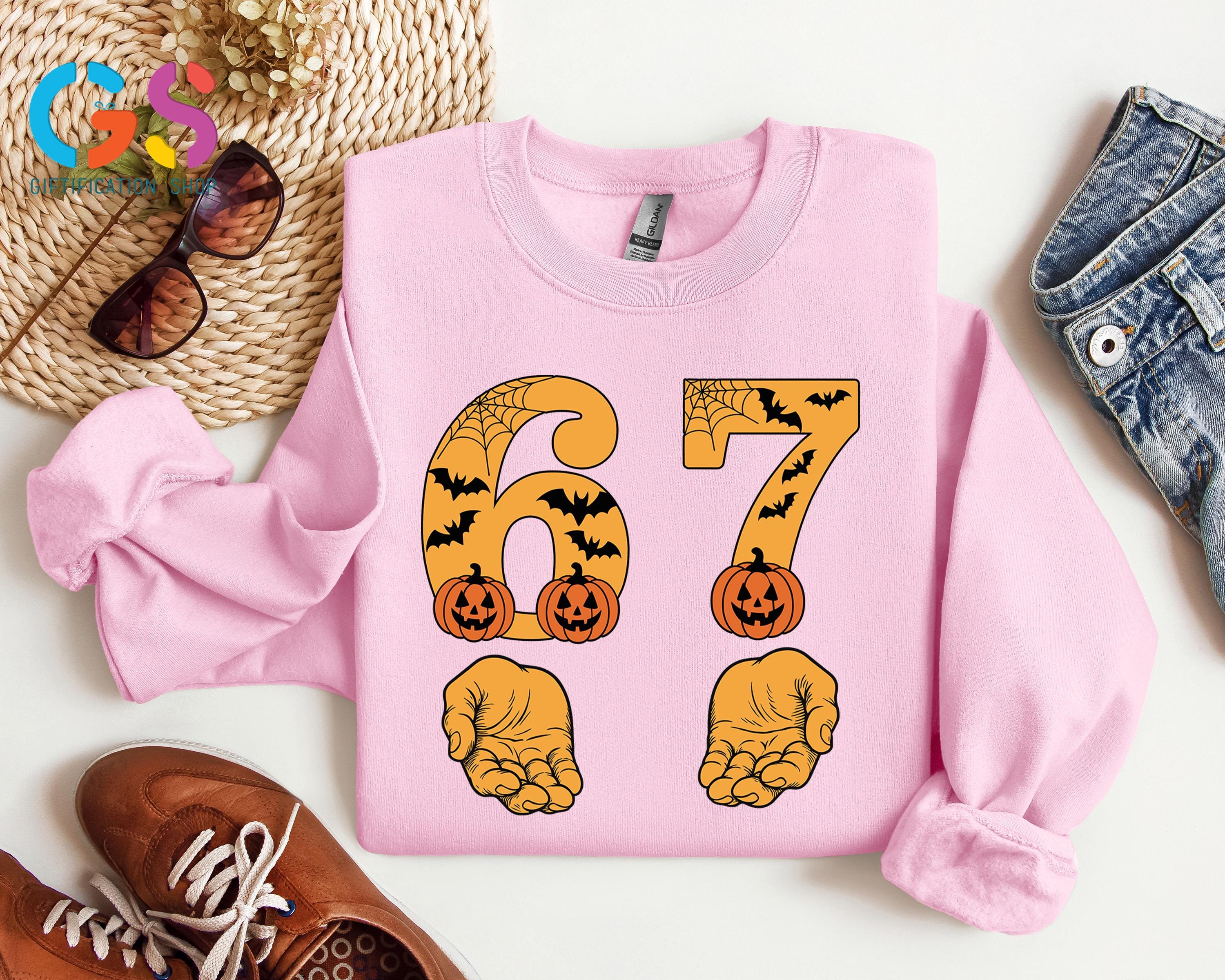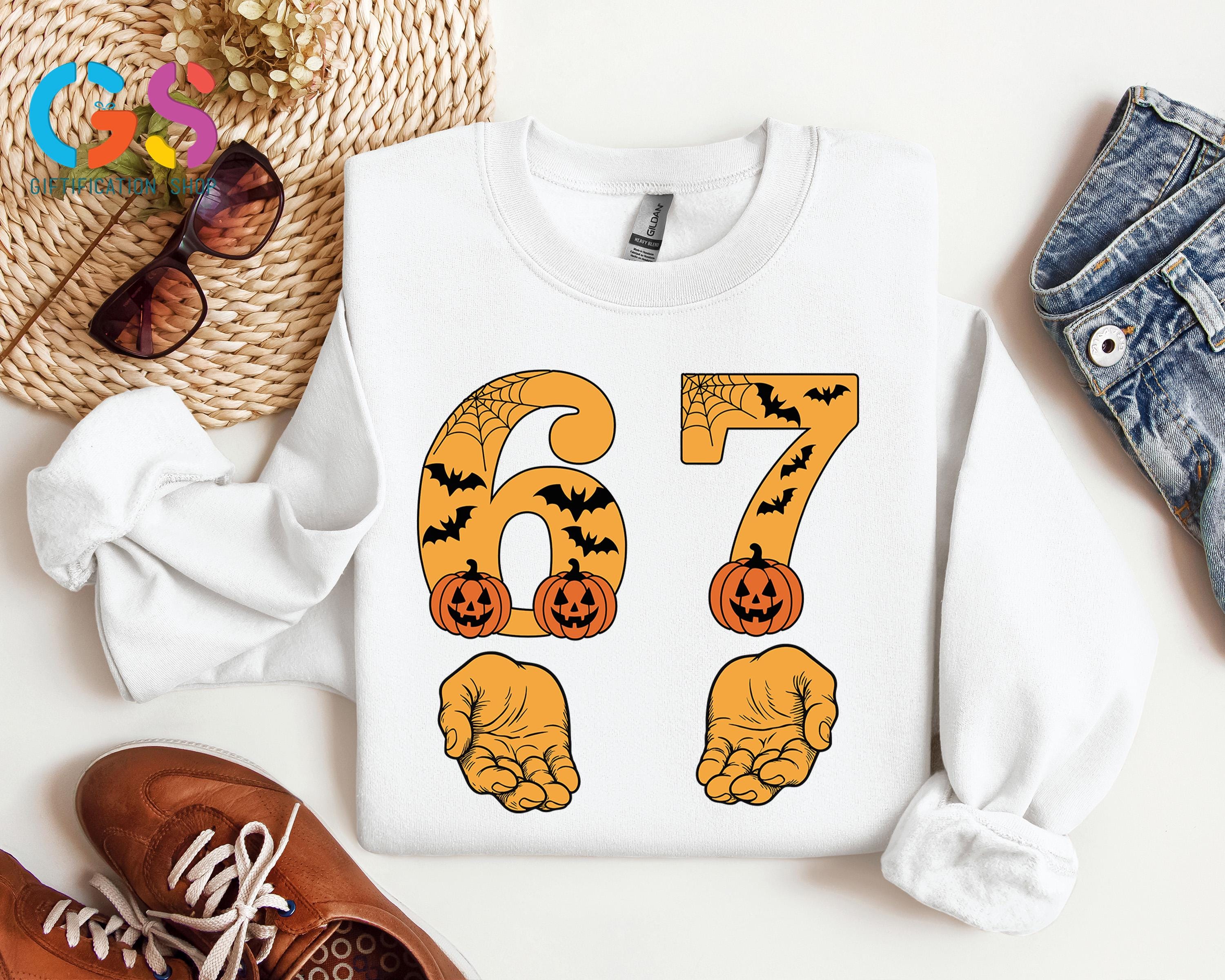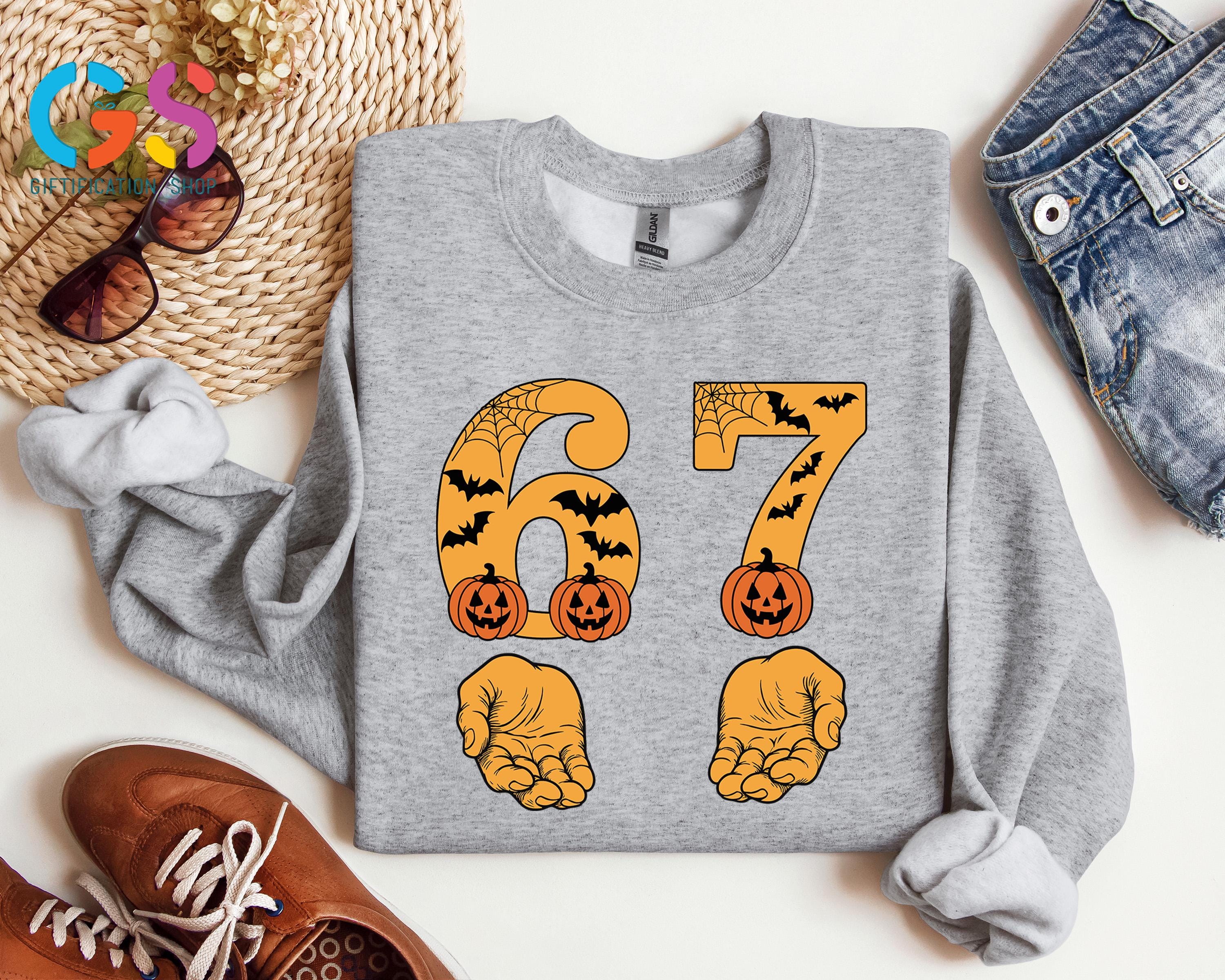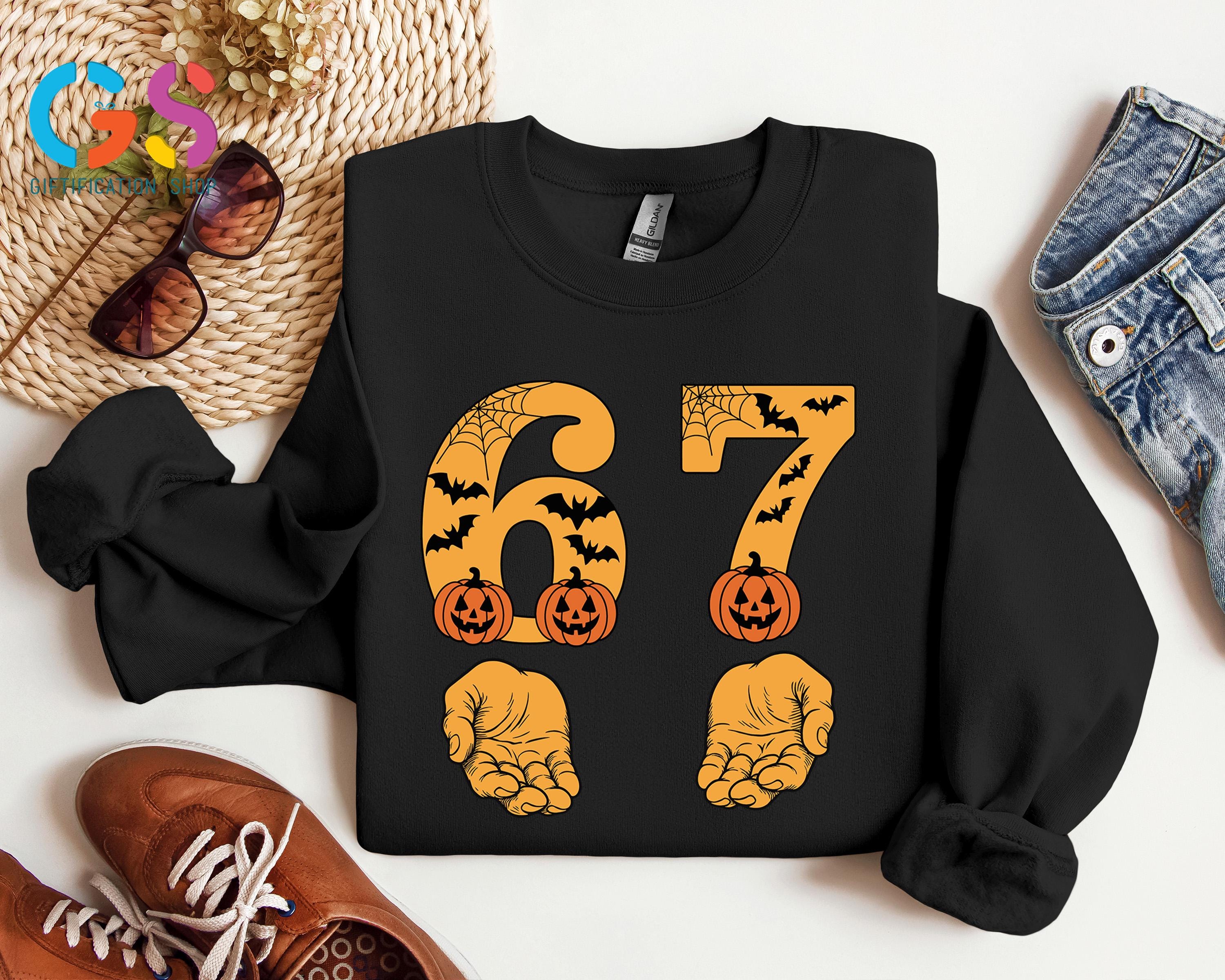 Spooky 6 7 Meme Sweatshirt, Halloween Trendy Numbers, Pumpkin and Bats Meme Hoodie, Internet Joke Hallooween Sweater, Funny Halloween Gift