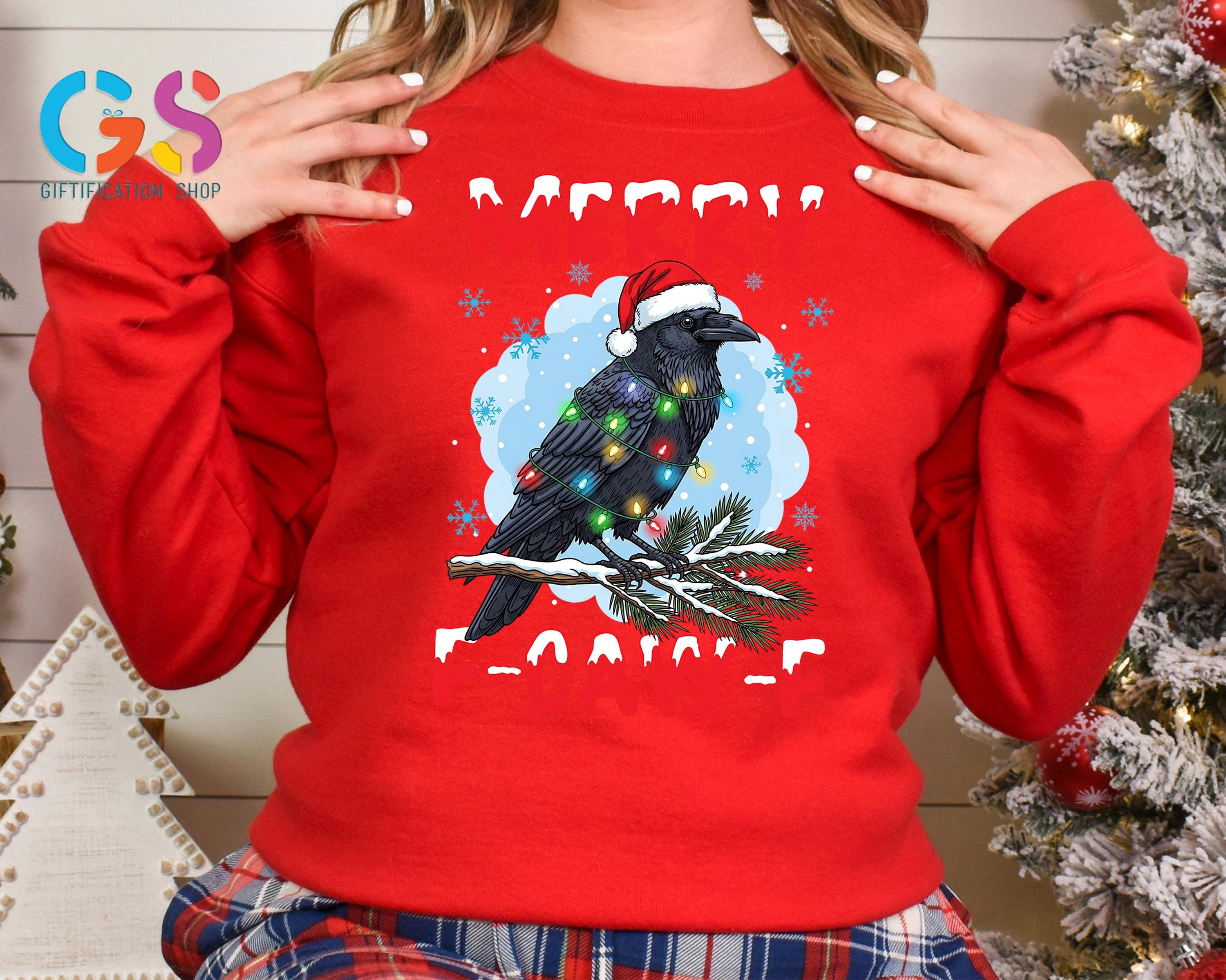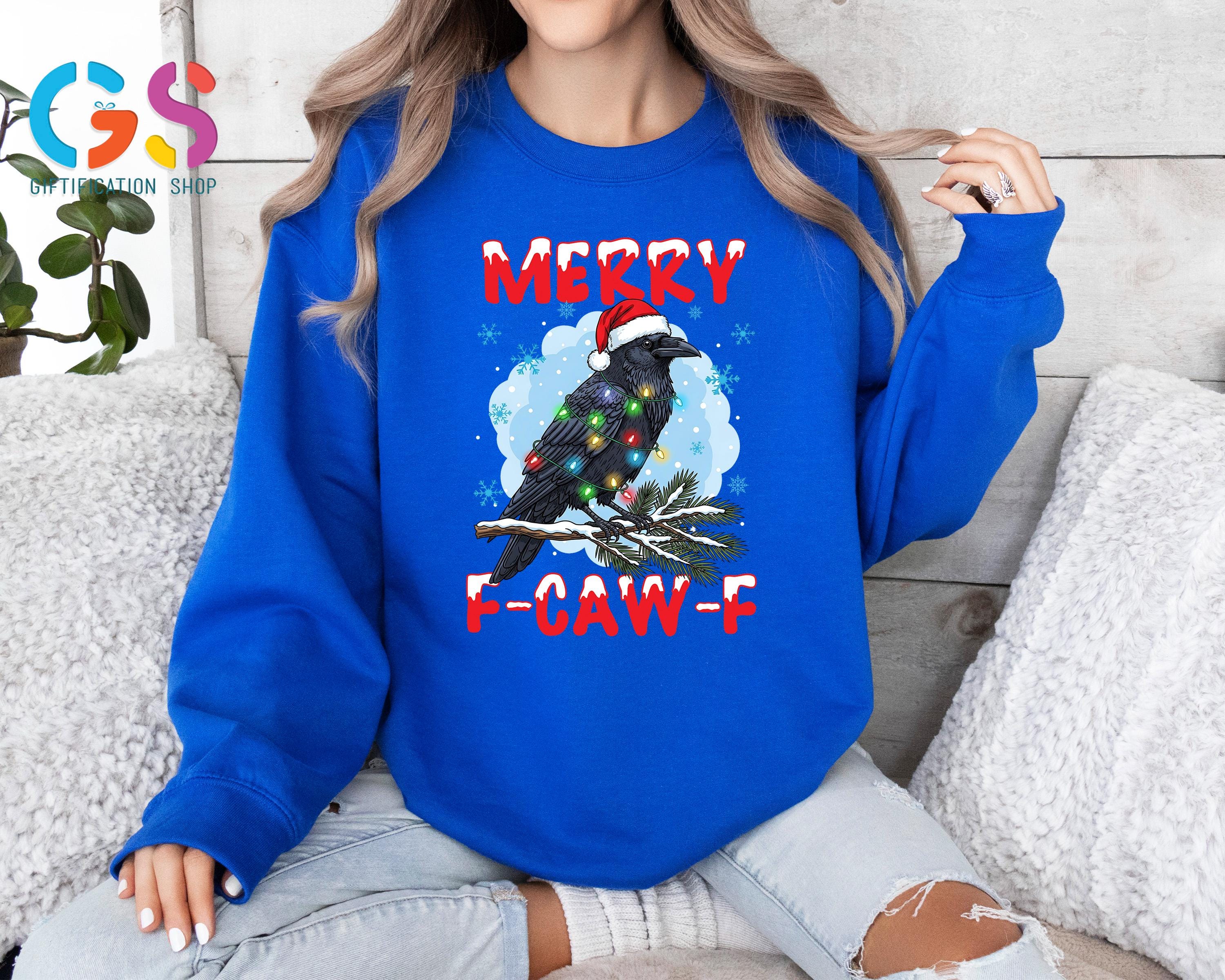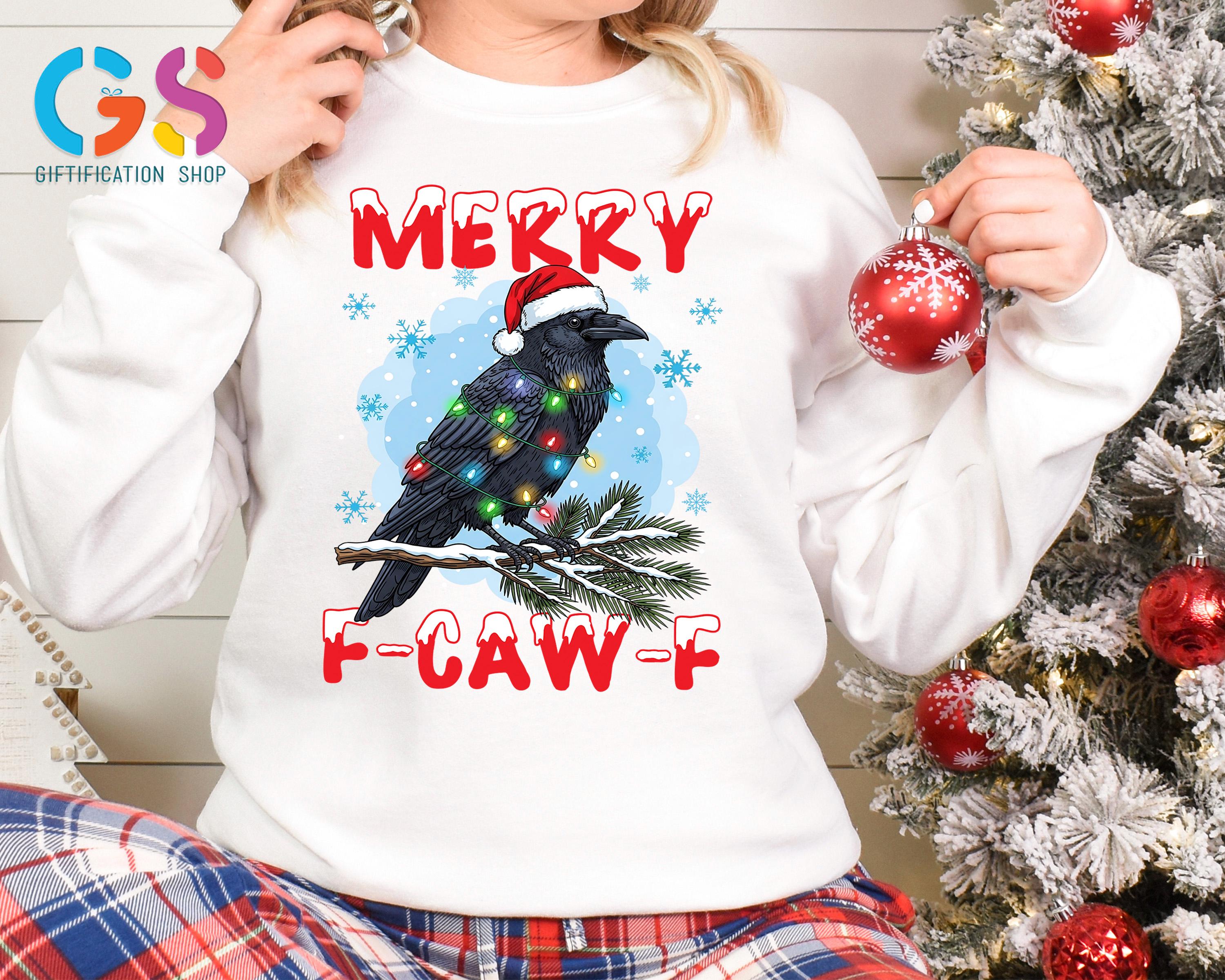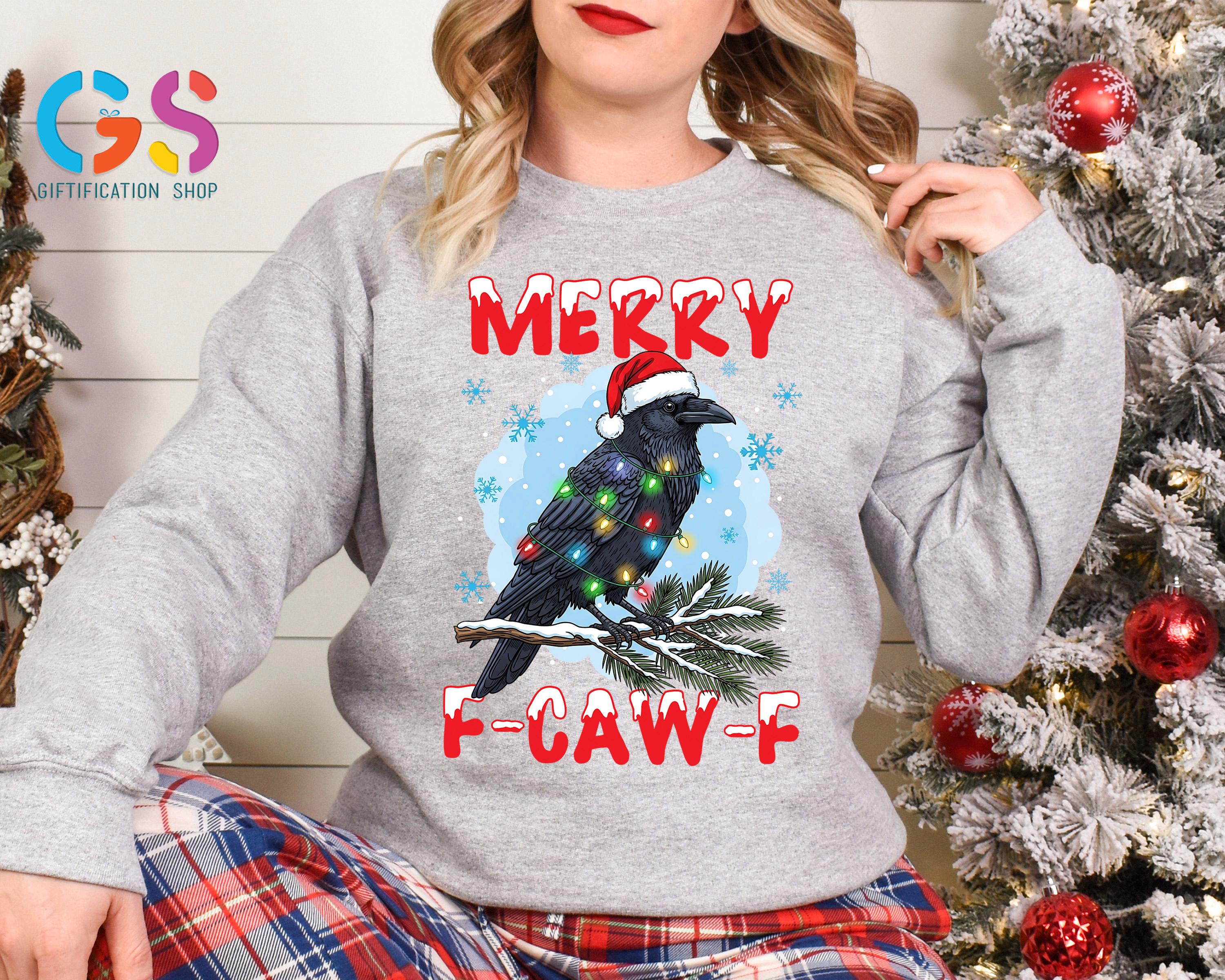 Merry Christmas F-Caw-F Crow Sweatshirt, Santa Black Bird Sweater, Raven Lover Sweatshirt, Christmas Lights Raven Hoodie, Holiday Gift