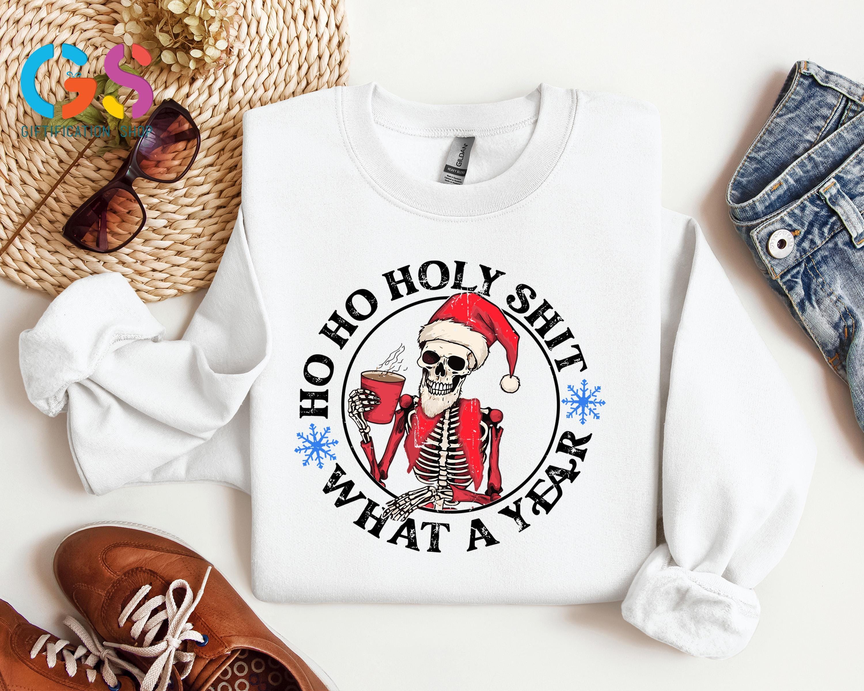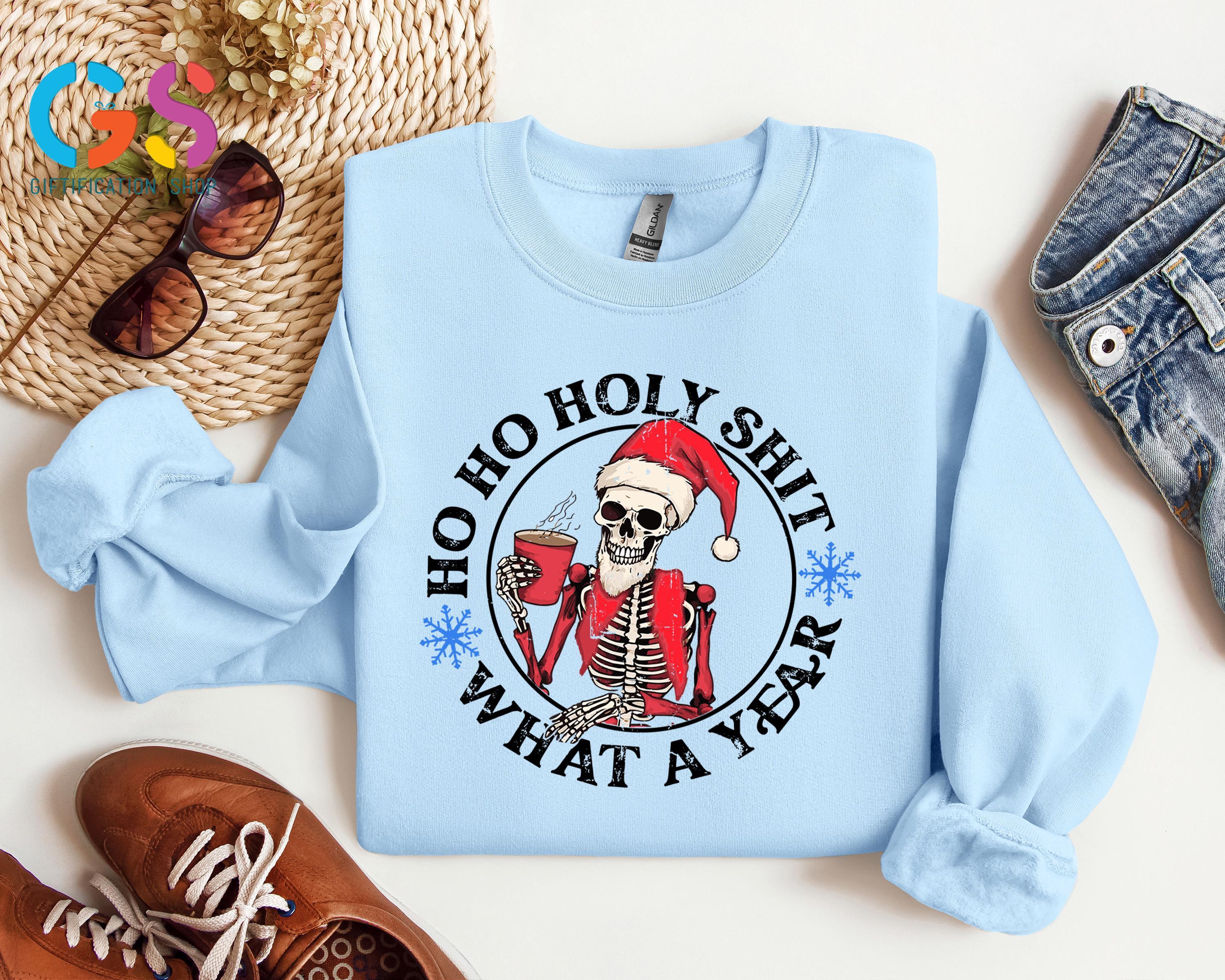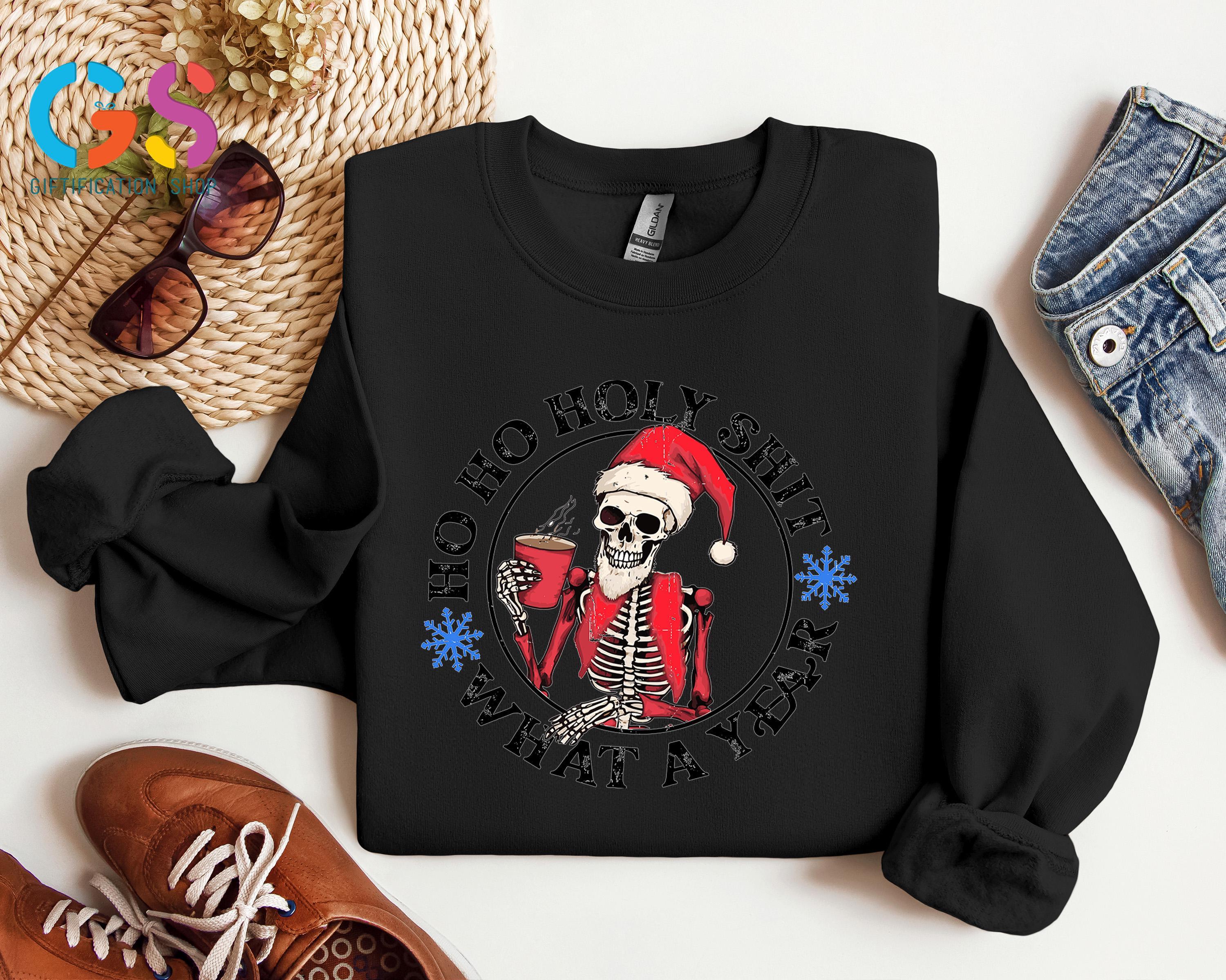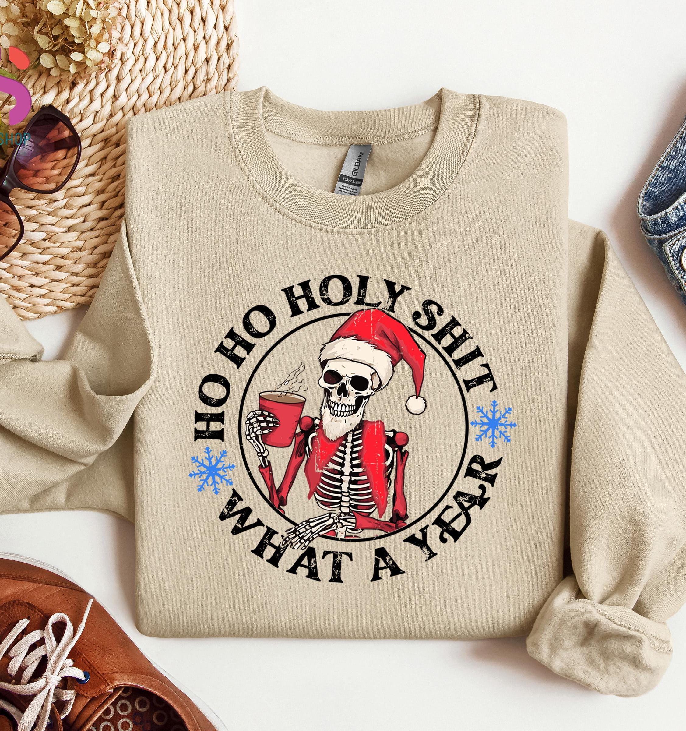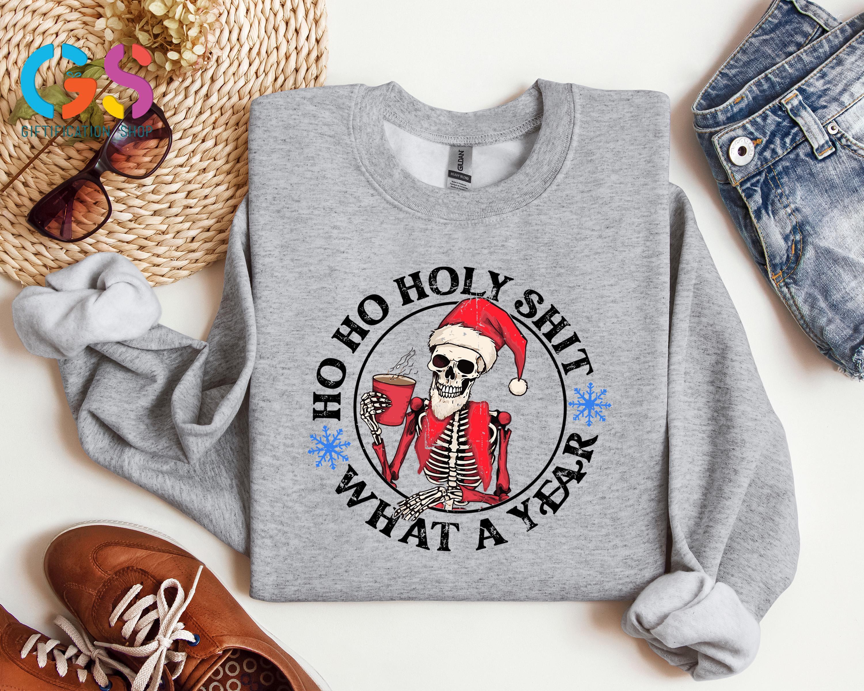 Bring laughter to the holidays with this Ho Ho Holy Shit What a Year Sweater! Featuring a hilarious Skeleton Santa design, this sarcastic Christmas sweatshirt is perfect for anyone who loves edgy humor and festive fun.