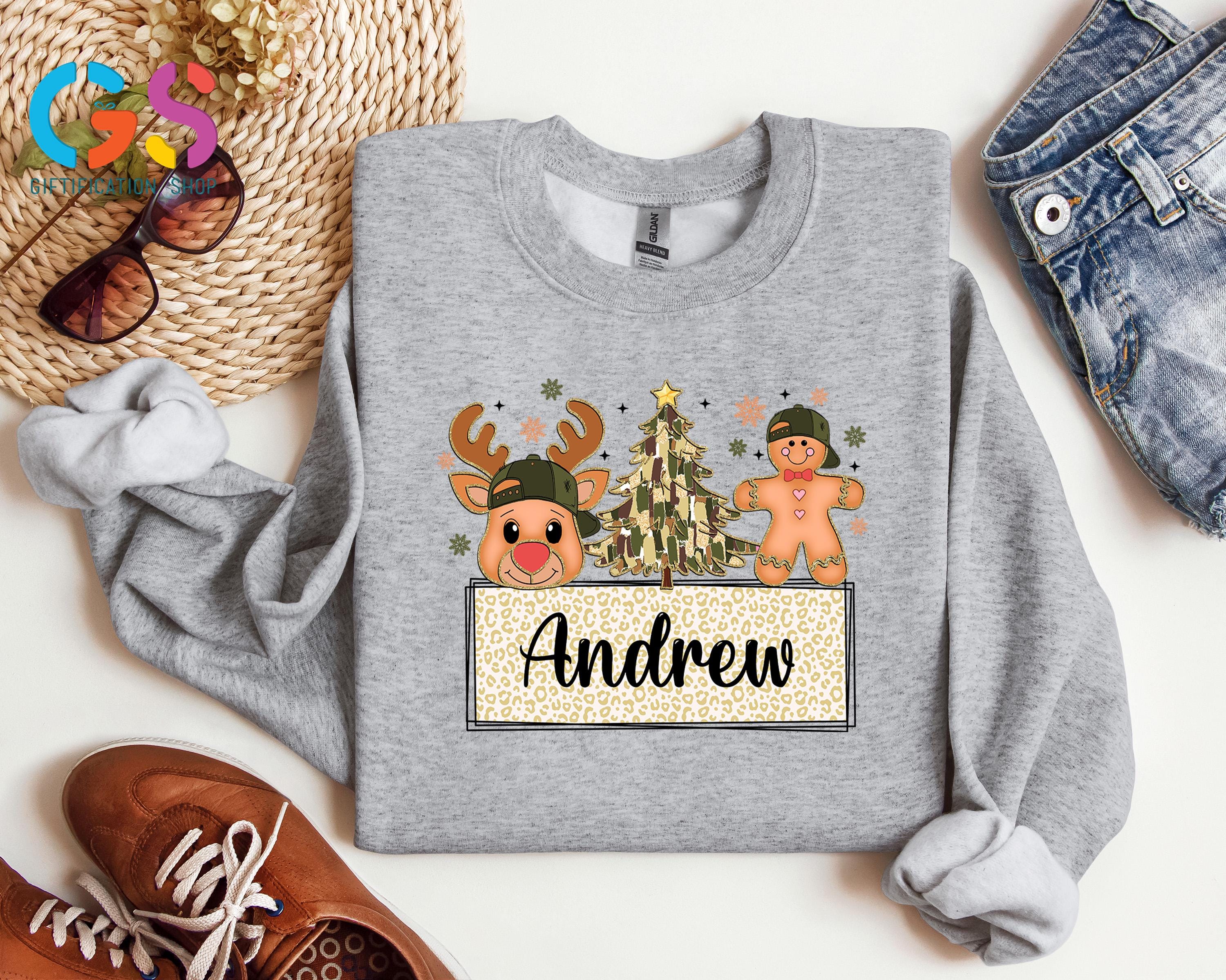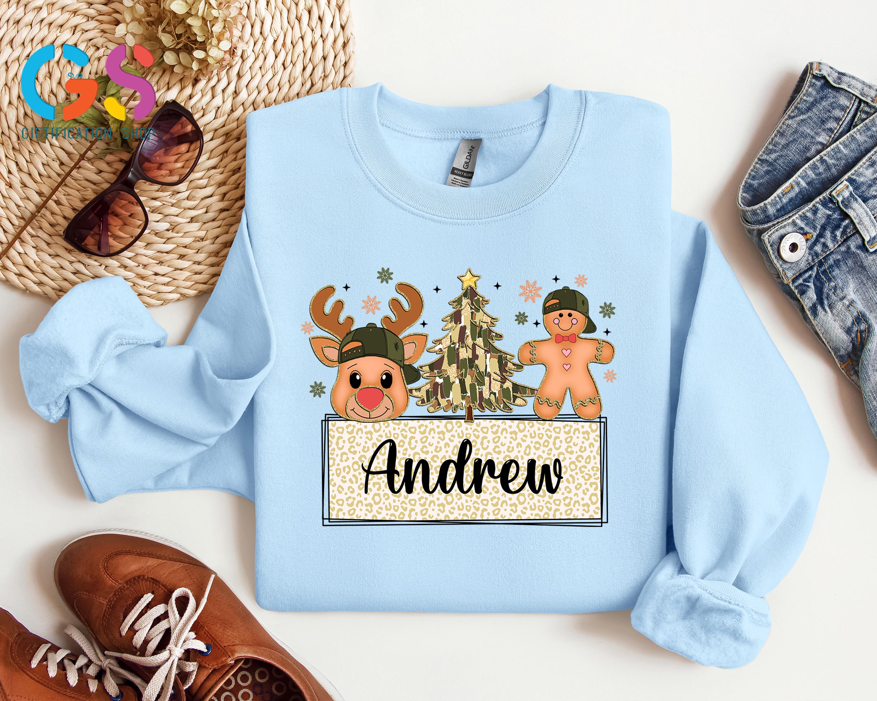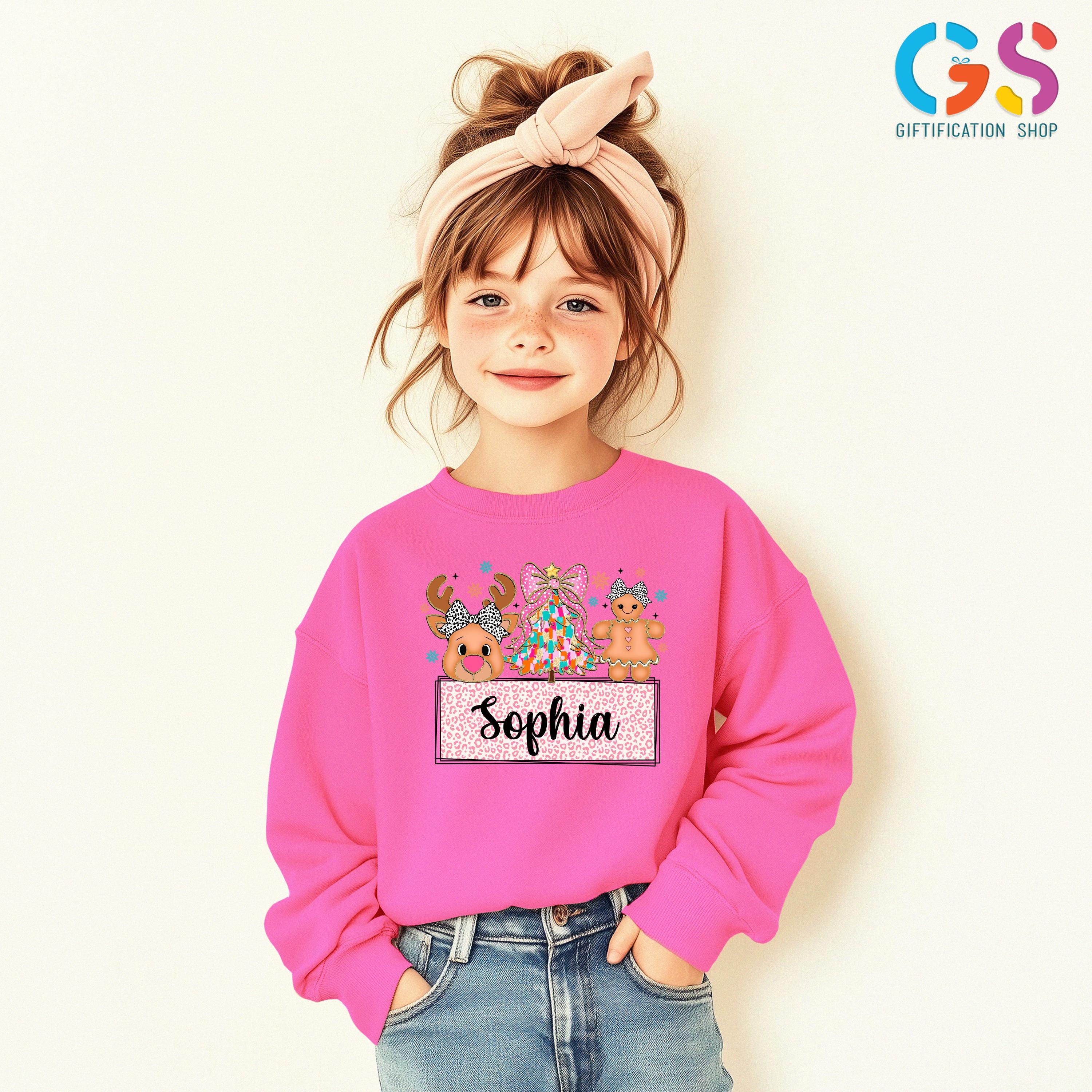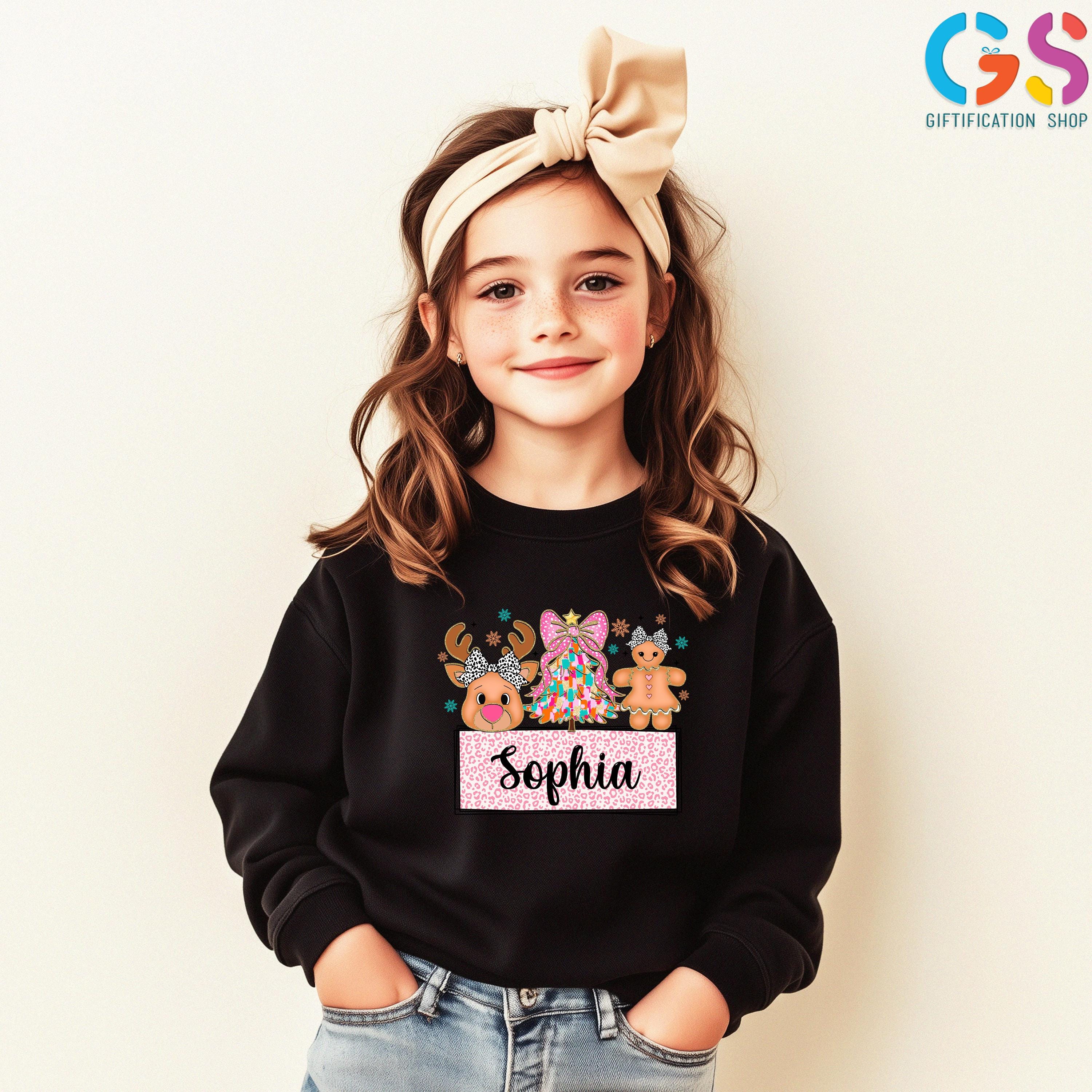 Make your little ones’ holiday season extra special with this adorable personalized Christmas sweatshirt! Featuring festive reindeer and a cute Xmas tree cake design, this cozy sweatshirt can be customized with your child’s name, creating a unique and memorable holiday keepsake.