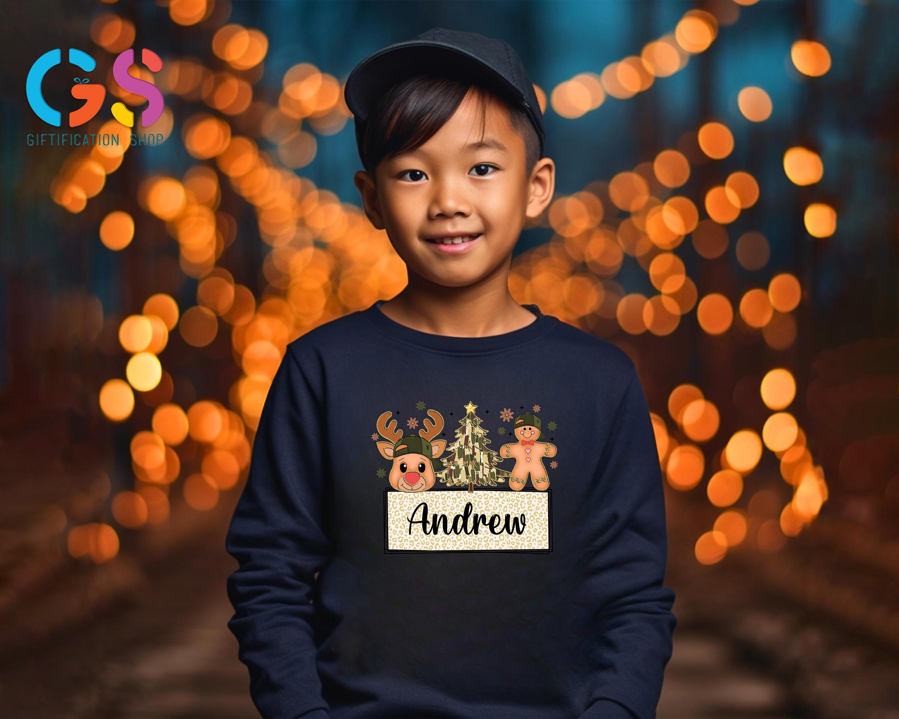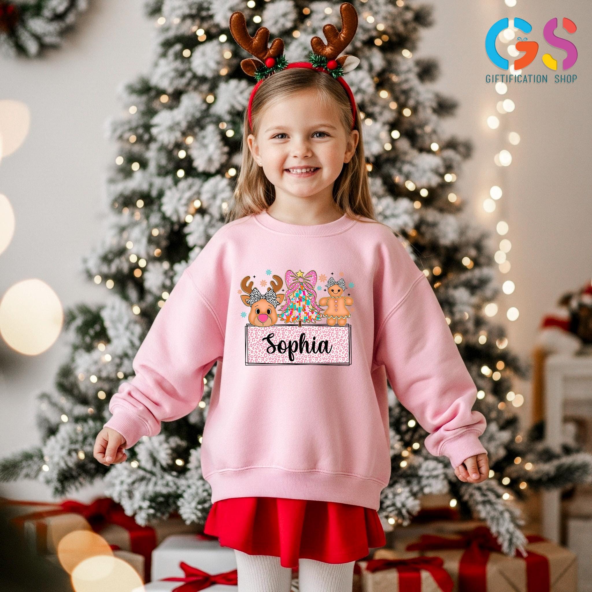 Custom Name Kids Christmas Sweatshirt, Personalized Christmas Sweater for Boys and Girl, Reindeer Kids Sweatshirt, Xmas Tree Cake Sweater