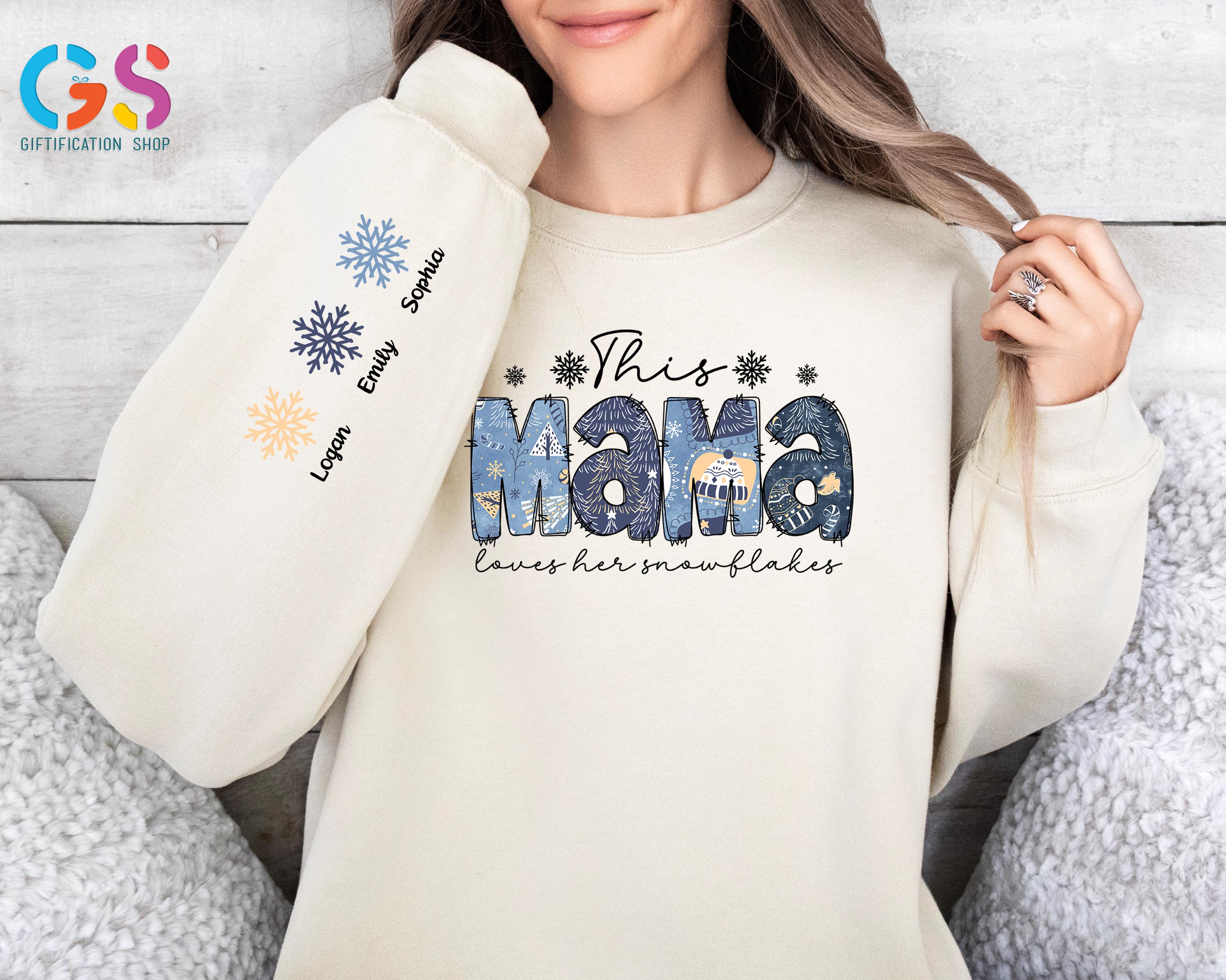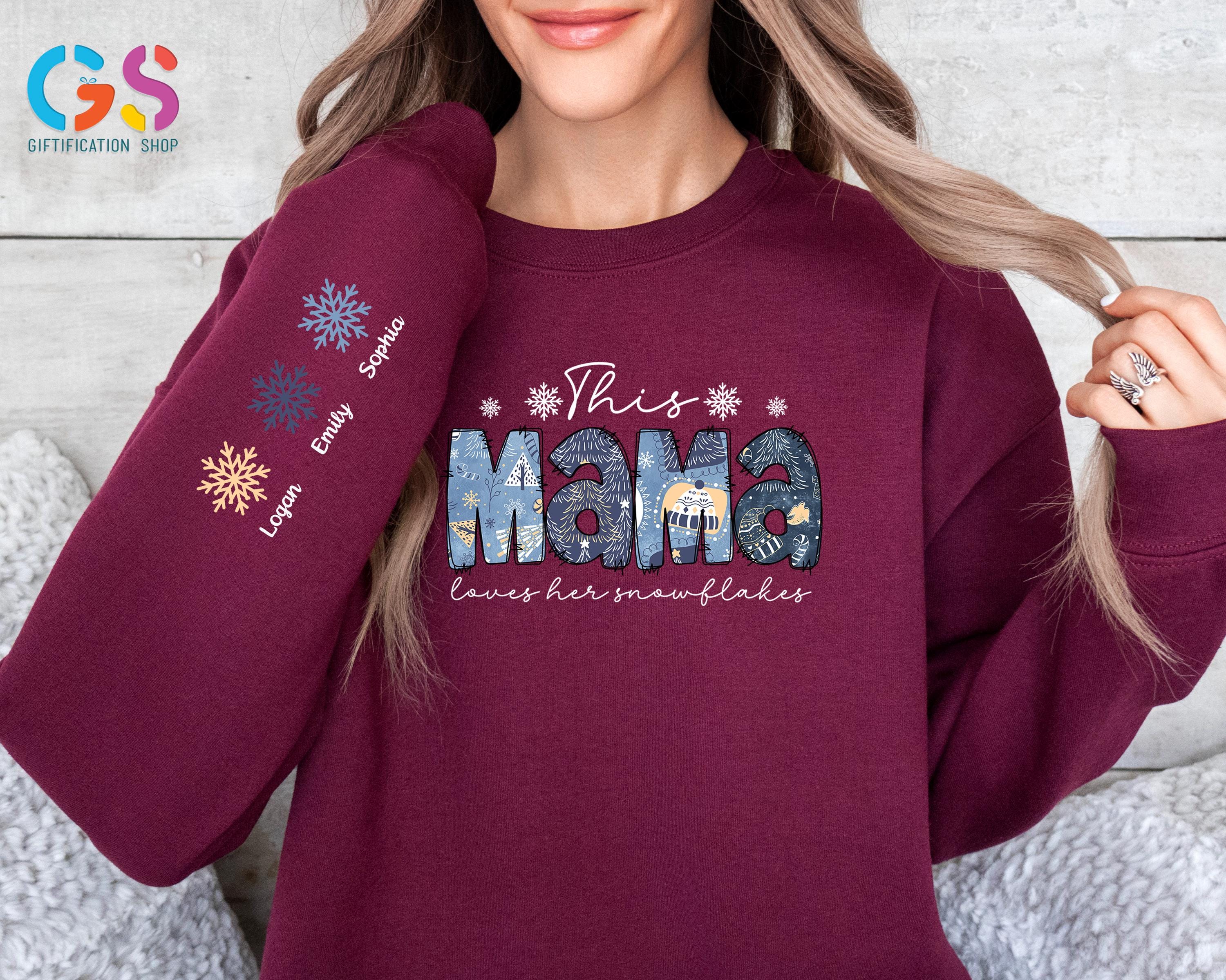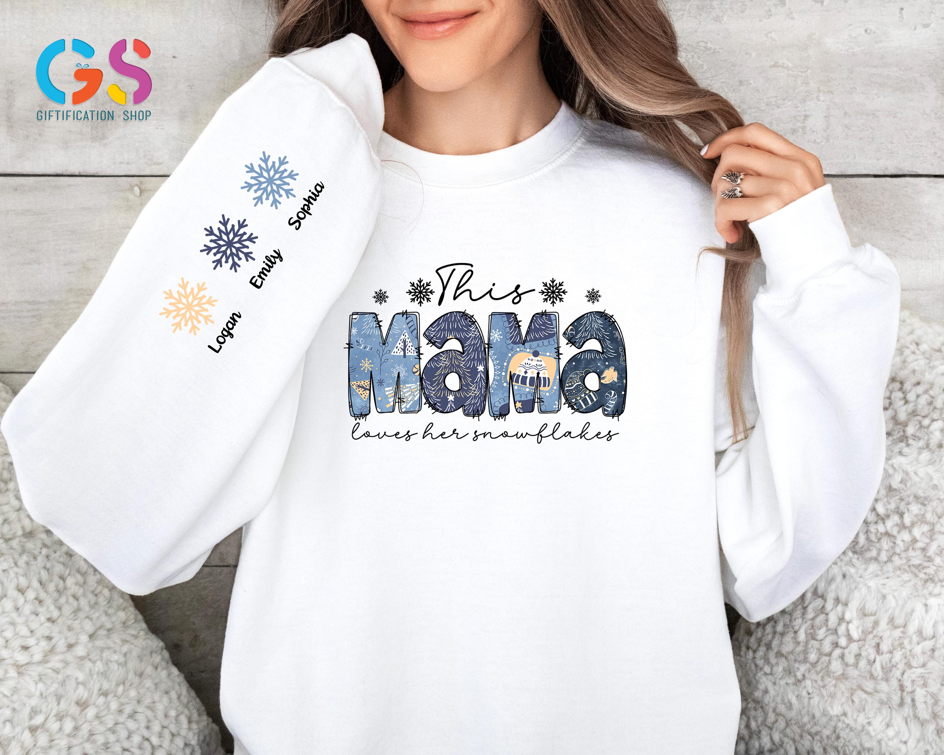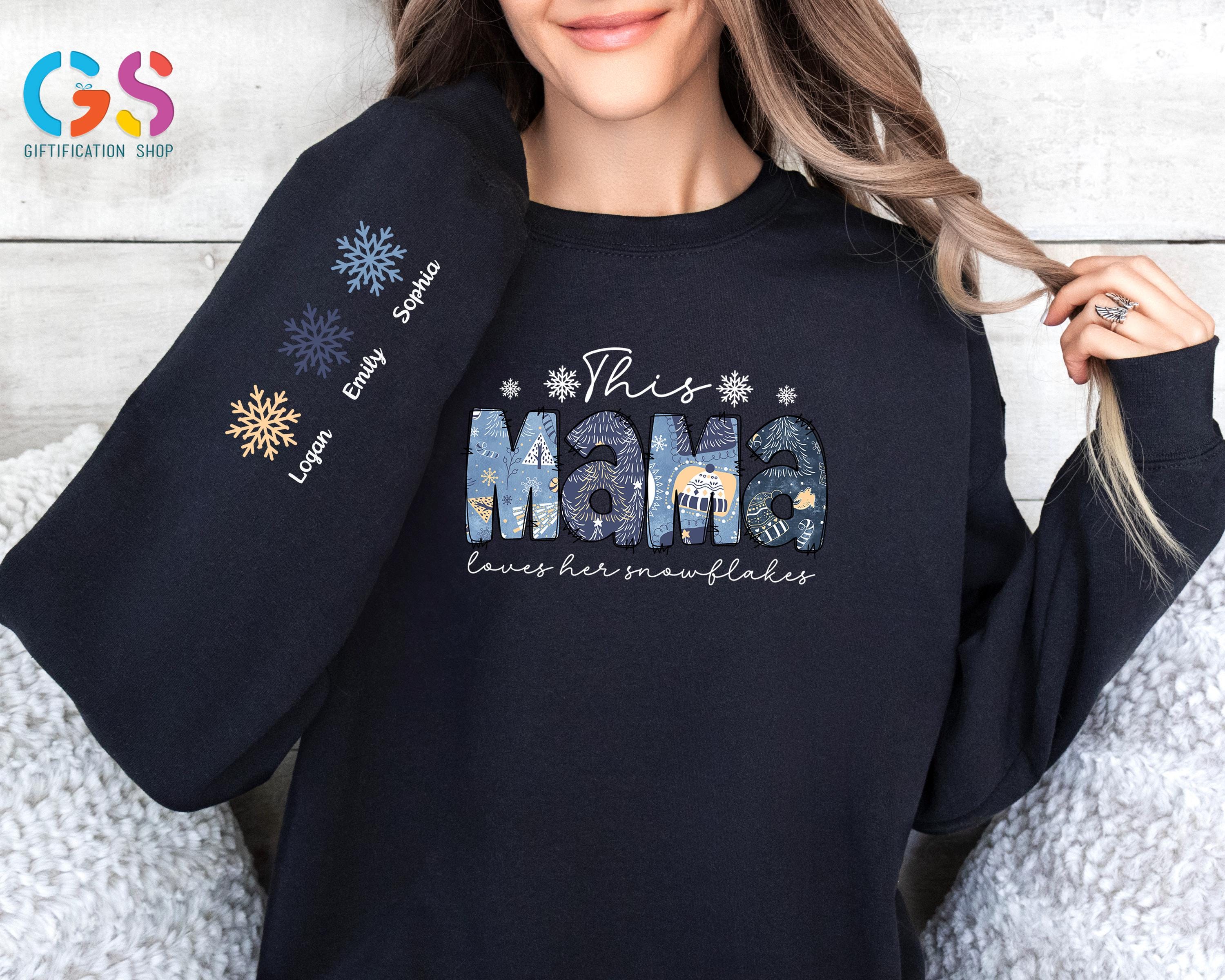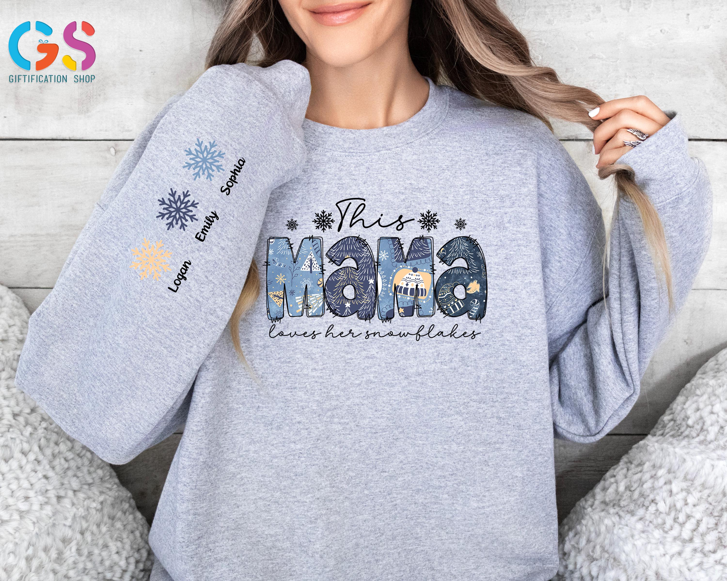 Custom Merry Mama Sweatshirt with Kids Names, This Mama Loves Her Snowflakes Sweater, Christmas Mama Hoodie, Winter Sweater for Mama