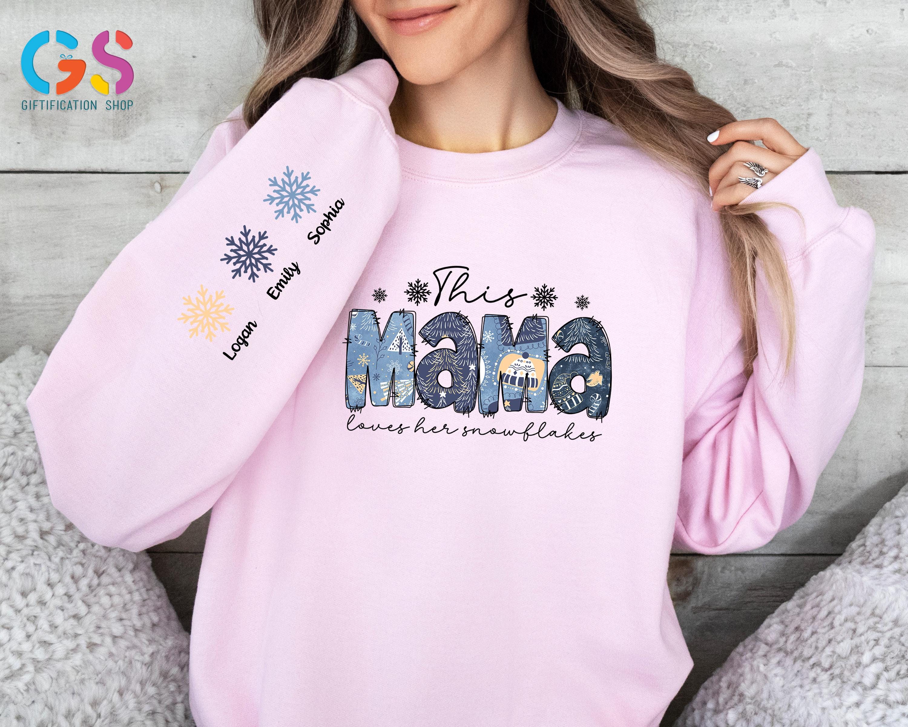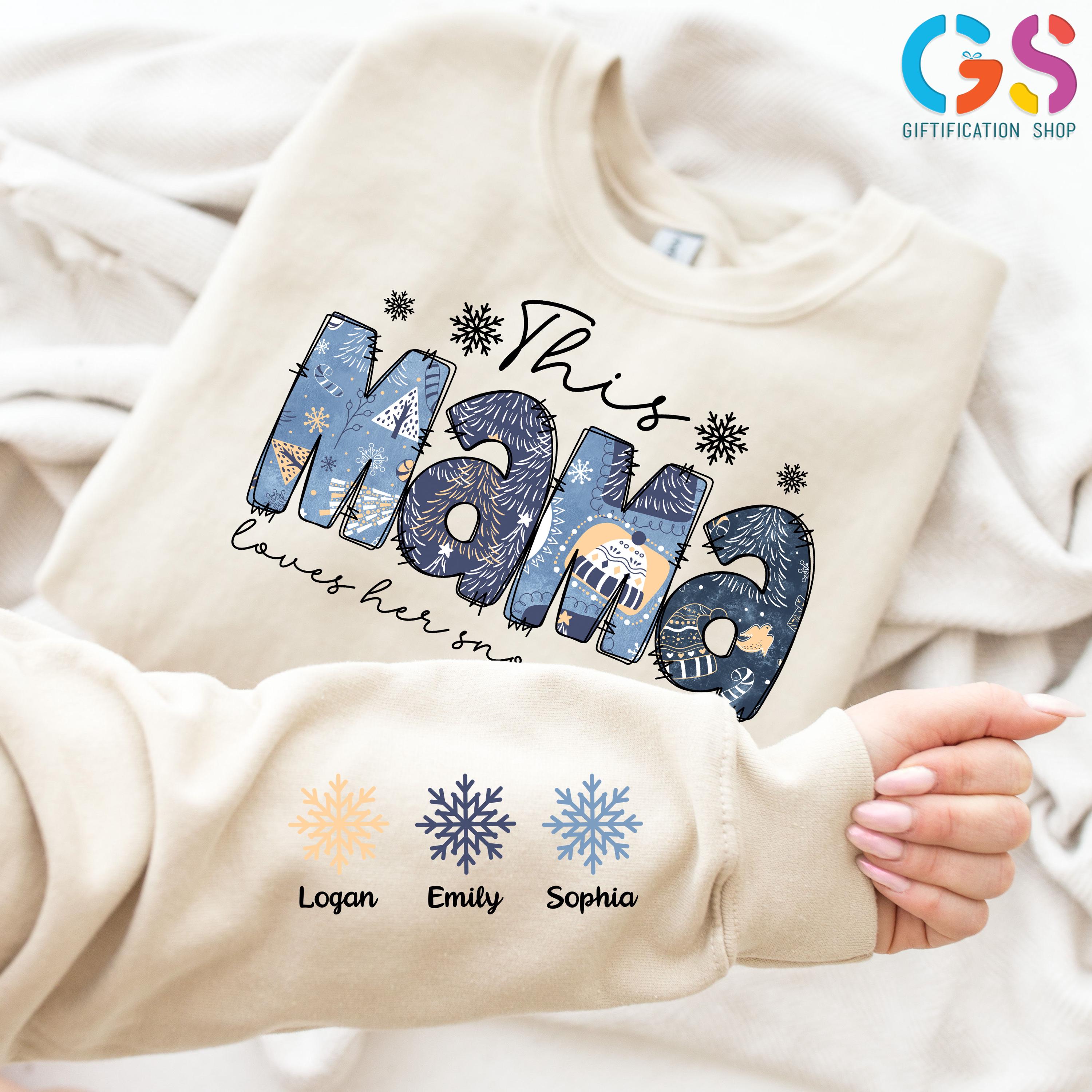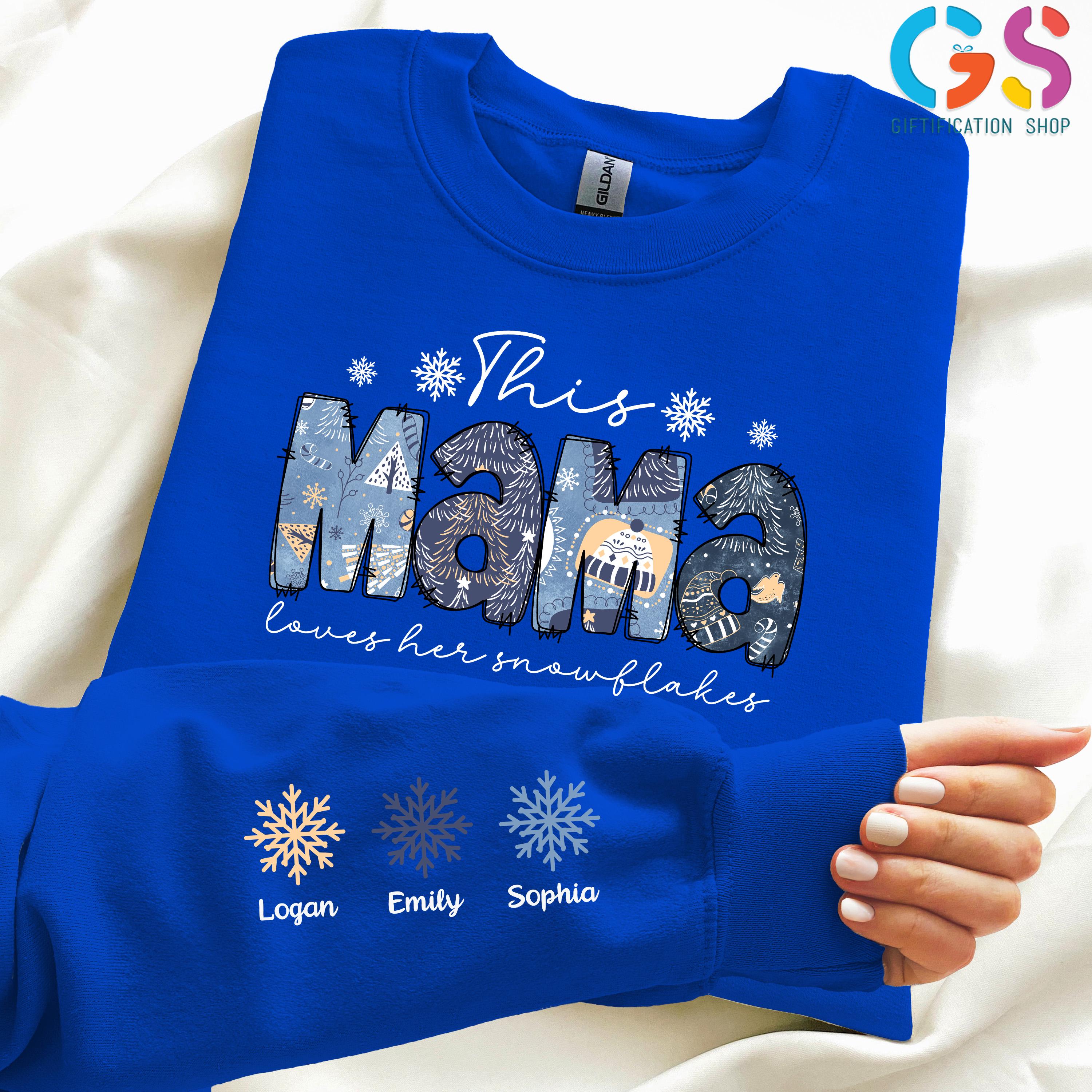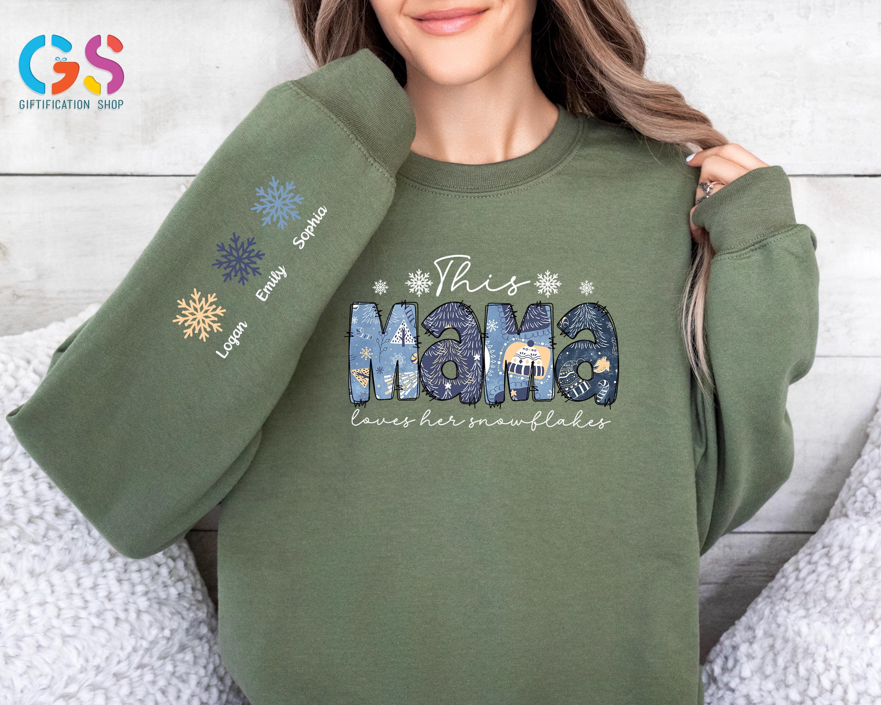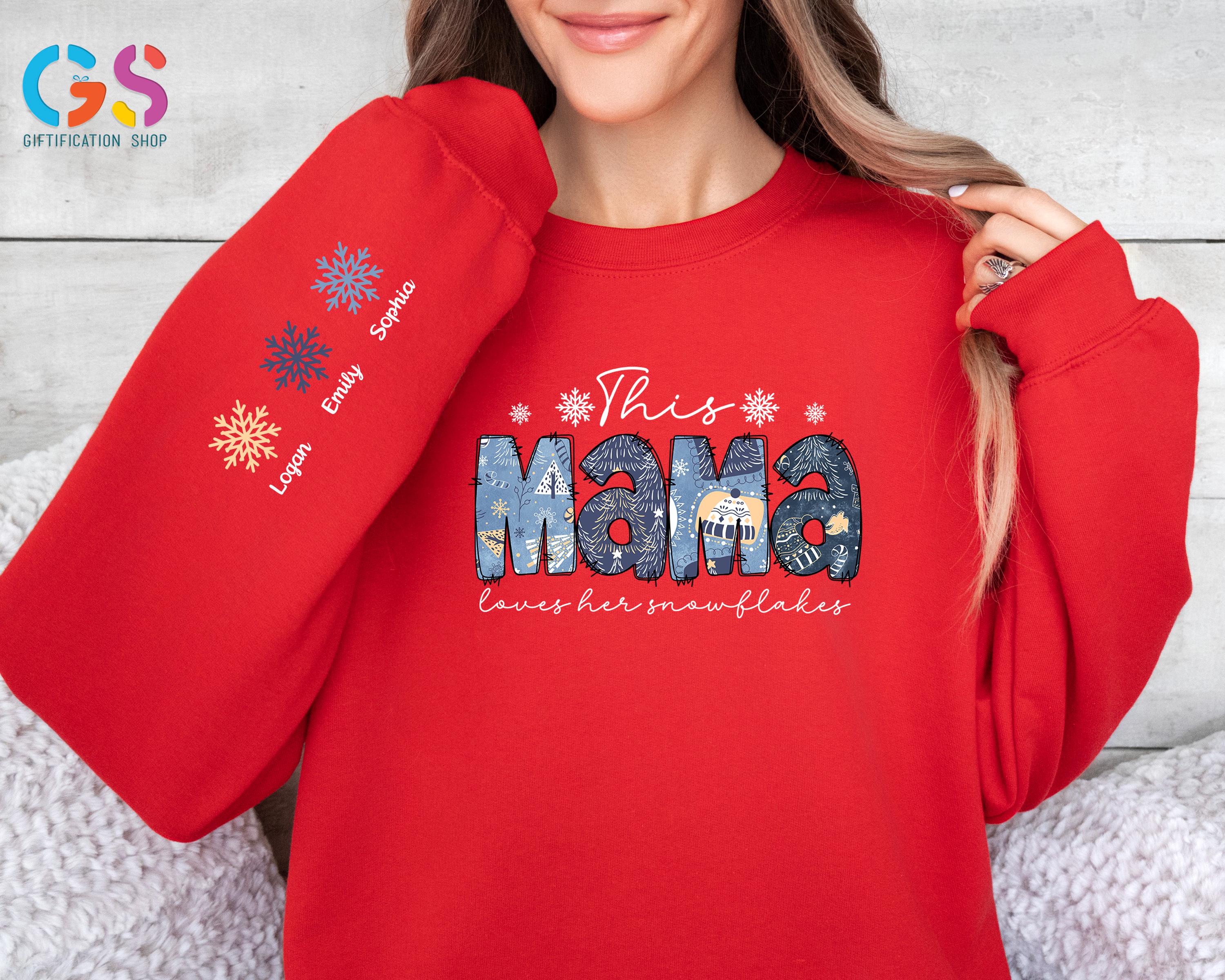 Custom Merry Mama Sweatshirt with Kids Names, This Mama Loves Her Snowflakes Sweater, Christmas Mama Hoodie, Winter Sweater for Mama