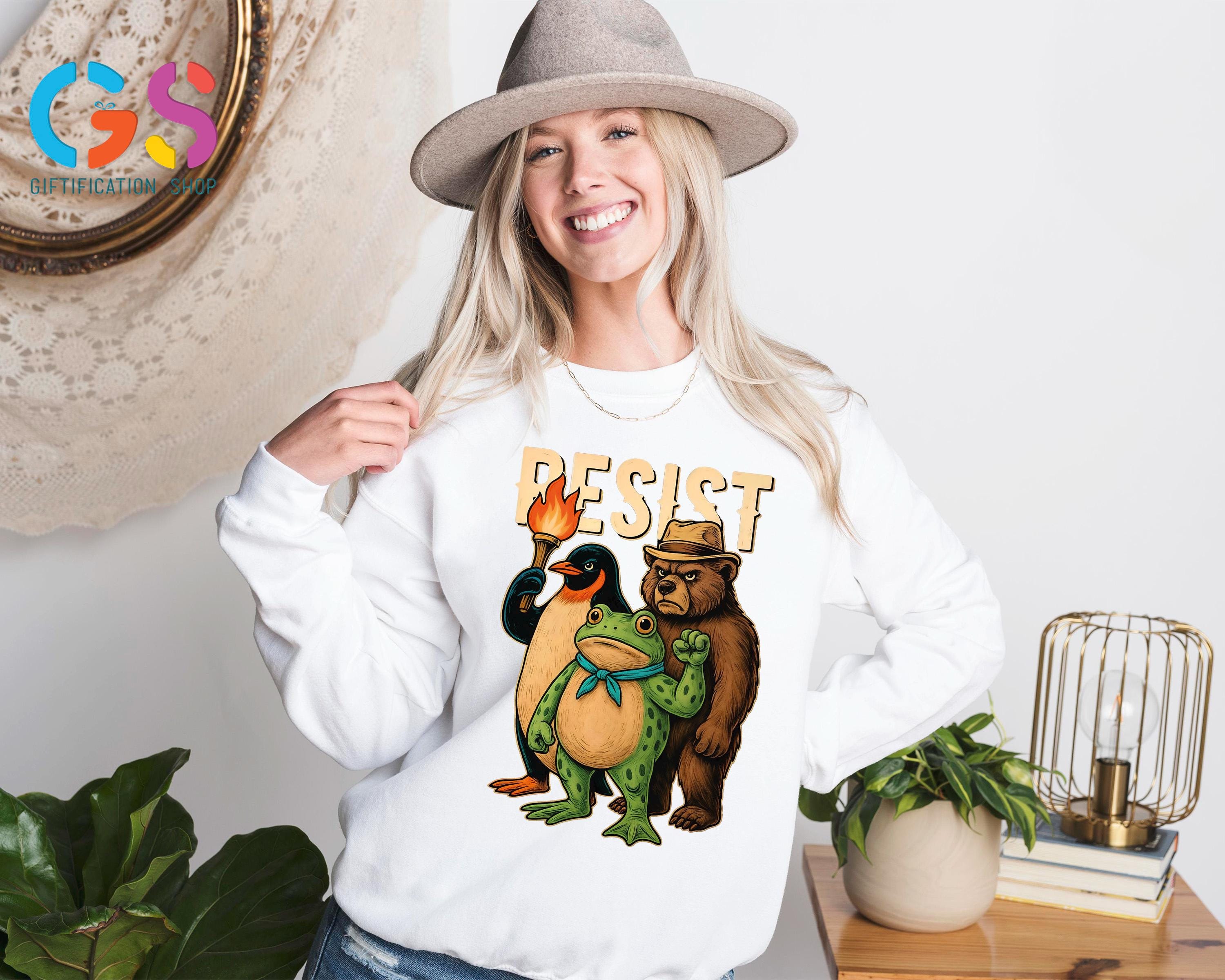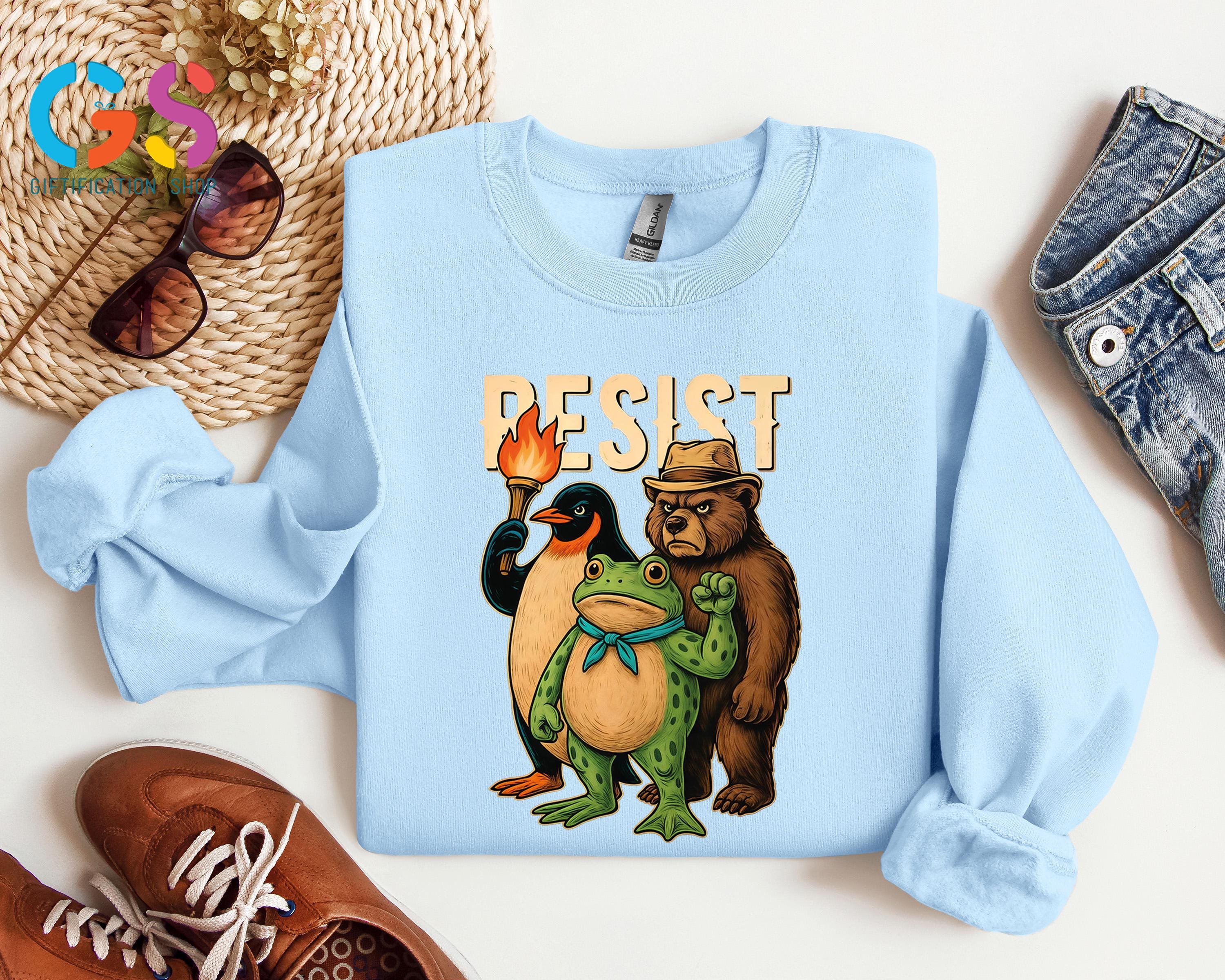 Stand up for freedom and equality with this Resist Frog Bear Penguin Sweatshirt, the perfect anti Trump shirt and political statement hoodie for those who believe in justice and progress. This anti fascism shirt blends bold activism with comfort, making it ideal for rallies, protests, or everyday wear. Featuring the iconic statue of frog design, it symbolizes strength, resistance, and unity. Whether you’re expressing feminist pride, saying no kings, or standing up to oppression, this freedom hoodie and resist shirt makes your voice heard. A must-have liberal shirt for anyone ready to fight fascism and keep their hands off democracy.