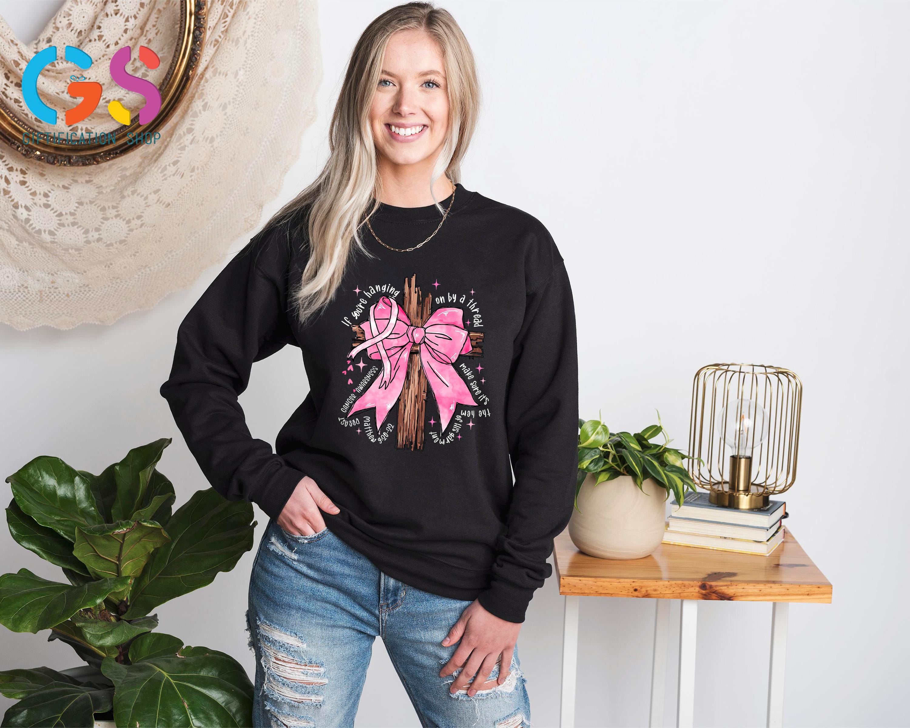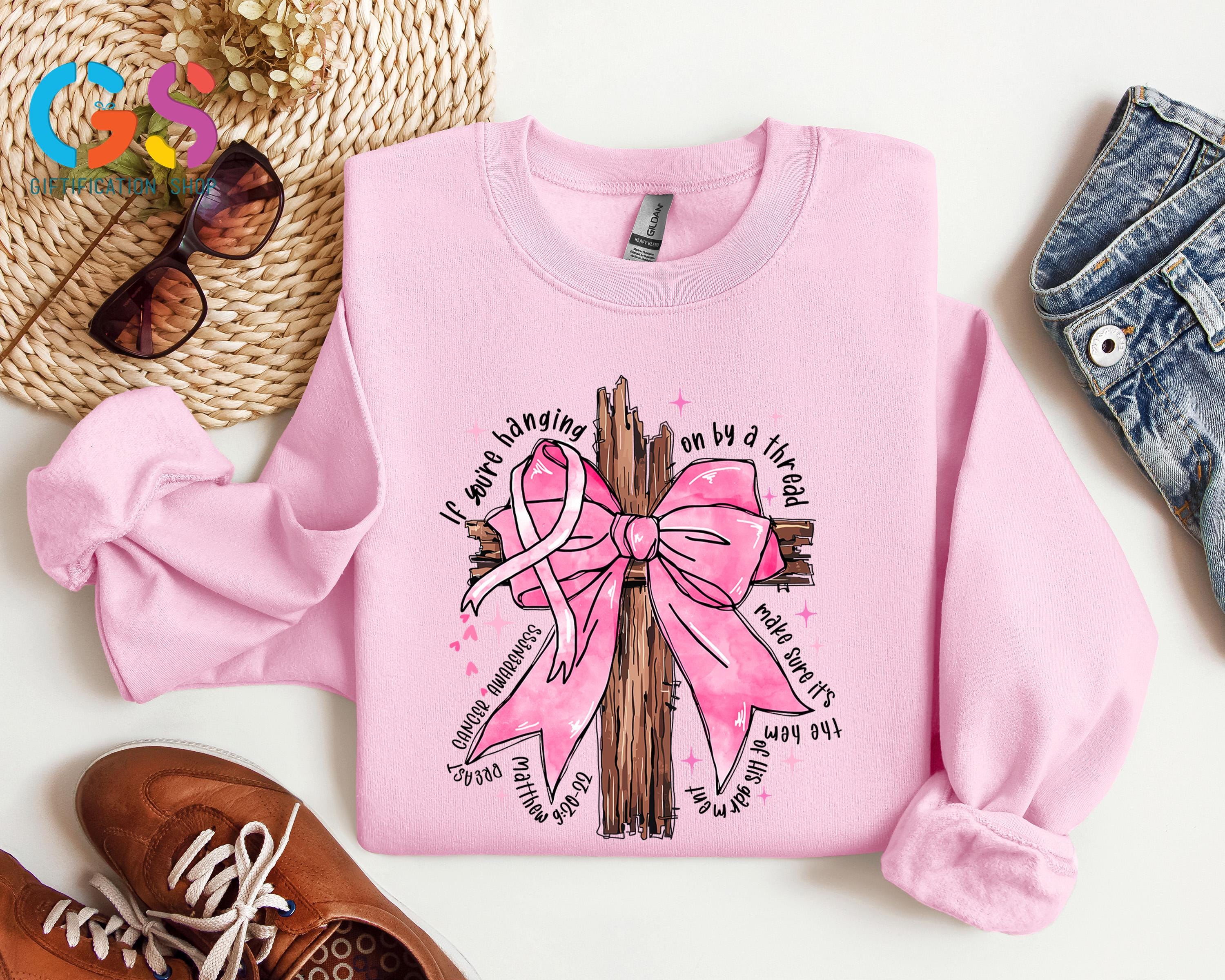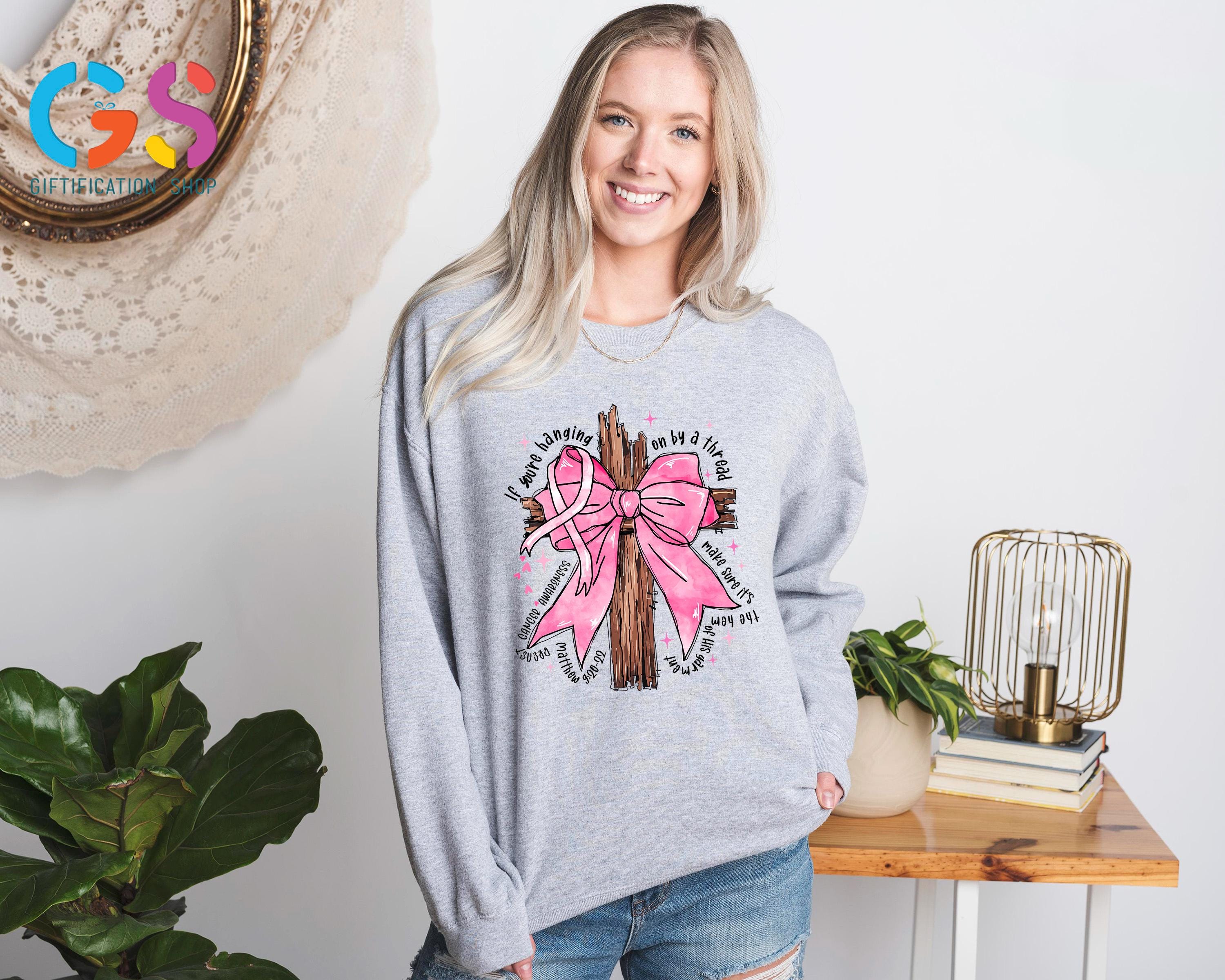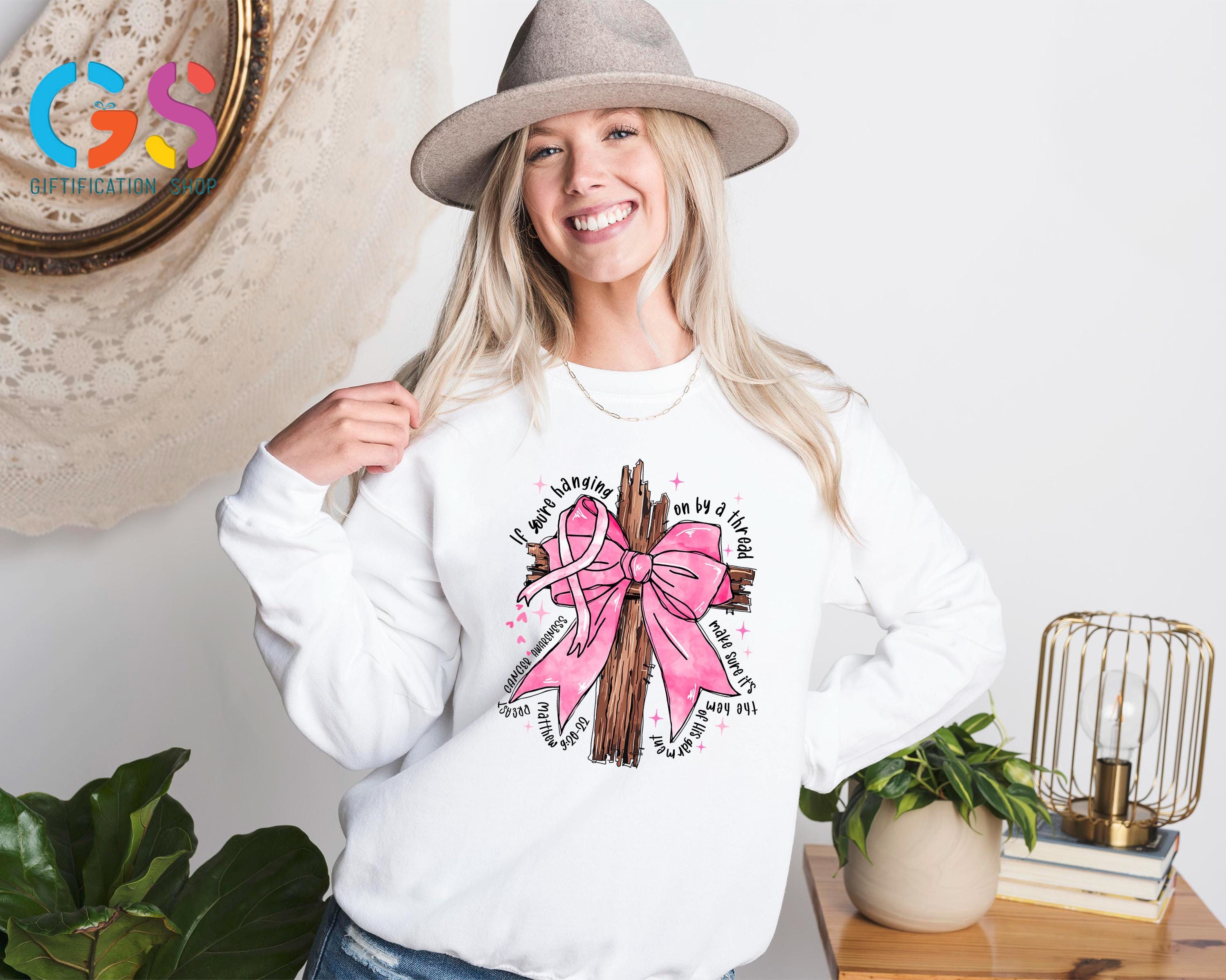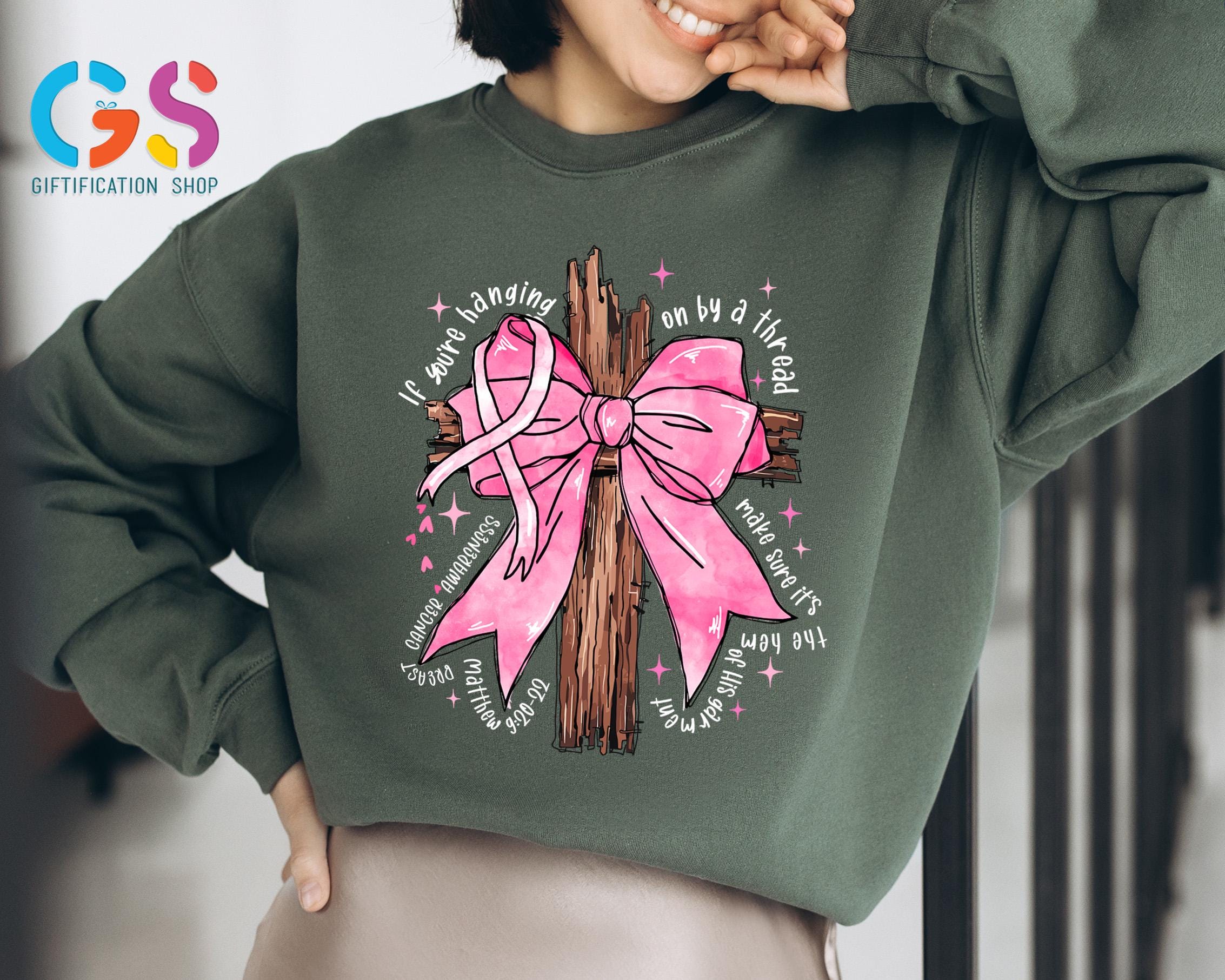 Pink Bow Cross Breast Cancer Awareness Sweatshirt, Jesus Support Hoodie, Pink Ribbon Christian Bible Verse Sweater