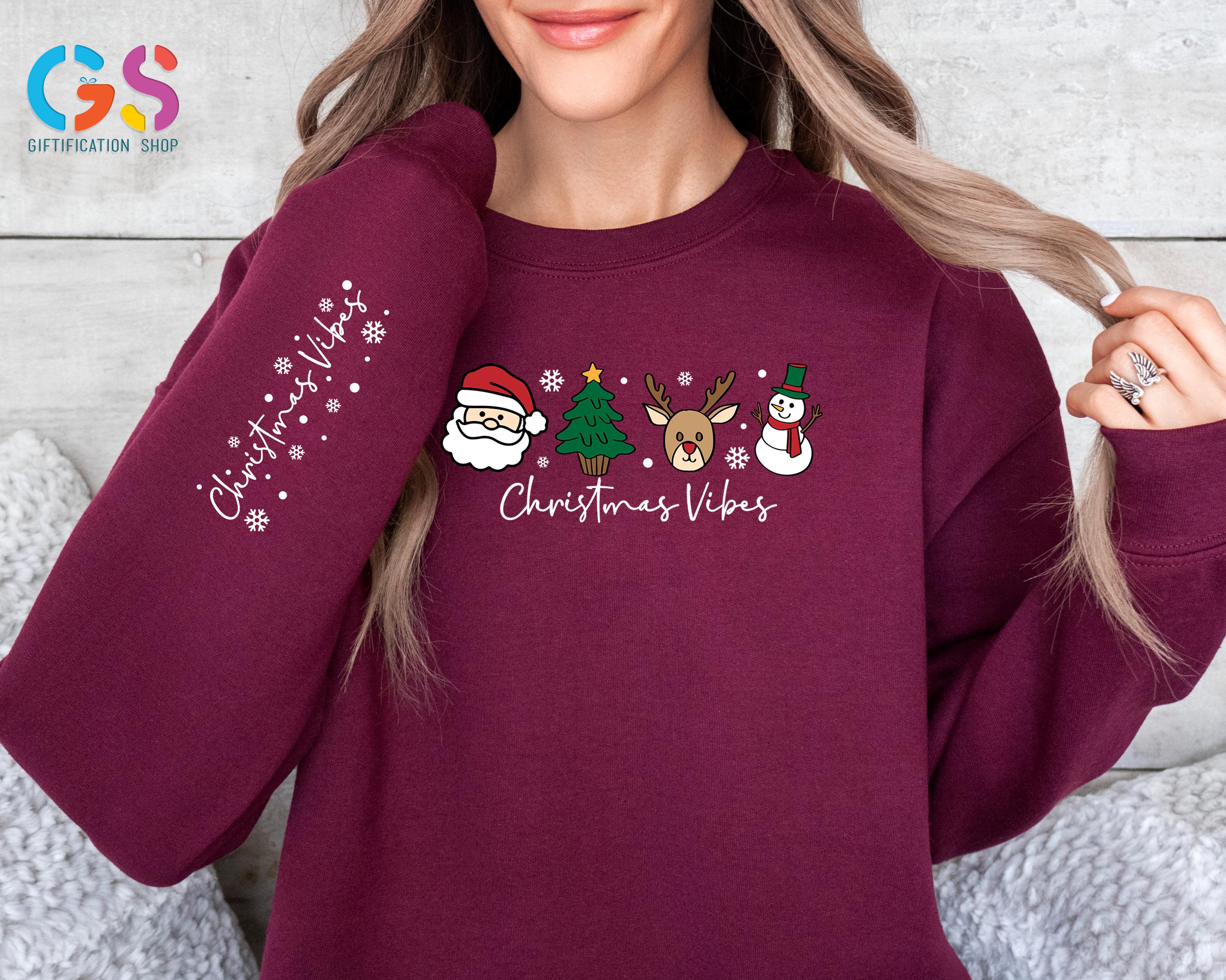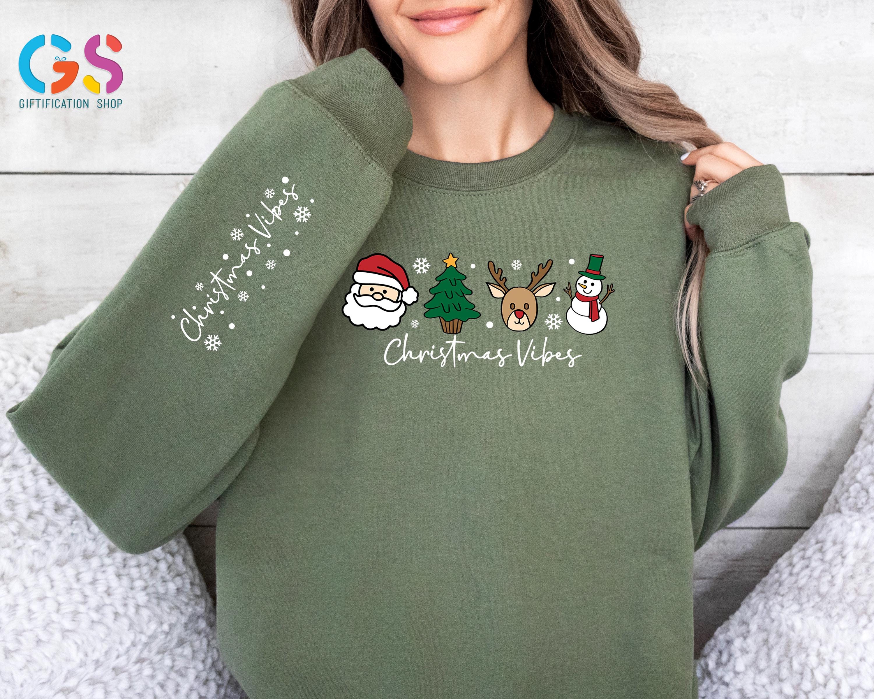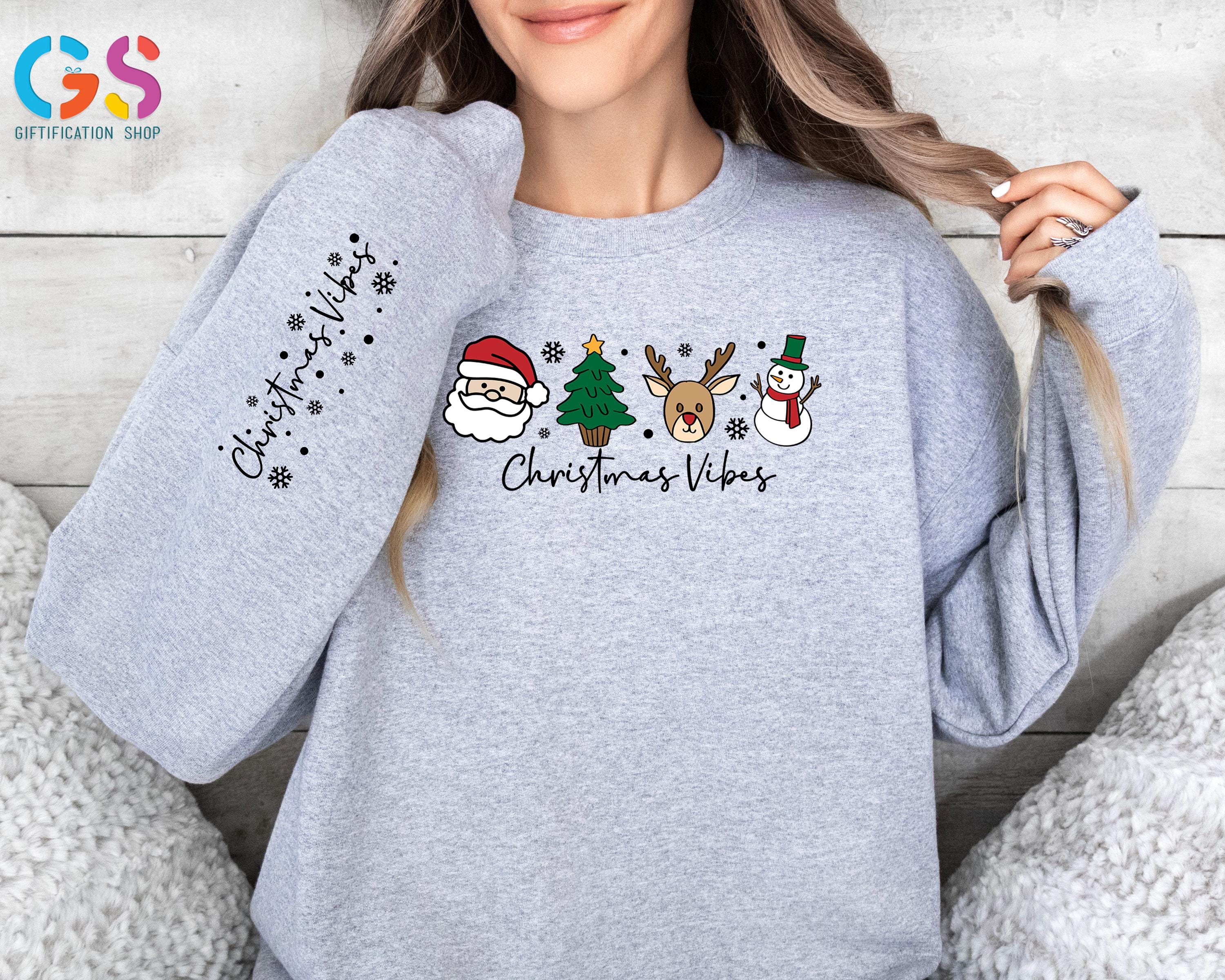 Christmas Vibes Sweatshirt, Santa Claus Christmas Tree Reindeer Snowman Sweater, Merry Christmas Holiday Gift
