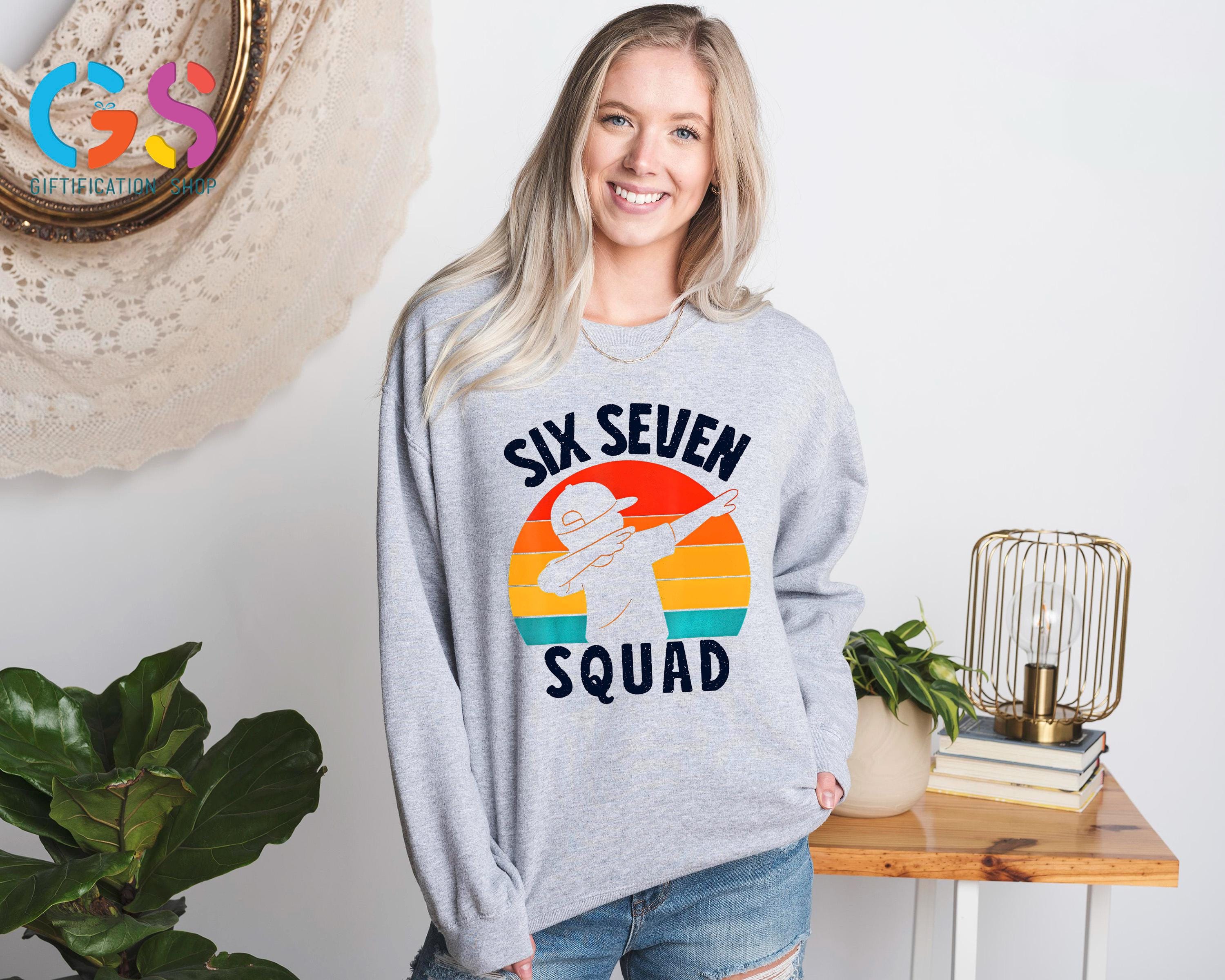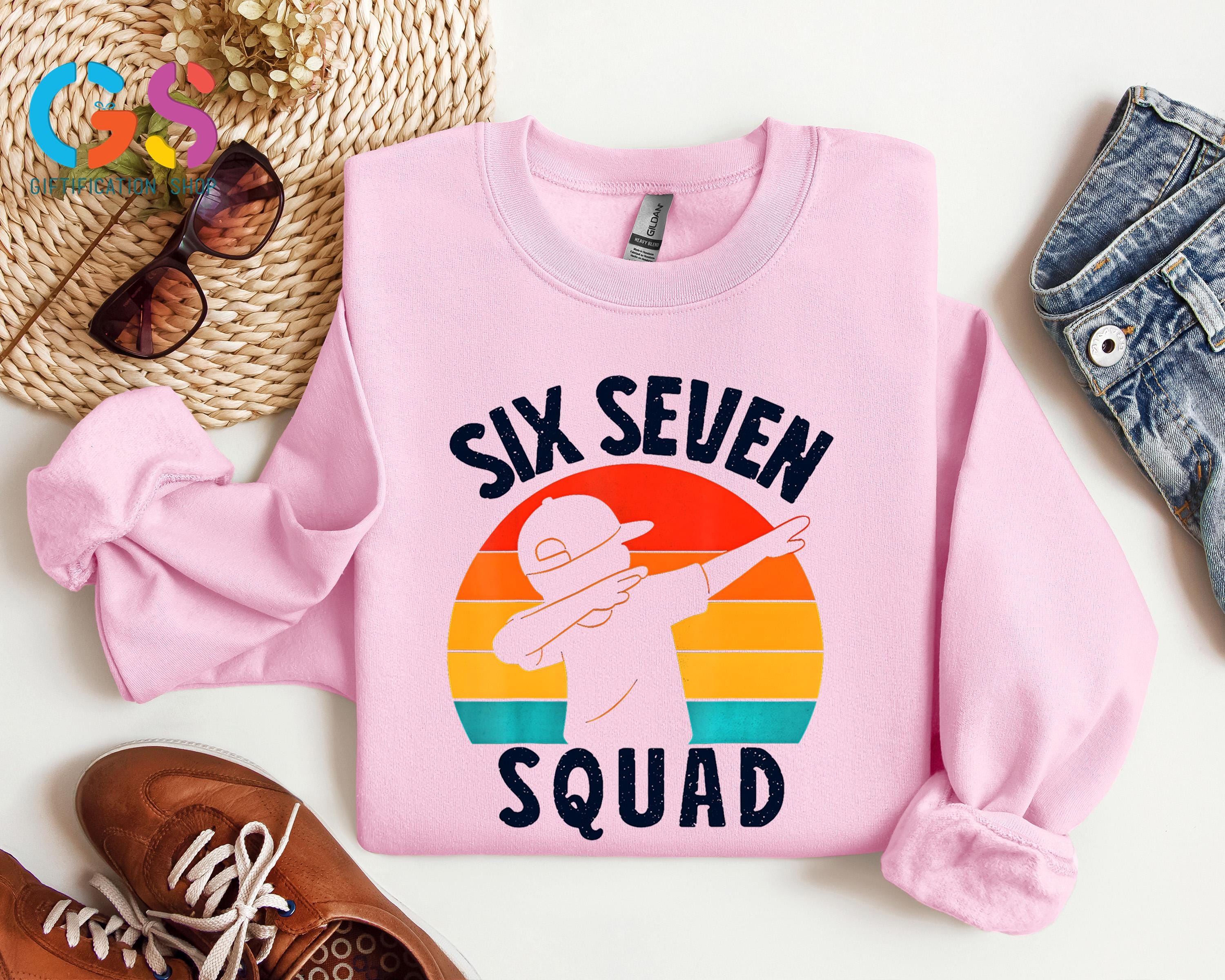 Get ready to dance with the Dancing Six Seven Squad Sweatshirt, the perfect gift for him or her! This viral meme hoodie is packed with personality, featuring a sarcastic 6 7 shirt design that's perfect for Gen Z and Gen Alpha trendsetters. Whether you're a dance mom, a hip hop fan, or just someone who loves funny saying shirts, this teenager sarcastic clothes piece is a must-have. It’s a trendy shirt that’ll make you stand out at school or any casual outing. With its playful design, this six seven meme shirt is a great gift for teen girls and funny teenager shirt lovers alike. Get this 6 7 shirt today and add some humor and flair to your wardrobe!