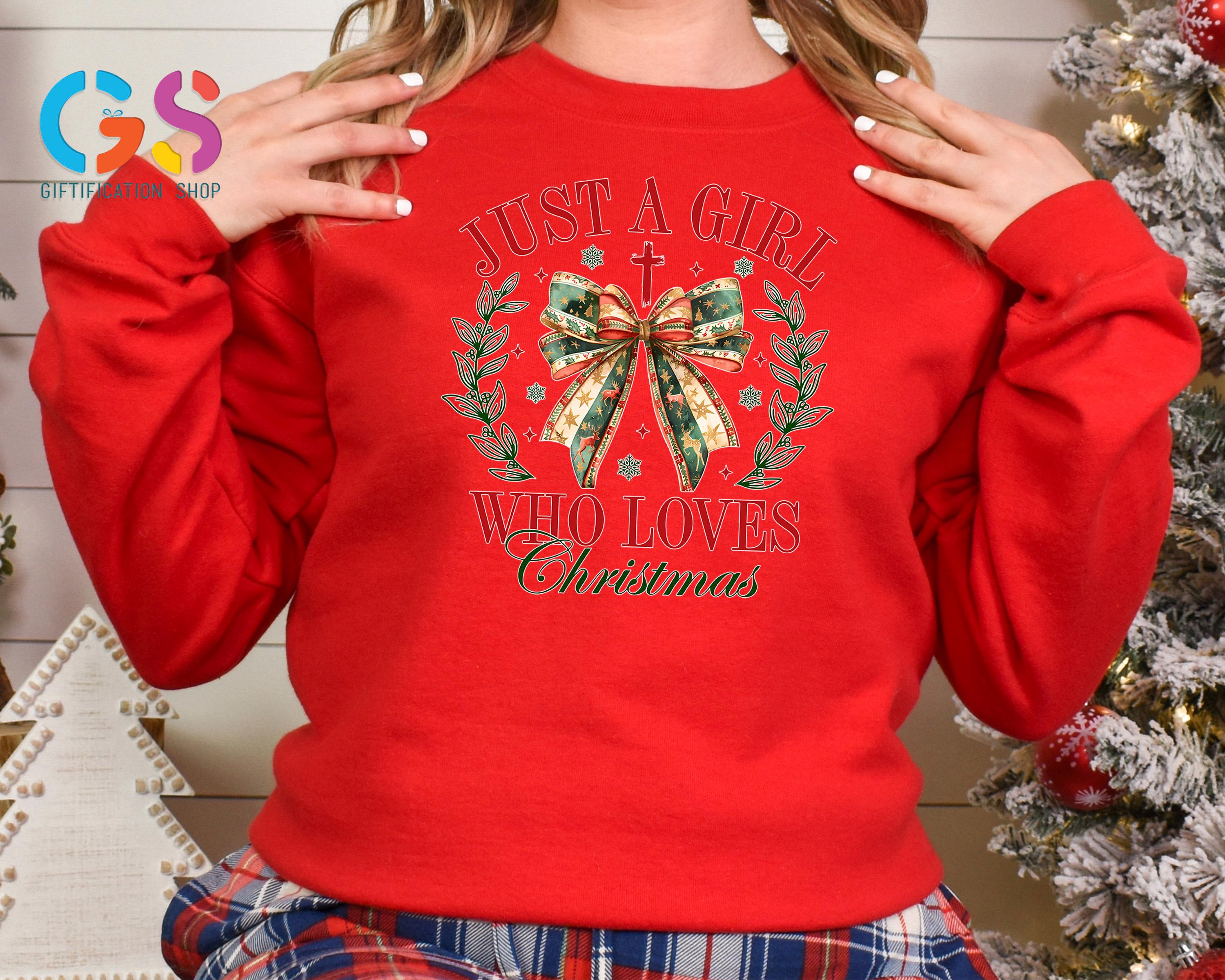 Just A Girl Who Loves Christmas Bow Sweatshirt, Winter Holiday Sweater, Merry Xmas Family Hoodie, New Year Clothes