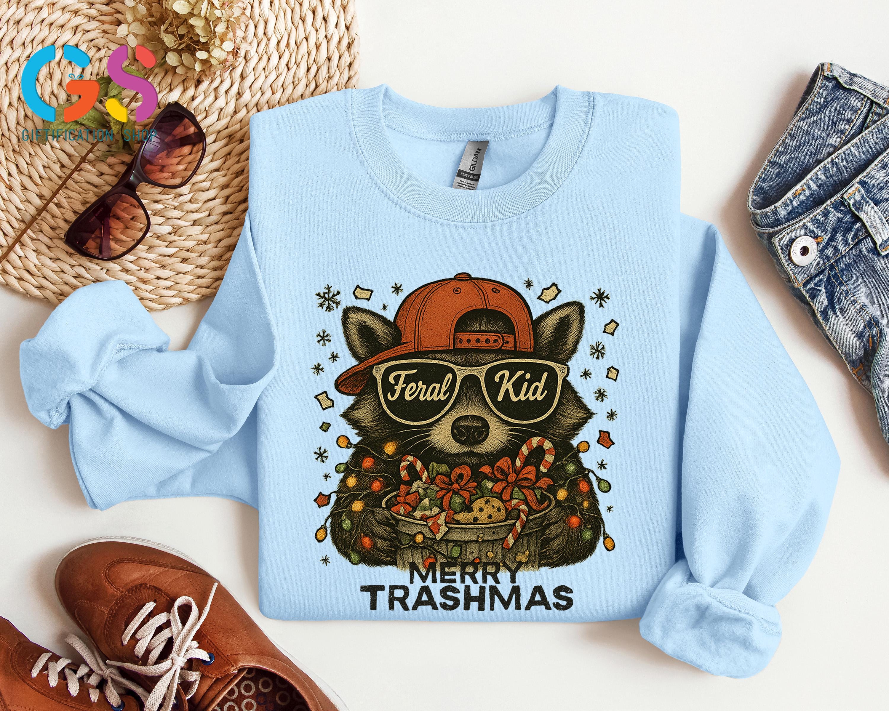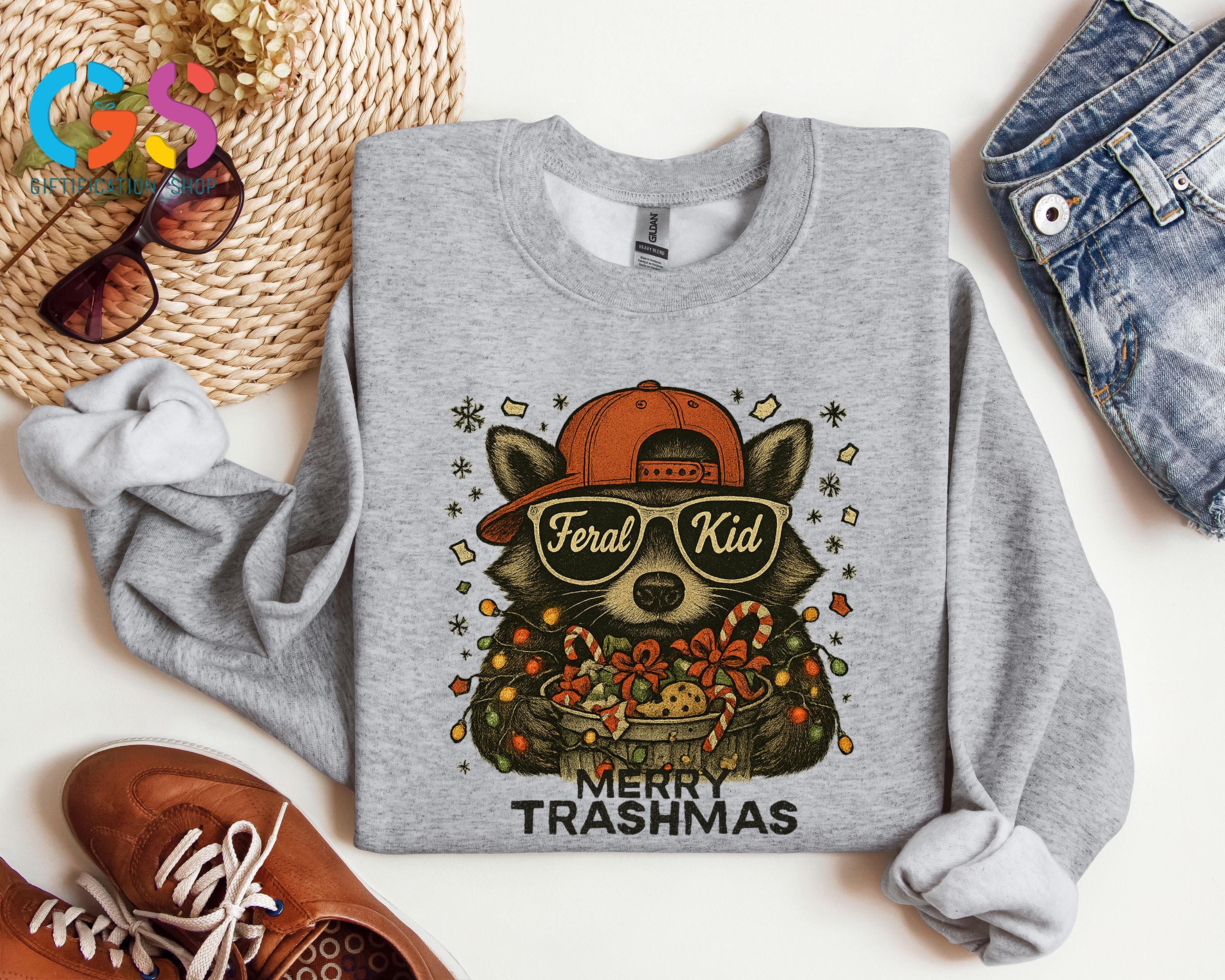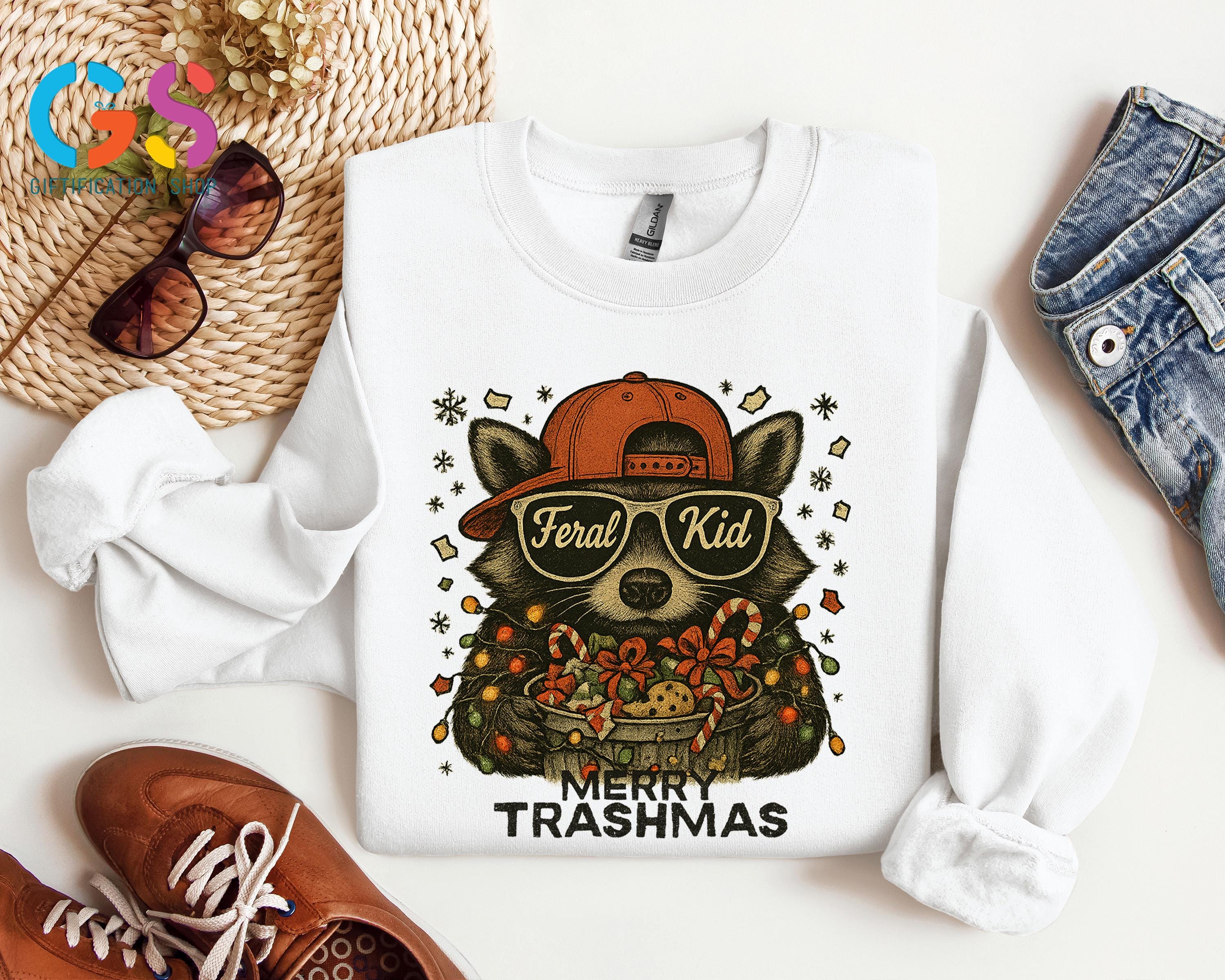 Merry Trashmas Sweatshirt, Christmas Raccoon Sweater, Feral Kid Hoodie, Funny Toddler Holiday Gift, Wild Child Clothes