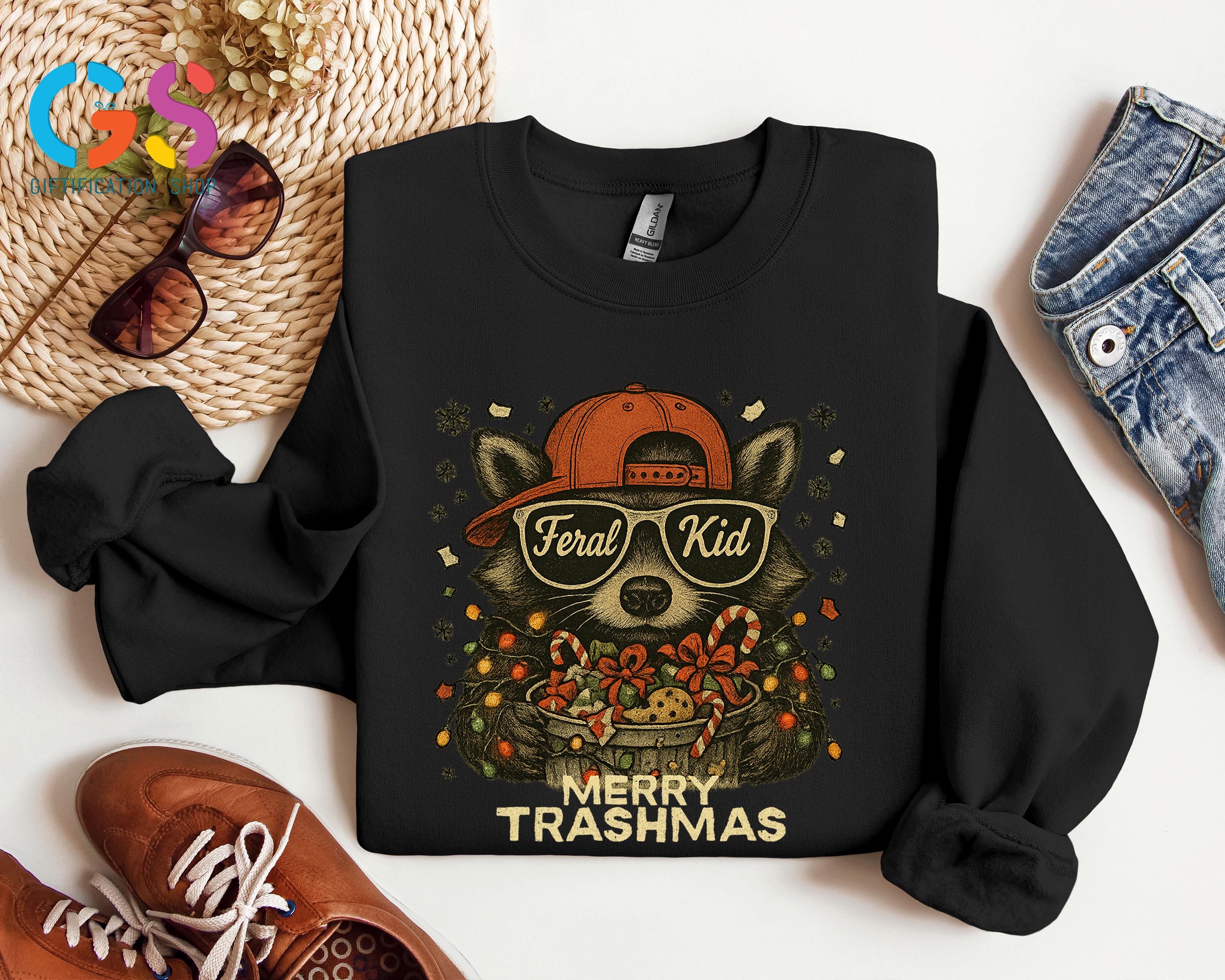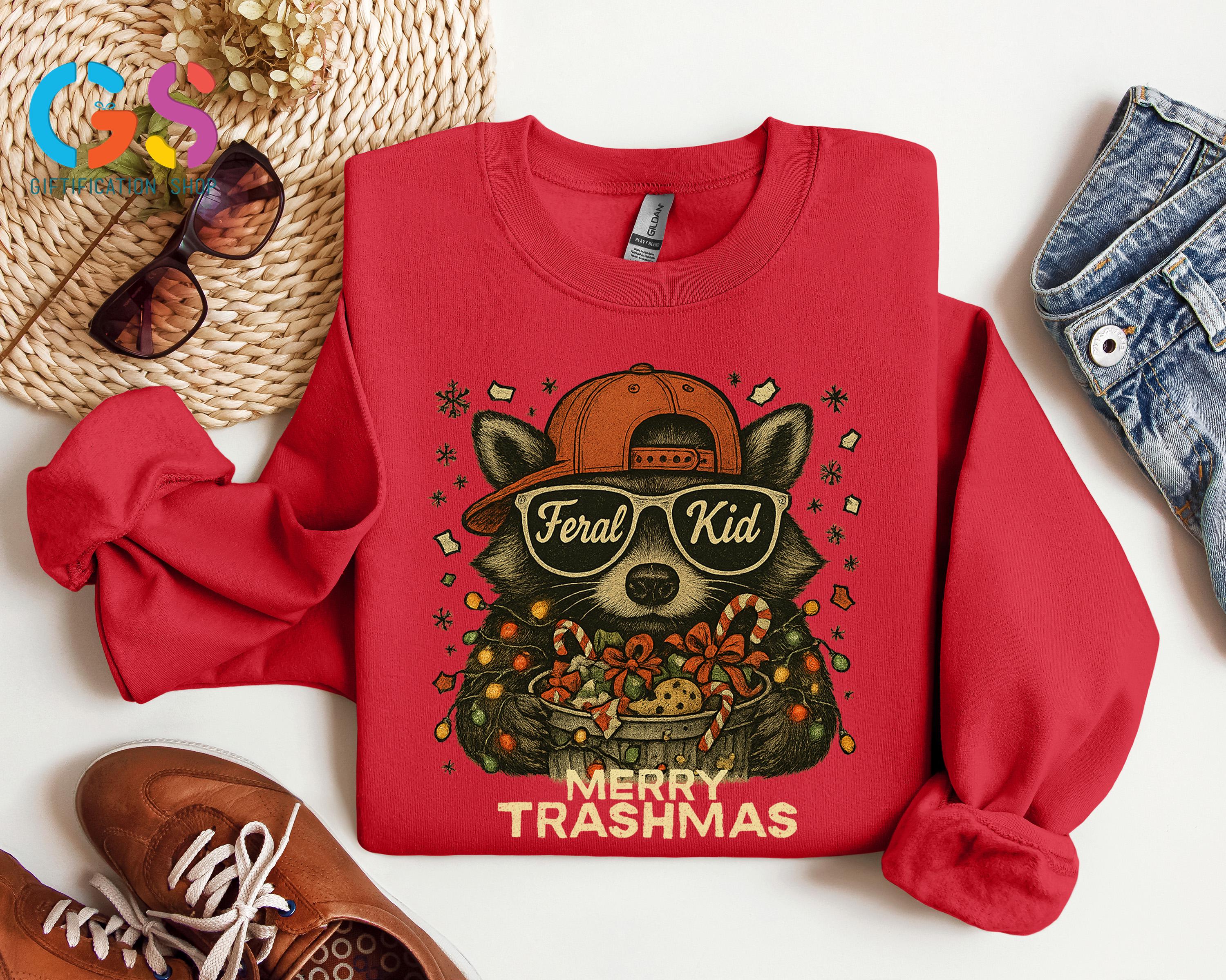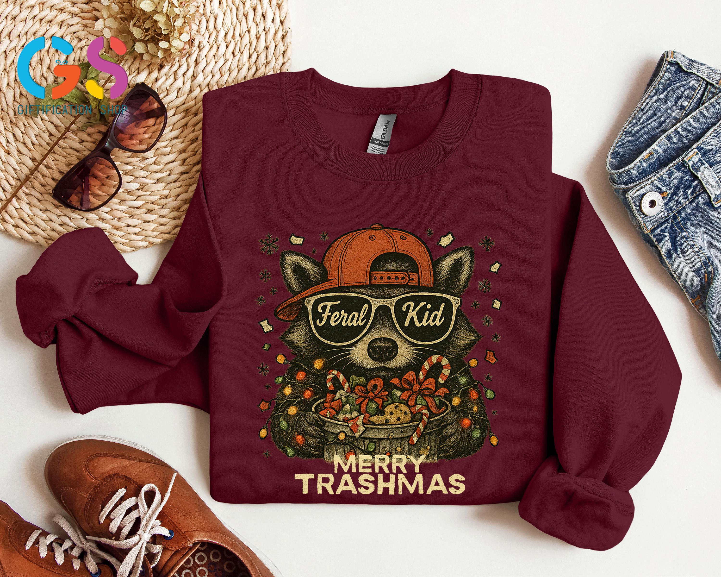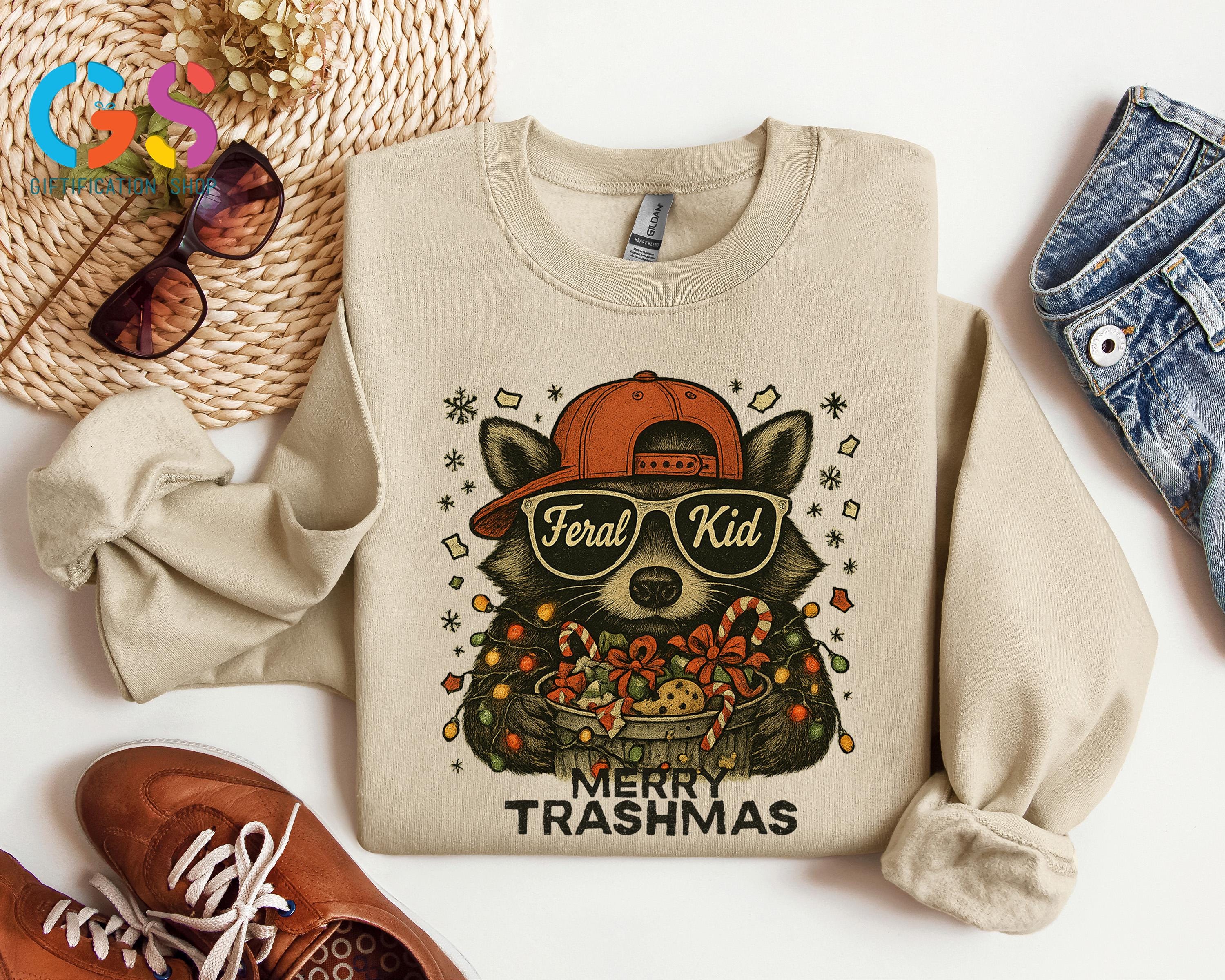 Merry Trashmas Sweatshirt, Christmas Raccoon Sweater, Feral Kid Hoodie, Funny Toddler Holiday Gift, Wild Child Clothes