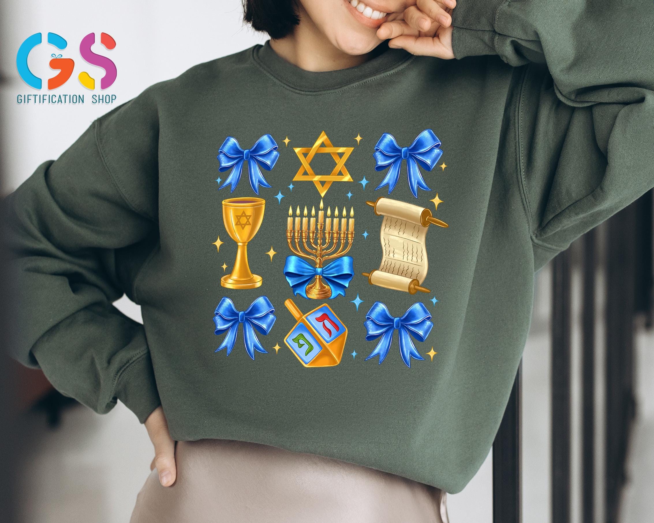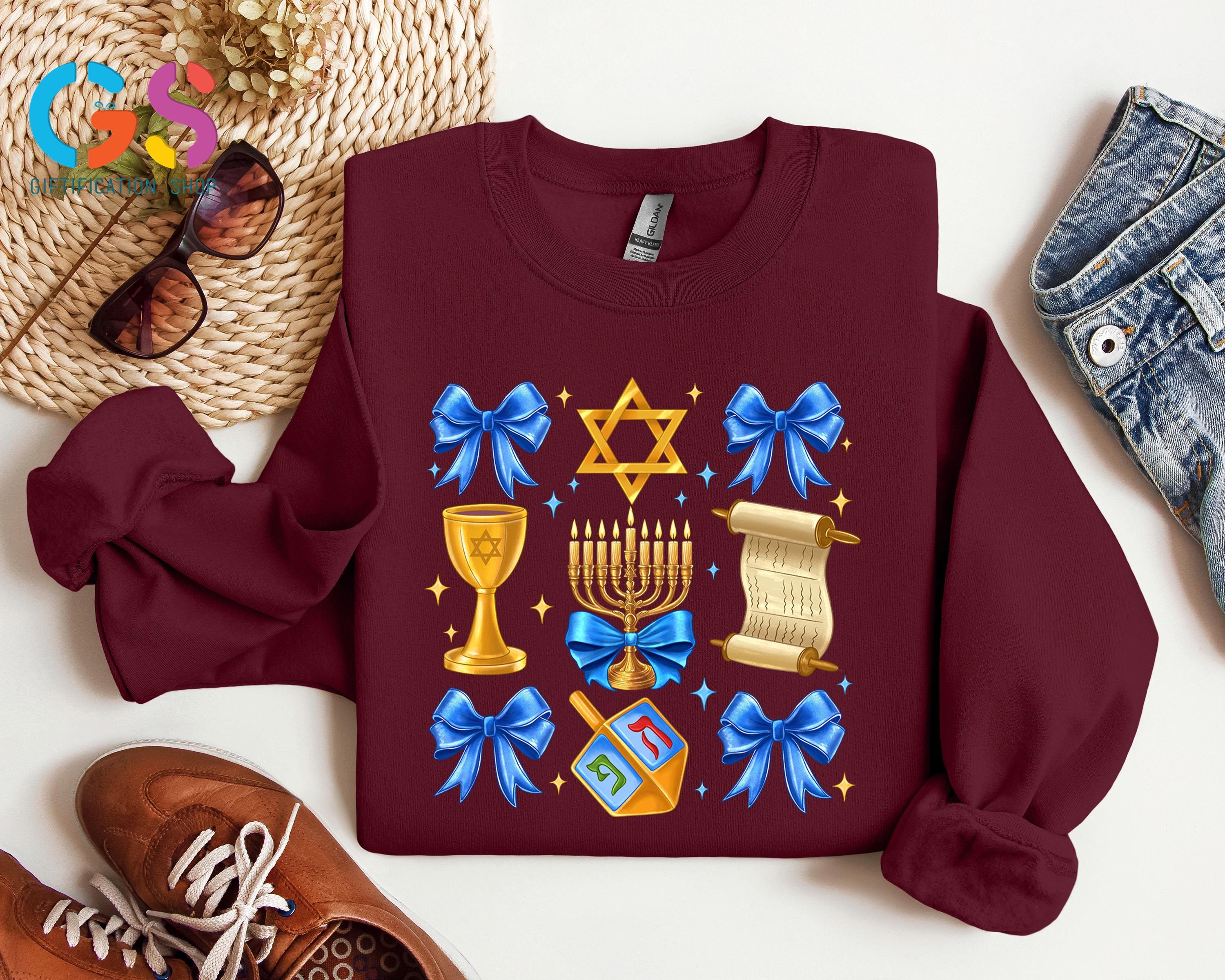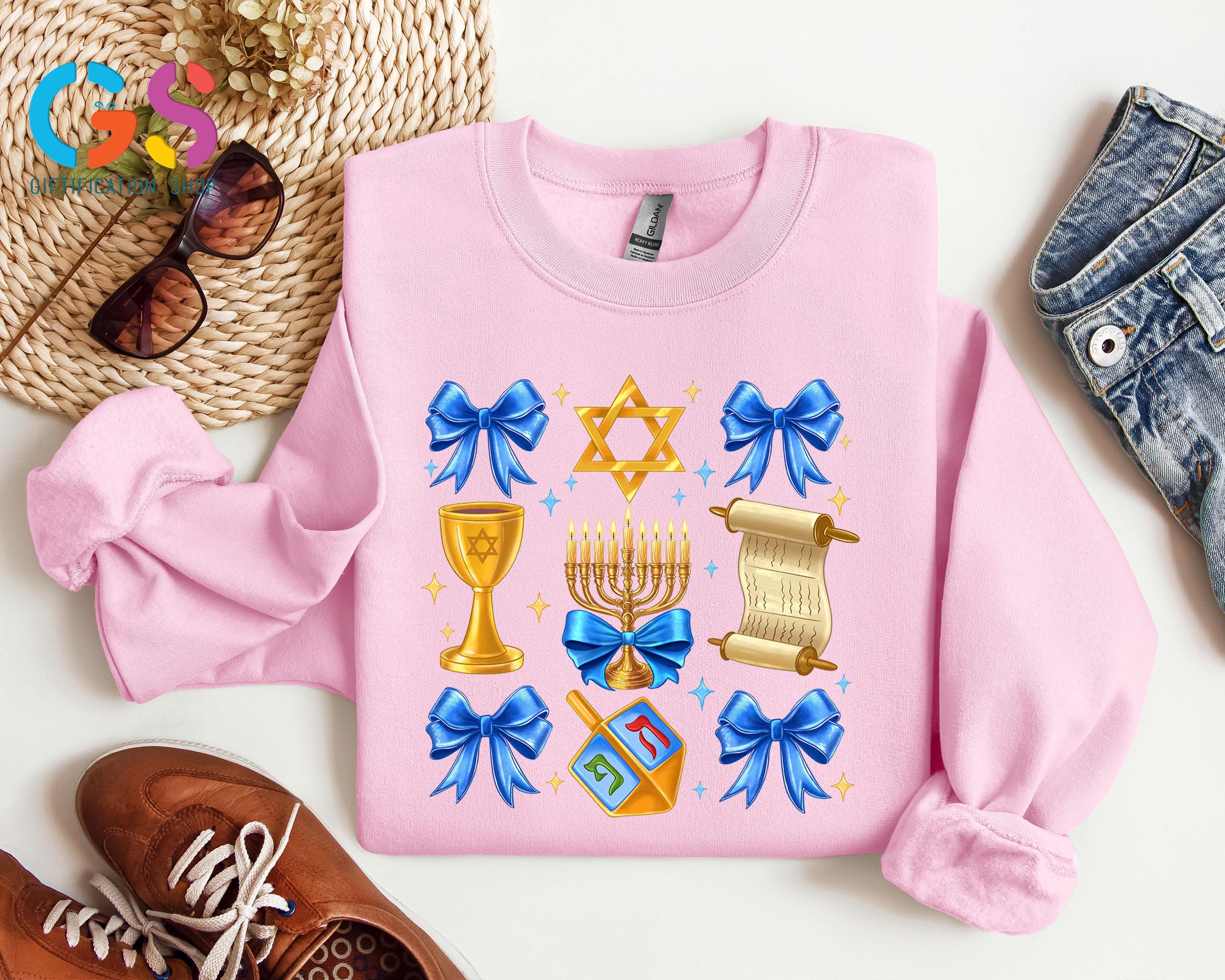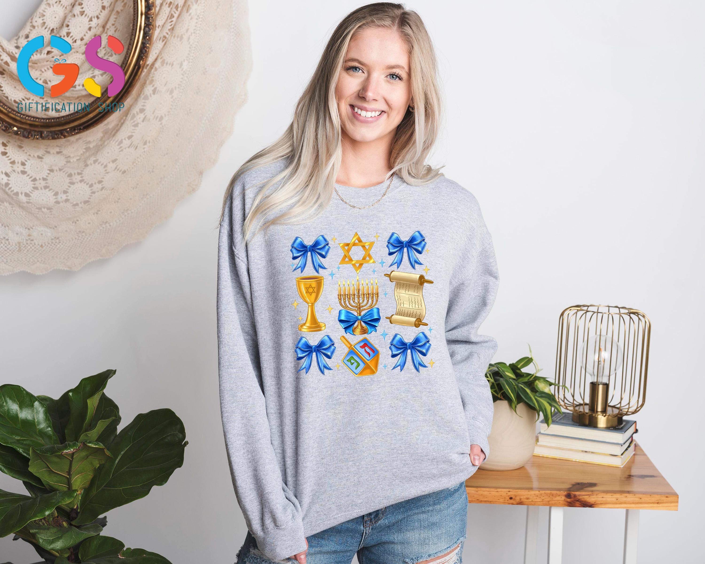 Celebrate the Festival of Lights in style with our Hanukkah Coquette Bow Sweatshirt! This cozy and chic Jewish sweater features a festive Hanukkah bow design, making it the perfect way to express your joy this Happy Hanukkah. Whether you're attending a Hanukkah dinner or looking for a holiday gift, this Menorah hoodie is the ideal choice for spreading warmth and light. Featuring a beautiful Chanukah sweater design, it’s a perfect fit for both Jewish women shirts and Israel shirt lovers alike. A lovely religious Hanukkah piece that can be worn proudly during the Hanukkah xmas season or given as a thoughtful gift, this sweatshirt is sure to make anyone feel special and festive during the holidays!