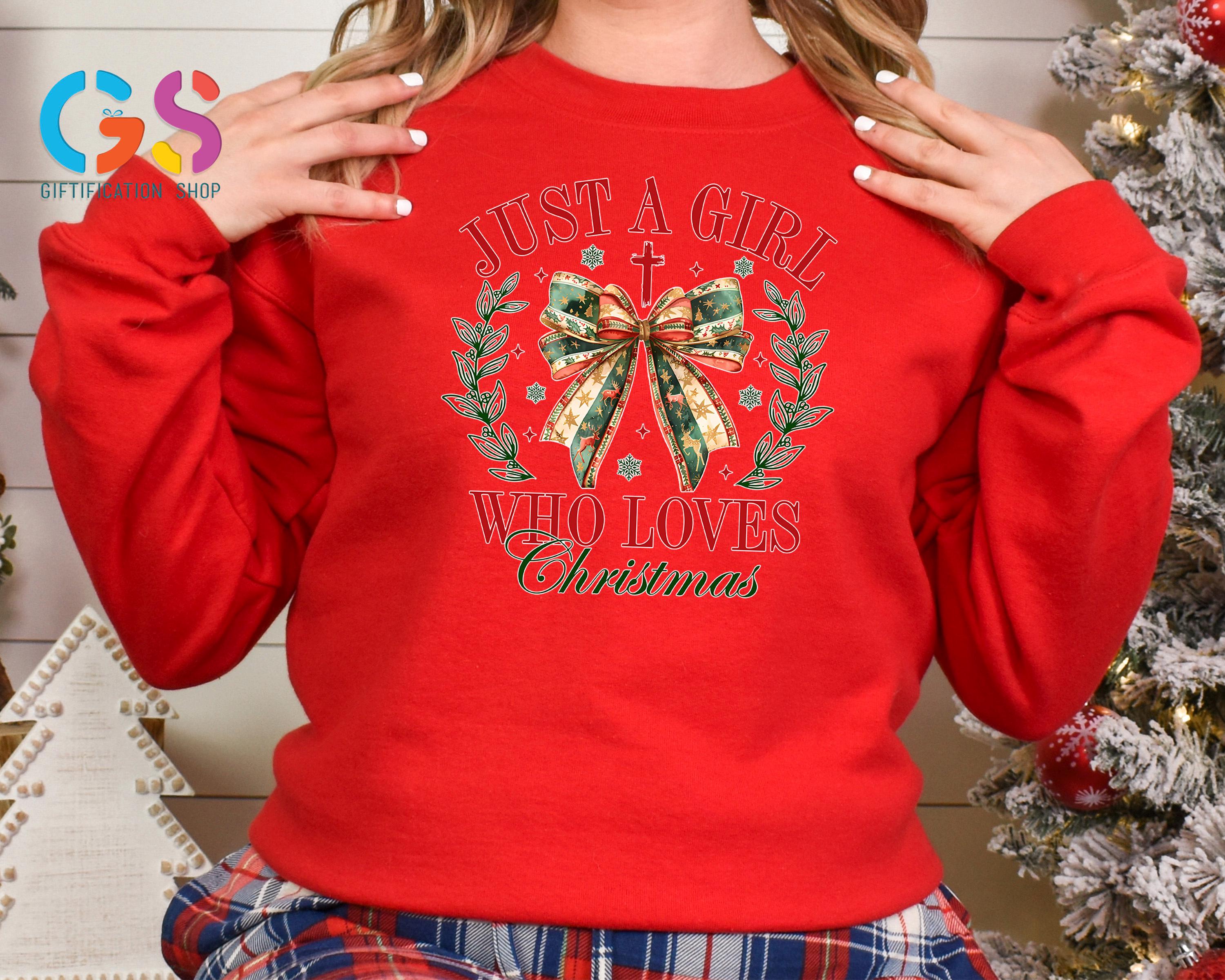 Just A Girl Who Loves Christmas Vibe Sweatshirt, Winter Christian Sweat, Xmas Holiday Apparel, Coquette Cross Clothing