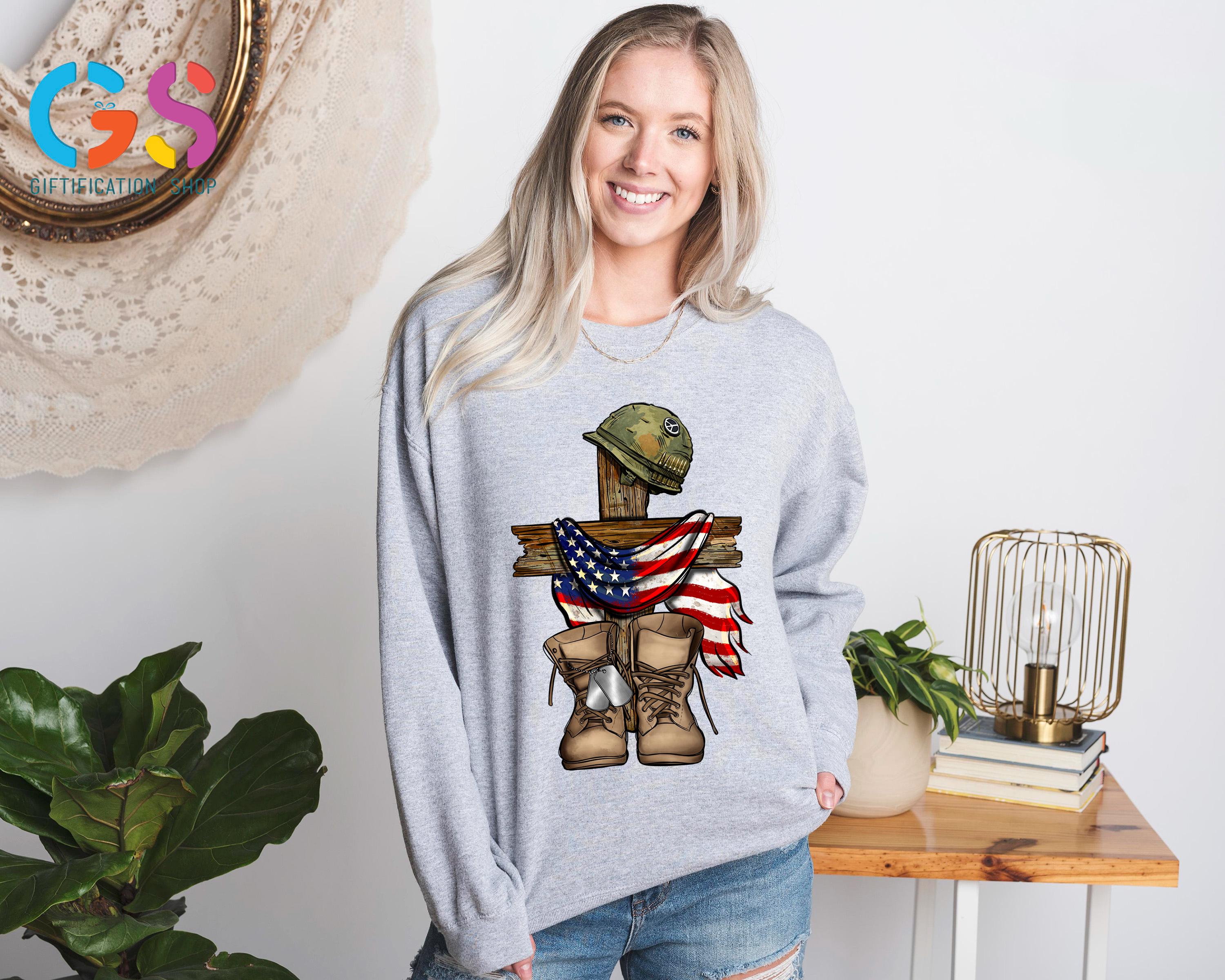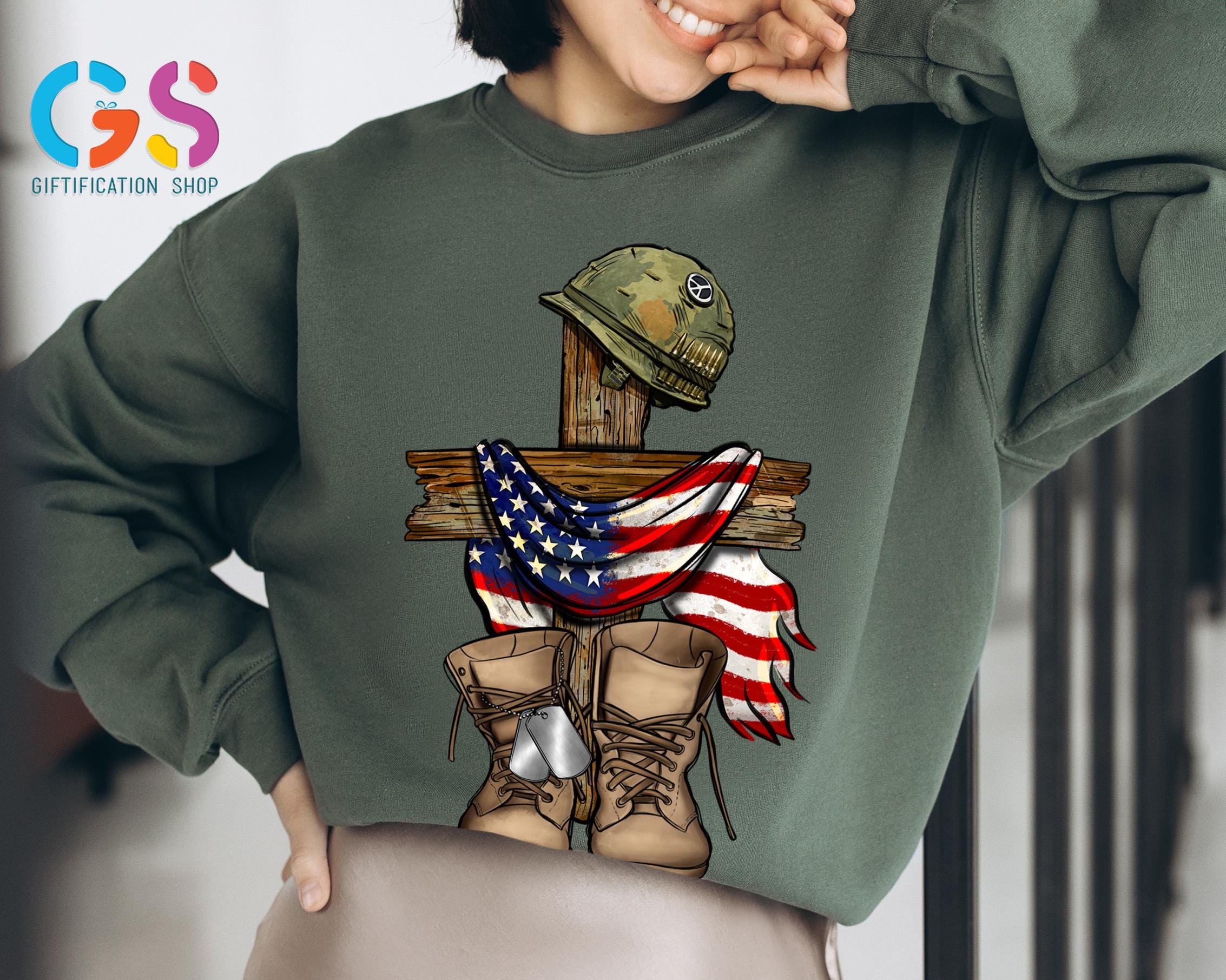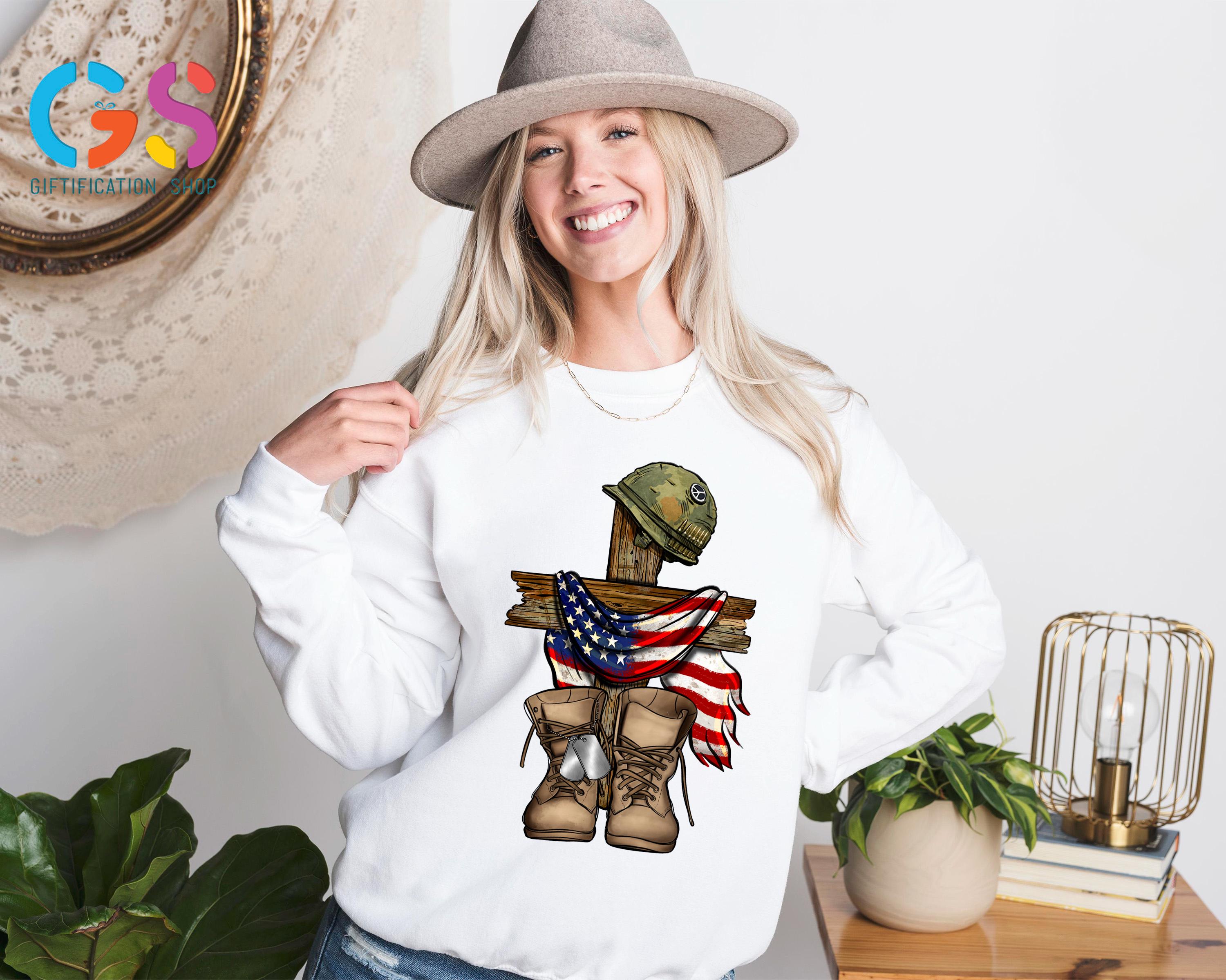 Christian Cross American Flag Sweatshirt, Patriotic Army Boot Sweater, Religious Veteran Memorial Day Hoodie, USA Gift