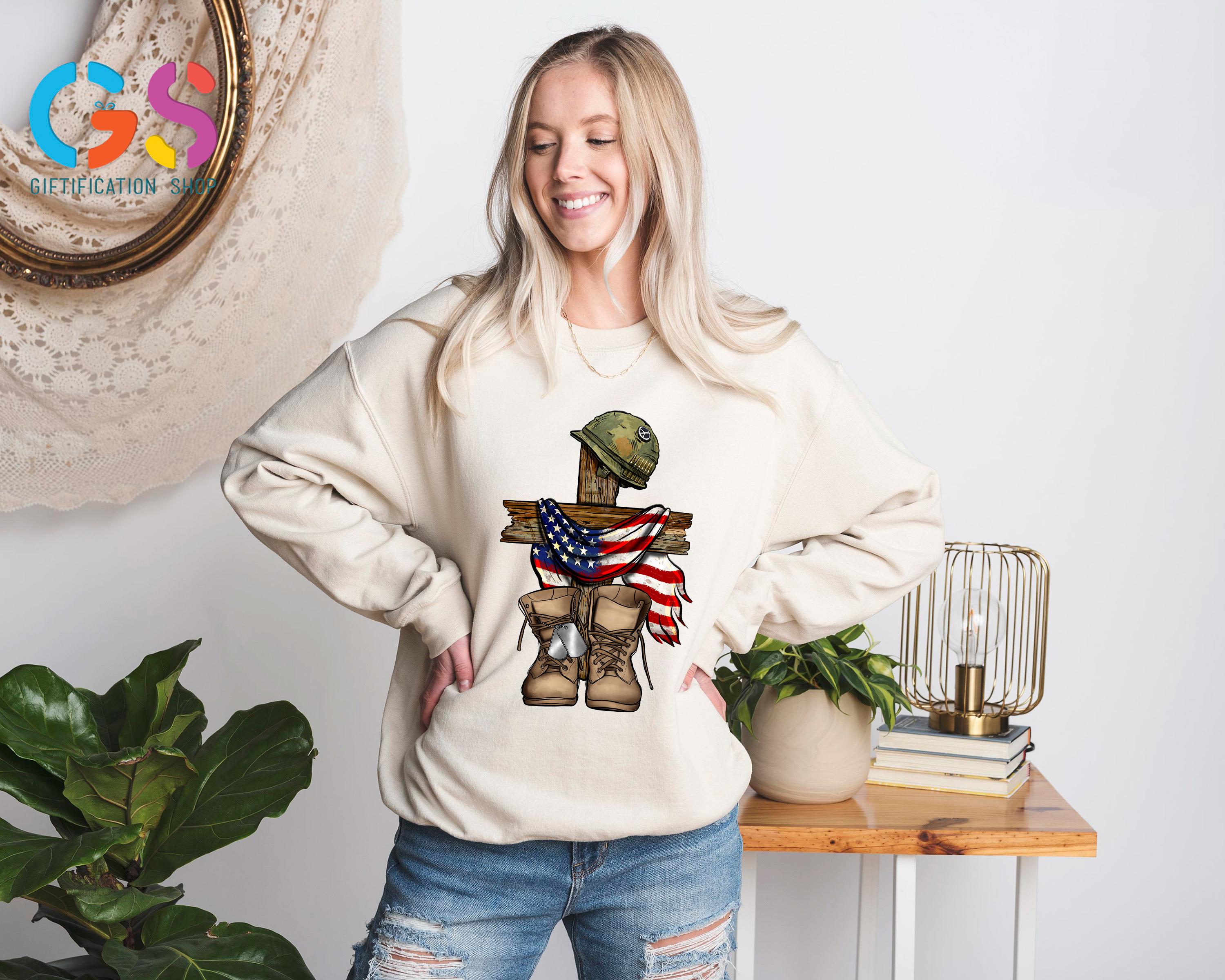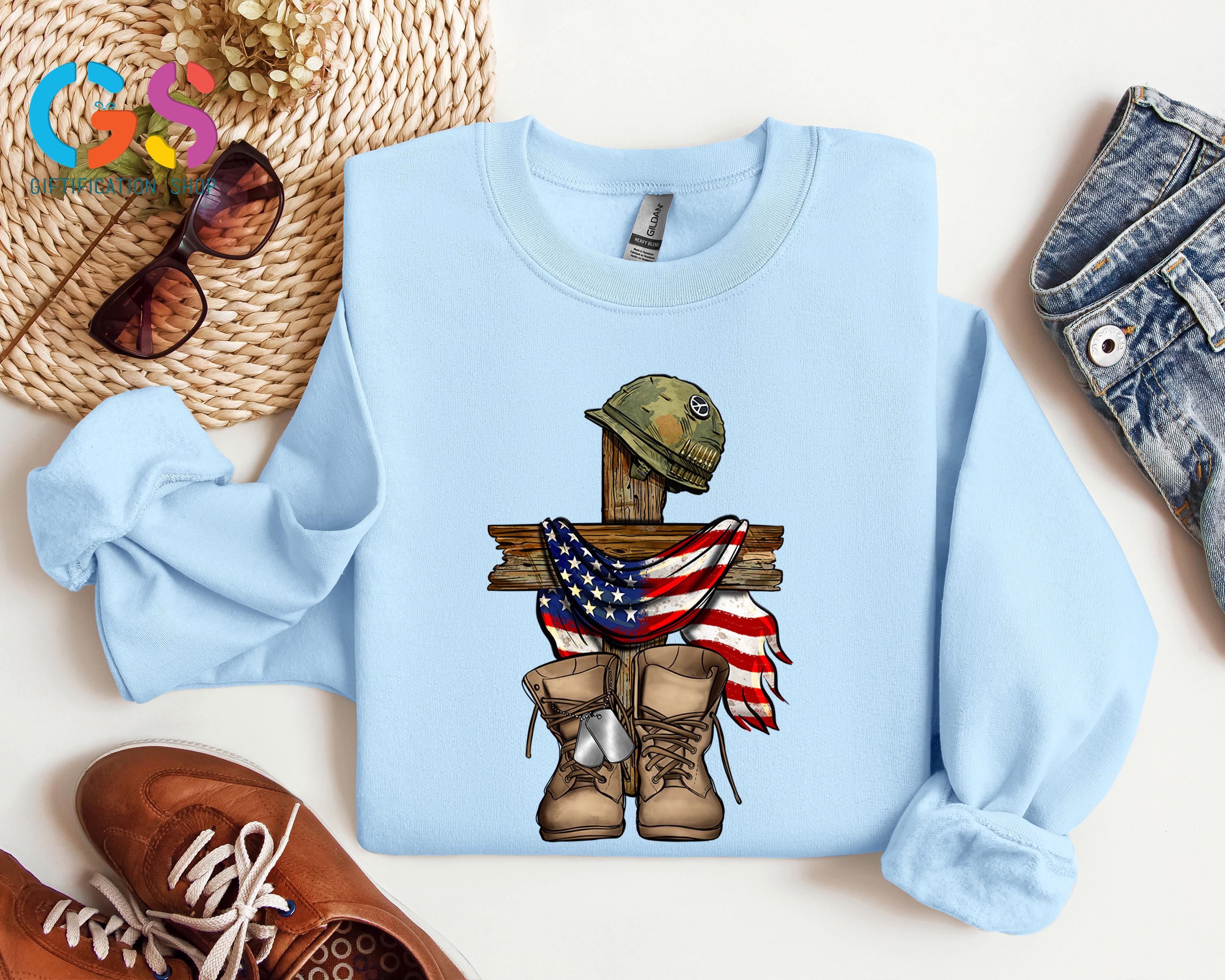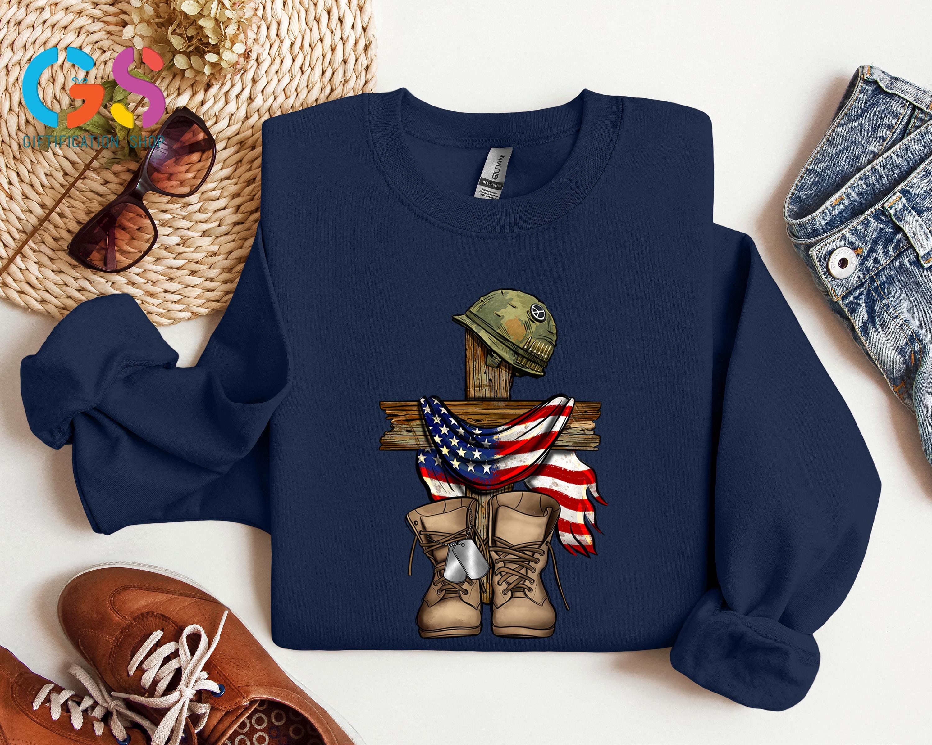 Christian Cross American Flag Sweatshirt, Patriotic Army Boot Sweater, Religious Veteran Memorial Day Hoodie, USA Gift