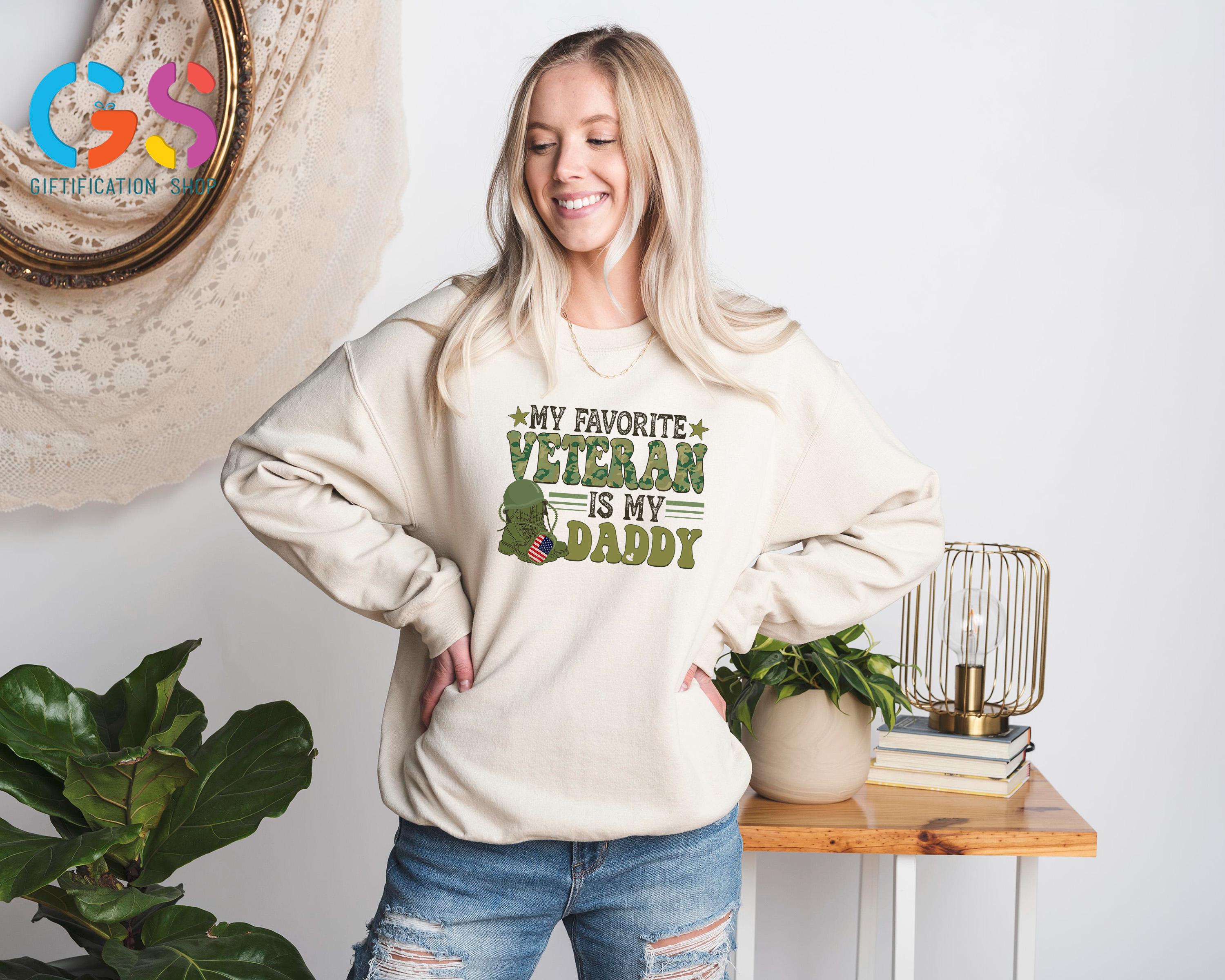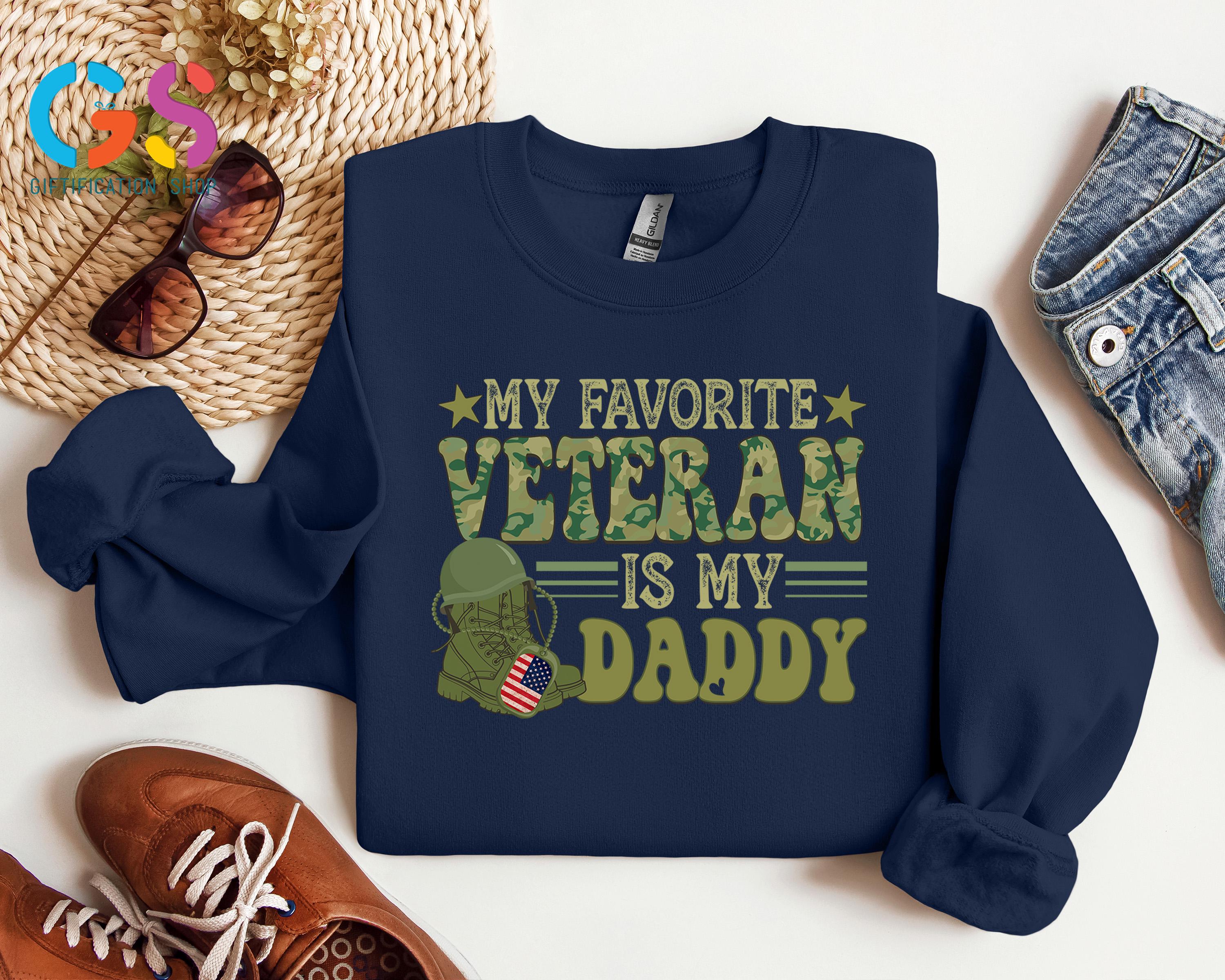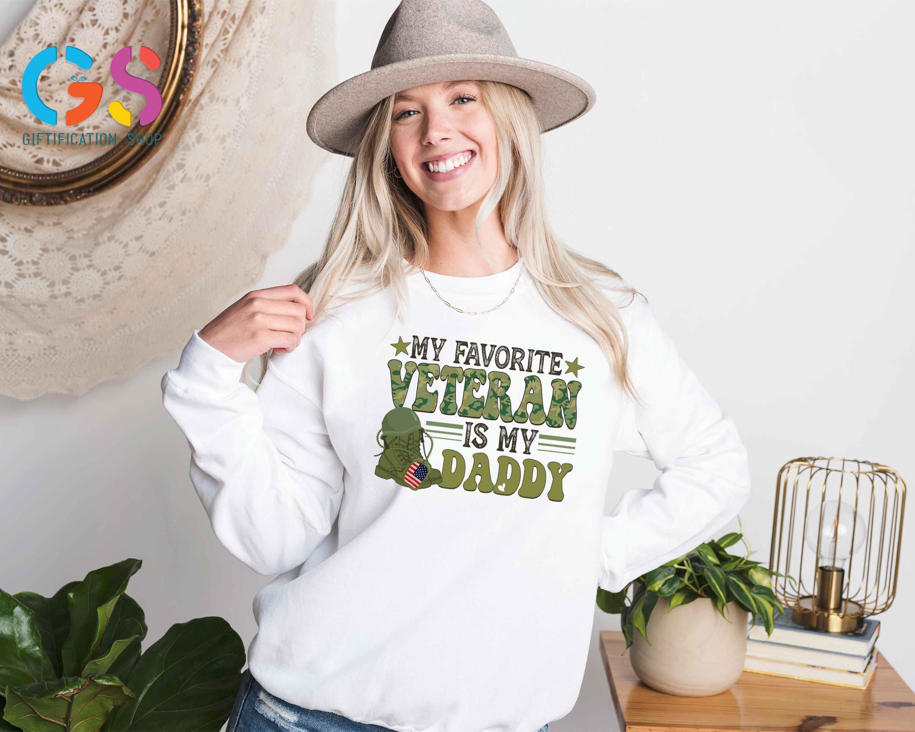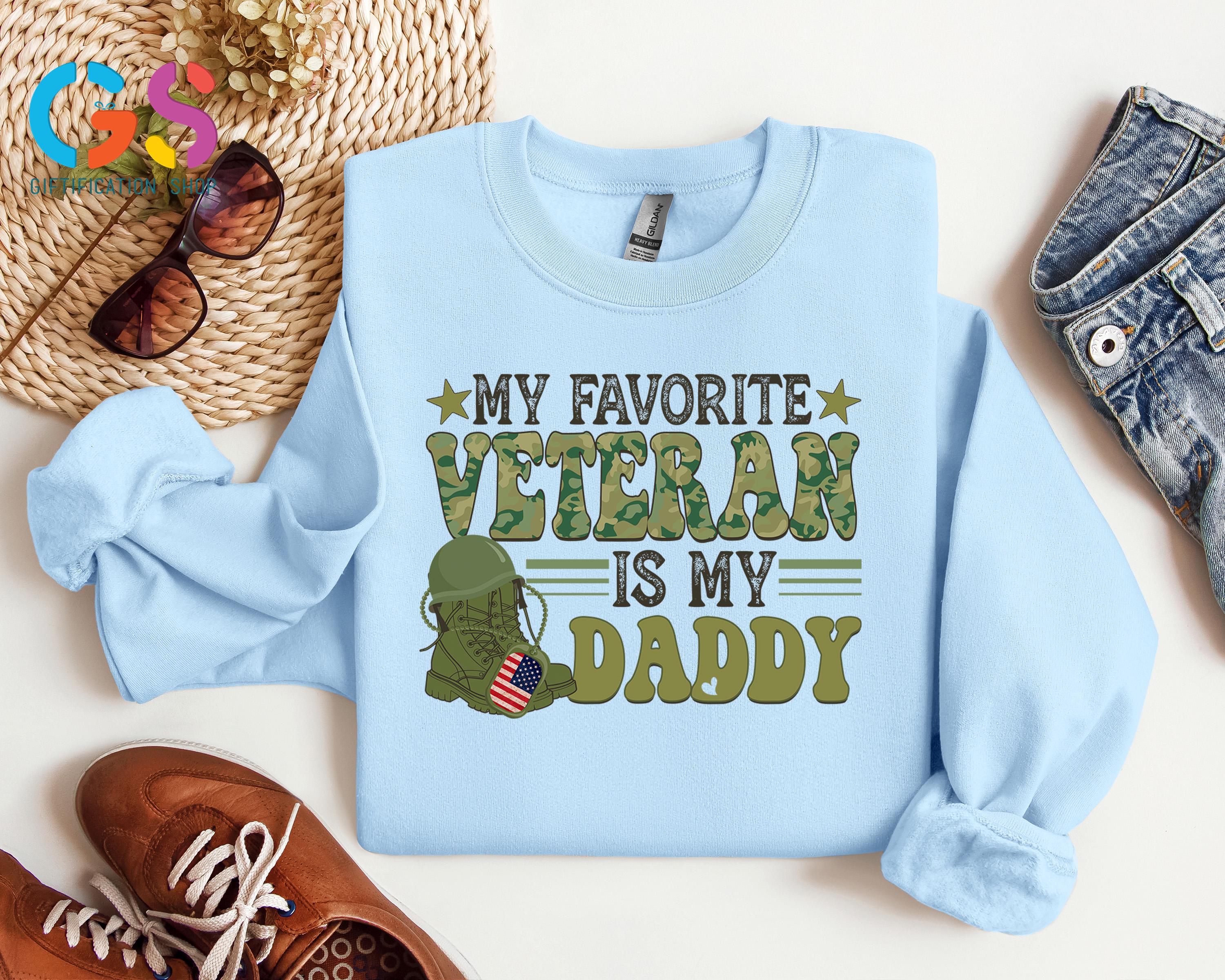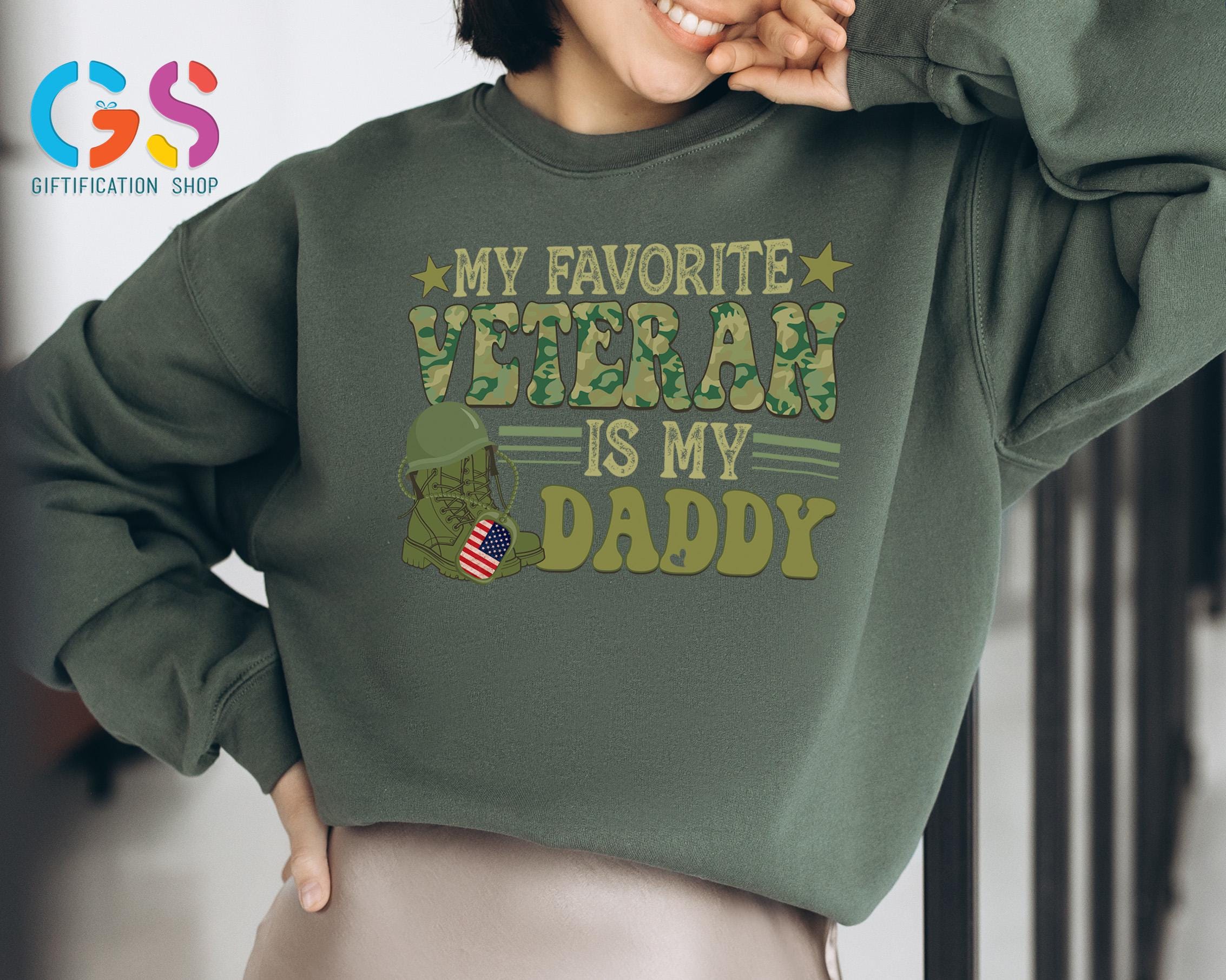 Show your love and pride for your hero with the My Favorite Veteran Is My Daddy Sweatshirt, a heartfelt tribute to the men and women who have served. This Father Veteran Day Sweater is the perfect Veterans Day gift for the dad who's also a proud military veteran. Featuring a bold American flag design, this Patriotic Military Hoodie is a great way to celebrate 4th of July or any day dedicated to honoring our veterans. Whether it's for Father's Day or just because, this military shirt lets your dad wear his pride on his sleeve while staying cozy and stylish. Show your support for freedom and family with this unique veteran shirt—a must-have for any USA shirt collection!