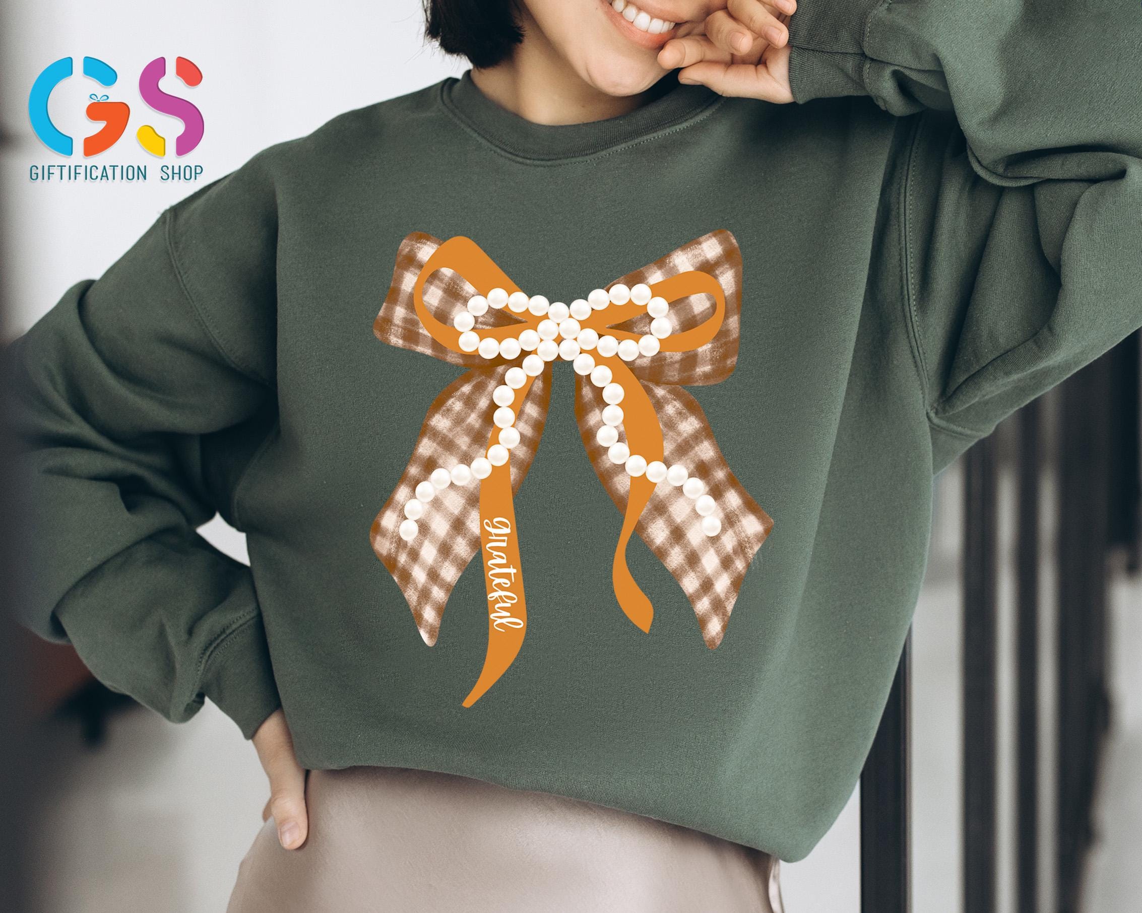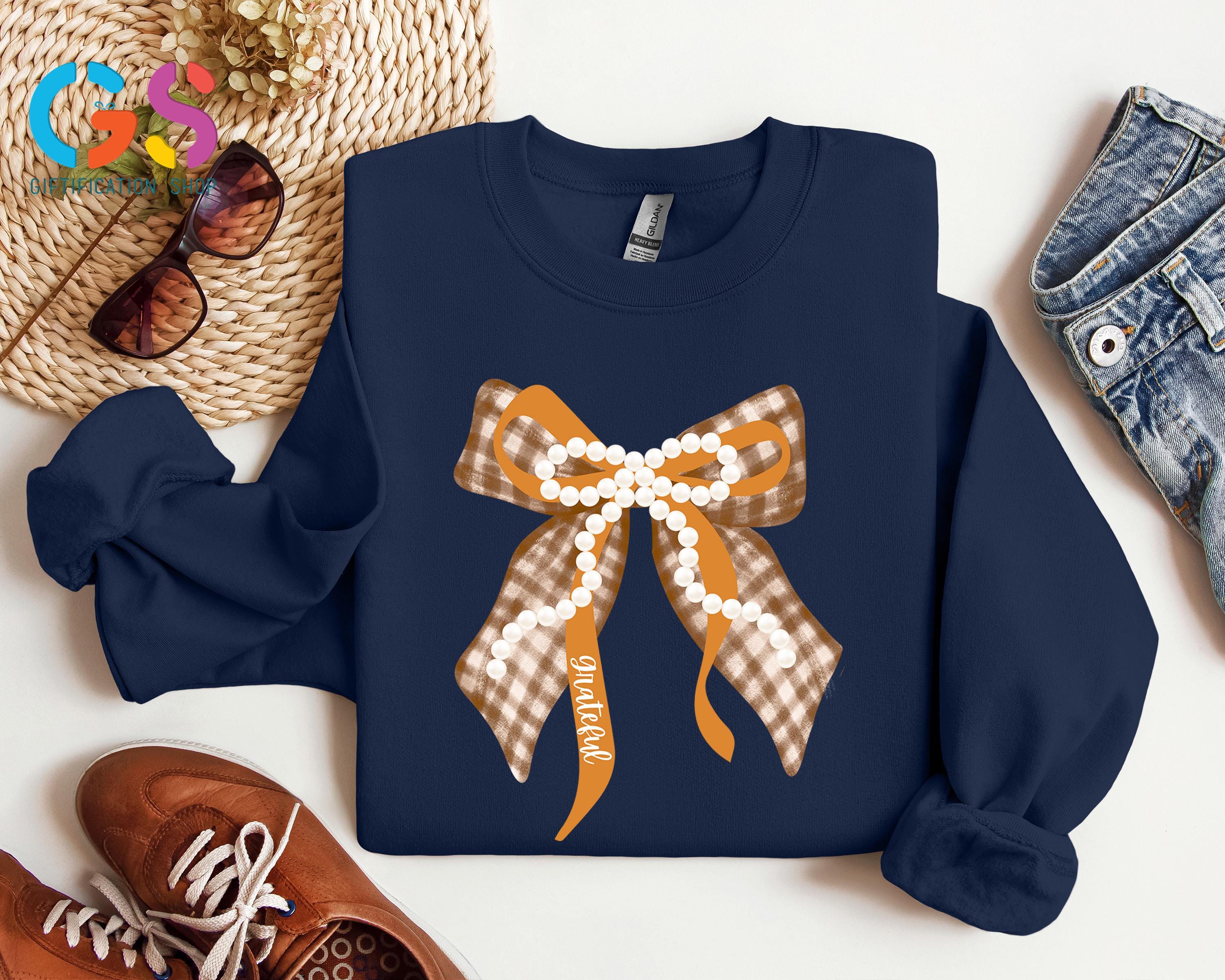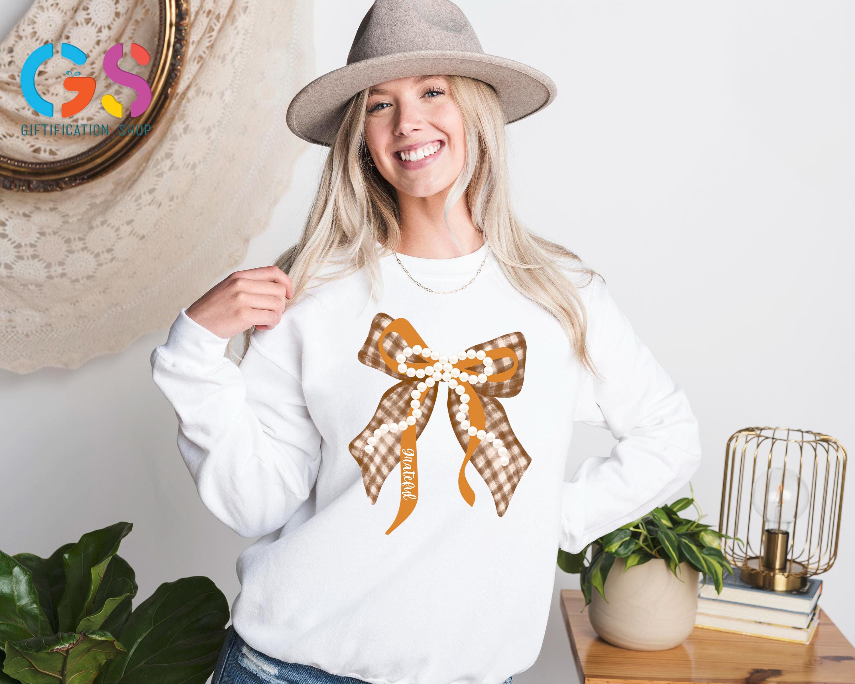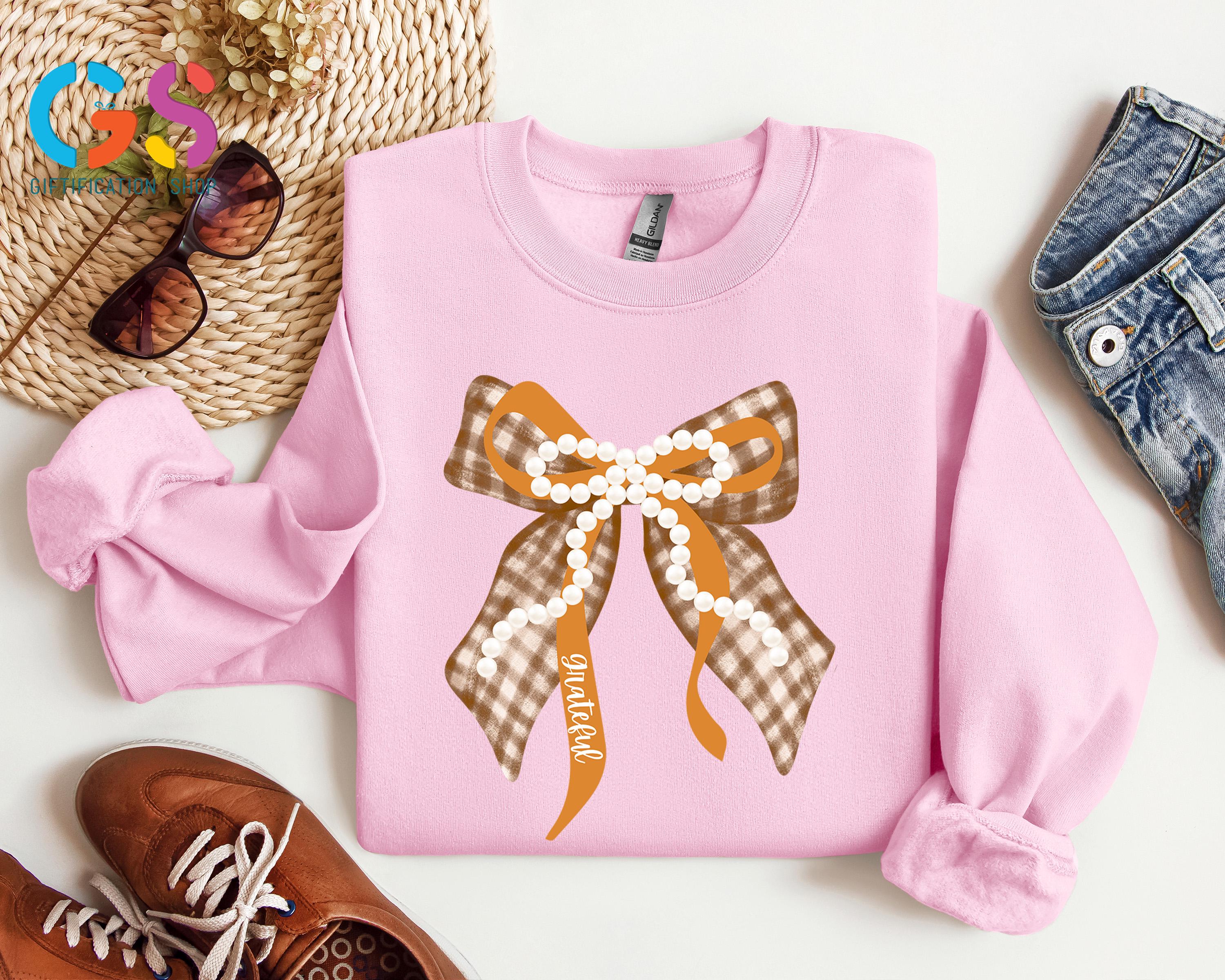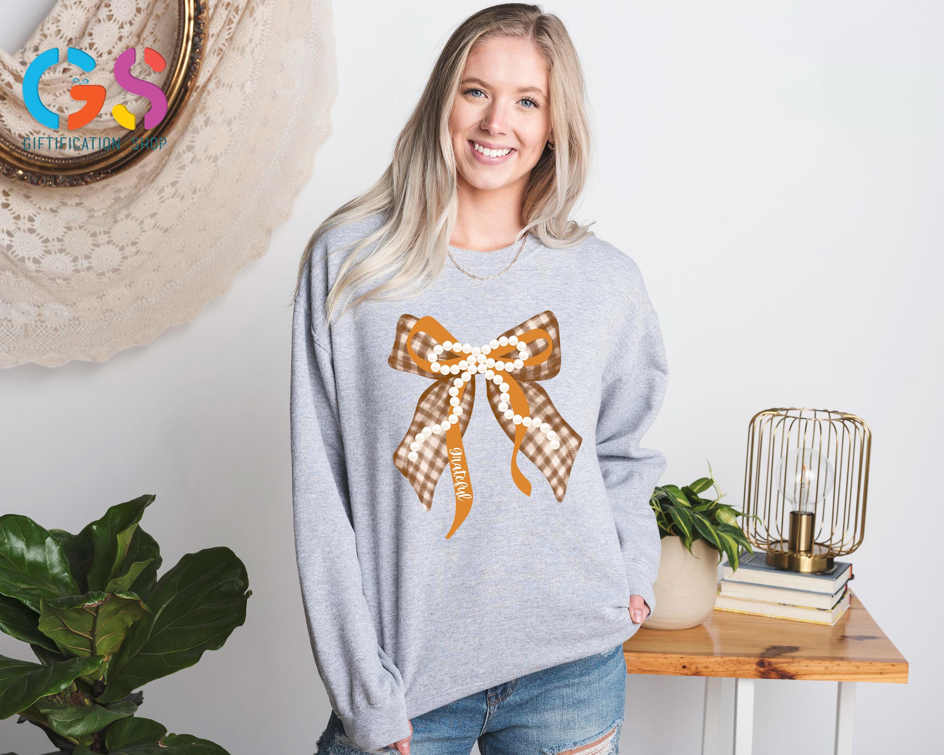 Fall Coquette Pearl Bow Sweatshirt, Thankful Grateful Blessed Sweater, Thanksgiving Gift For Women, Autumn Vibe Top