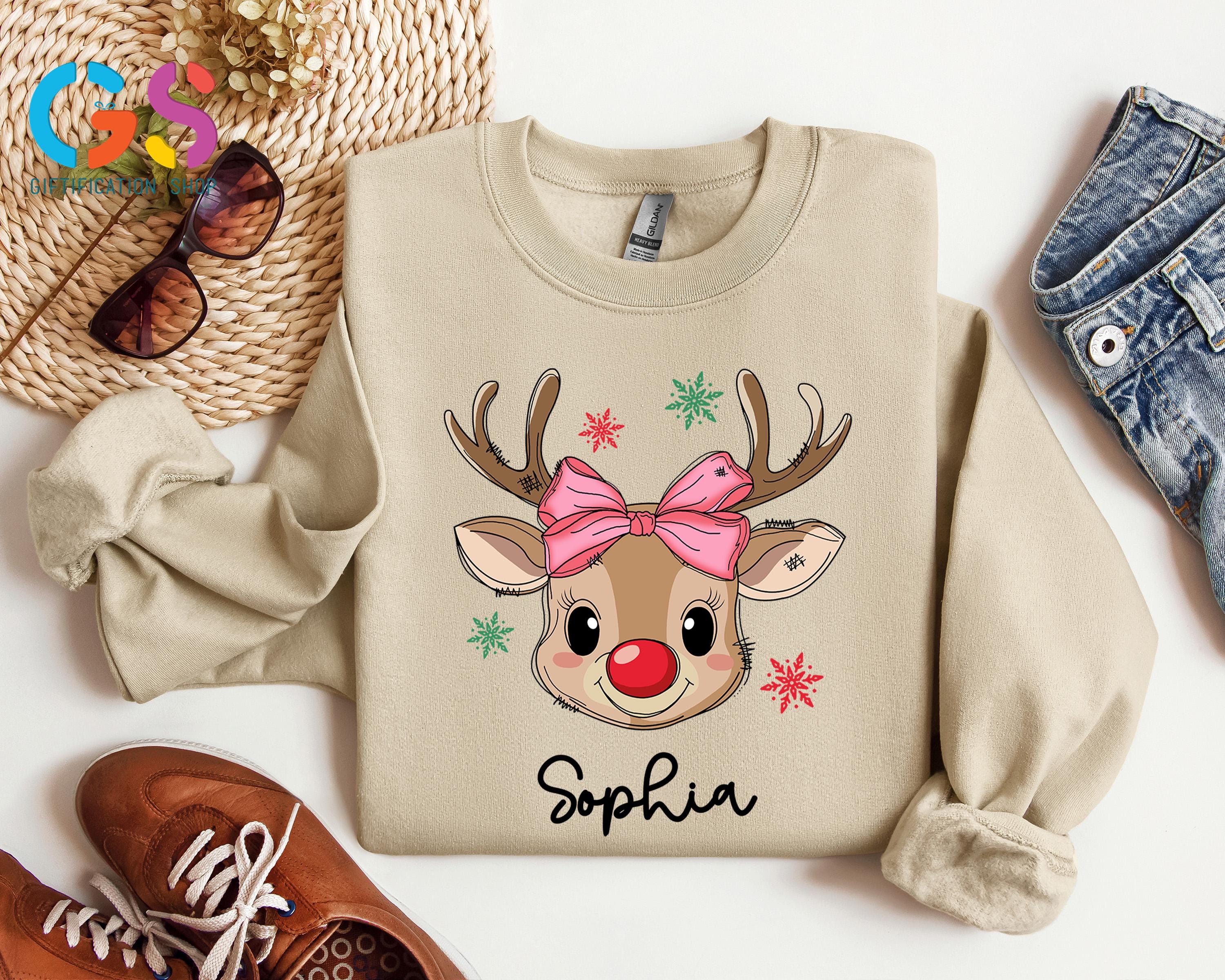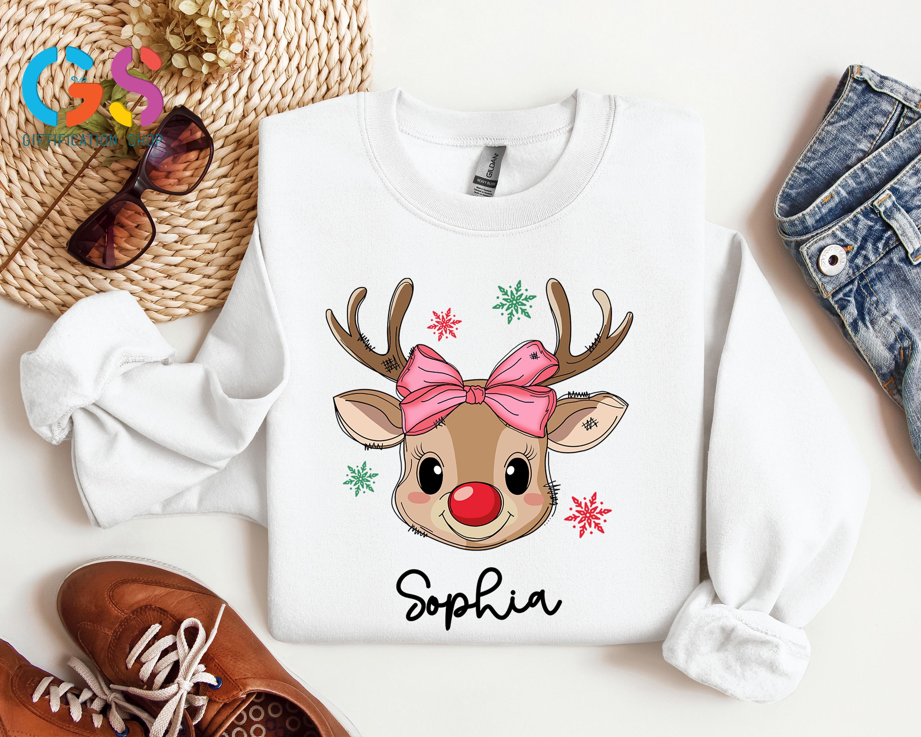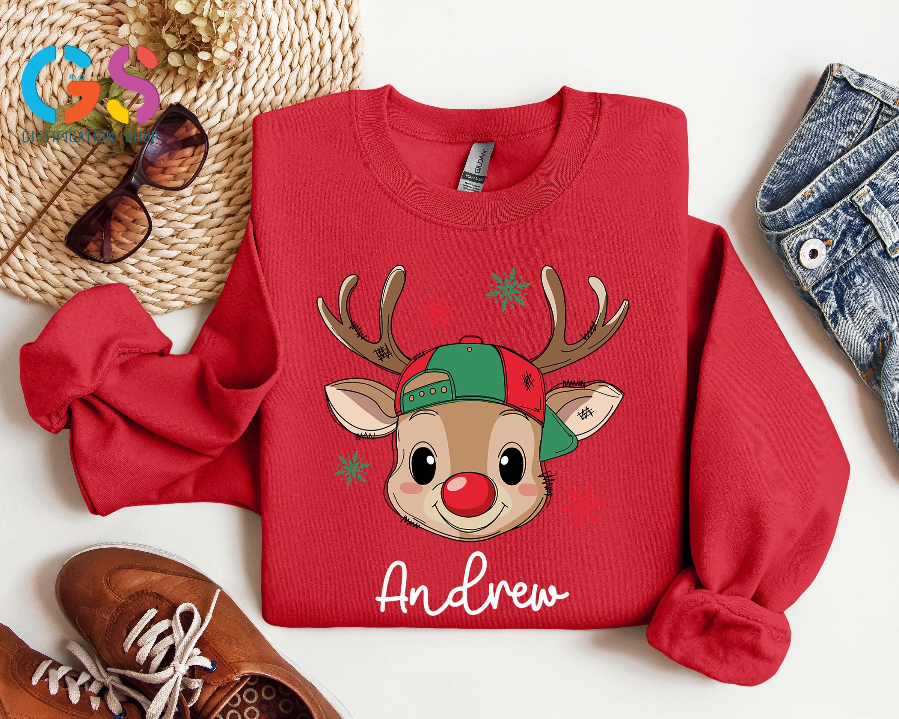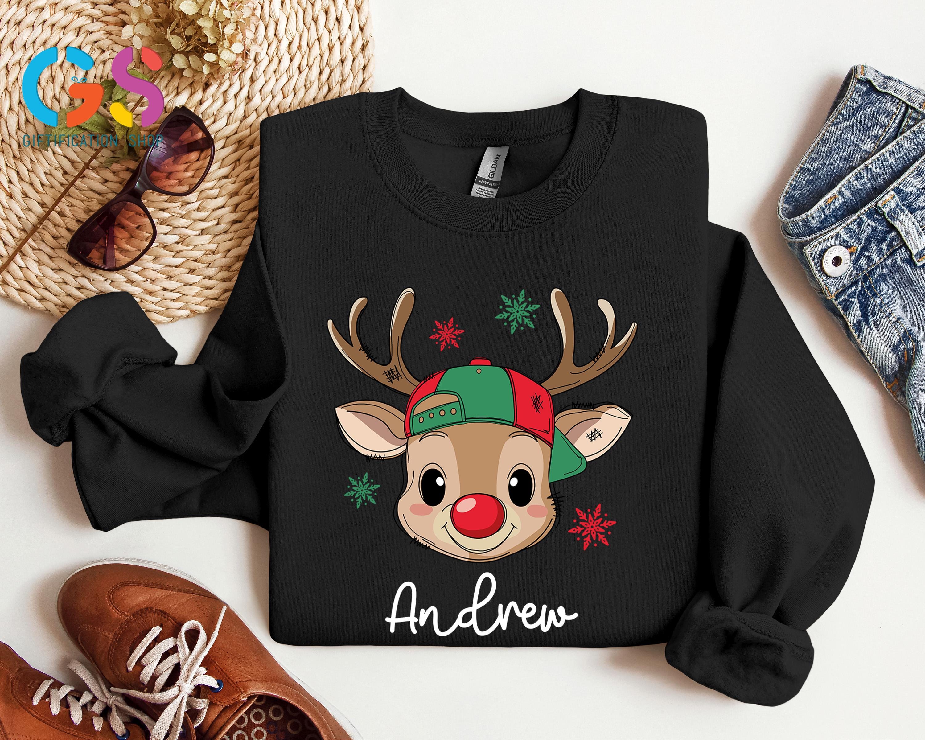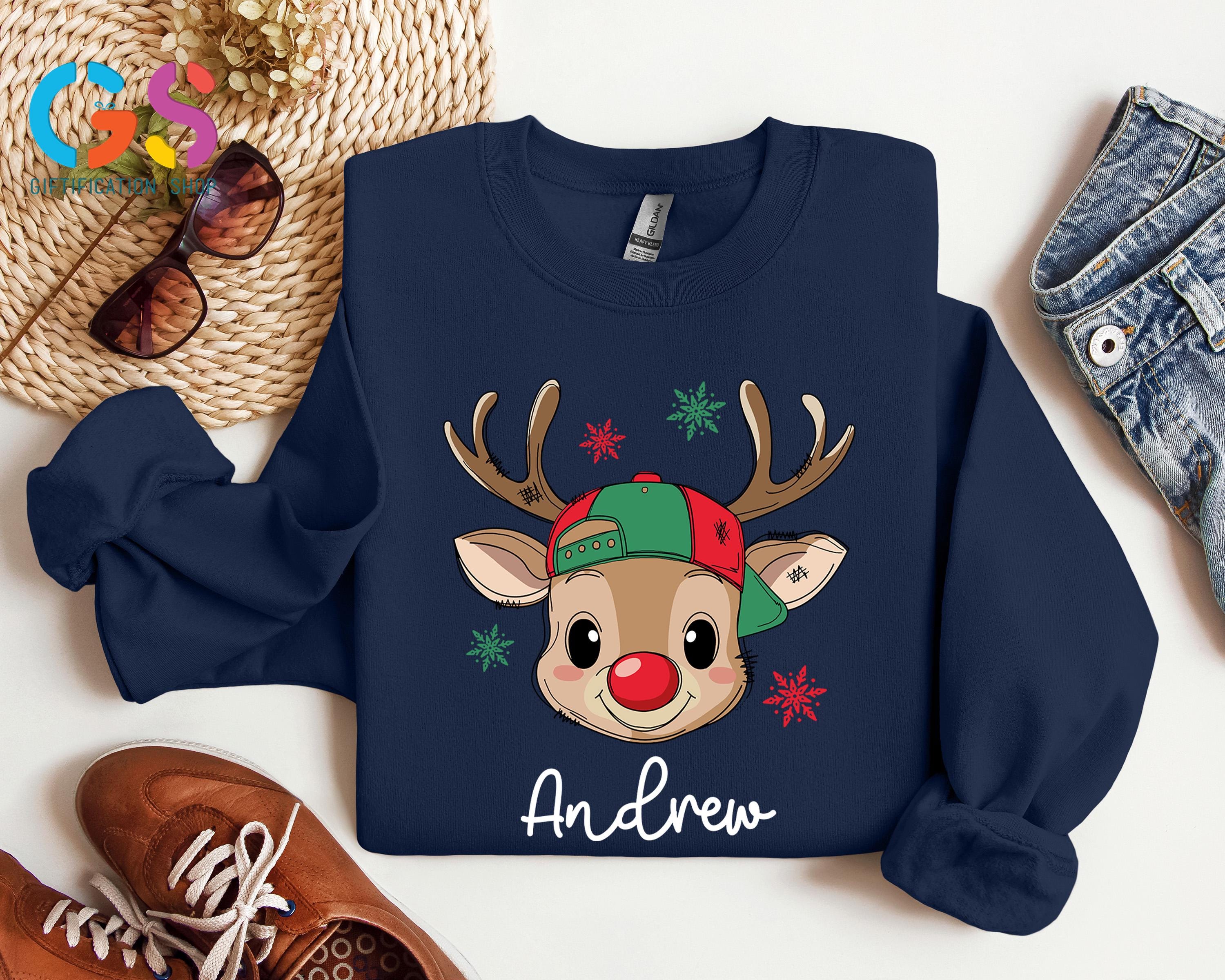 Get ready for the holidays with this adorable Custom Name Kid Reindeer Christmas Sweatshirt! Perfect for both boys and girls, this festive toddler and kid holiday shirt features a charming reindeer design and can be personalized with your child's name. Whether you're looking for a fun matching Christmas sweater for the whole family or a cozy winter sweatshirt for your little one, this Xmas gift is sure to bring joy and warmth to their holiday season. Made with soft, comfortable material, this merry sweatshirt is perfect for chilly winter days and makes a great addition to any holiday wardrobe. Ideal for family photos or as a special gift, this custom Christmas sweatshirt is a must-have for making lasting memories this season.