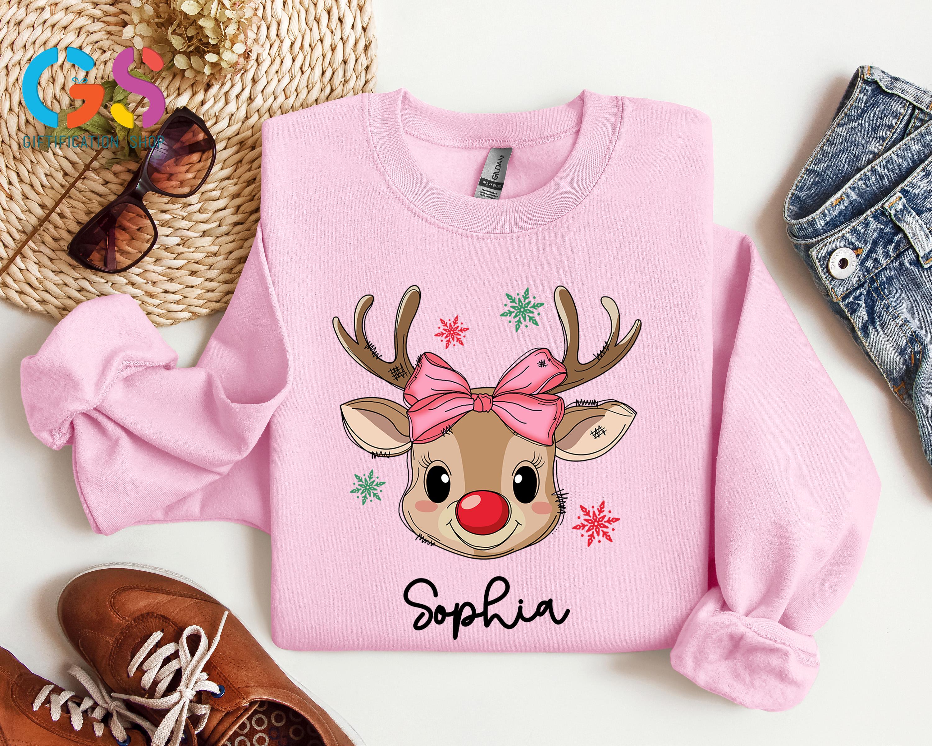 Custom Name Kid Reindeer Christmas Sweatshirt, Holiday Matching Boy & Girl Sweater, Xmas Toddler Winter Clothing