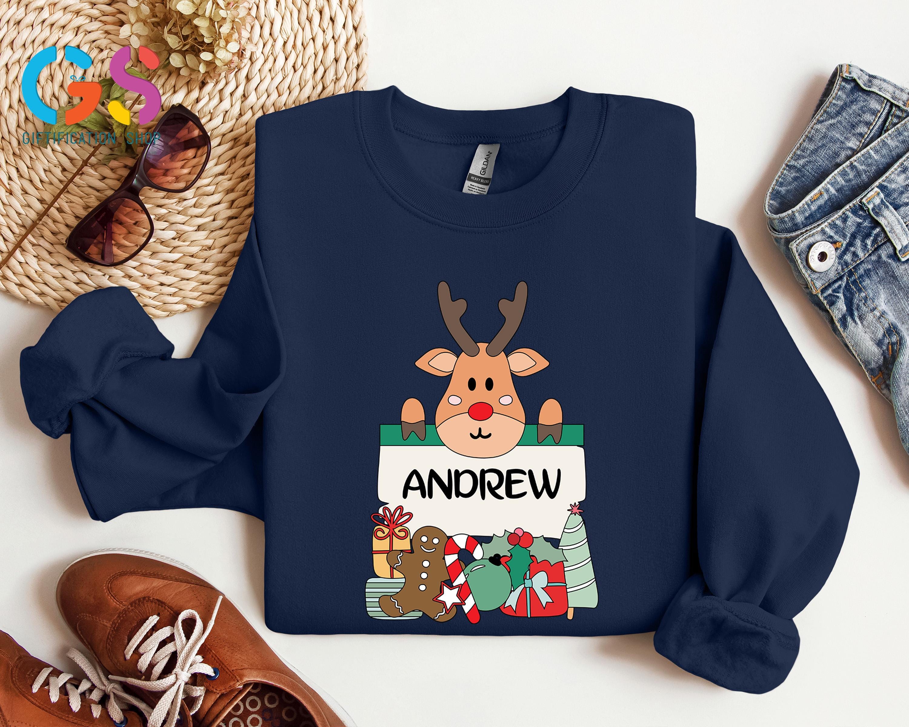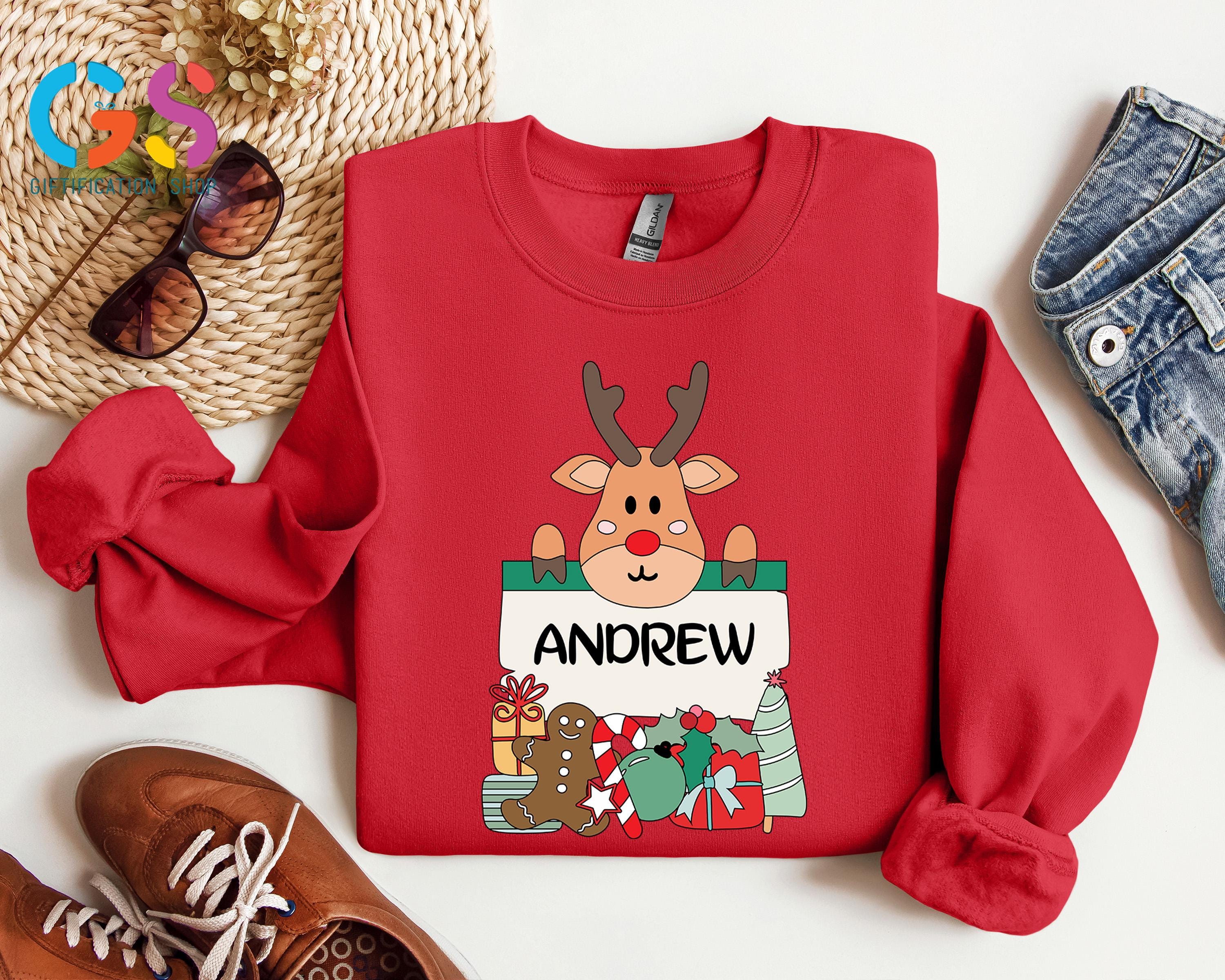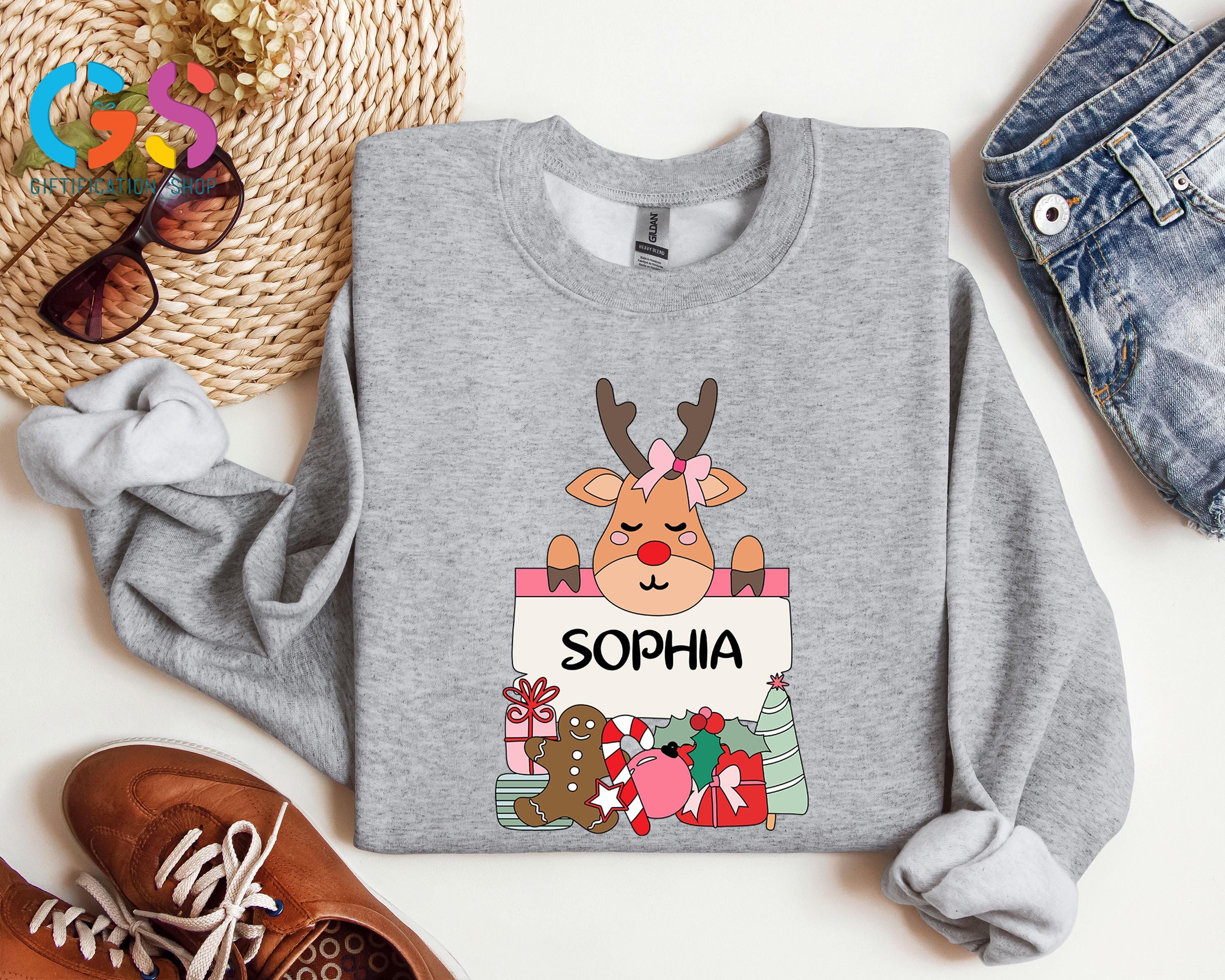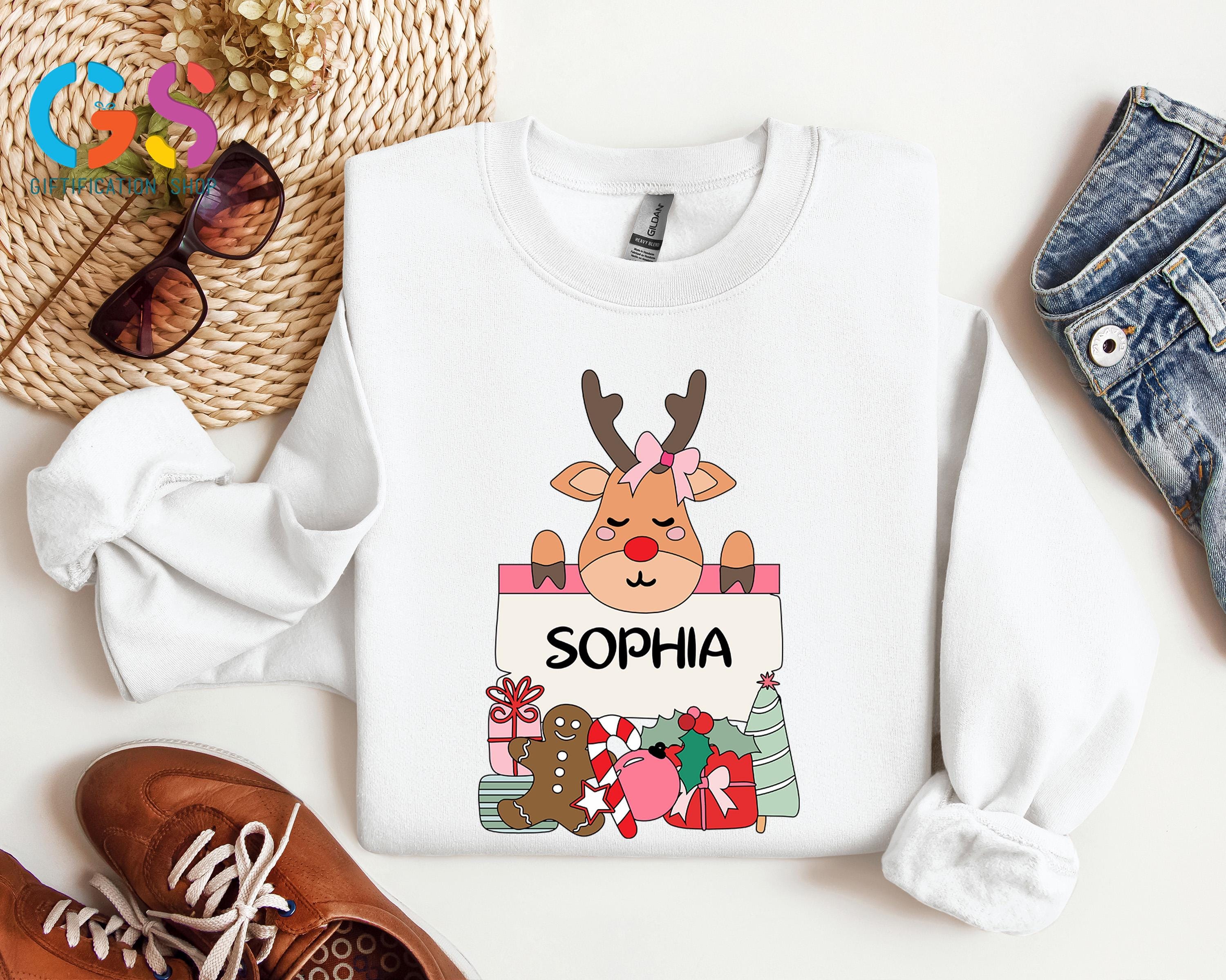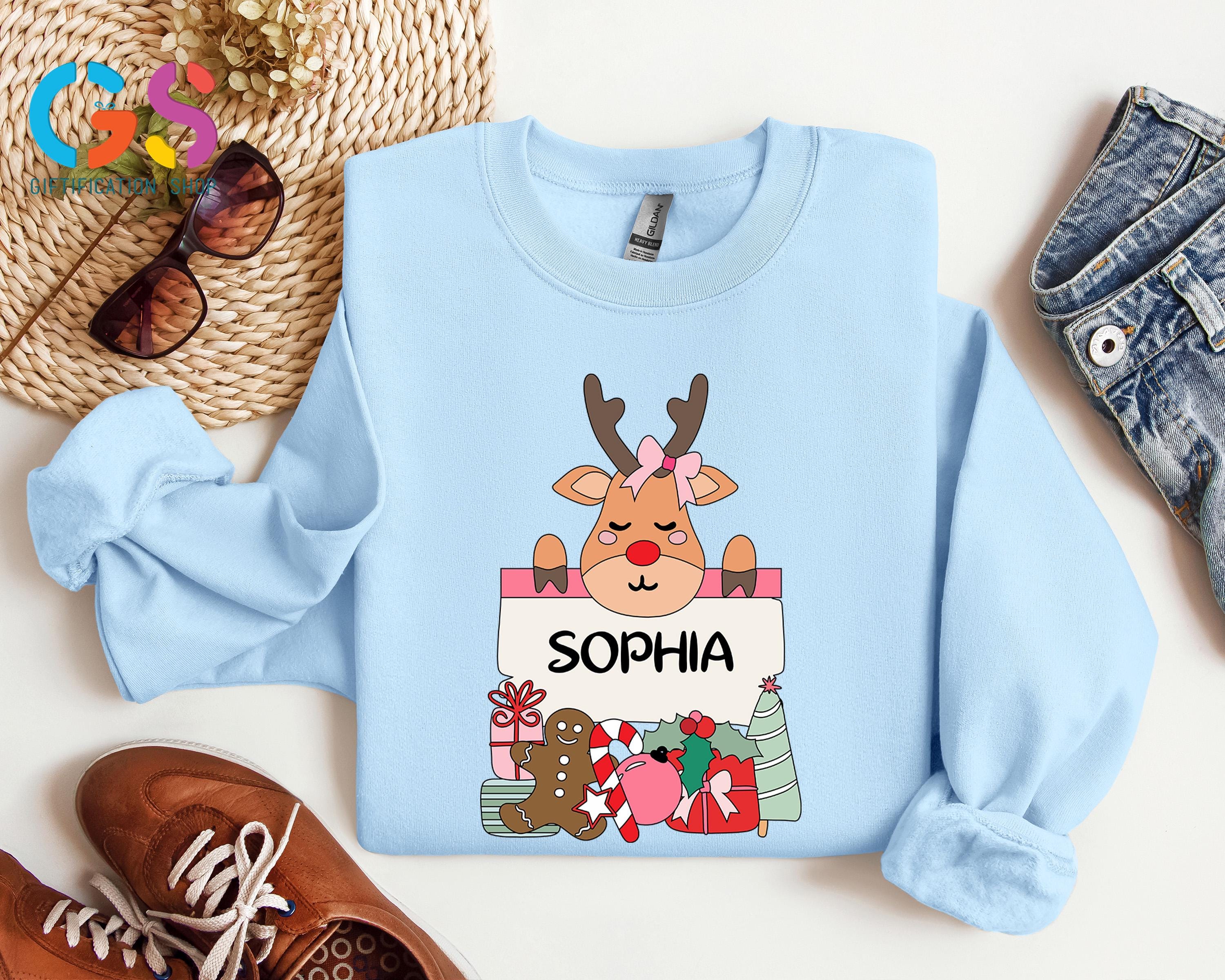 Custom Name Reindeer Toddler Sweatshirt, Kid Holiday Matching Sweater, Christmas Vibe Little Gift, Cozy Season Top