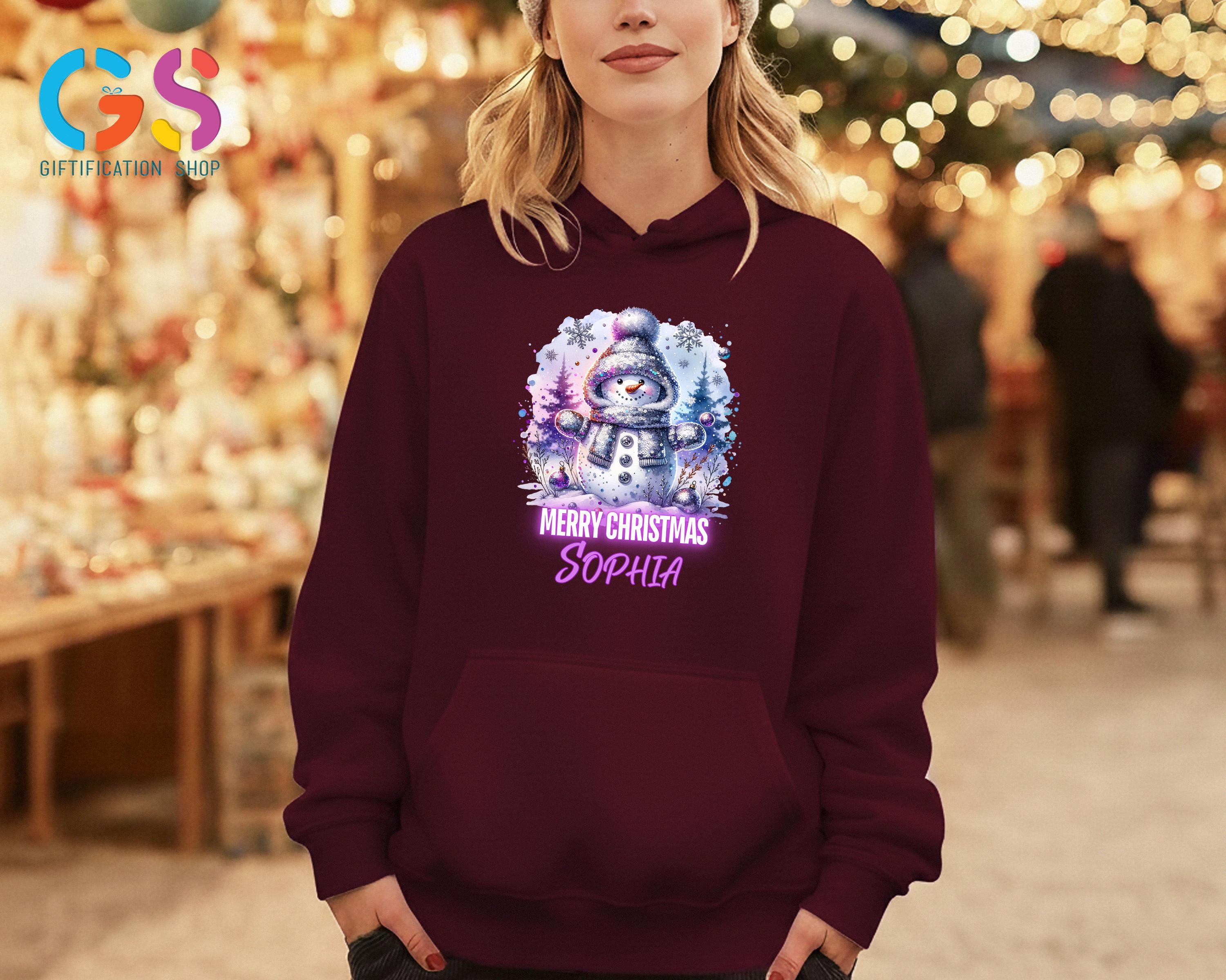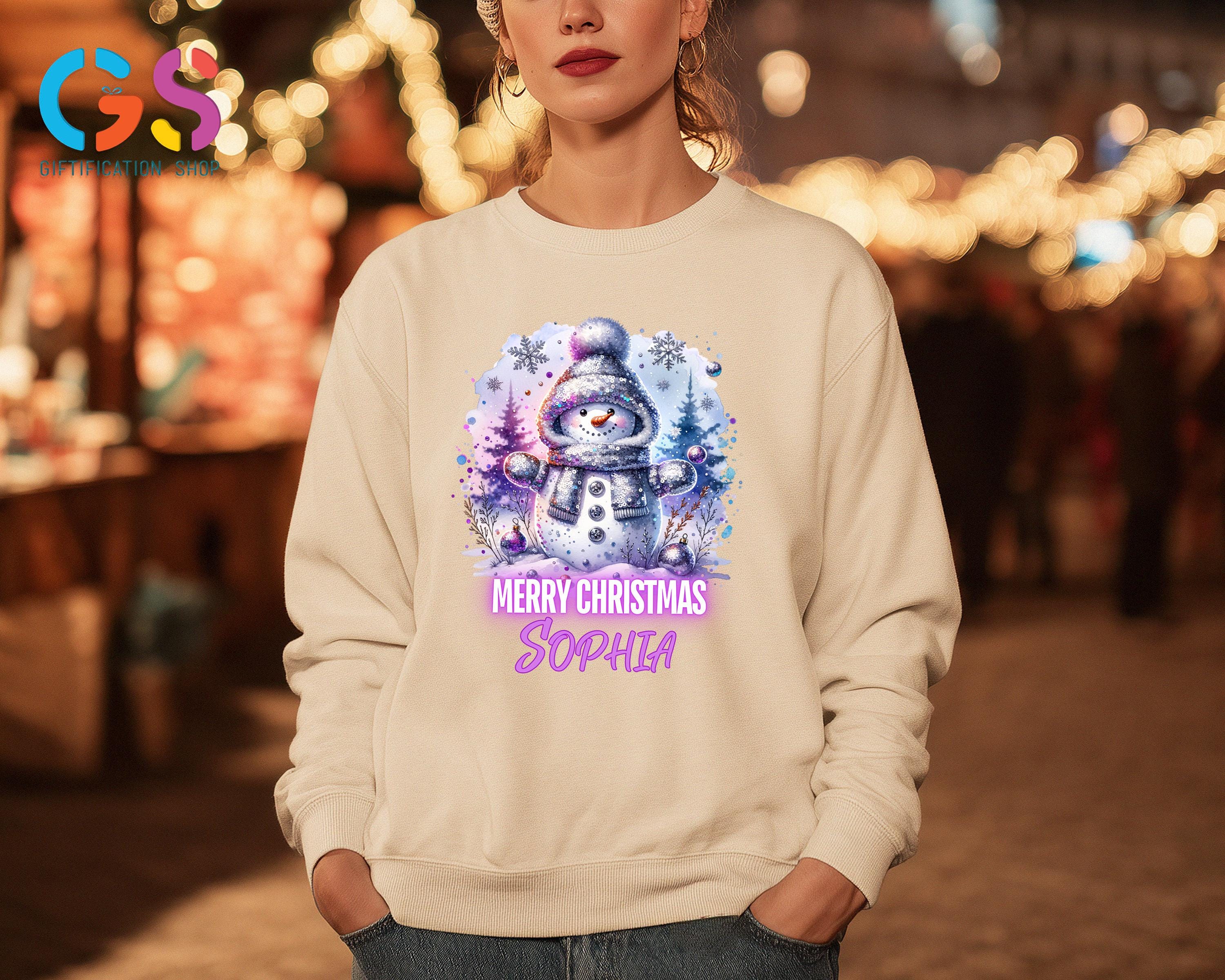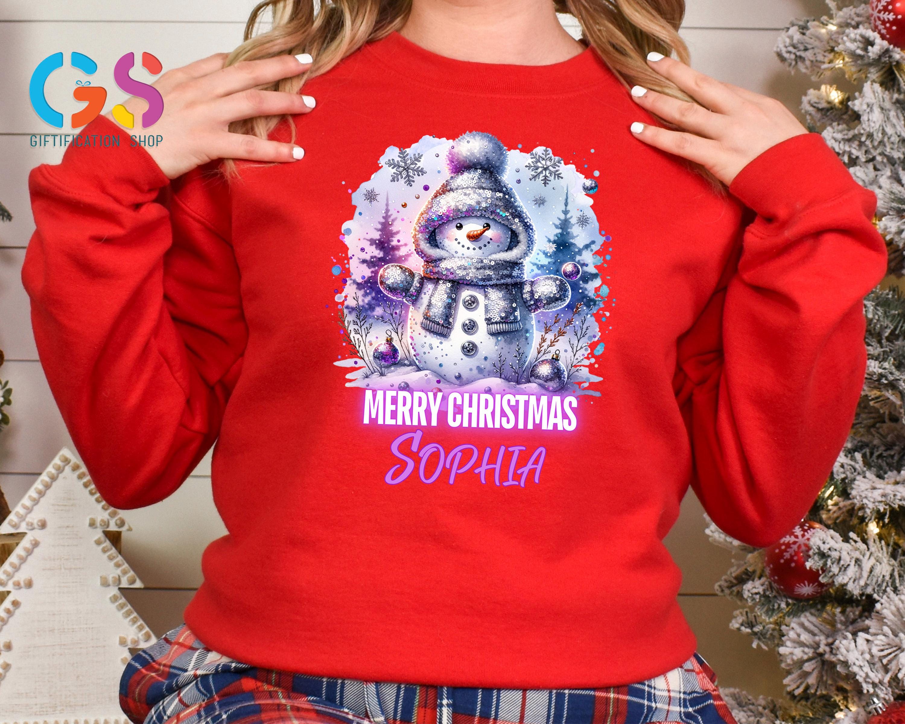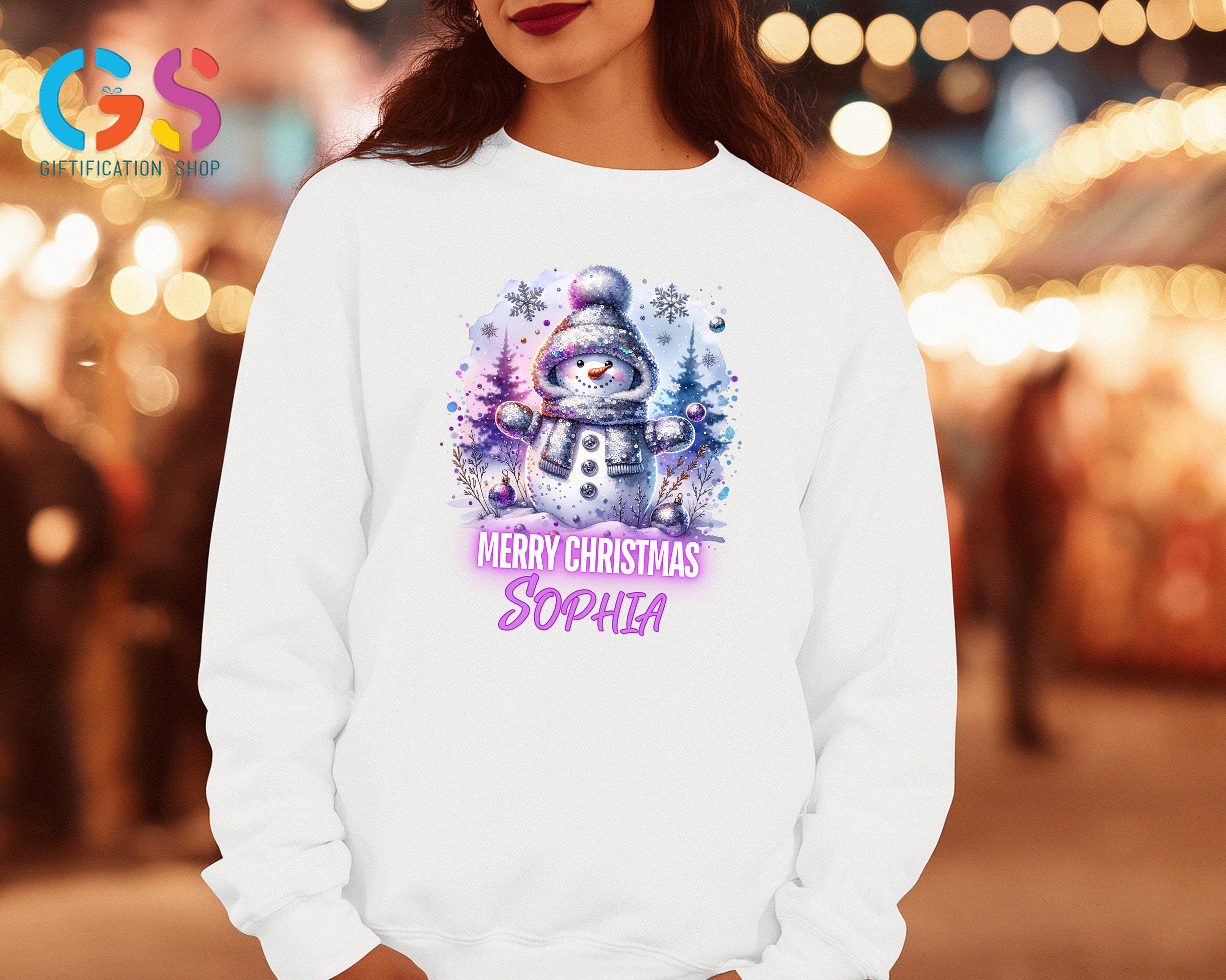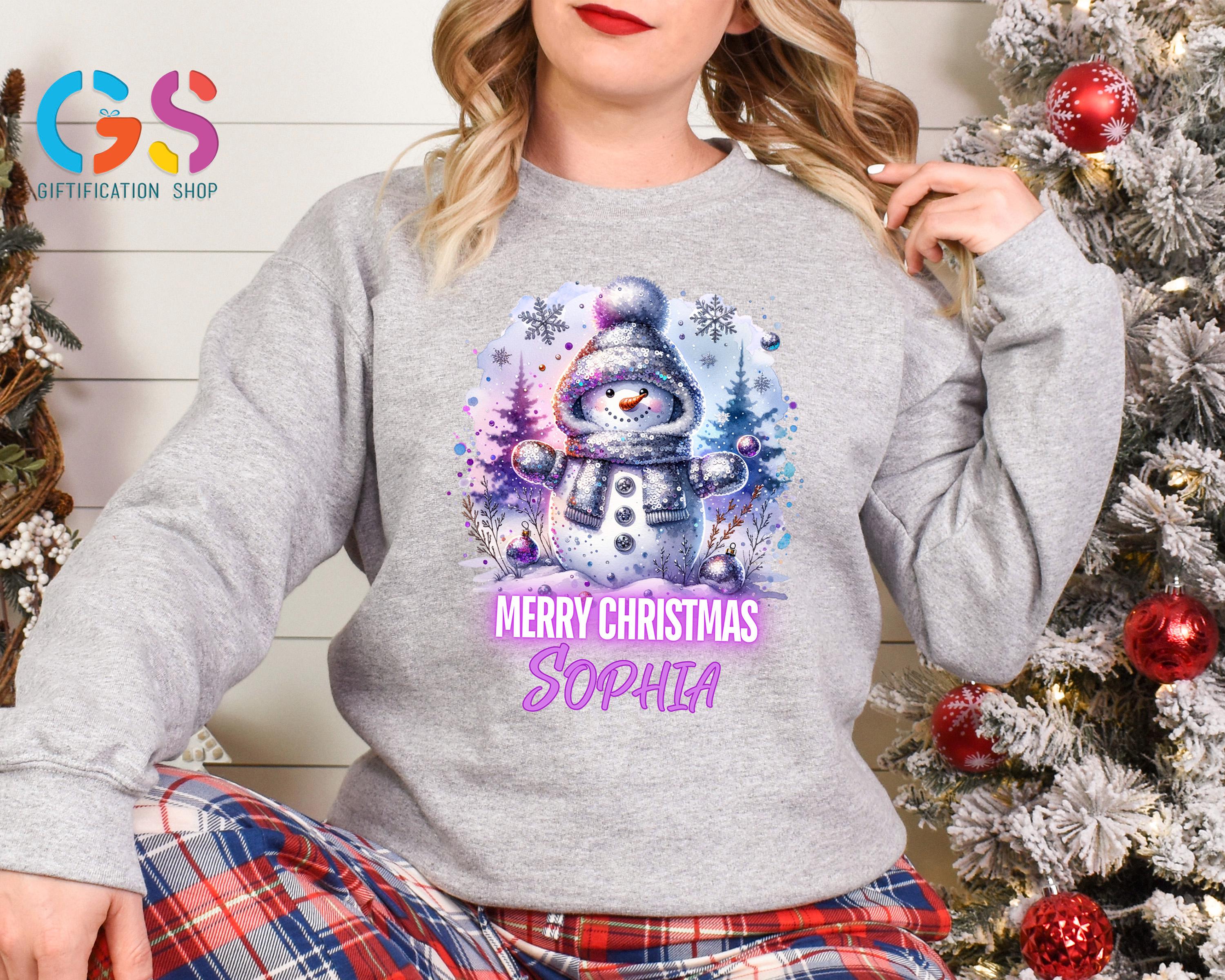 Personalized Merry Christmas Snowman Sweatshirt, Winter Holiday Snowflake Sweater, Custom Name Cozy Woman Clothing