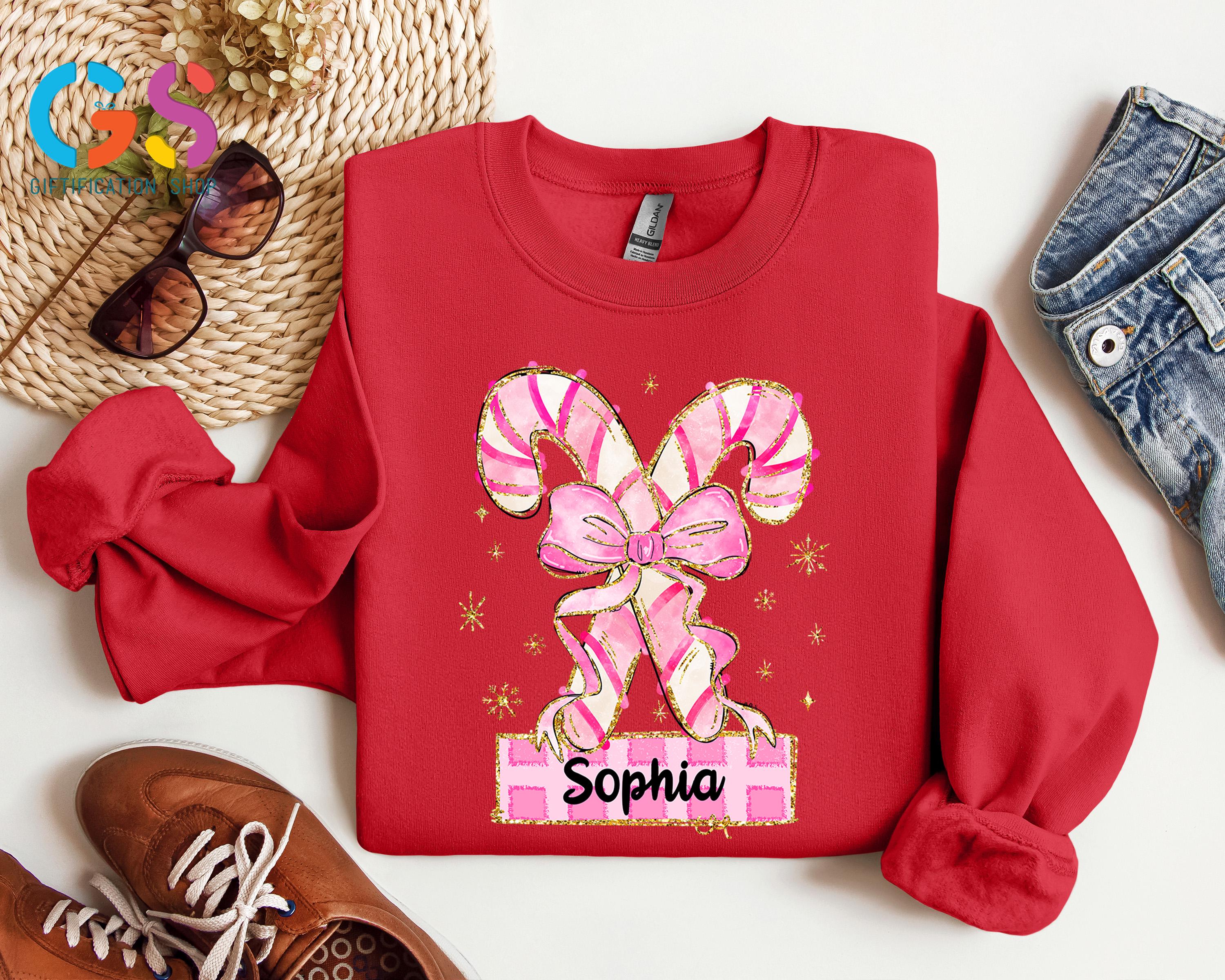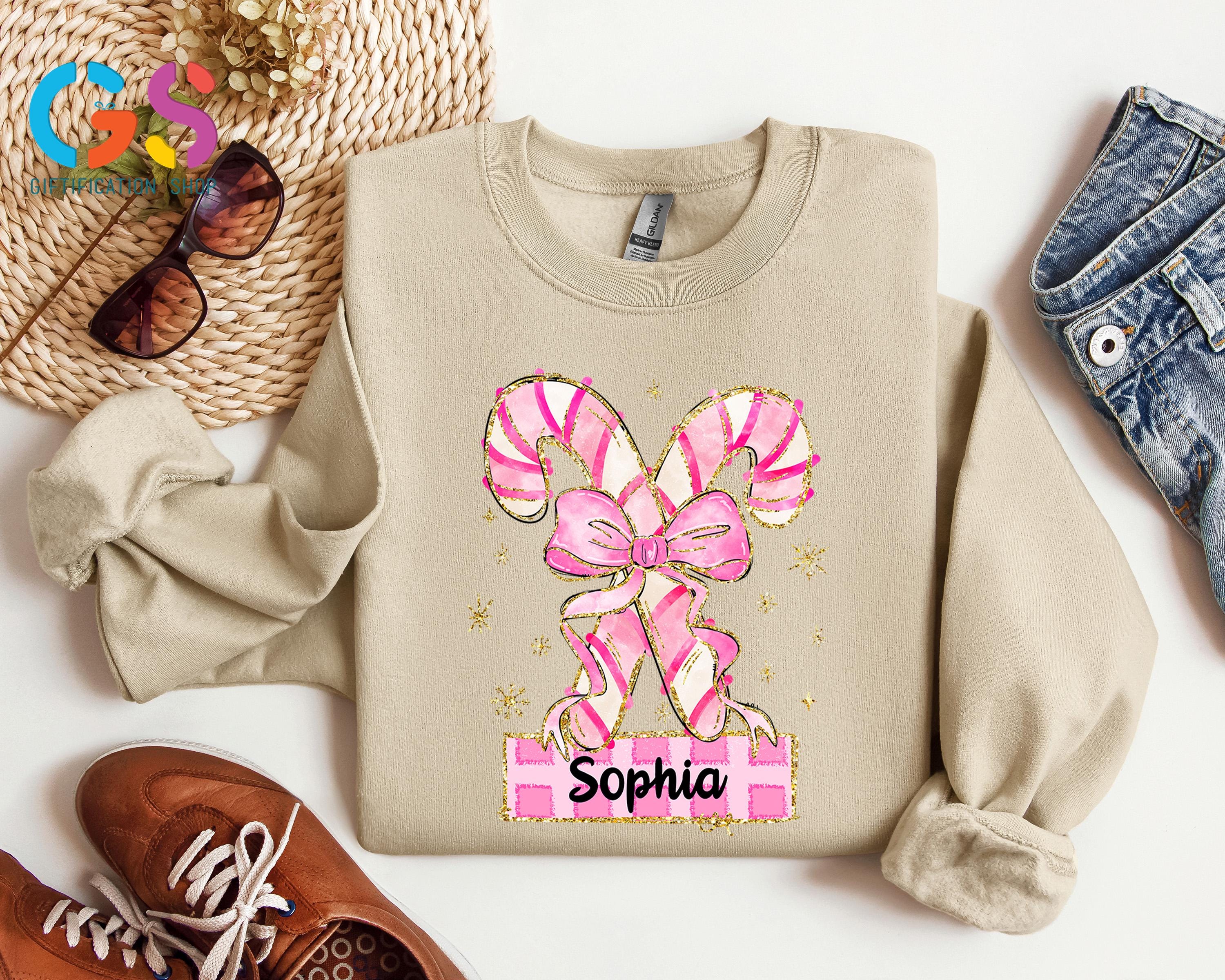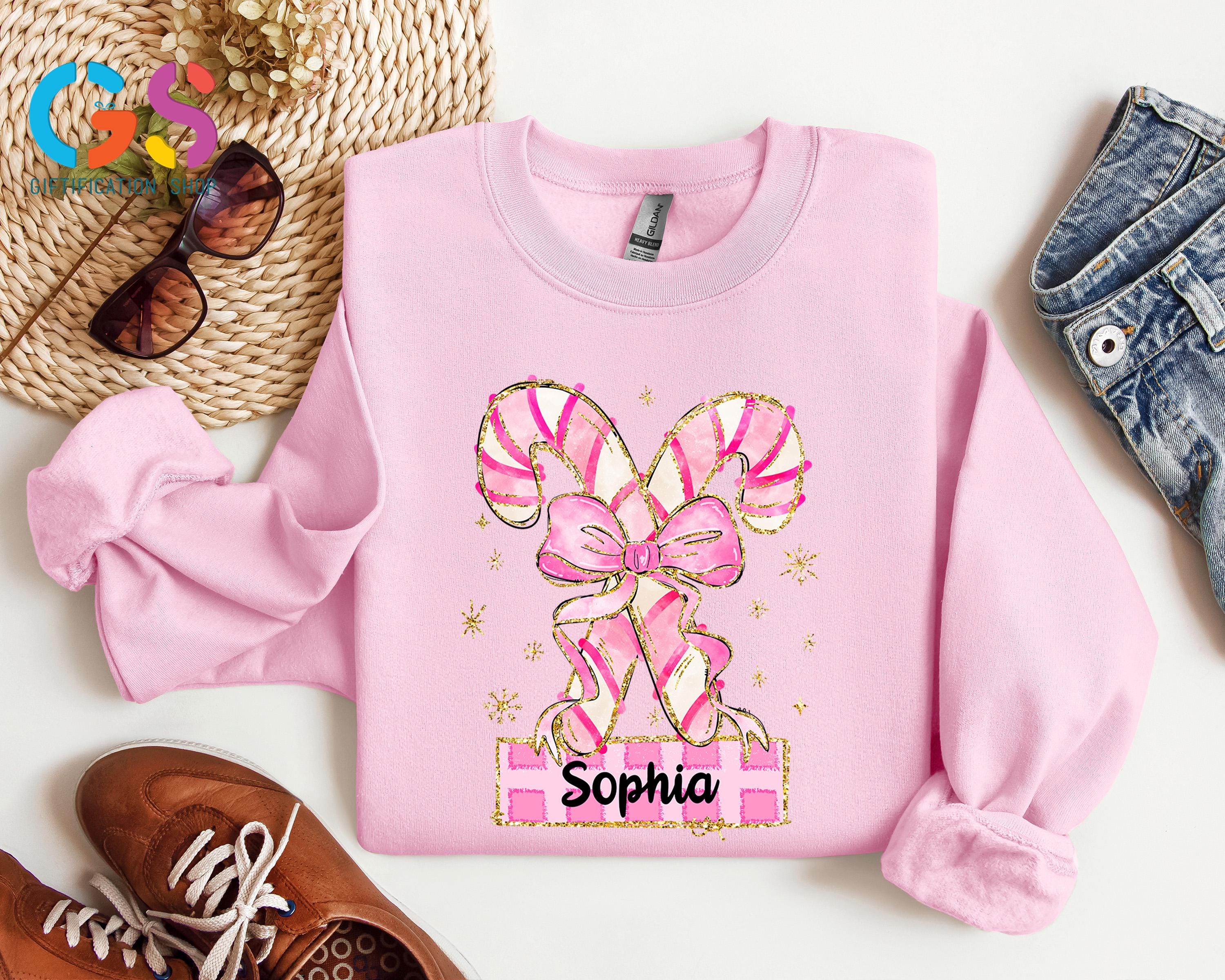 Sweeten up the holiday season with this Custom Name Candy Bow Sweatshirt! Perfect for candy lovers, this adorable Christmas sweatshirt features a fun candy bow design in cheerful pink and white stripes. Ideal for kids and toddlers, this personalized Christmas toddler top can be customized with your little one’s name, making it a unique holiday gift. Whether you're looking for a cute holiday sweater to keep them cozy or a candy sweatshirt for their holiday wardrobe, this soft cozy winter sweater is the perfect fit. The playful design adds just the right amount of festive cheer to your holiday spirit tees collection, and it’s sure to be a hit with candy fans of all ages. A perfect candy lover gift that combines style, warmth, and holiday magic!