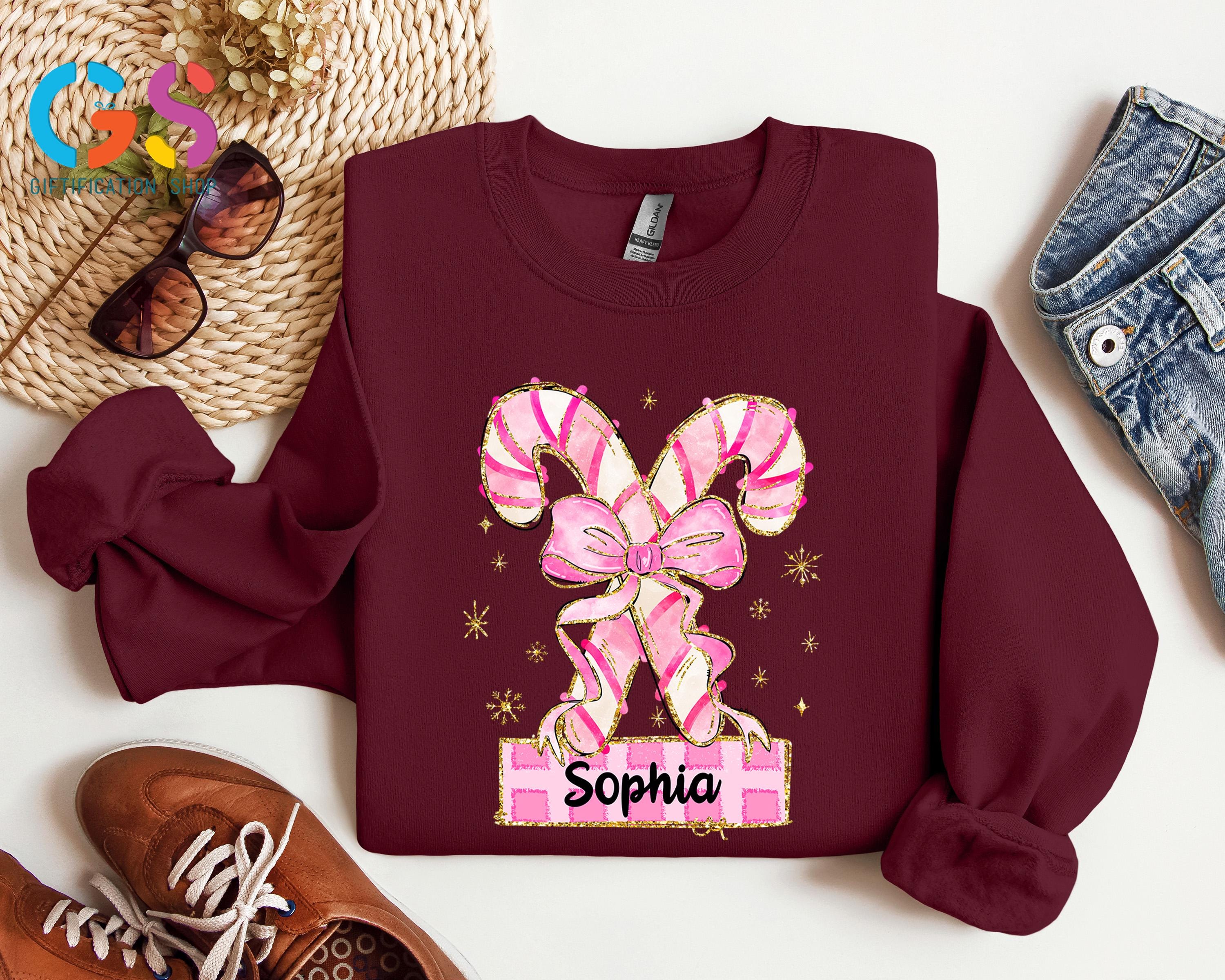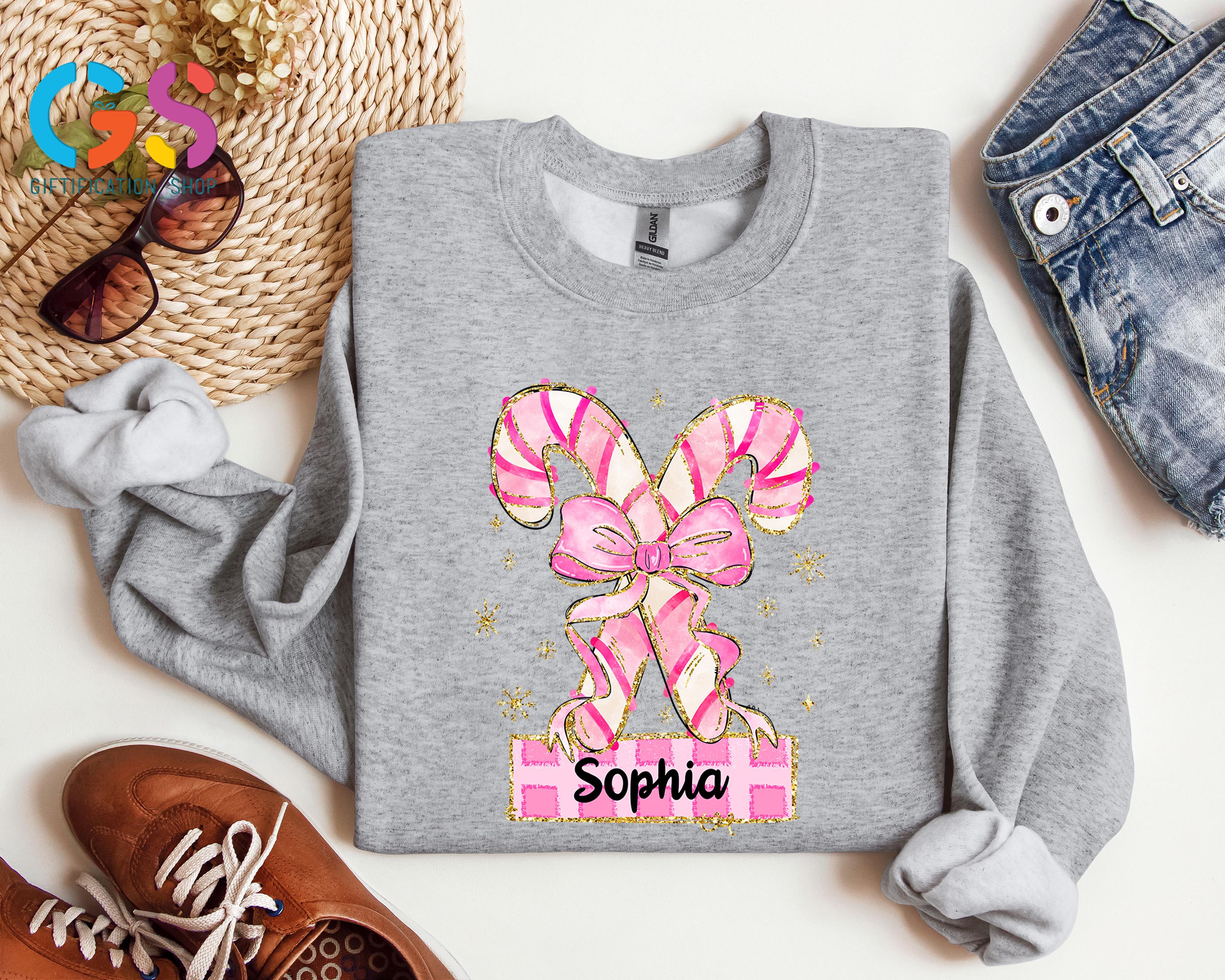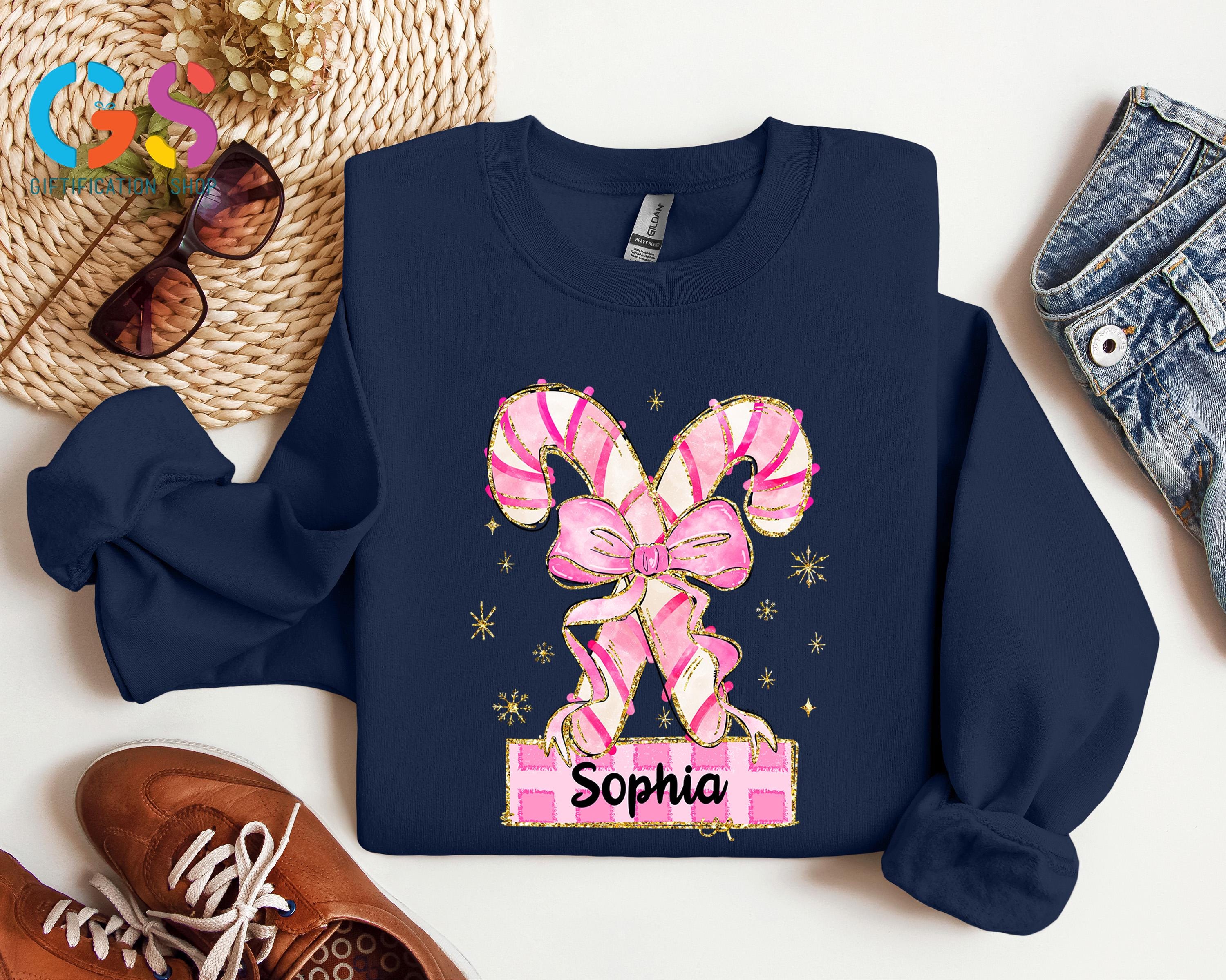 Sweeten up the holiday season with this Custom Name Candy Bow Sweatshirt! Perfect for candy lovers, this adorable Christmas sweatshirt features a fun candy bow design in cheerful pink and white stripes. Ideal for kids and toddlers, this personalized Christmas toddler top can be customized with your little one’s name, making it a unique holiday gift. Whether you're looking for a cute holiday sweater to keep them cozy or a candy sweatshirt for their holiday wardrobe, this soft cozy winter sweater is the perfect fit. The playful design adds just the right amount of festive cheer to your holiday spirit tees collection, and it’s sure to be a hit with candy fans of all ages. A perfect candy lover gift that combines style, warmth, and holiday magic!