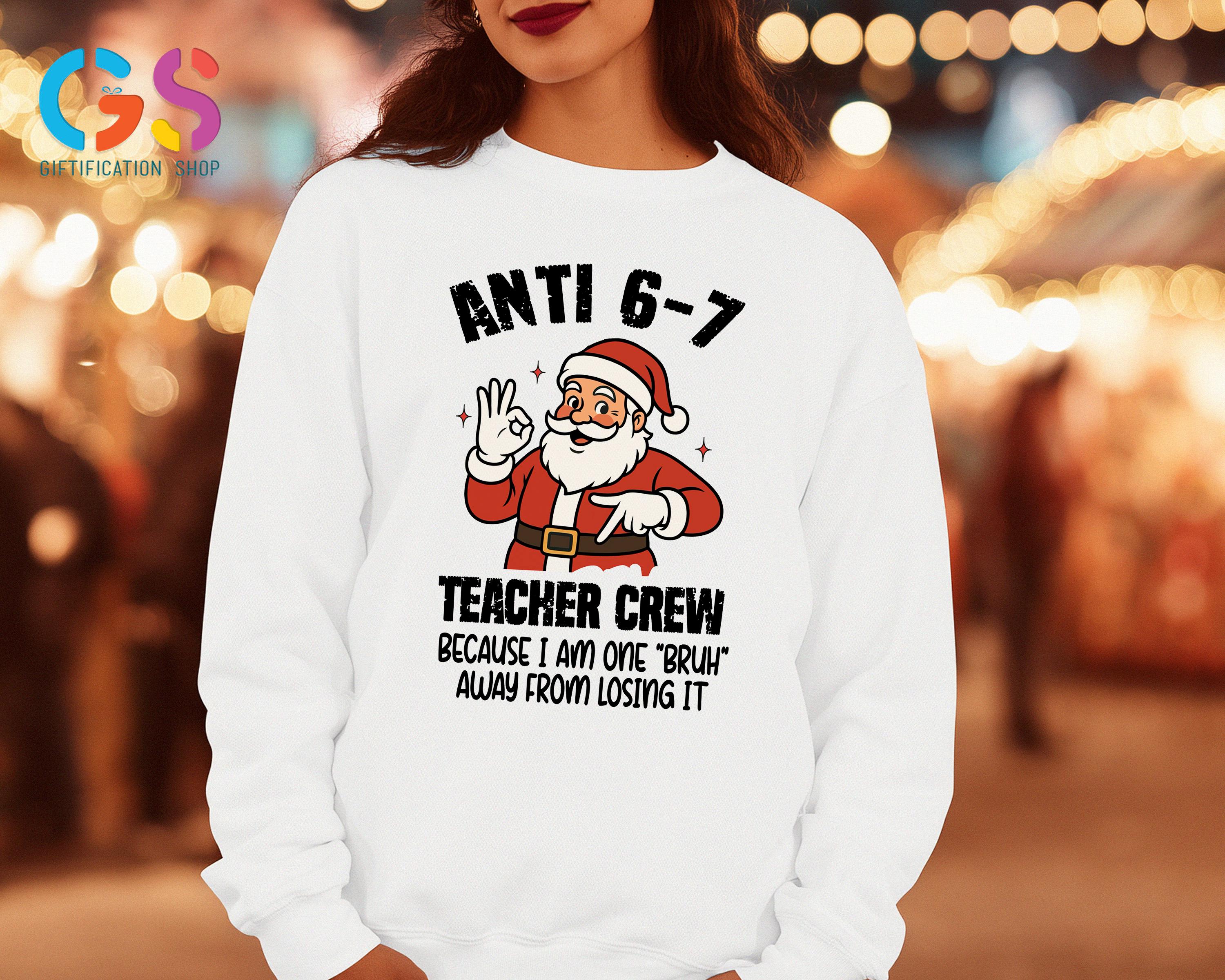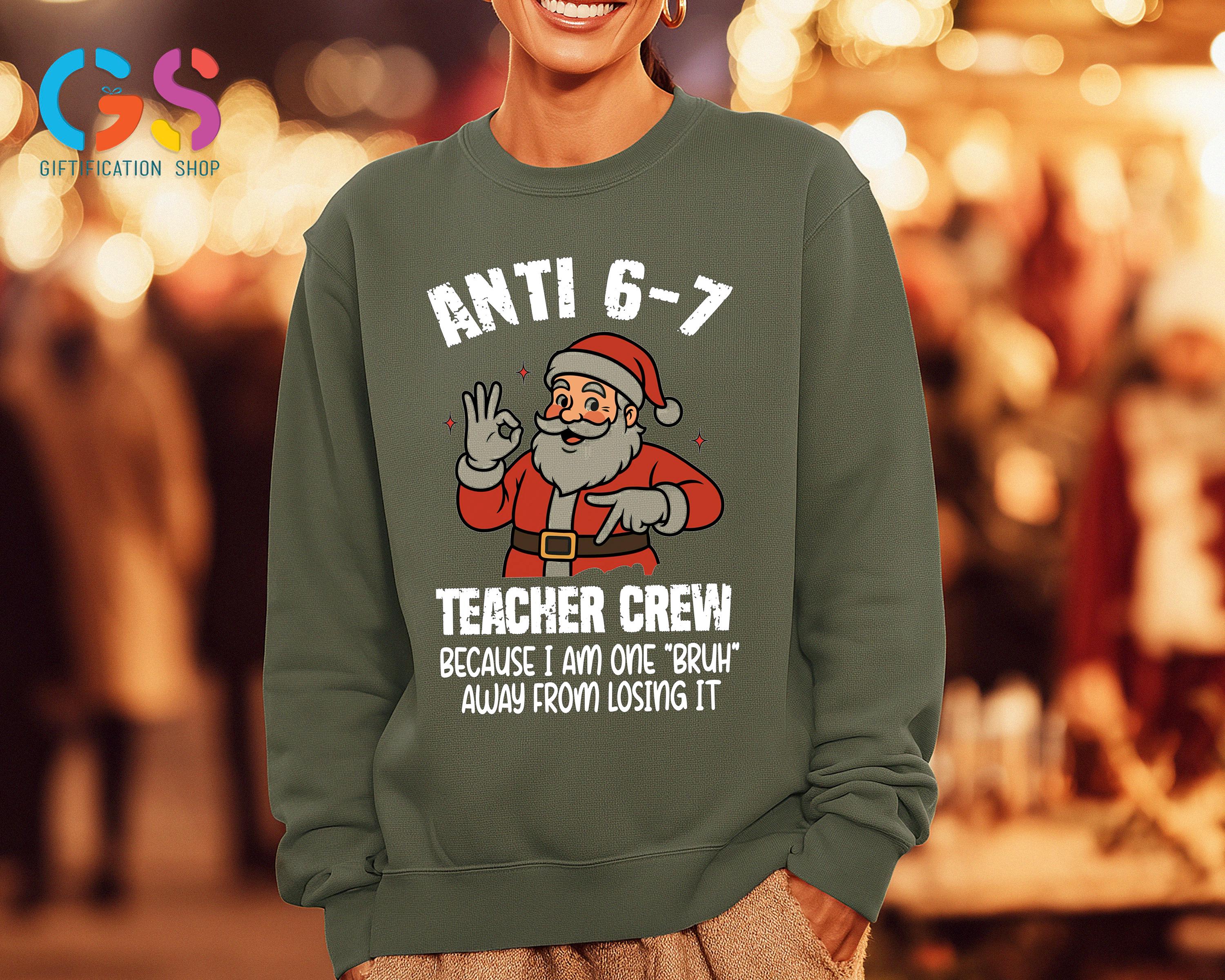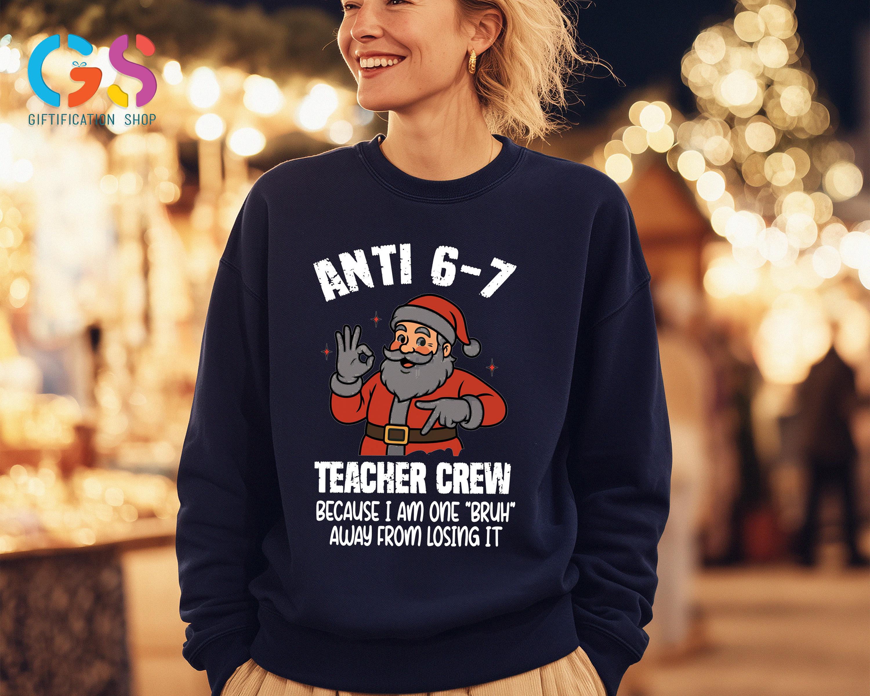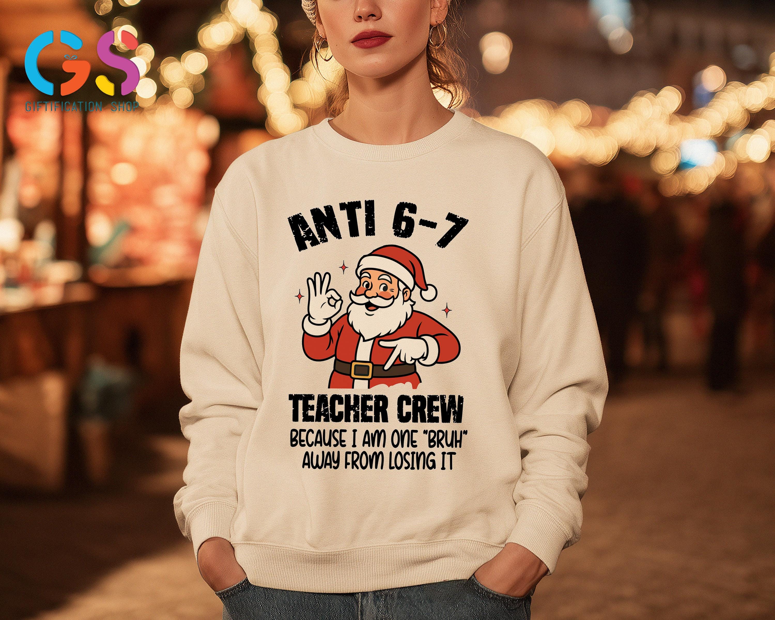 Bring humor to the classroom with this Christmas Santa 67 Teacher Crew Sweatshirt, a playful X-mas 6 7 sweater inspired by the iconic number meme loved by students and teachers alike. Perfect for celebrating the 67th day of school or adding some gen alpha humor to your Christmas apparel, this six seven shirt makes a fun math teacher gift or unique Christmas shirt for any educator. Whether you need a santa shirt for school days, a standout 67 teacher gift, or a cozy xmas shirt that brings smiles, this meme-style design blends Christmas themes, classroom charm, and viral humor into the perfect holiday gift.