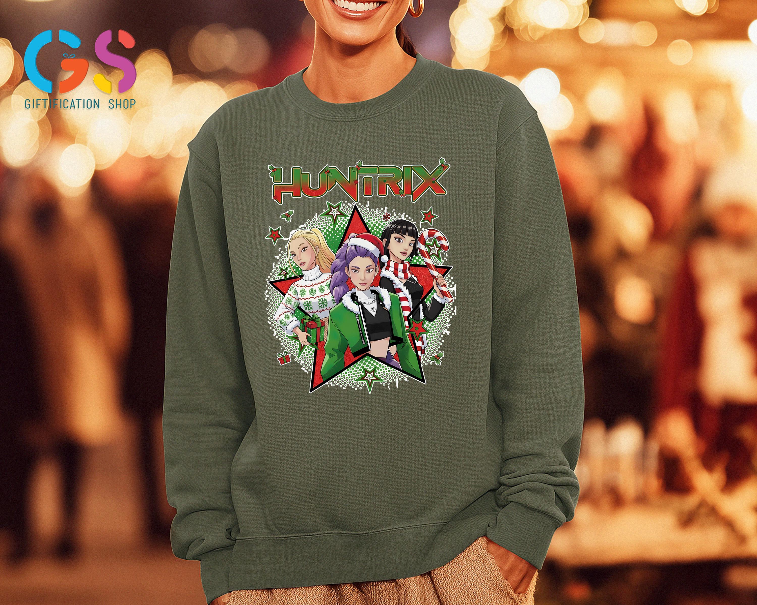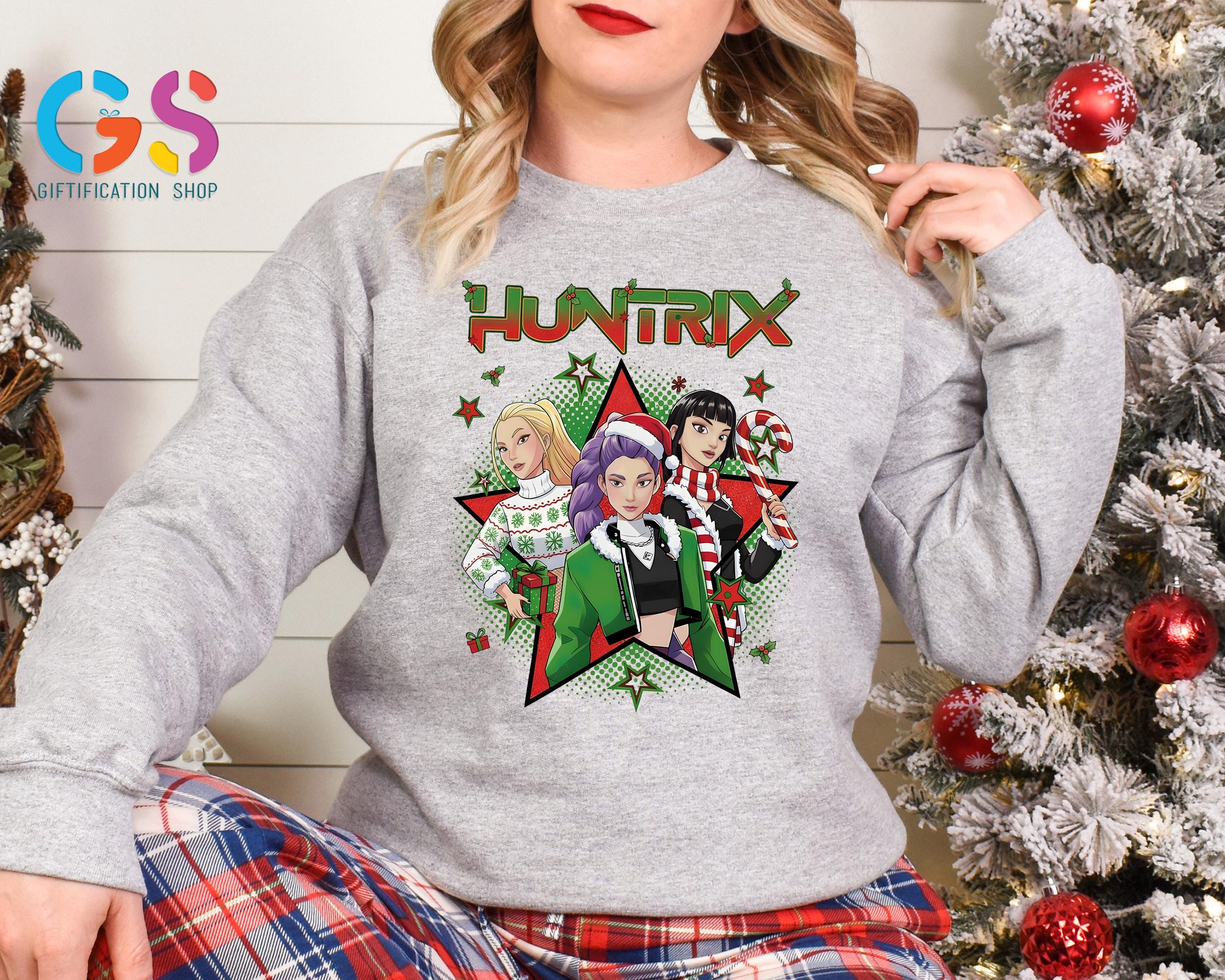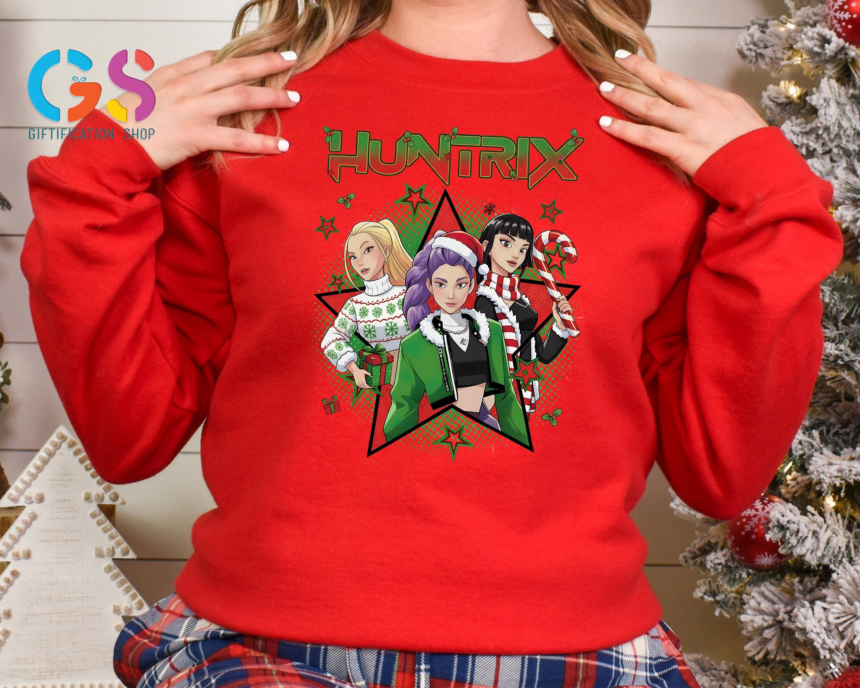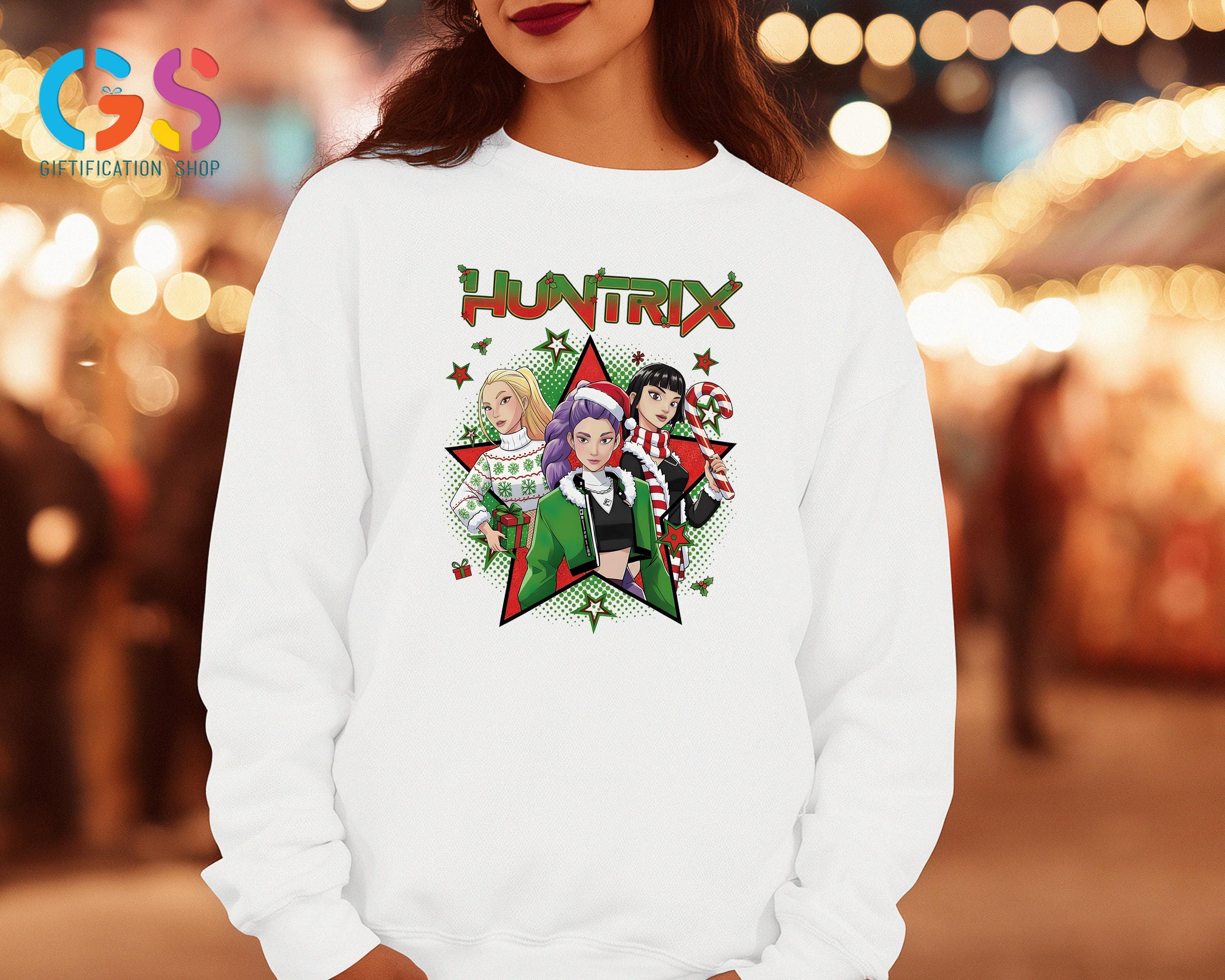 Get into festive fandom mode with this KPDH Huntrix Christmas Sweatshirt, a cozy Merry Xmas gamer sweater inspired by the iconic Korean Pop Demon Hunters universe featuring fan-favorites Rumi, Mira, and Zoey. Designed for lovers of kpop demon hunters, this Huntrix Christmas hoodie blends anime style, gaming vibes, and Korean pop fashion into one eye-catching holiday look. Perfect as a demon hunters tee alternative or comfy huntrix hoodie, it makes a great Christmas gift for any Huntrix girl, gamer, or music-inspired shirt collector. Whether worn as a Christmas sweatshirt, xmas sweatshirt, or everyday gaming sweater, this unique design brings festive cheer and fandom pride together in one bold piece.