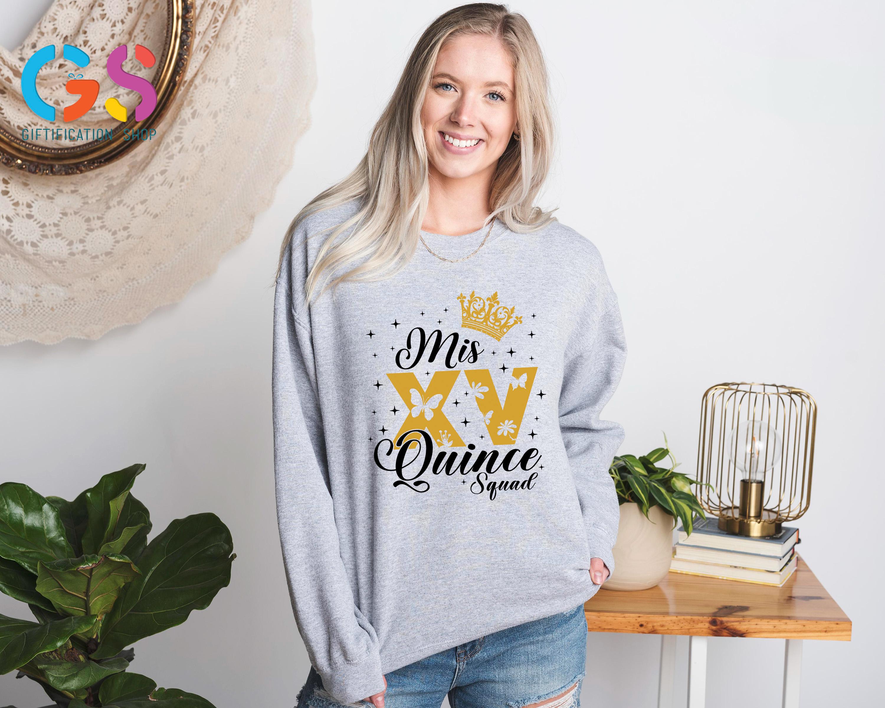 Celebrate her milestone in style with this Mis Quince Princess And Squad Sweatshirt, the perfect 15 birthday squad top for matching party outfits. Designed for the birthday girl, her friends, and family, this cozy sweater makes an adorable matching party shirt for mis 15 años, mis quince años, or any Mexico birthday celebration. Ideal as quince gifts, quince favors, or even paired with a princess dress, it also works beautifully for sweet sixteen themes and sweet 16 gifts. Whether you're hosting a Mexican theme party or preparing for an unforgettable quince fiesta, this fifteen sweatshirt brings comfort, style, and family unity to every moment of her big day.