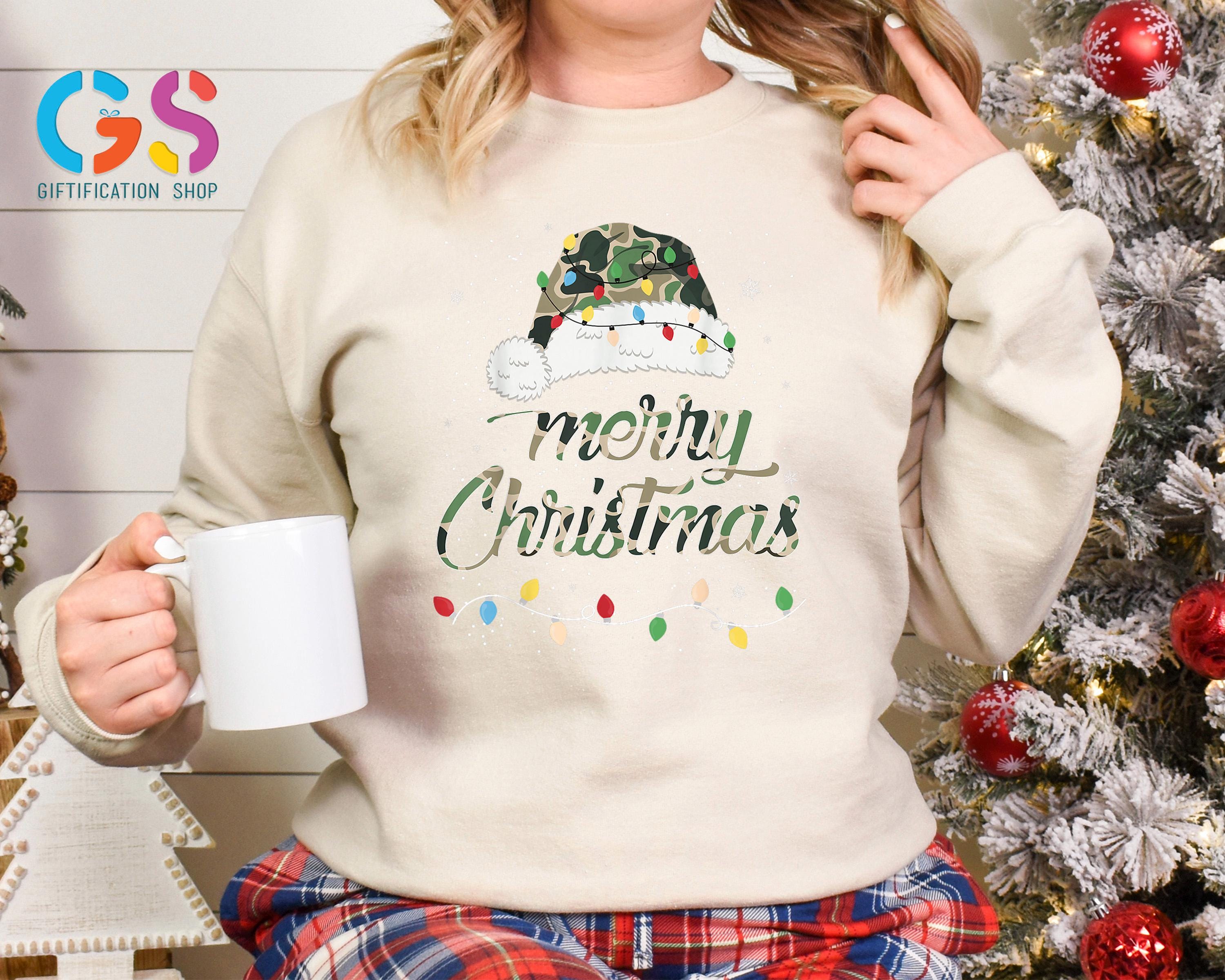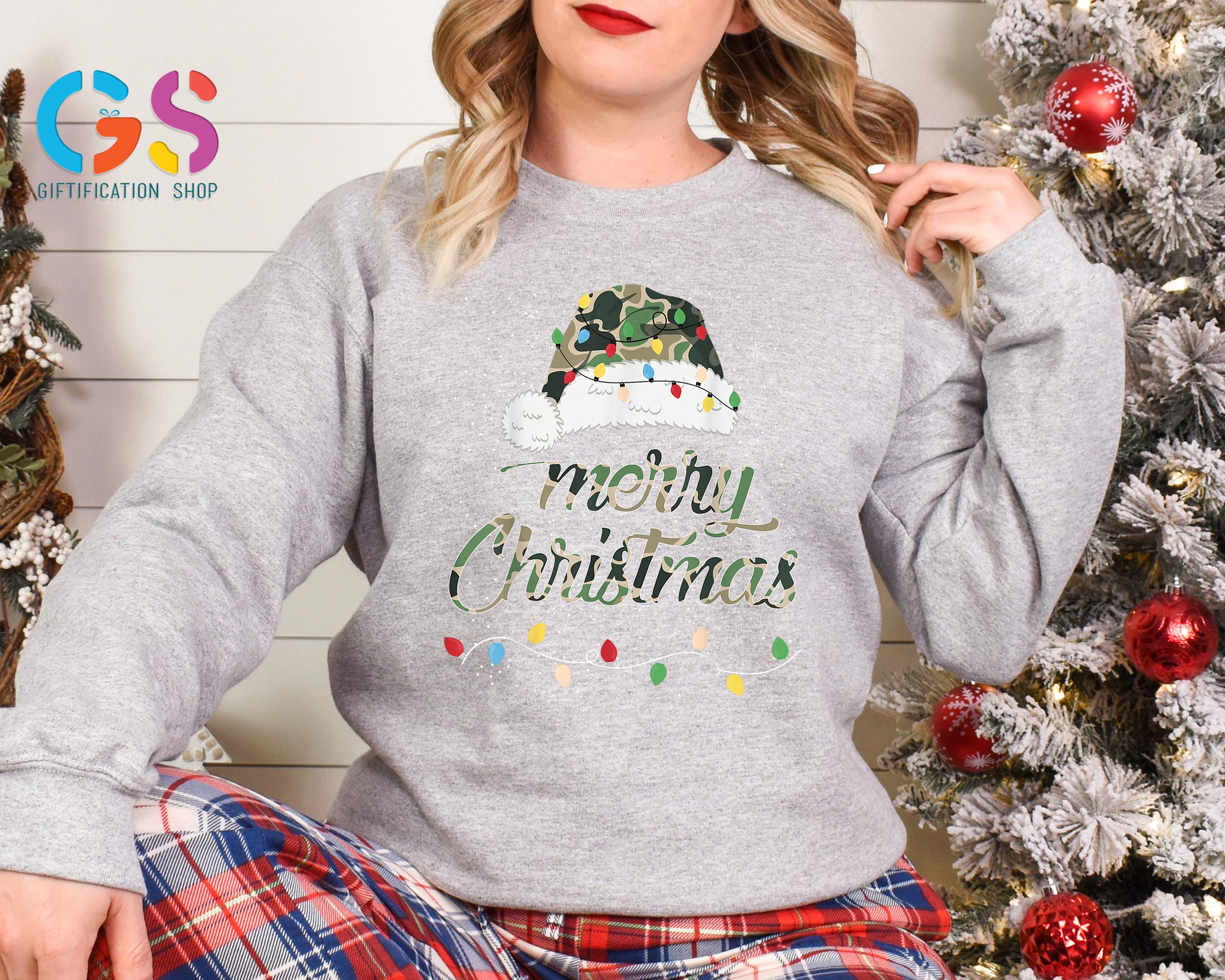 Camo Hat Merry Christmas Sweatshirt, Santa Secret Holiday Sweater, Camouflage Hunting Xmas Hoodie, Hunter Gift