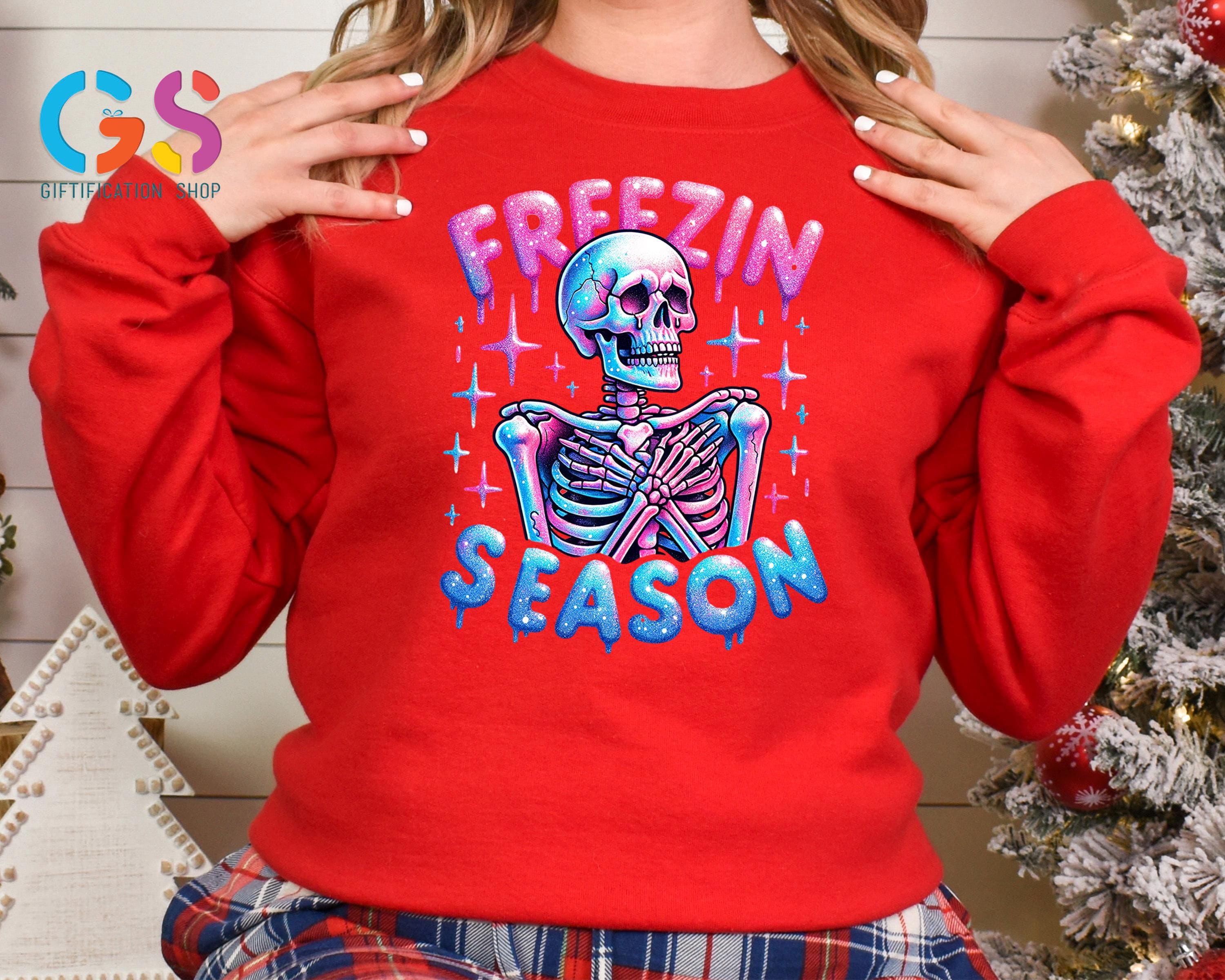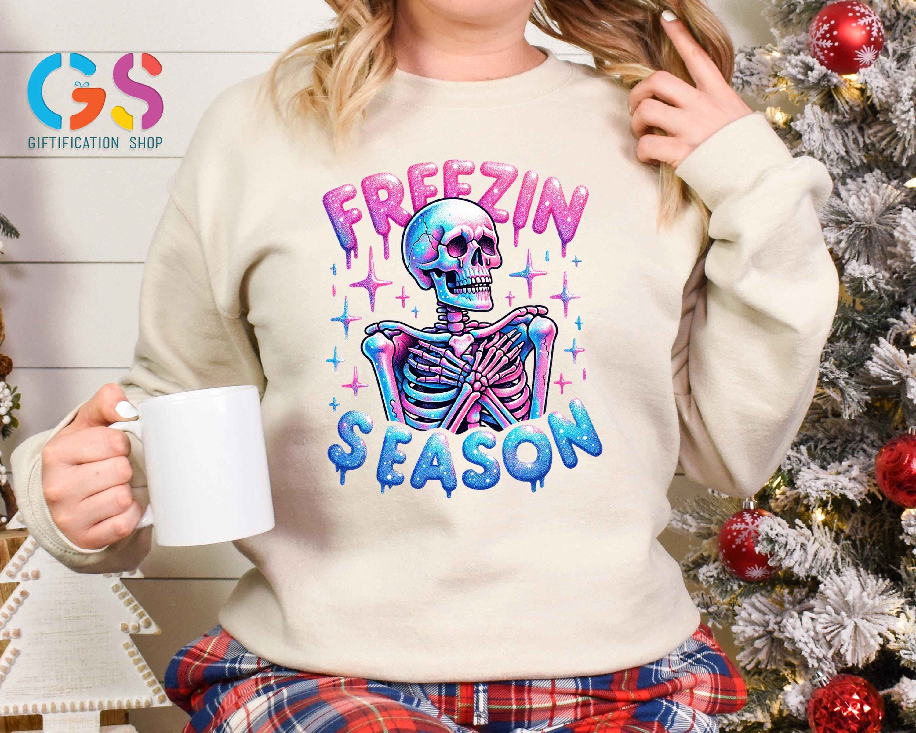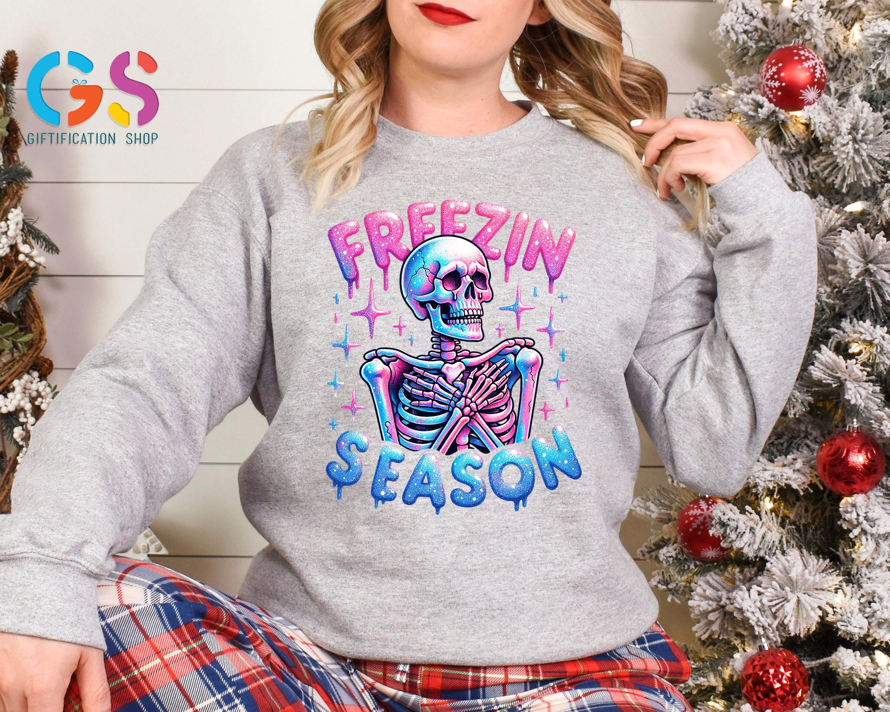Freezin' Season Skeleton Christmas Sweatshirt, Holiday Party Top, Xmas Skull Hoodie, Sarcastic Woman Santa Apparel