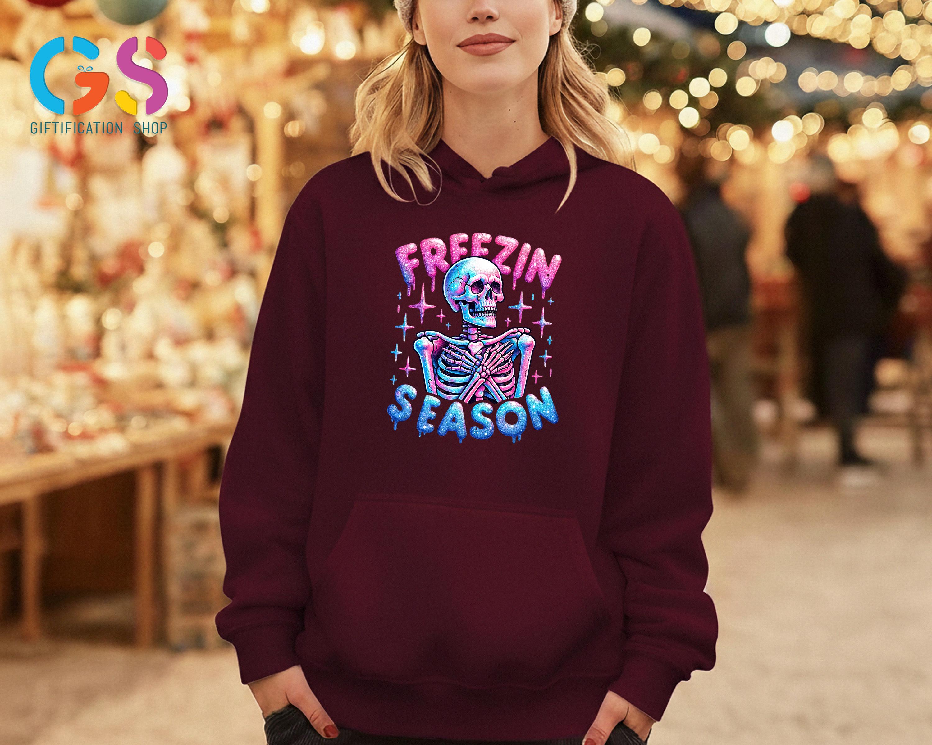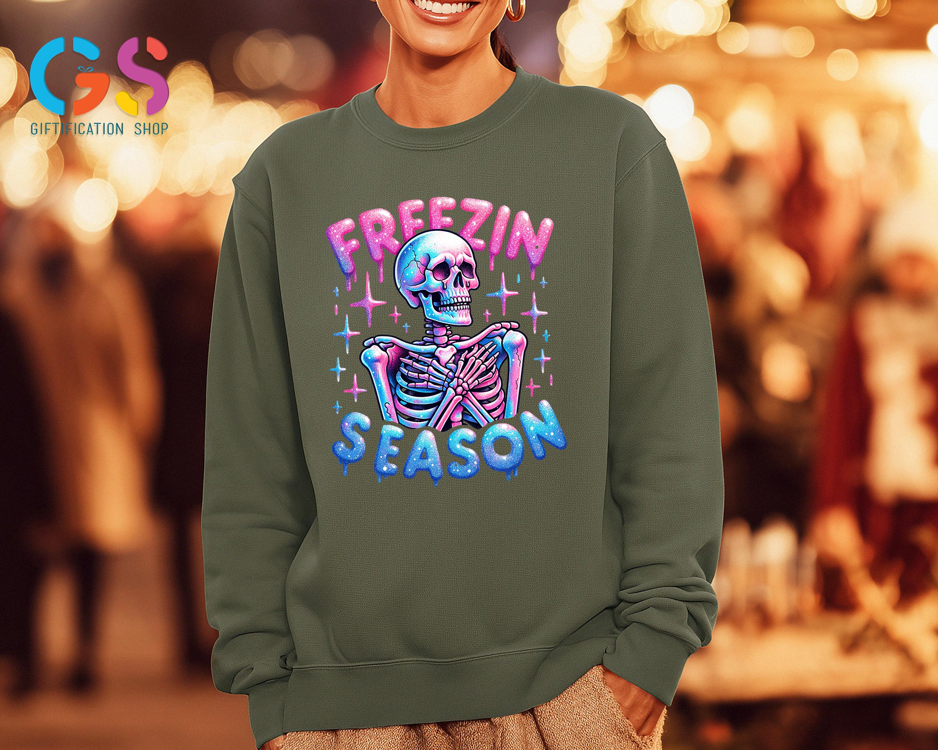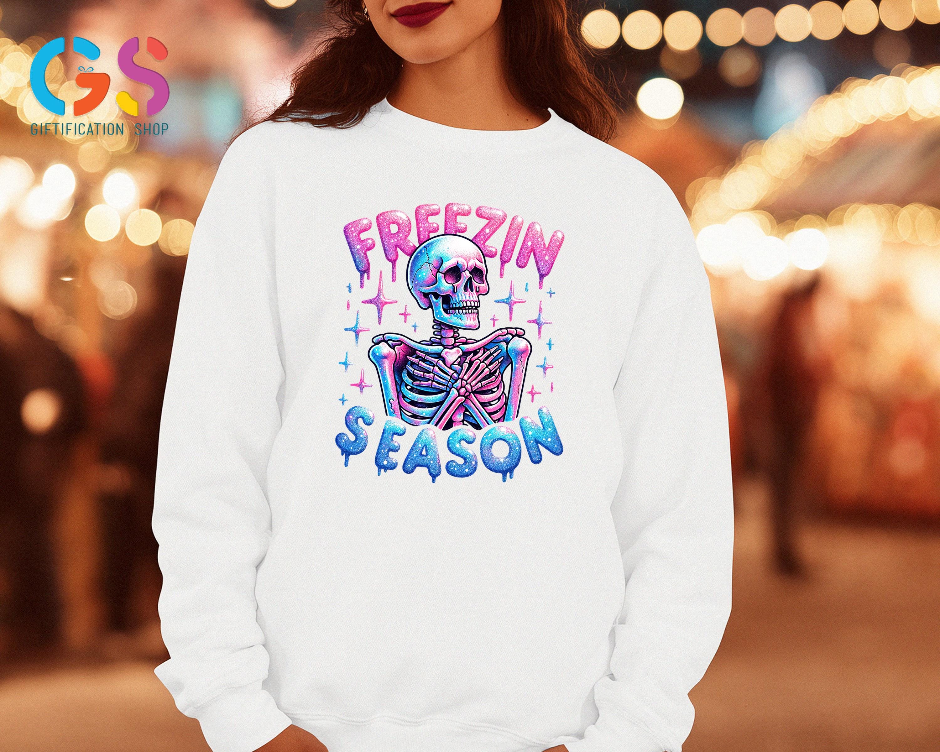 Freezin' Season Skeleton Christmas Sweatshirt, Holiday Party Top, Xmas Skull Hoodie, Sarcastic Woman Santa Apparel