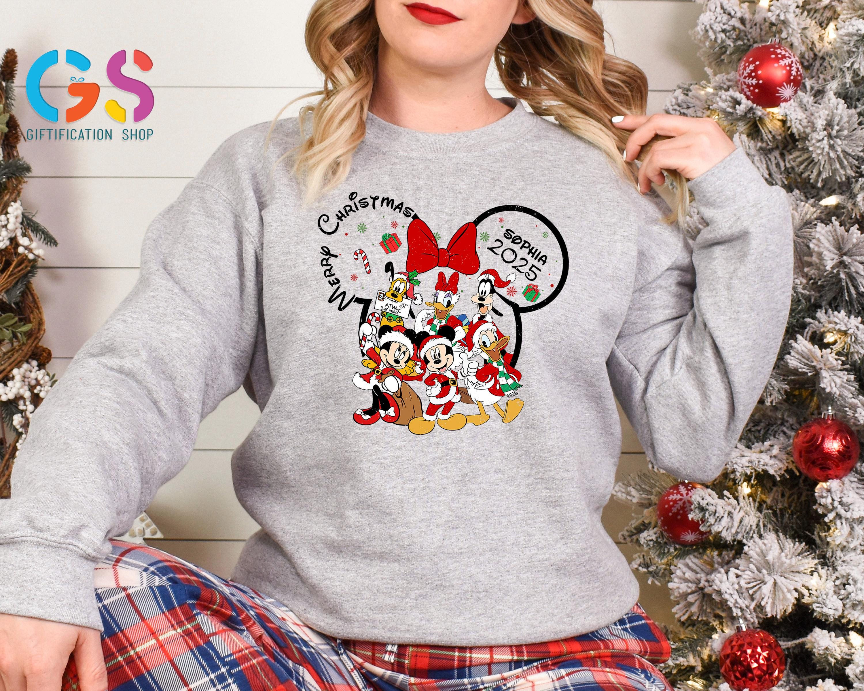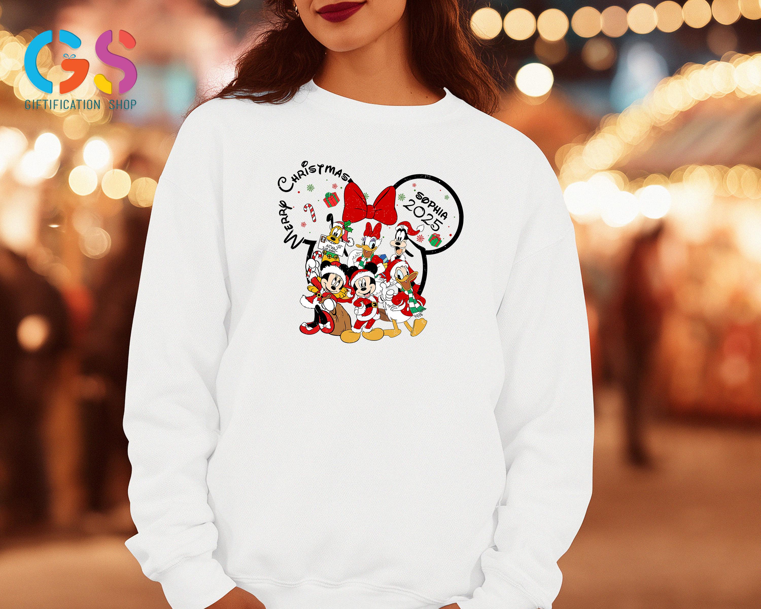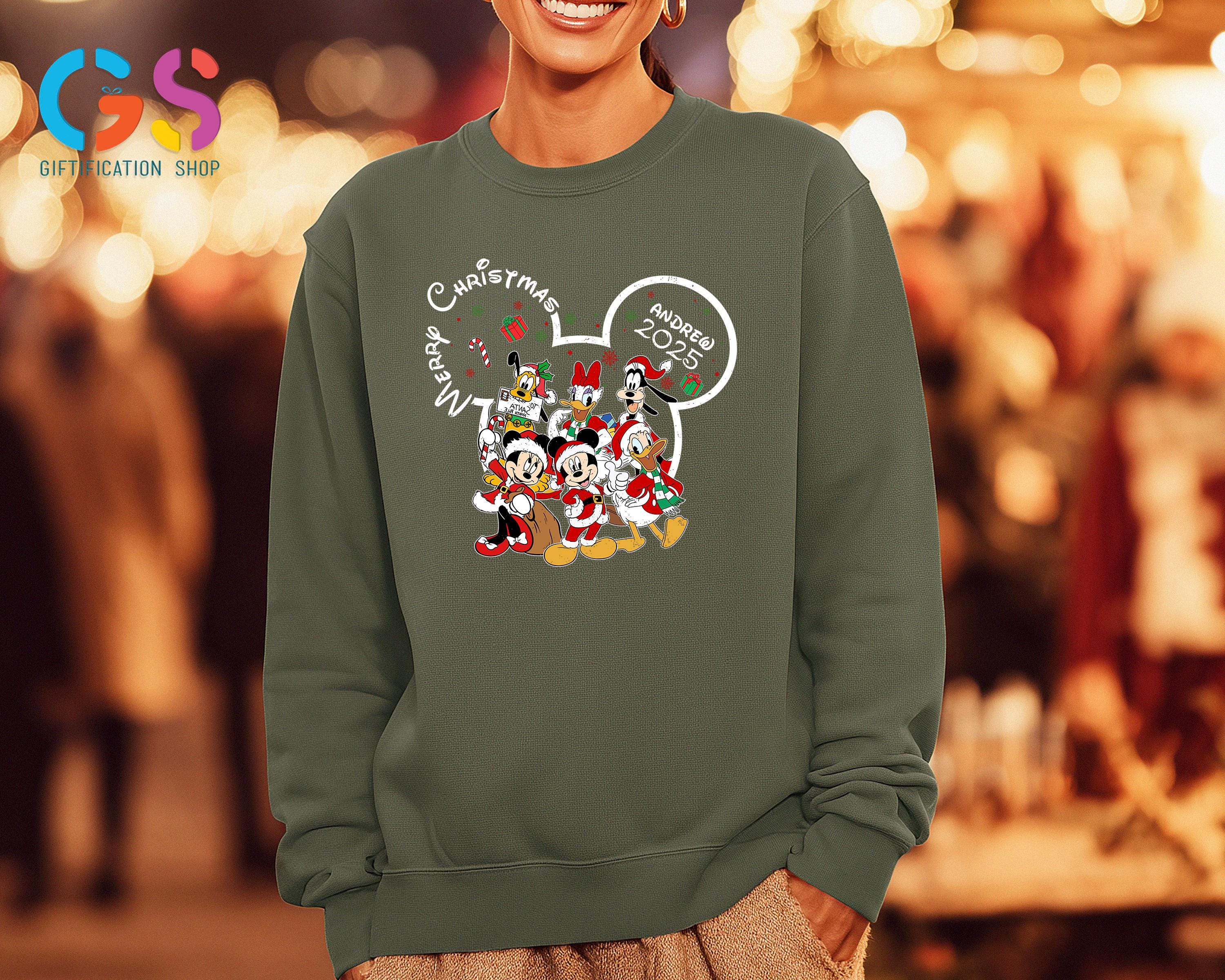 Celebrate the season in style with this Custom Name Mickey and Friends Christmas Sweatshirt, a cozy holiday sweatshirt perfect for family christmas photos, festive trips, or a magical christmas vacation. Featuring beloved Disney characters like Minnie and Mickey, this personalized disney design makes a charming disneyland hoodie, cute disney xmas shirt, and thoughtful disney lover gift. Ideal as a matching sweatshirt for the whole family, this cheerful xmas sweater adds merry Christmas magic to every celebration.