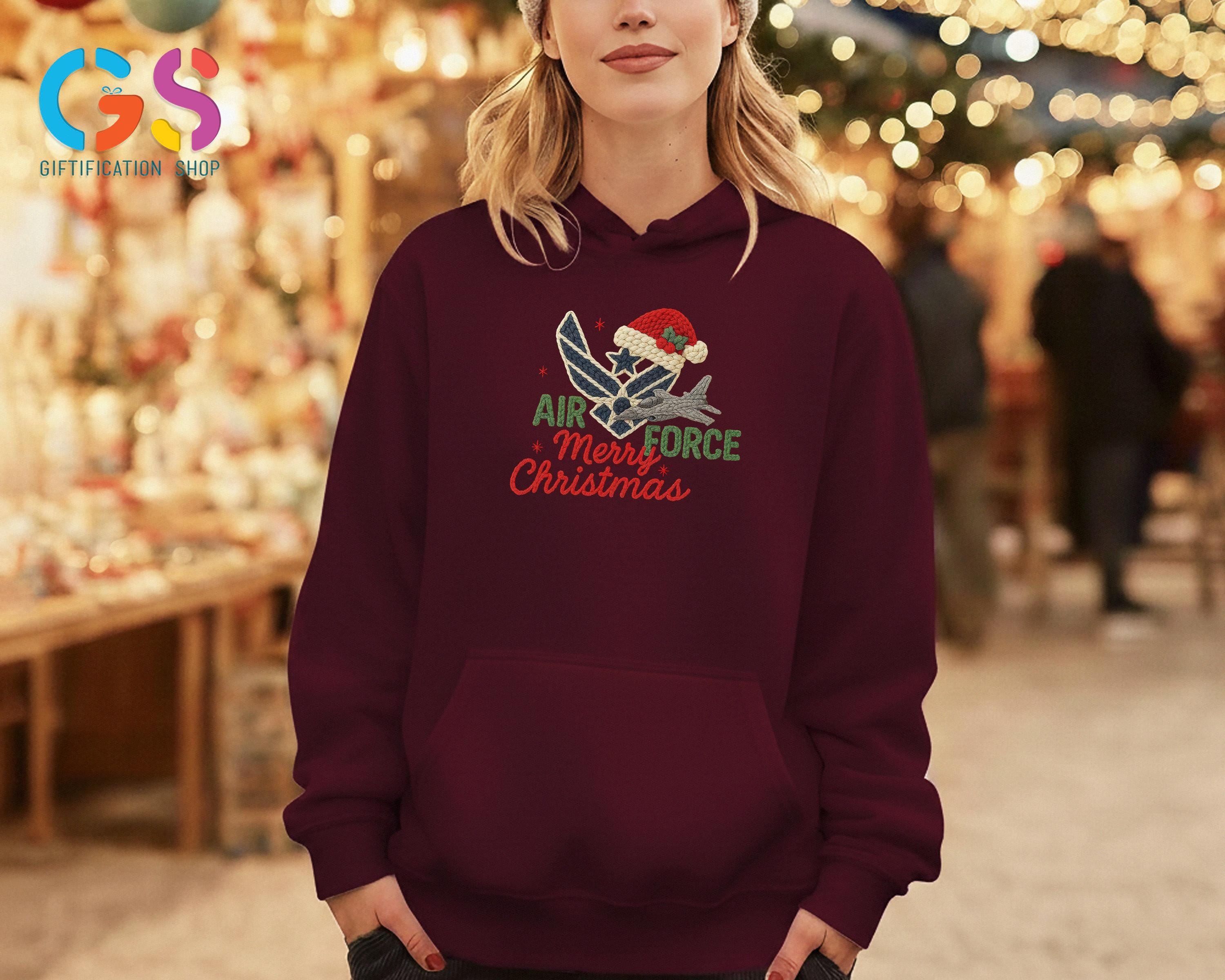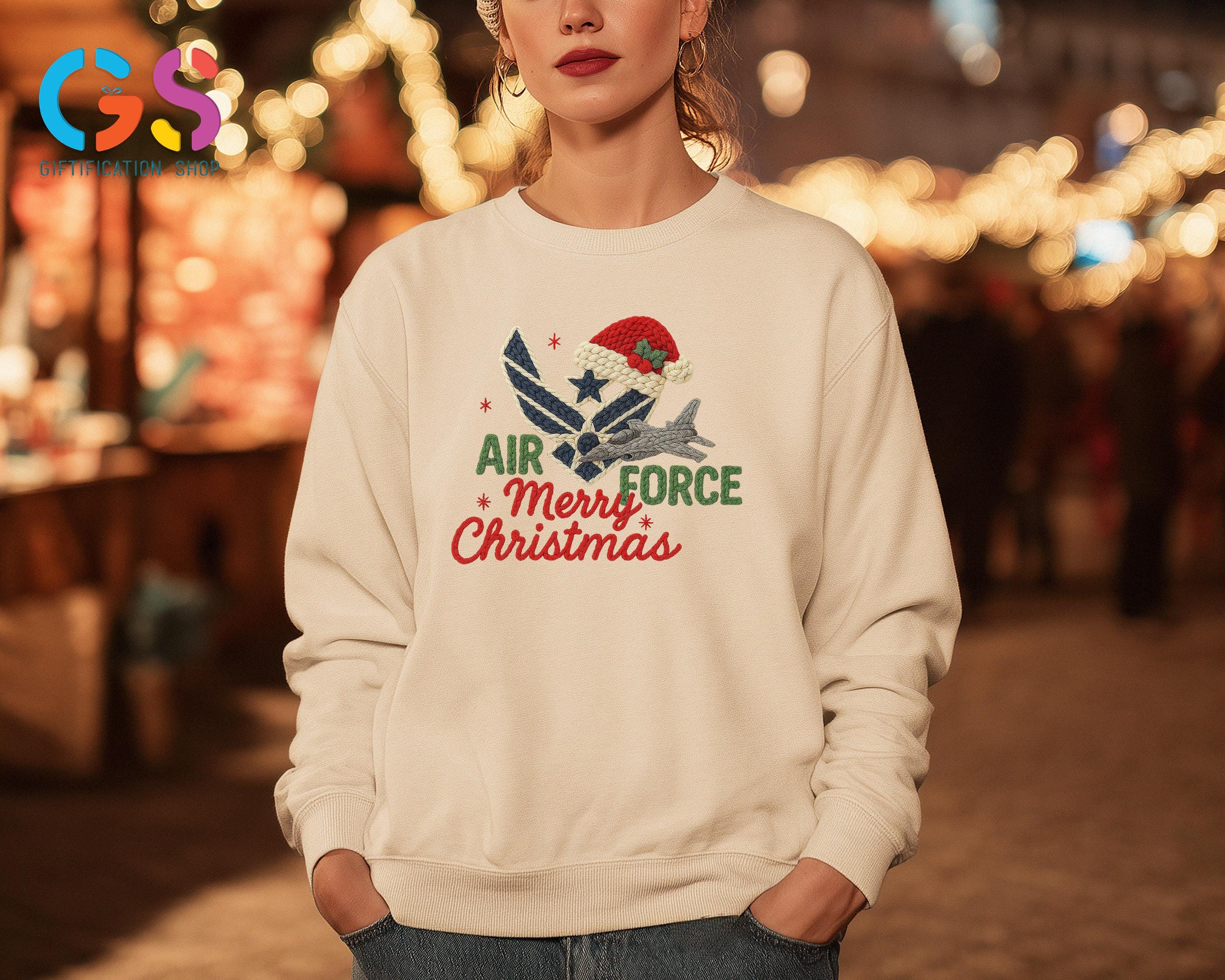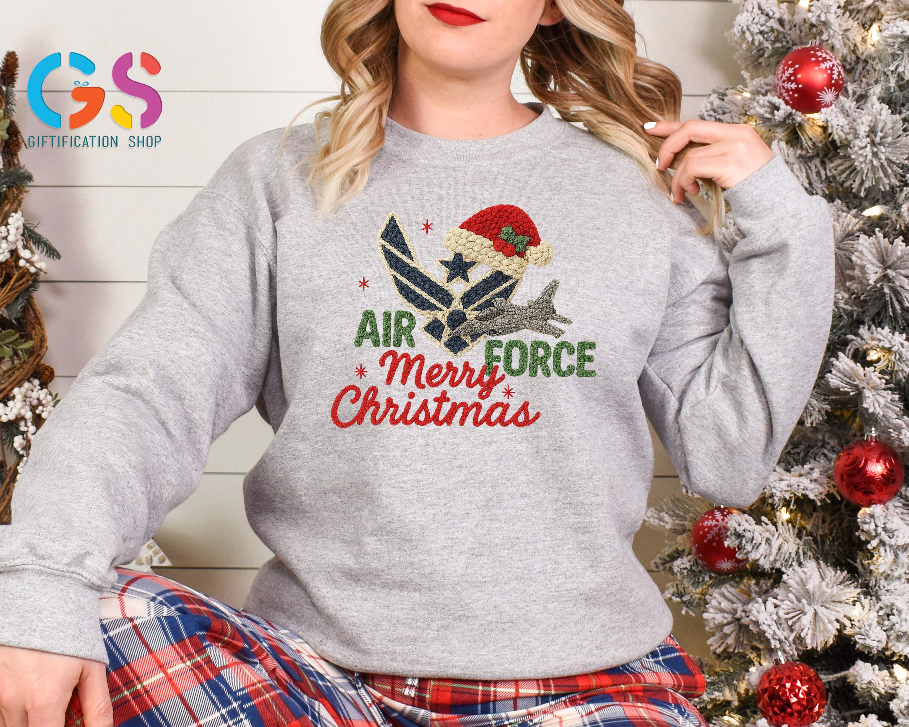 This Air Force Merry Christmas Sweatshirt blends festive cheer with proud military spirit, making it the perfect army sweatshirt or military sweatshirt for holiday celebrations. Designed with patriotic details and cozy seasonal style, it’s a meaningful choice for any US Air Force family—whether you're an airforce wife, airforce mom, or shopping for a thoughtful pilot gift or veterans shirt. This warm patriotic sweater doubles as a comfy xmas sweatshirt or everyday holiday sweatshirt, featuring a fun Christmas Santa twist and classic American flag accents. A great way to say Merry Christmas while honoring service, pride, and family all season long.