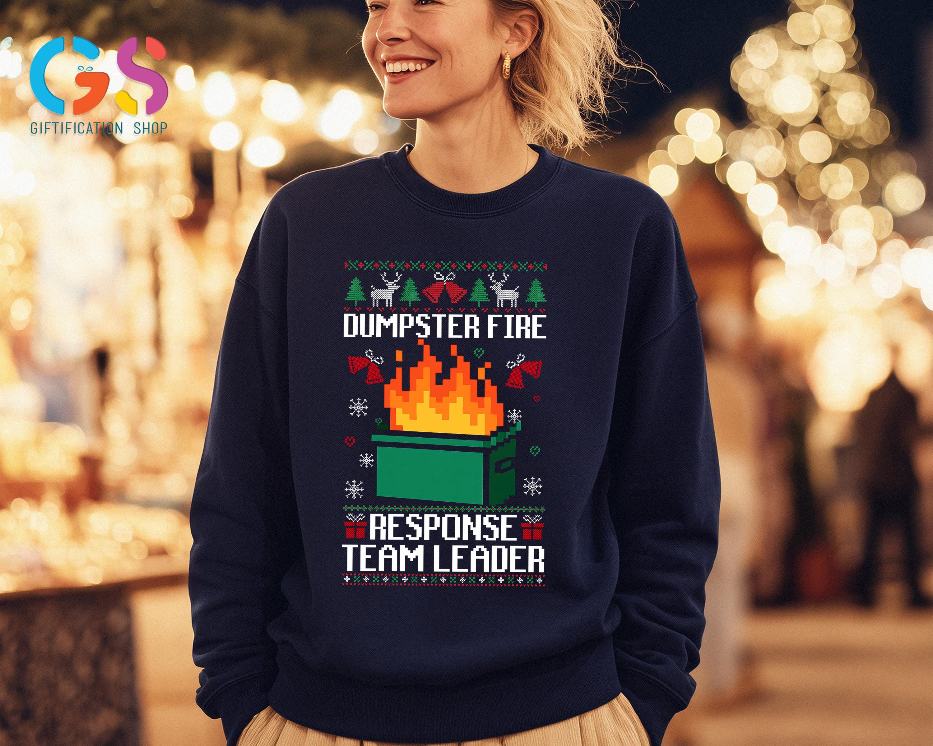 Bring sarcastic holiday spirit to the office with this Dumpster Fire Response Team Leader Sweatshirt, a hilarious ugly Christmas shirt made for the best team ever. Perfect as a colleague gift, coworker gift, or playful leader gift, this funny Christmas sweatshirt is ideal for anyone who laughs through chaos—whether they work in an office, retail, support, or as a first responder to everyday disasters. A great choice for a secret santa gift, this cheeky funny office gift celebrates teamwork with snark and style, making it perfect for anyone who knows every workplace has its own dumpster fire. A witty holiday sweater for anyone who handles the flames like a pro!
