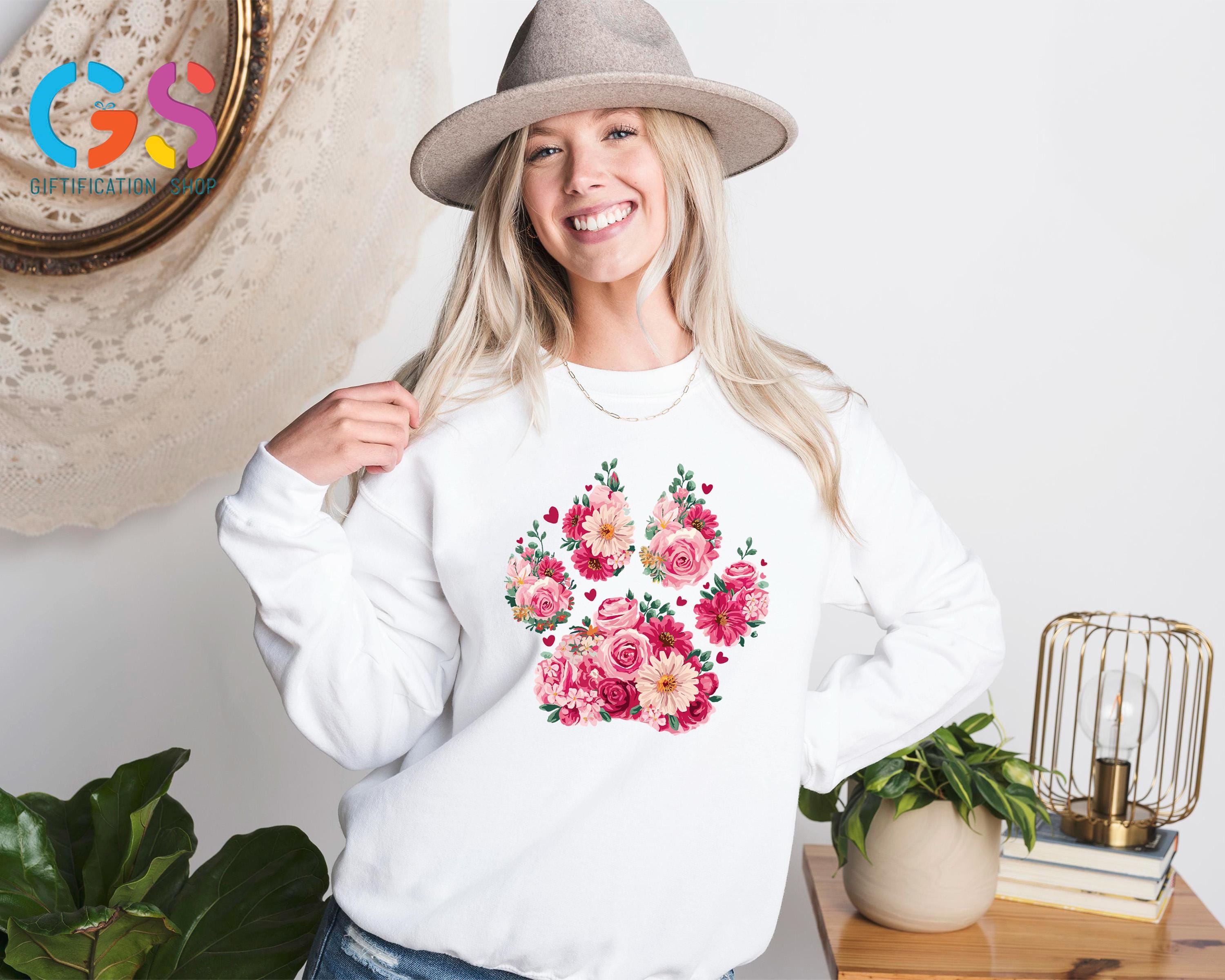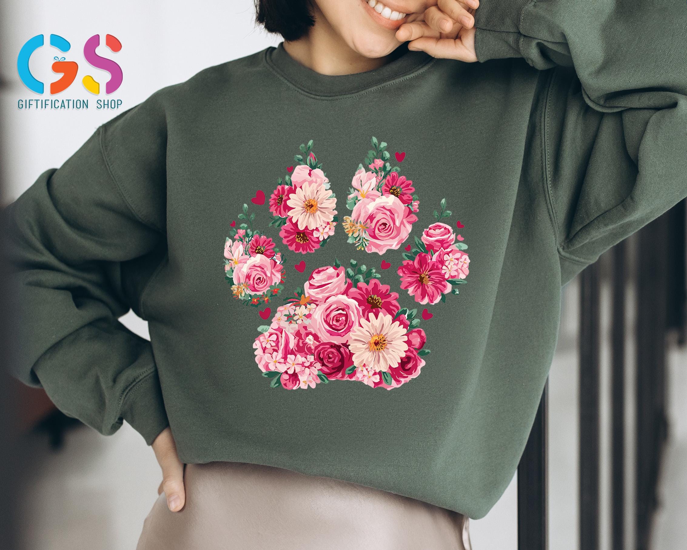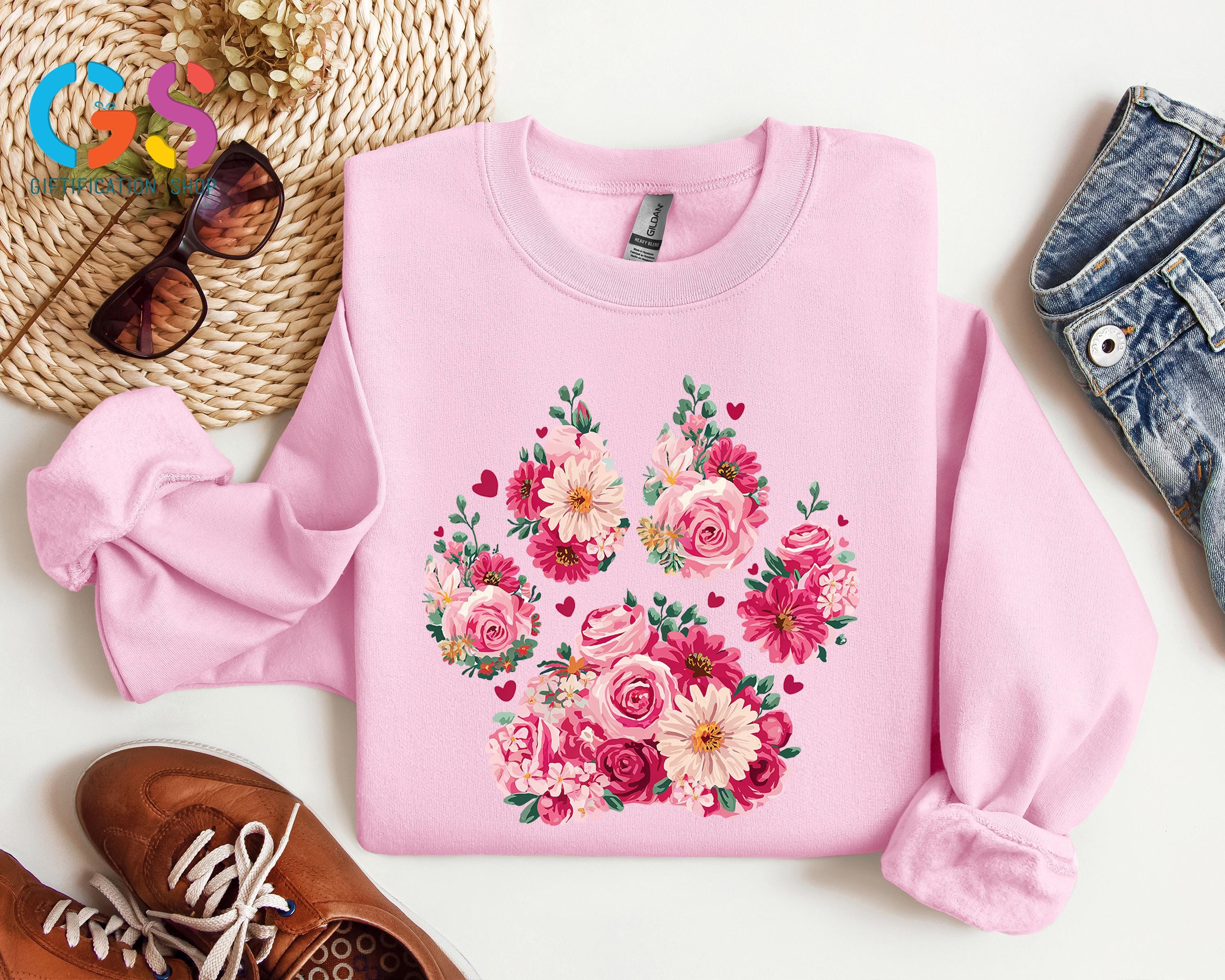 Floral Dog Paw Sweatshirt, Pet Owner Mom Gift, Animal Lover Sweater, Veterinarian Clothing, Boho Pink Puppy Apparel