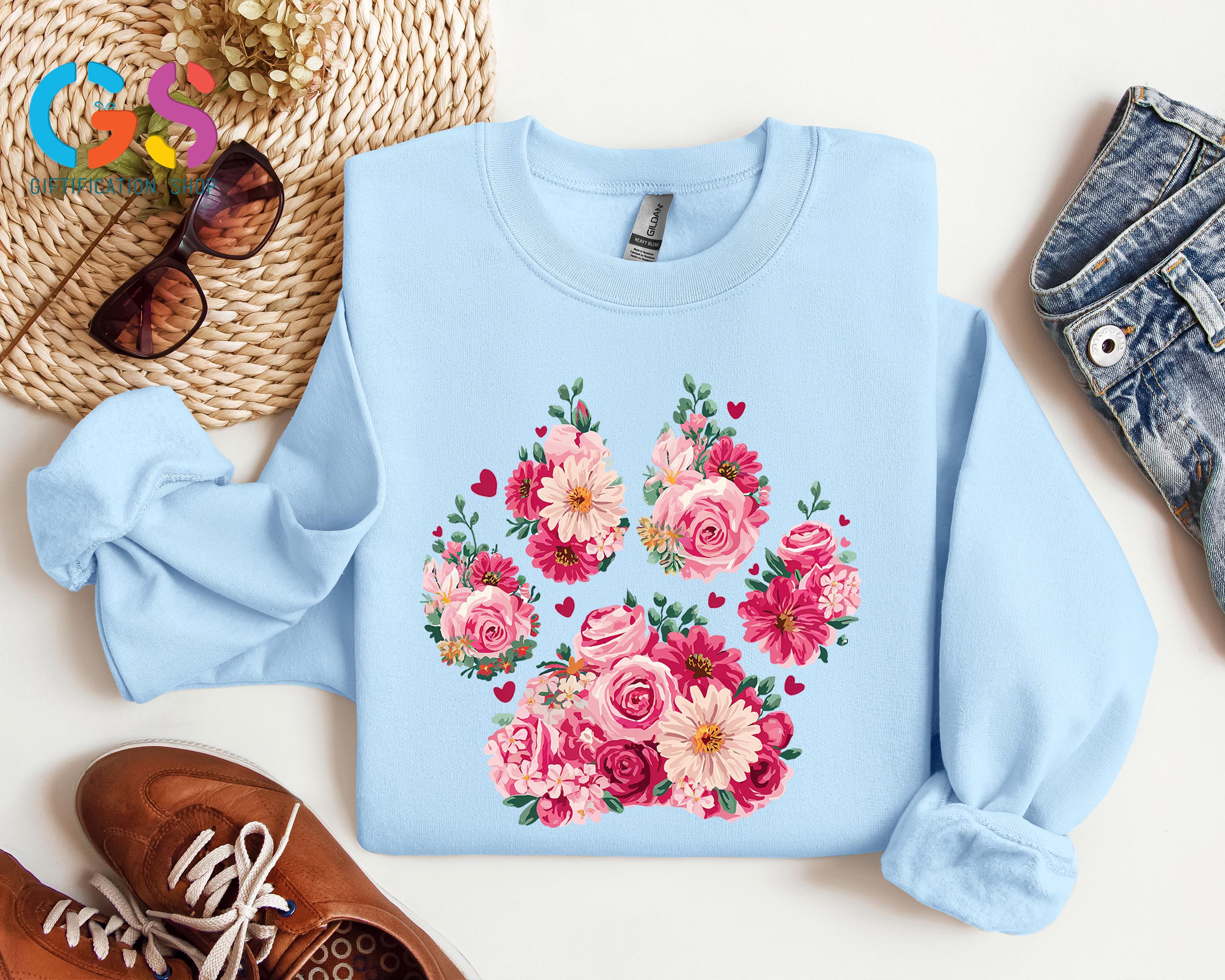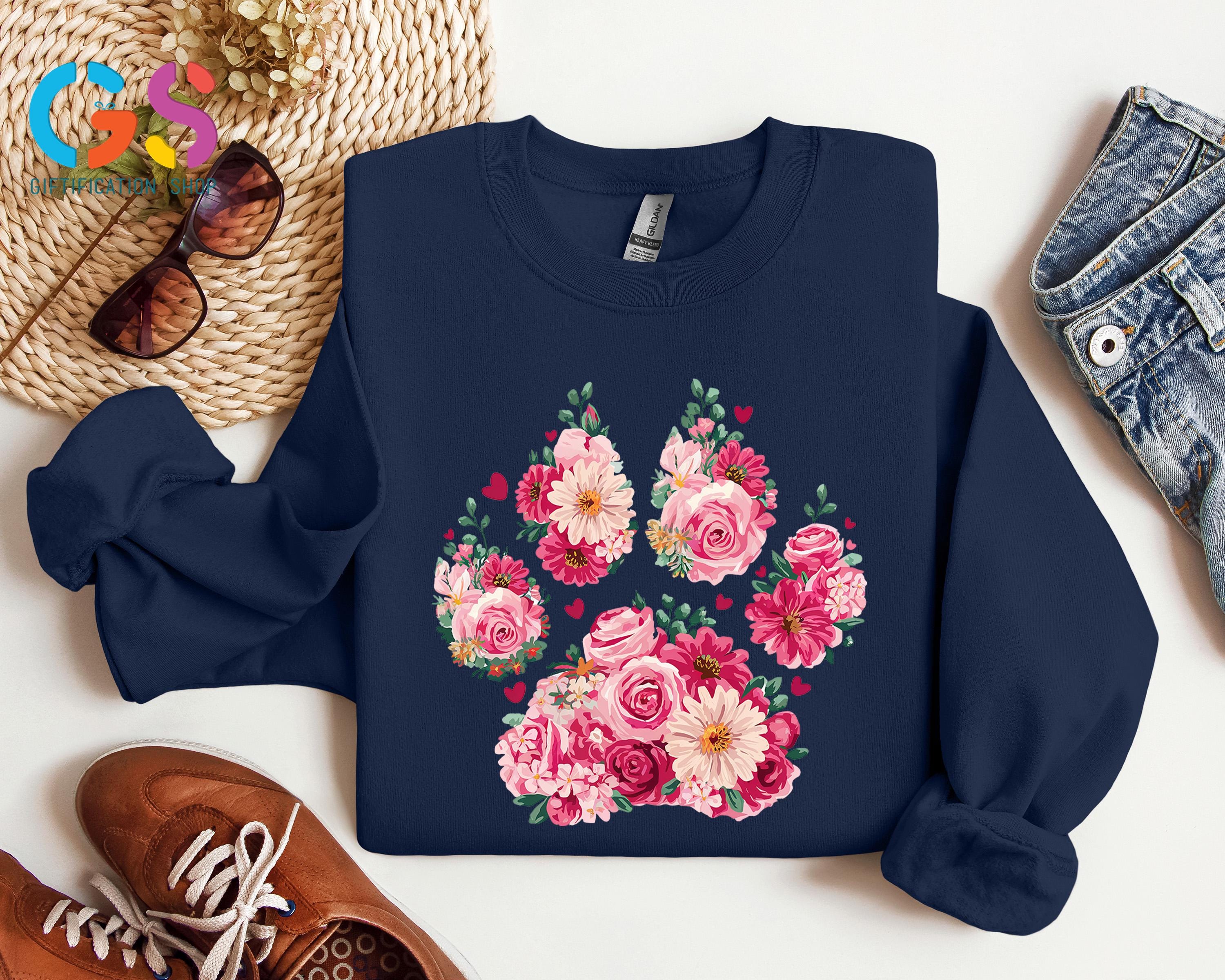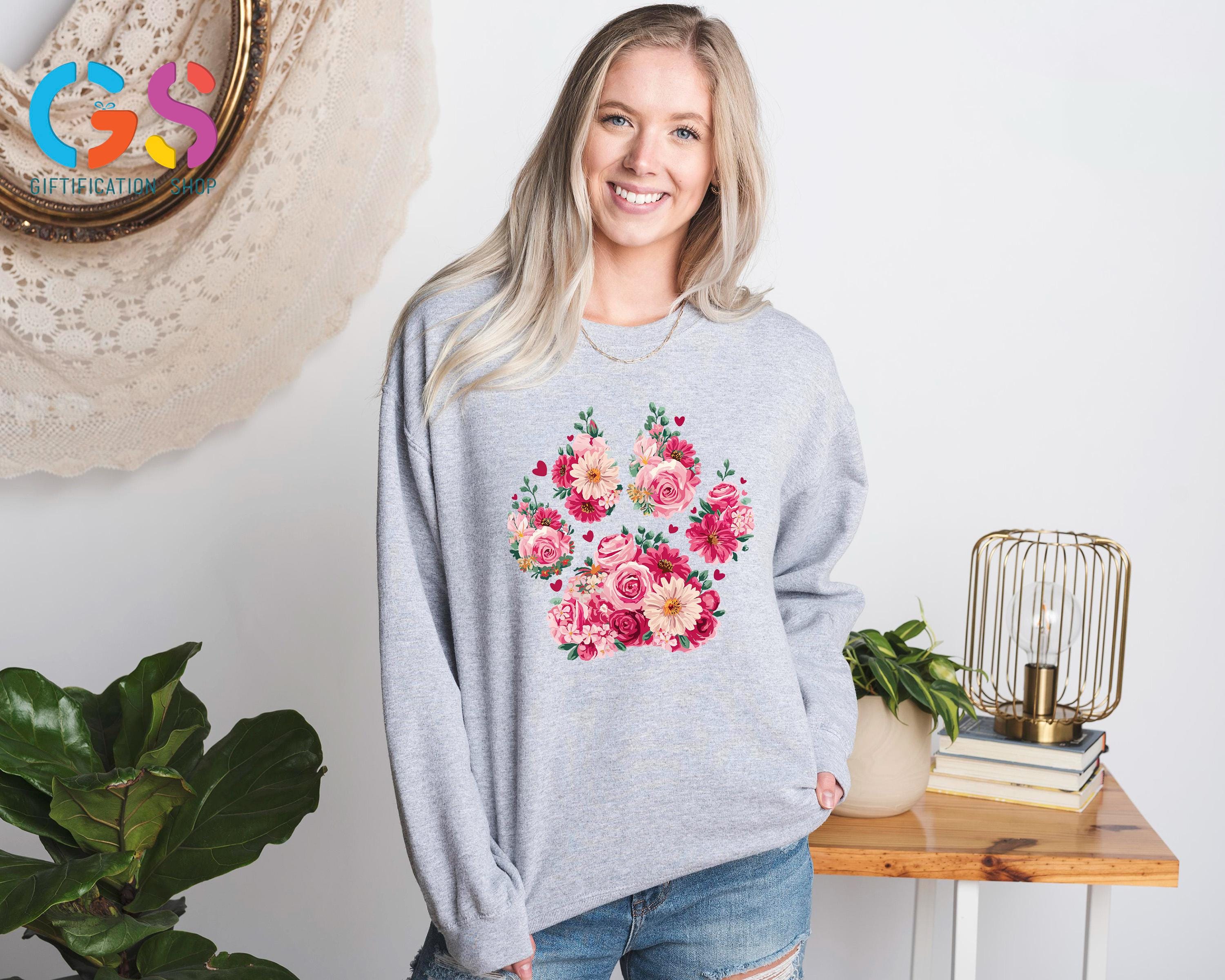 Floral Dog Paw Sweatshirt, Pet Owner Mom Gift, Animal Lover Sweater, Veterinarian Clothing, Boho Pink Puppy Apparel