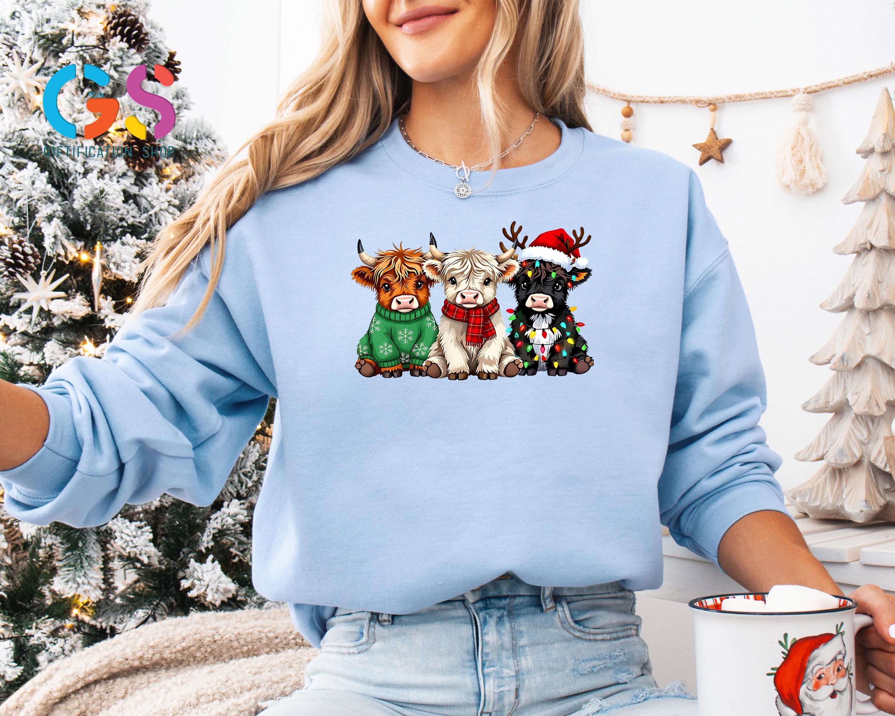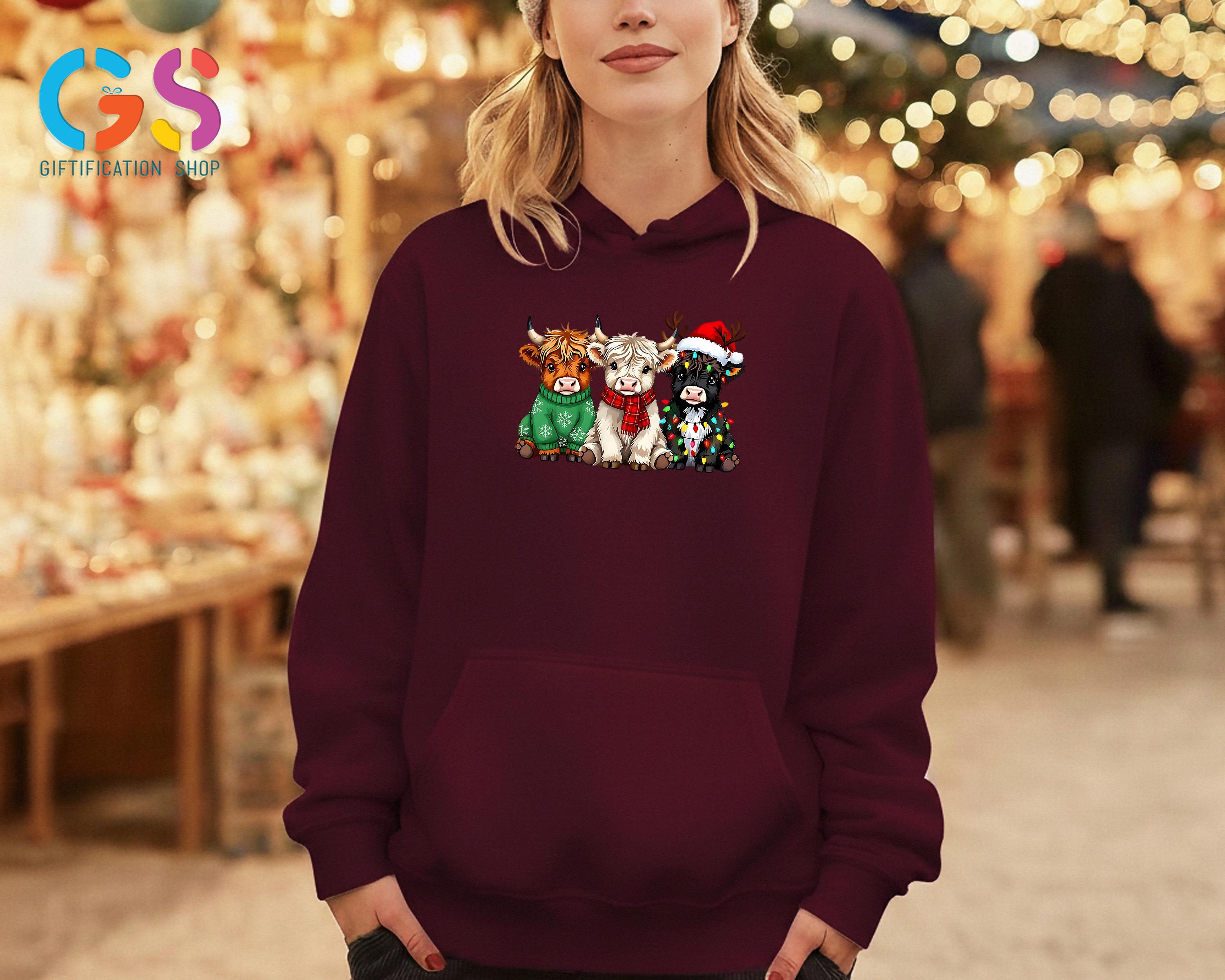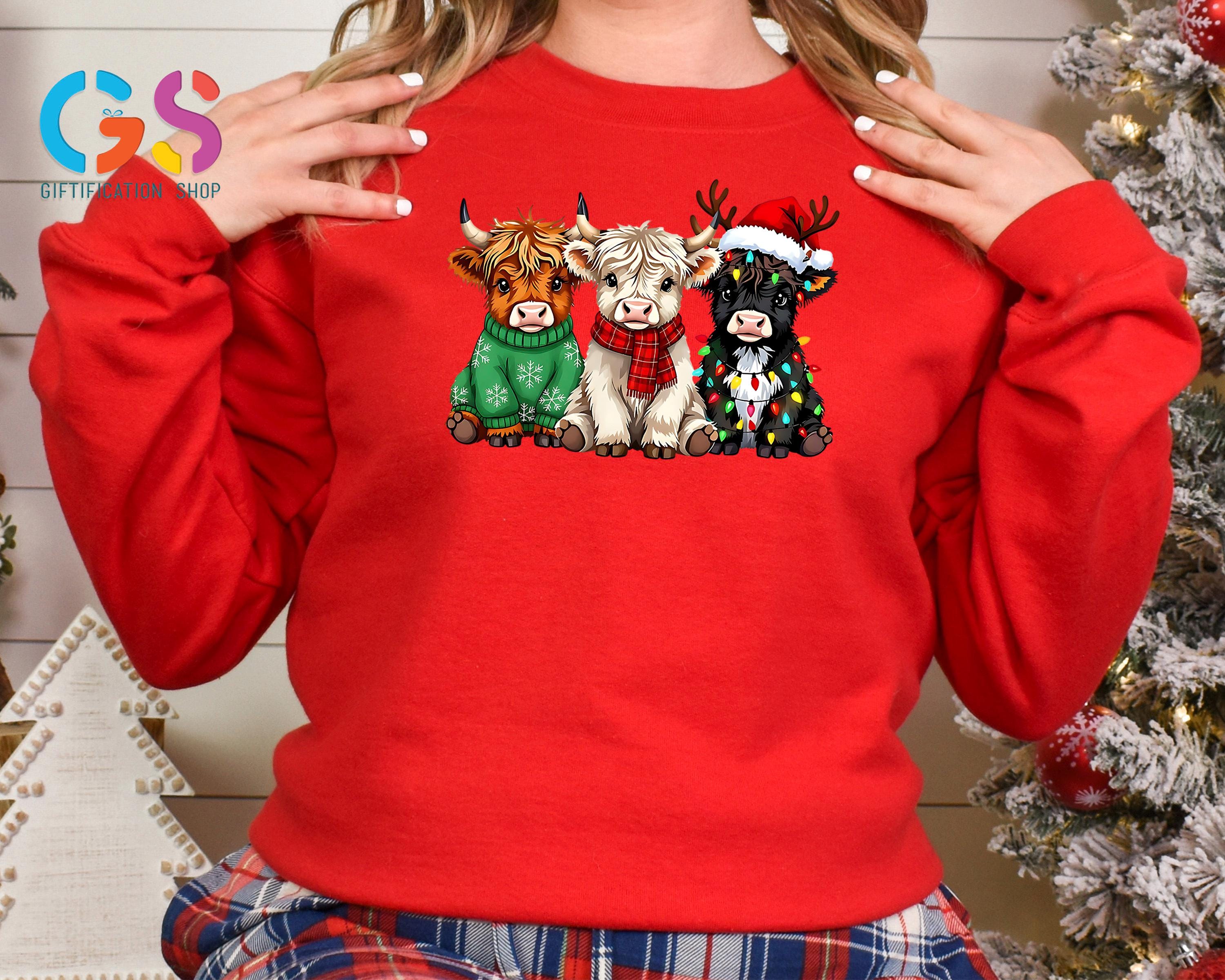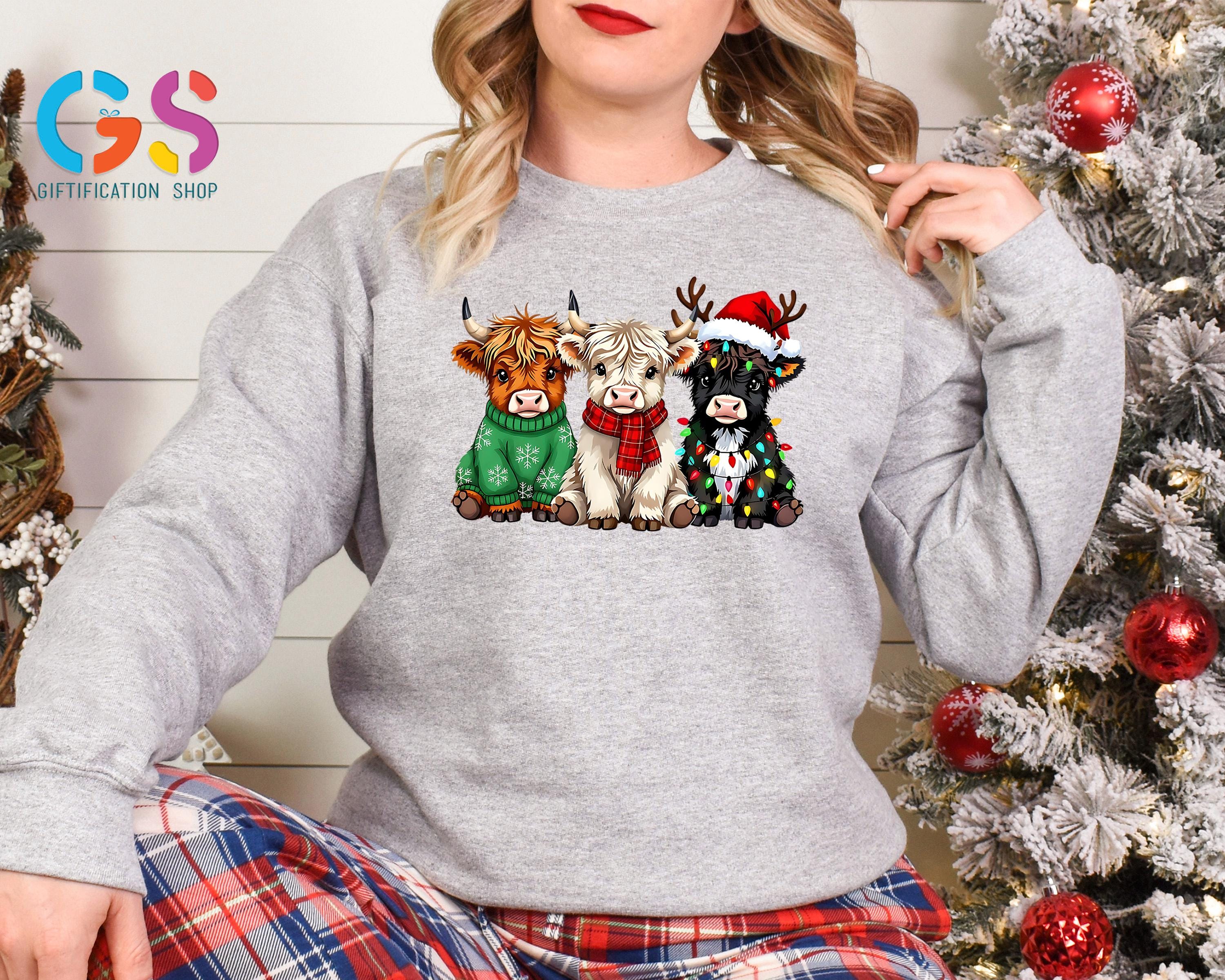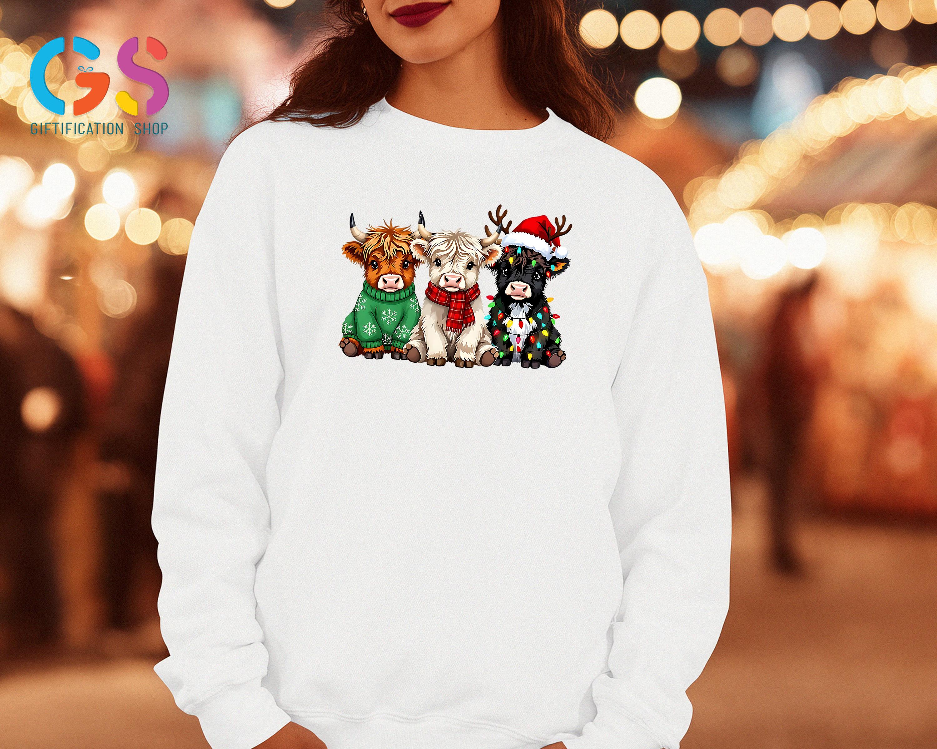 Bring festive farm charm to your winter style with this Christmas Cow Sweatshirt, featuring adorable Highland cows for the perfect mix of funny Christmas vibes and cozy holiday apparel. Ideal for any cow lover gift, this cute Highland cow t-shirt inspired sweater adds rustic farm Christmas flair to your wardrobe, making it a great pick for family Christmas photos, cozy xmas sweatshirts, or everyday winter clothing. Whether you love Scotland sweatshirts, country styles, or animal-themed holiday designs, this Merry Christmas cow hoodie brings warmth, laughter, and festive farm spirit to your holiday season!