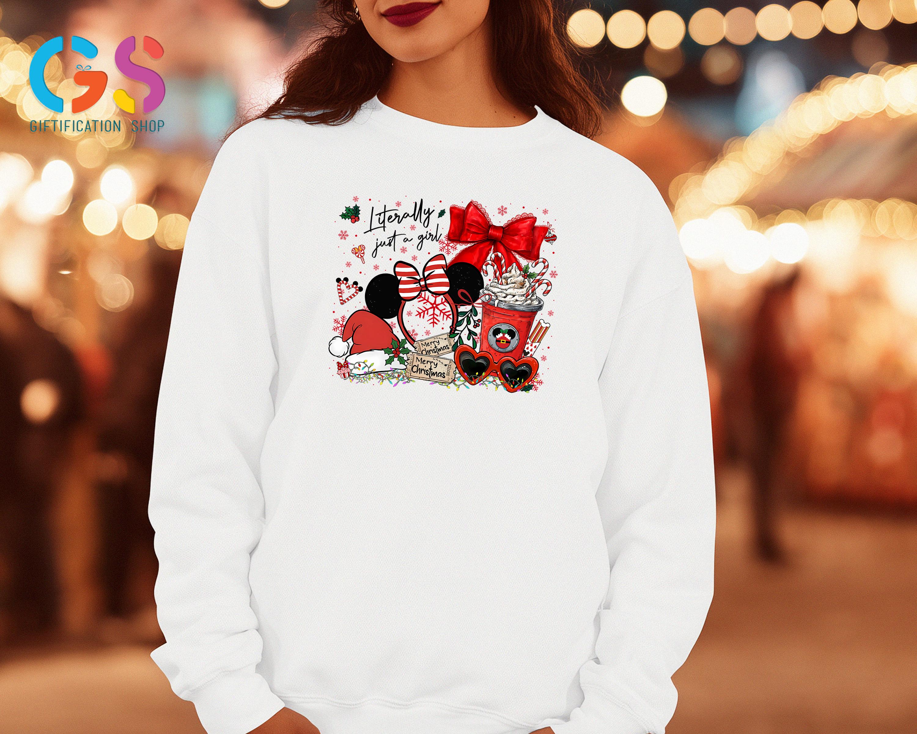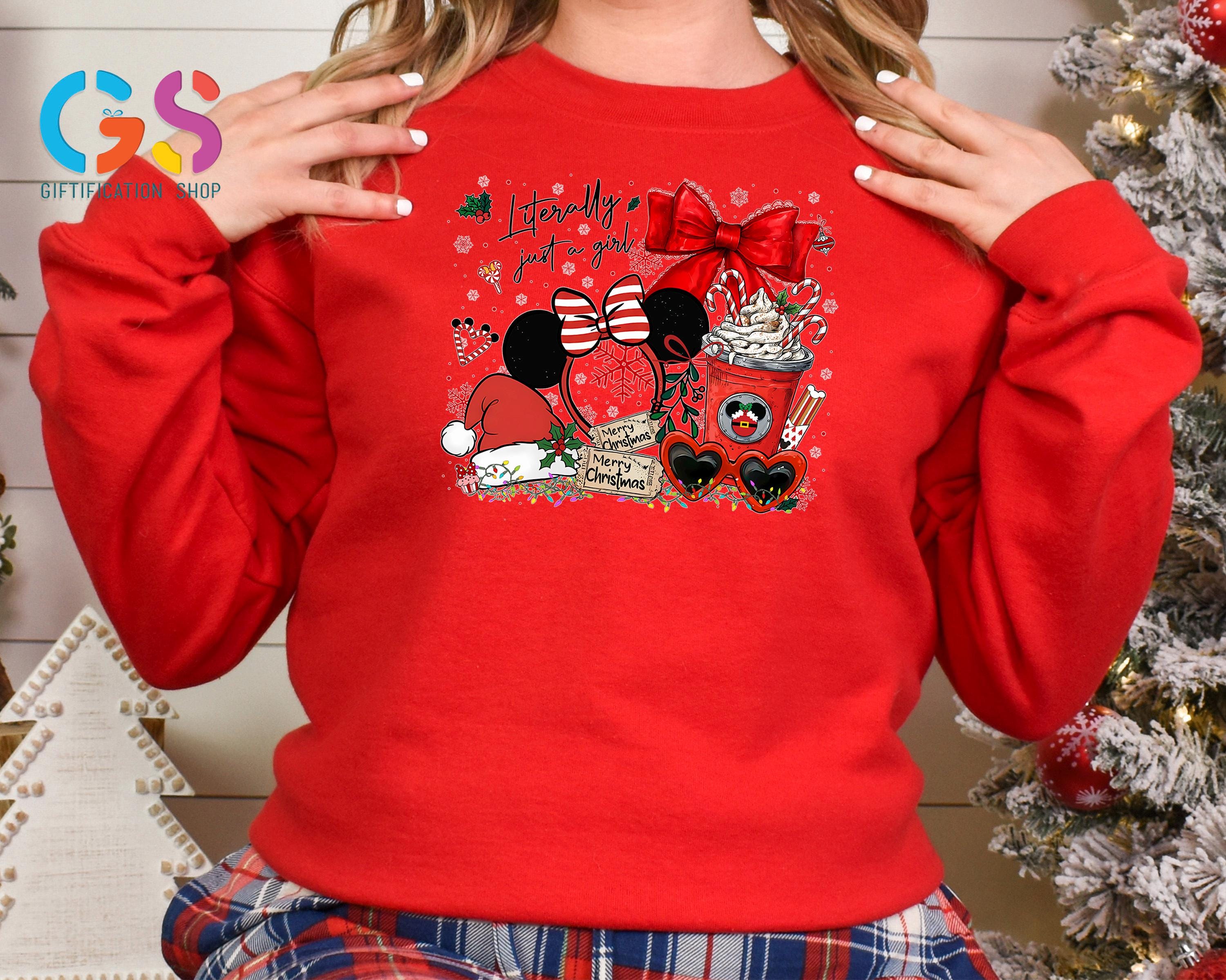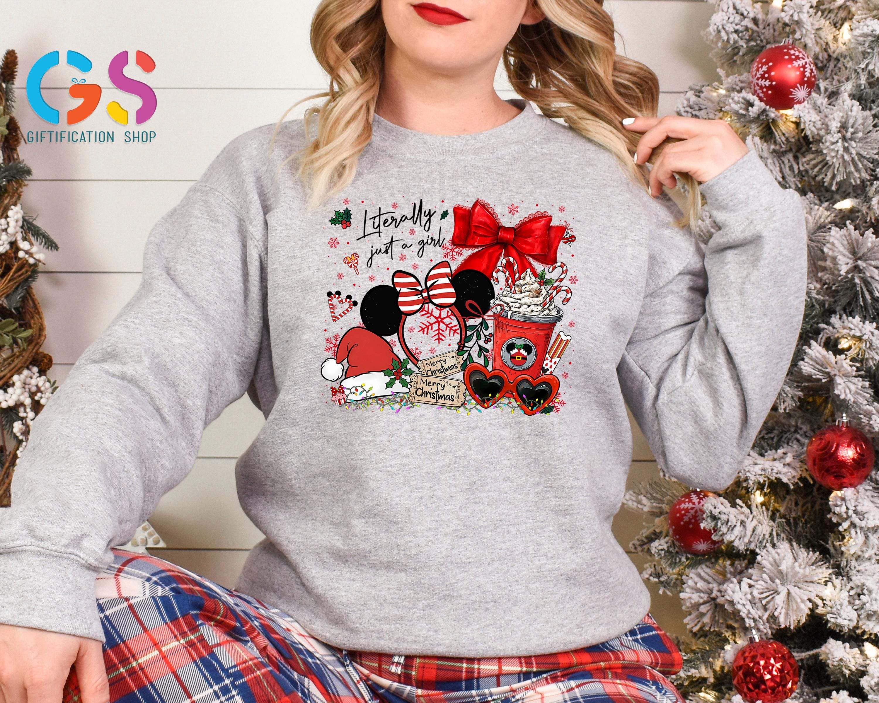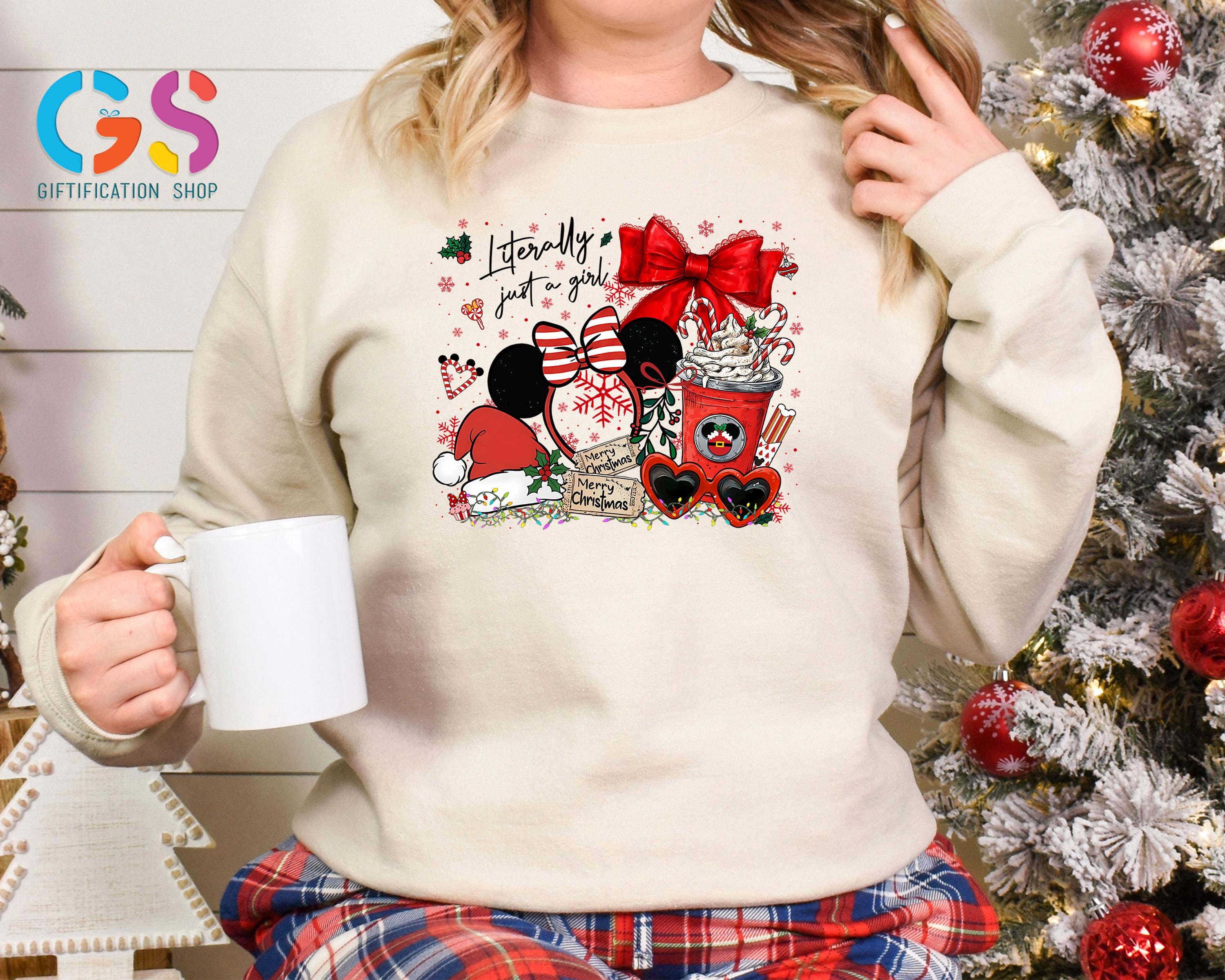 Disney Literally Just A Girl Christmas Sweatshirt, Disneyland Girls Trip Sweater, Merry And Bright Minnie Bow Coffee Top