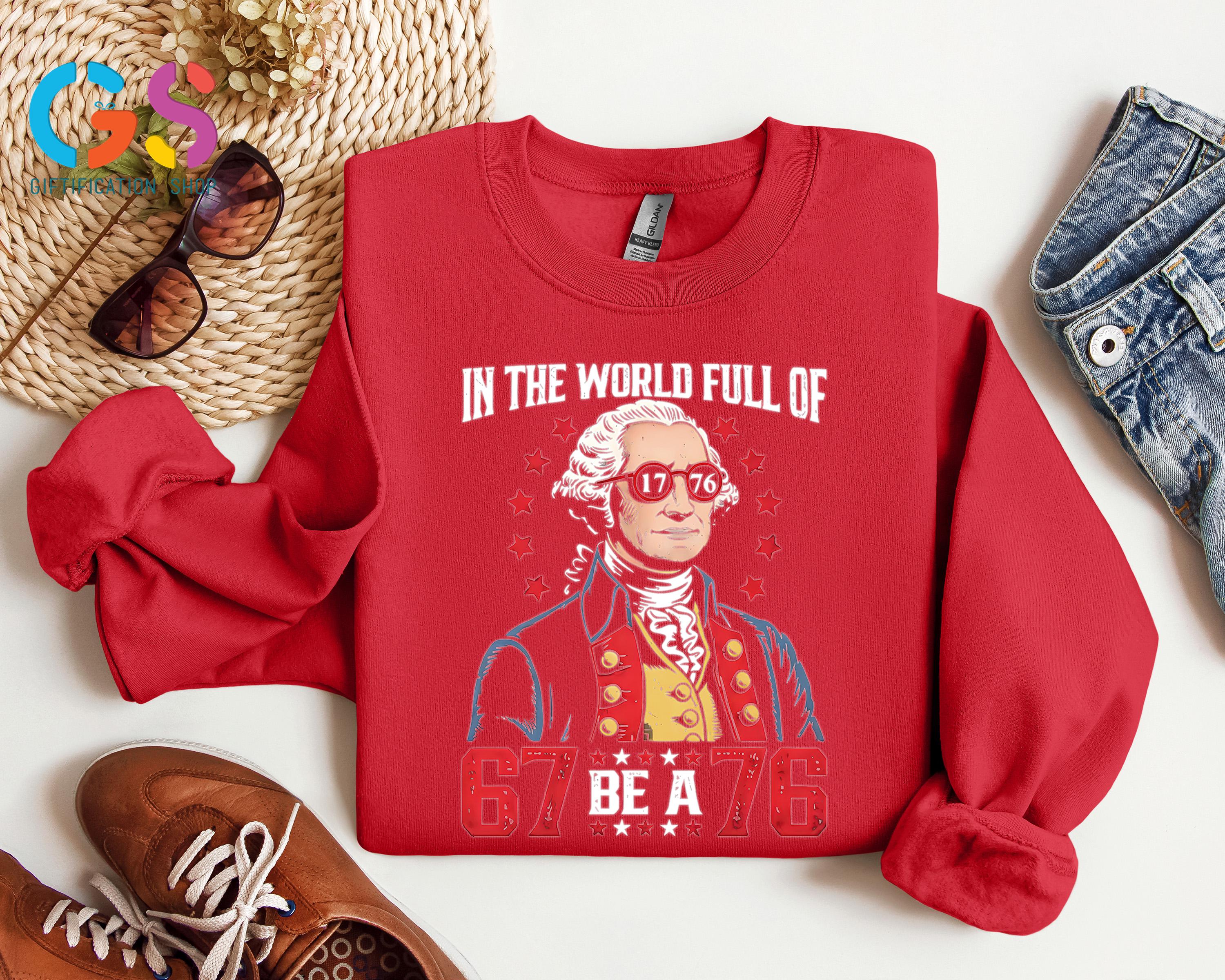Make a bold, playful statement with the In The Worl Full 67 Be A 76 Sweatshirt, a standout six seven sweatshirt that blends viral meme culture with patriotic humor. This 67 sweatshirt features the iconic 6 7 sweatshirt style, delivering sarcastic shirt attitude and funny humor shirt energy that fans of meme sweatshirt and viral shirt trends will love. Perfect for Gen Z shirts lovers and teen girl shirts with personality, this design mixes freedom sweatshirt and patriotic sweatshirt vibes with a clever nod to history, making it a fun take on the 1776 sweatshirt and history sweatshirt trend. Comfortable, eye-catching, and full of character, this Patriotic Six Seven Humor Sweater is ideal for everyday wear or gifting to anyone who loves sarcasm, memes, and bold history-inspired clothing.