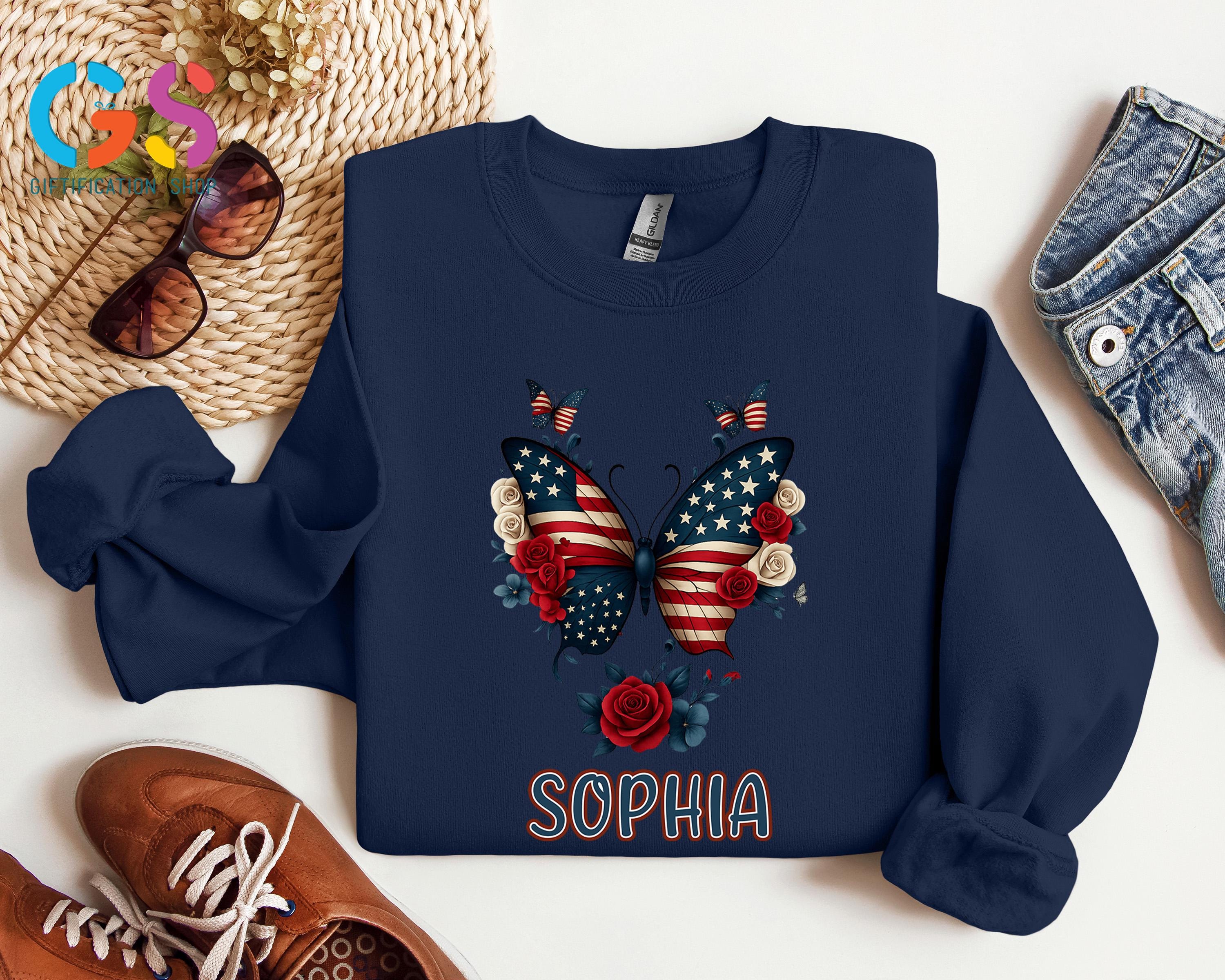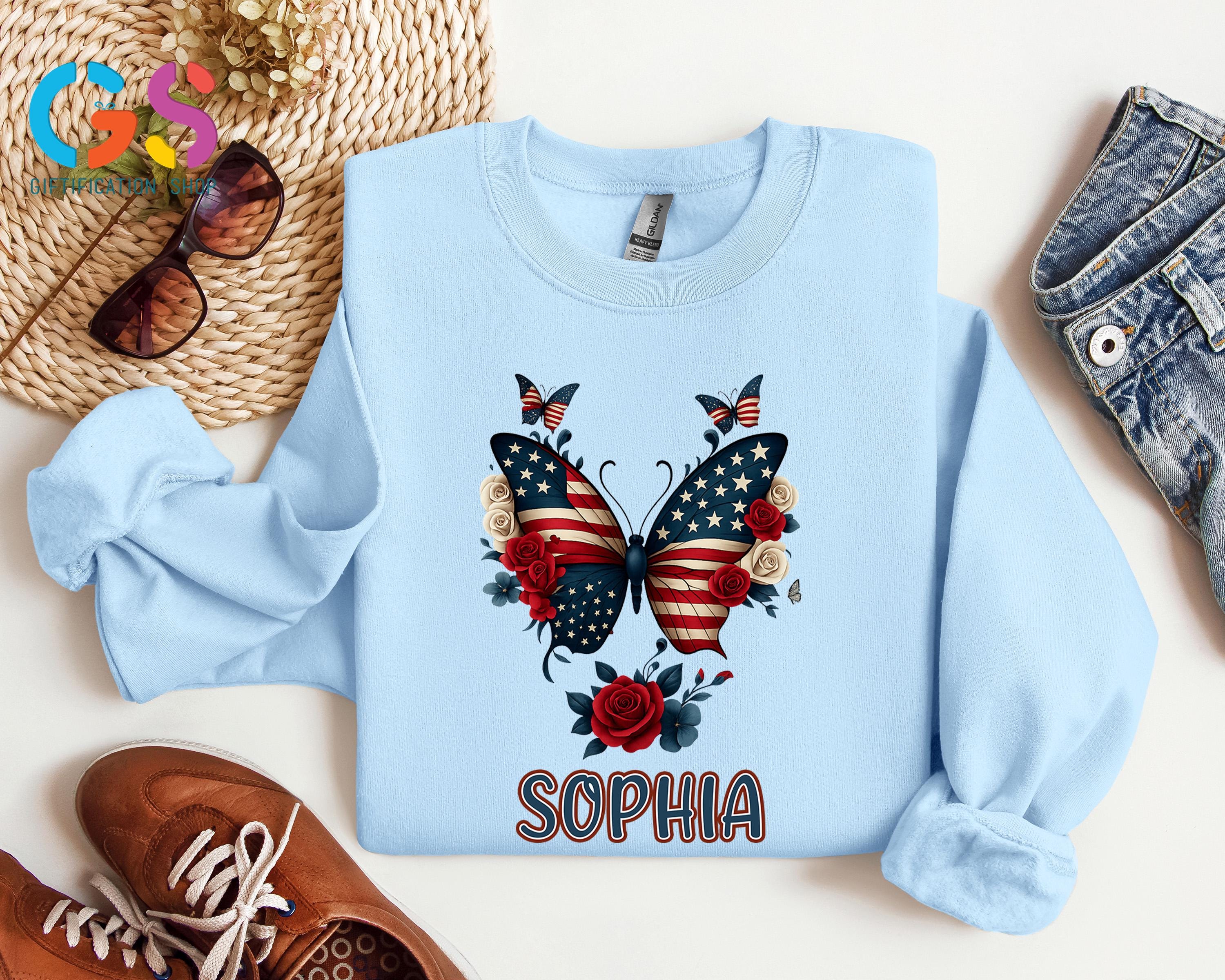 Custom Name Butterfly American Flag Sweatshirt, Patriotic Insect Sweater, Personalized Nature Lover Hoodie