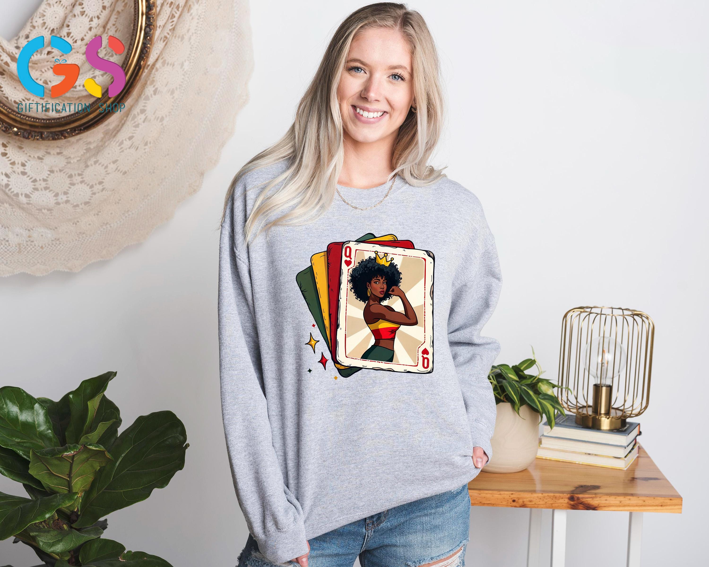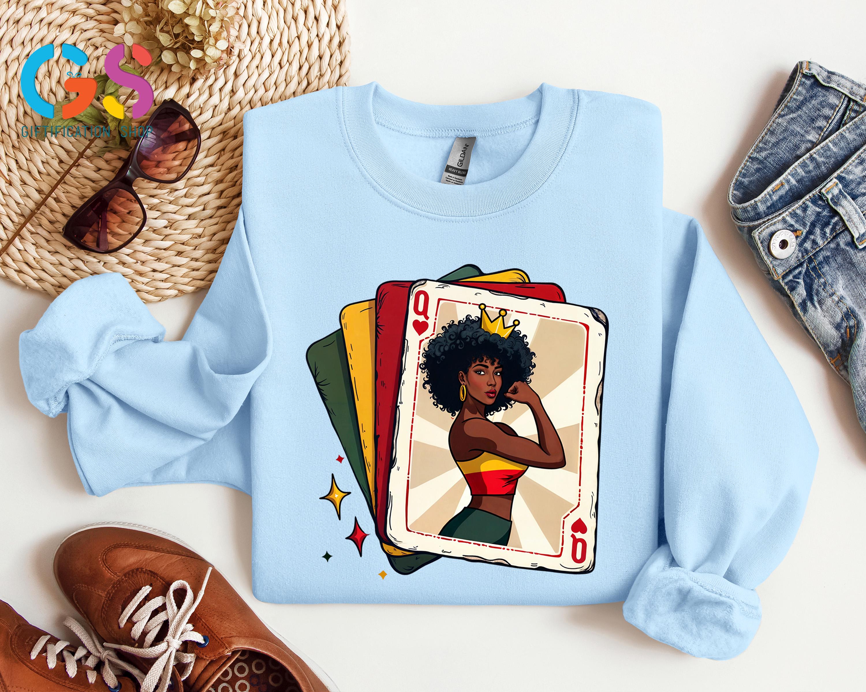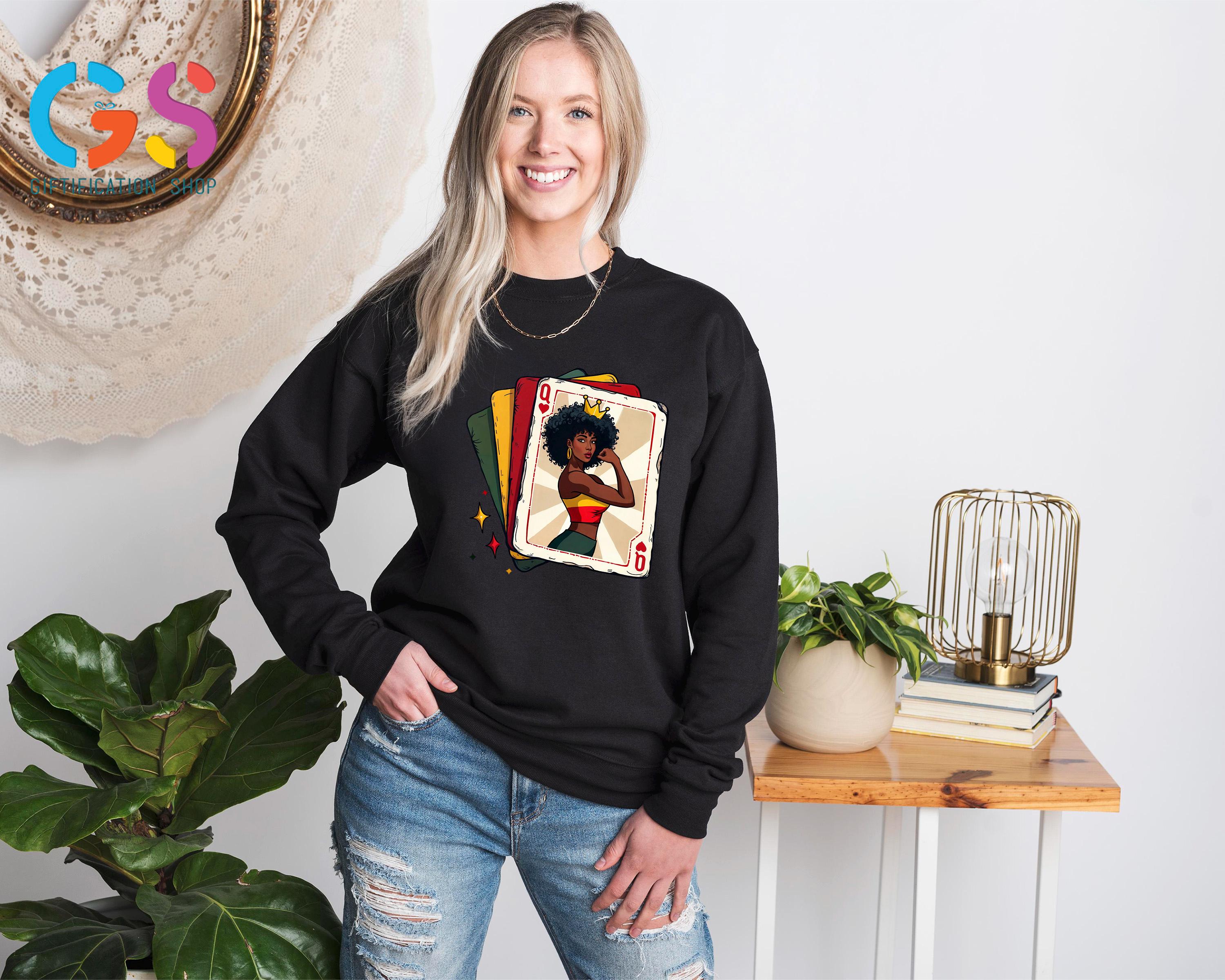 Celebrate strength, culture, and confidence with this Black Woman Playing Card Queen sweatshirt, a bold design inspired by African American art and black girl magic. Perfect for Black History Month or year-round wear, this powerful poker sweatshirt and gamer sweatshirt blends a playing card queen theme with messages of equality, human rights, and social justice. Designed as a meaningful black women shirt, it makes a thoughtful best friend gift or wife gift for those who proudly embrace heritage and empowerment. This equality shirt is more than fashion—it’s a statement of pride, resilience, and style that honors black history and celebrates powerful women everywhere.