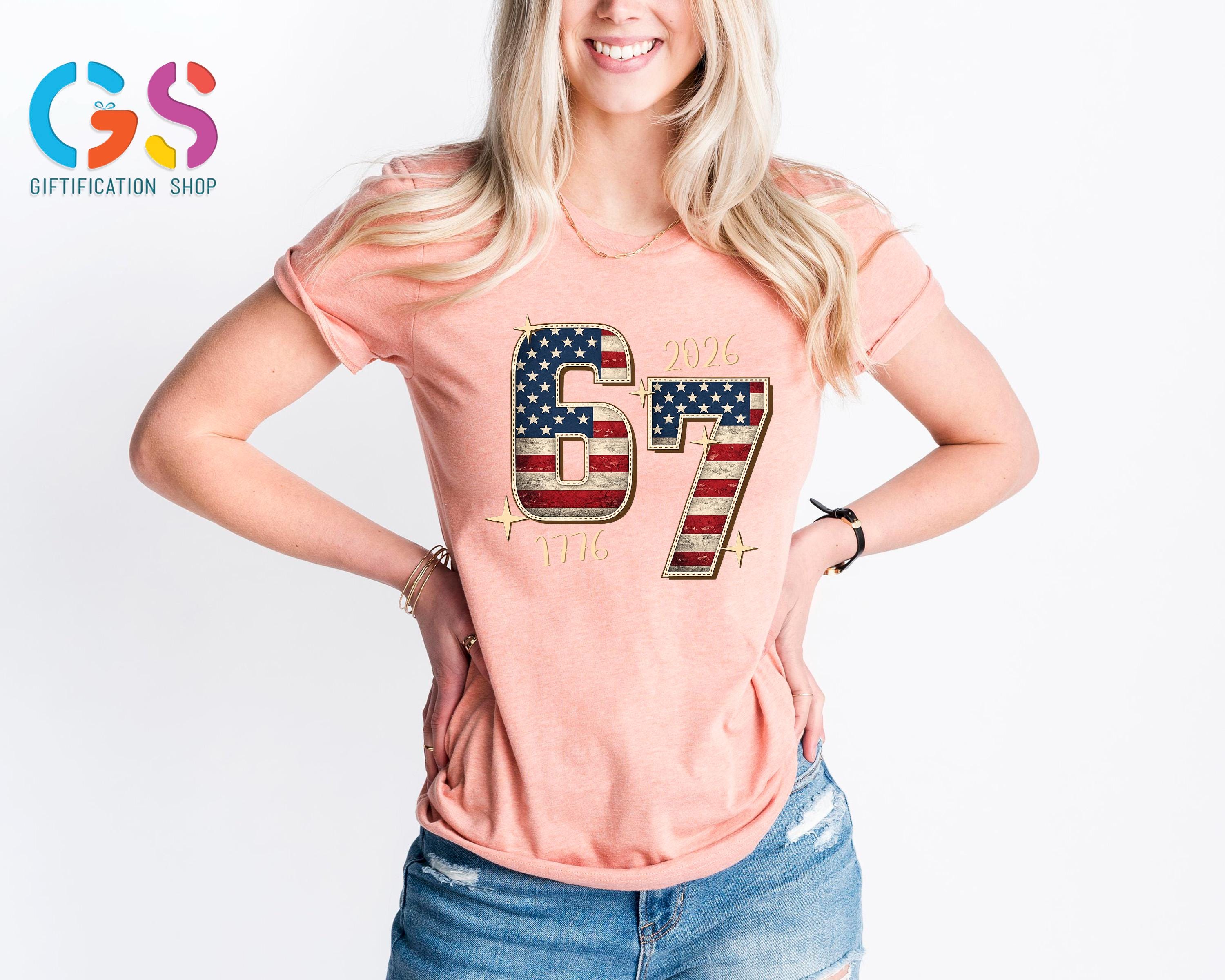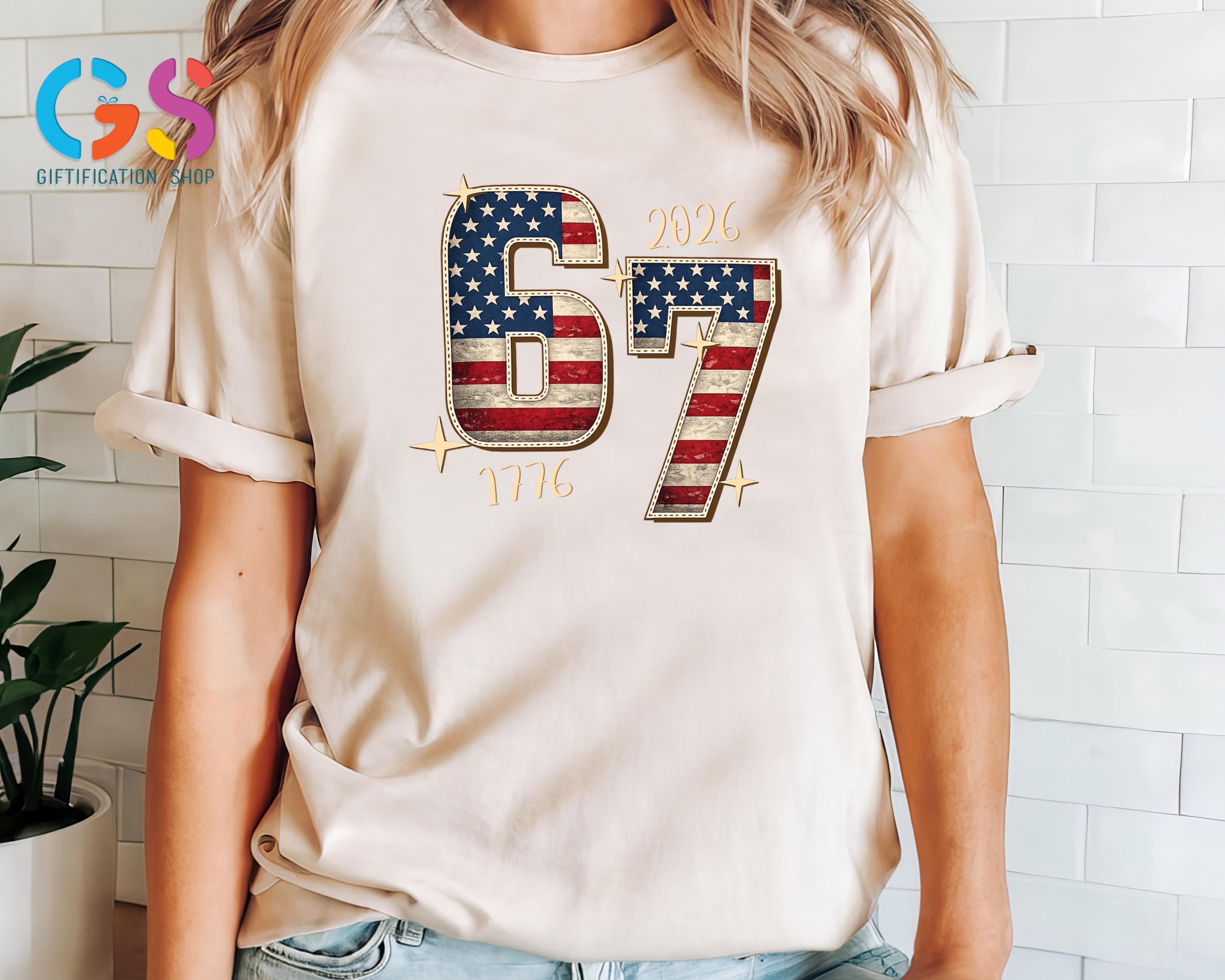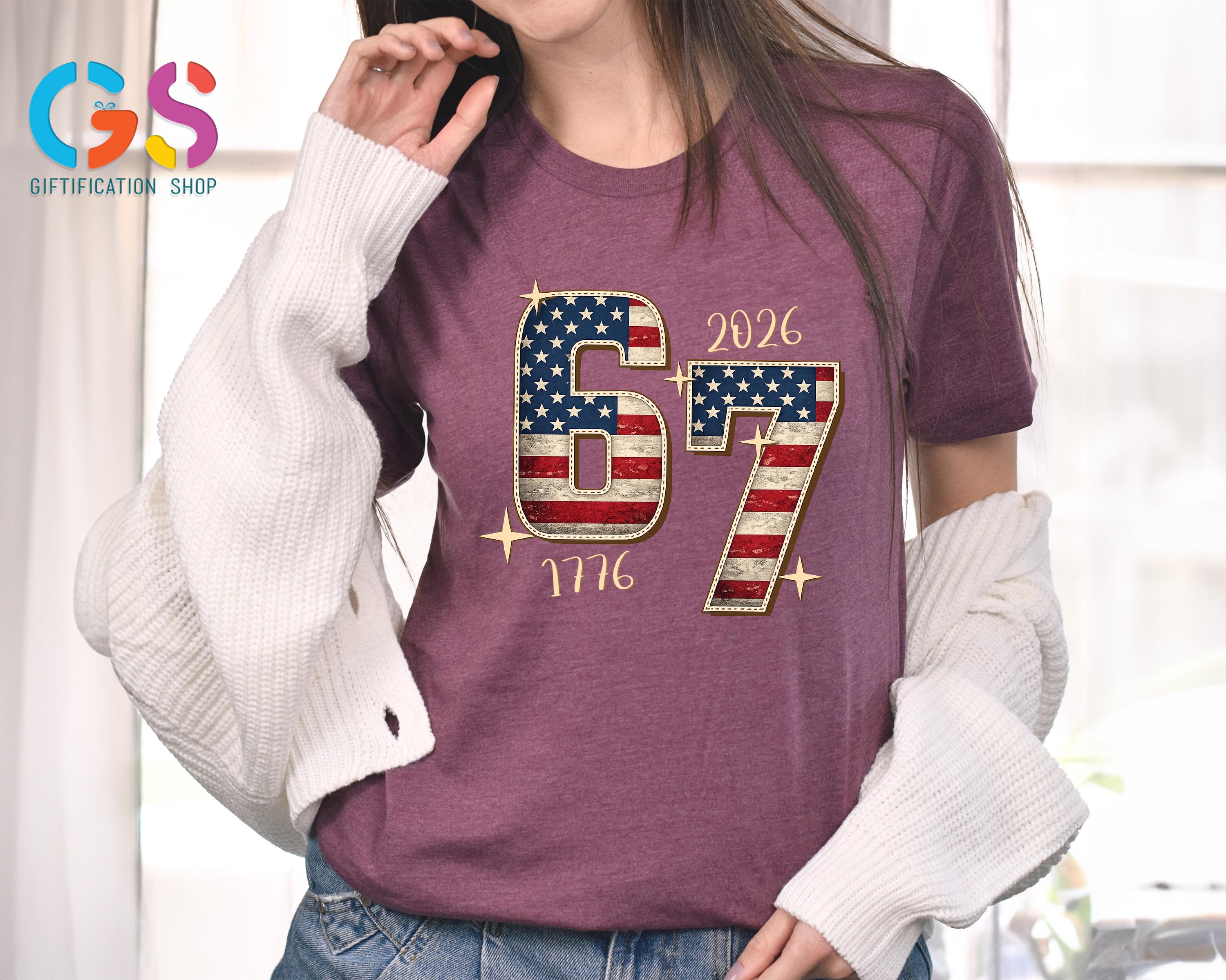Stand out with bold humor and patriotic pride in this 1776 Anniversary T-shirt, blending the viral 67 meme shirt trend with classic American spirit. This funny sarcastic shirt features six seven humor that Gen Z loves, making it a perfect teen girl shirt or eye-catching freedom shirt for everyday wear. Designed with an American flag touch, this USA shirt is ideal for celebrating the 250th years of the Revolutionary War, Memorial Day, or the 4th of July, combining a viral funny humor shirt vibe with timeless patriotic style for anyone who loves freedom and statement fashion.