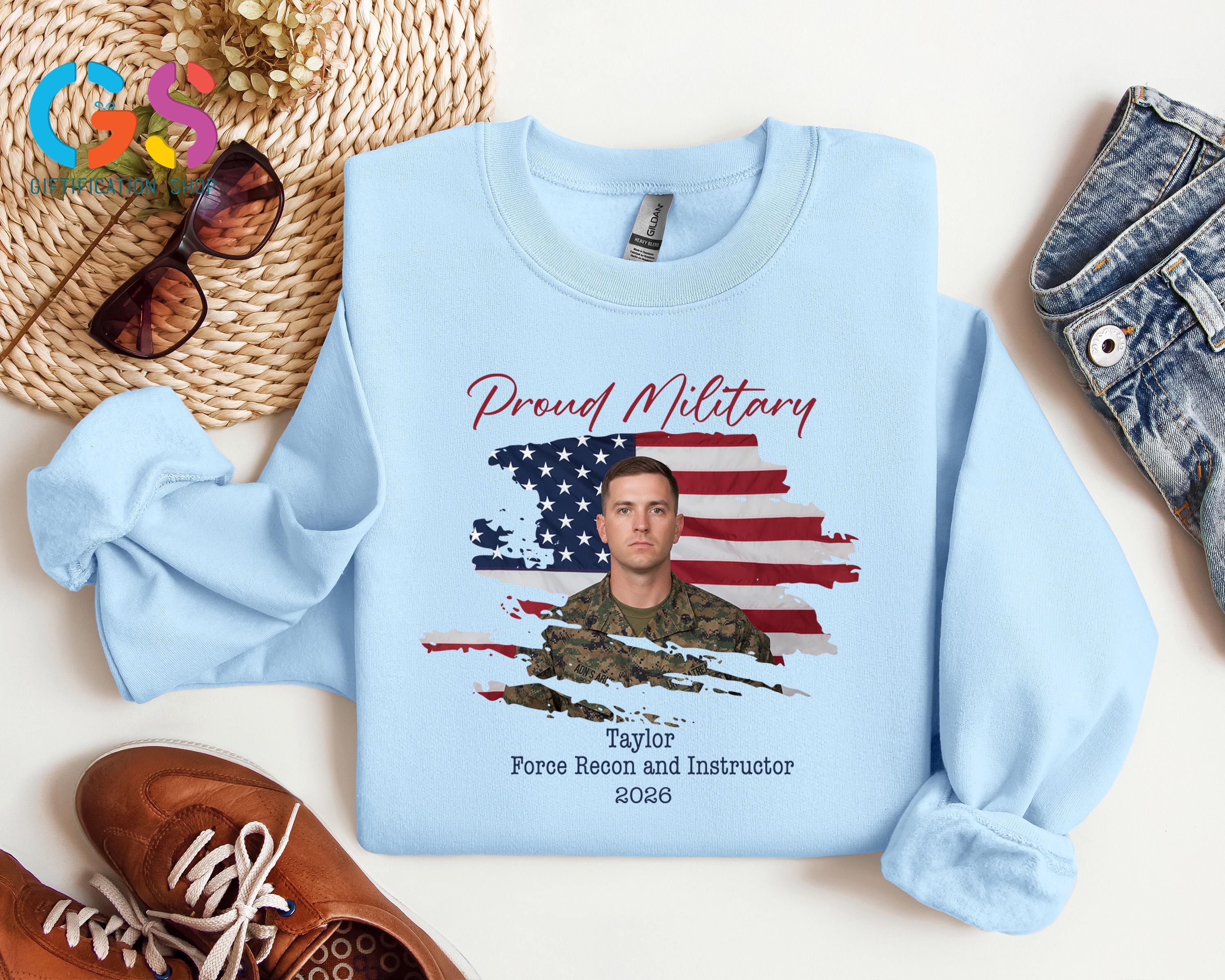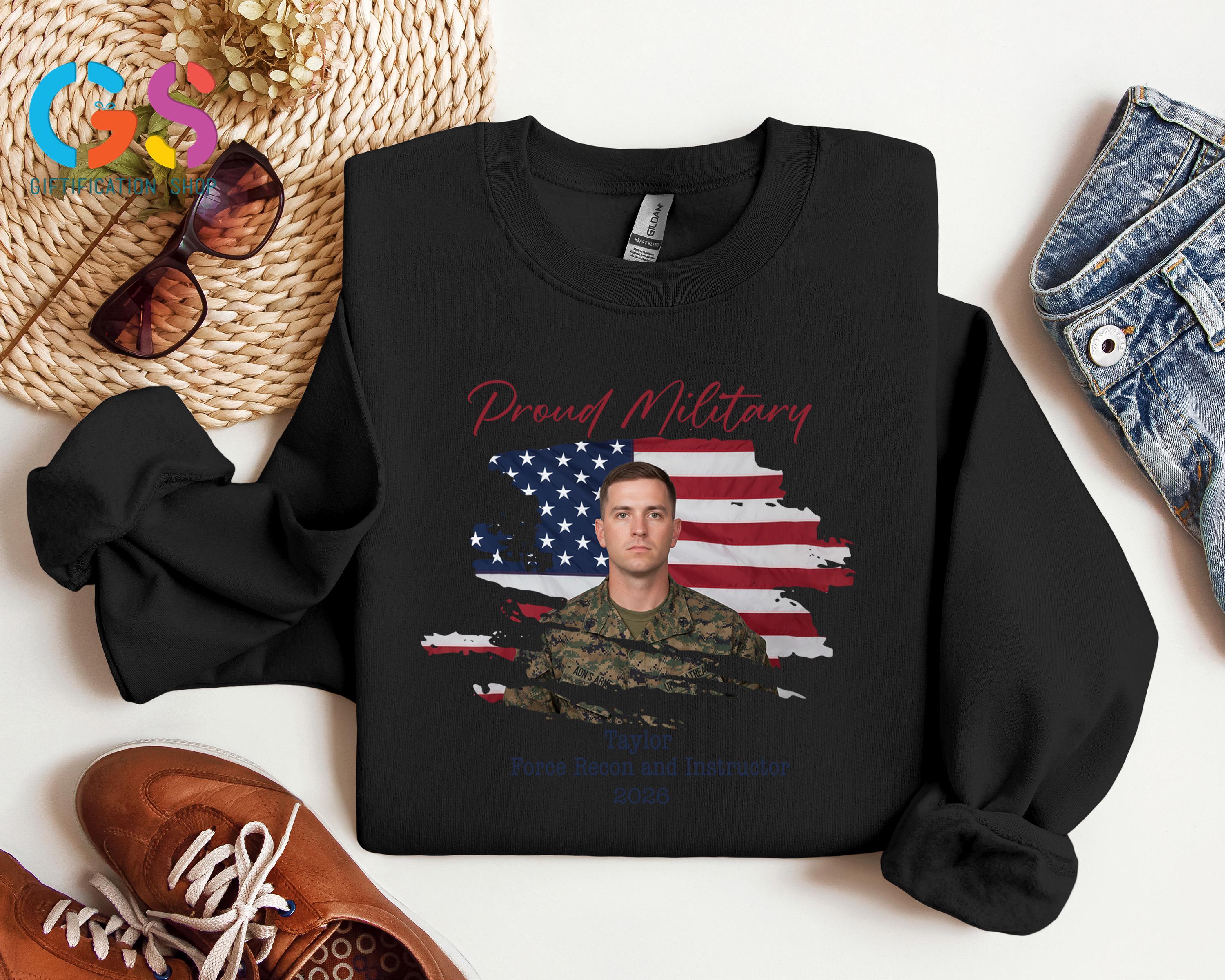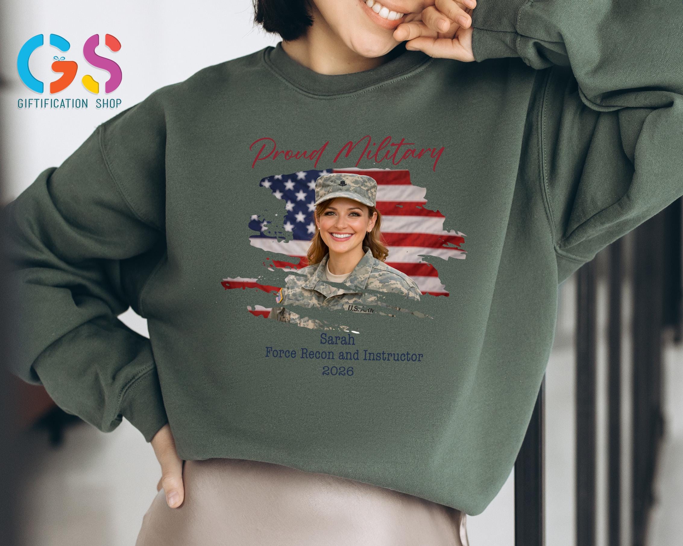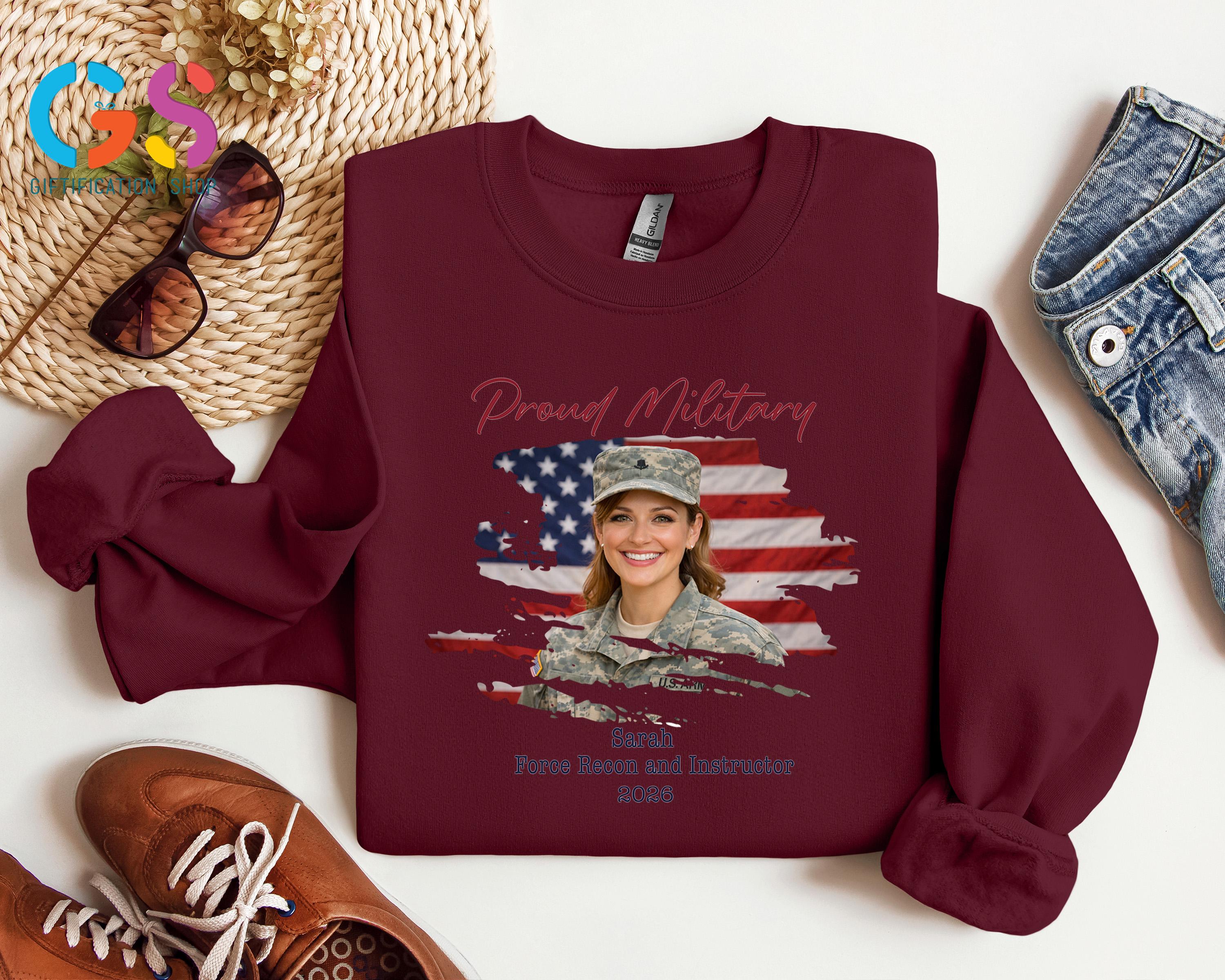 Celebrate service and sacrifice with this Custom Name and Photo Proud Military Sweatshirt, a meaningful personalized gift designed to honor heroes and their families. Featuring an American flag–inspired patriotic shirt style, this custom name shirt is perfect as a graduation gift, Memorial Day shirt, or heartfelt military retirement keepsake. Ideal for military gifts, veteran shirt lovers, and proud Army families, this cozy family shirt showcases your custom photo and name to create a one-of-a-kind US Army tribute. Whether worn for a homecoming shirt celebration, honoring a proud Army member, or showing everyday support, this personalized Army family hoodie is a timeless way to display love, pride, and patriotic spirit.
